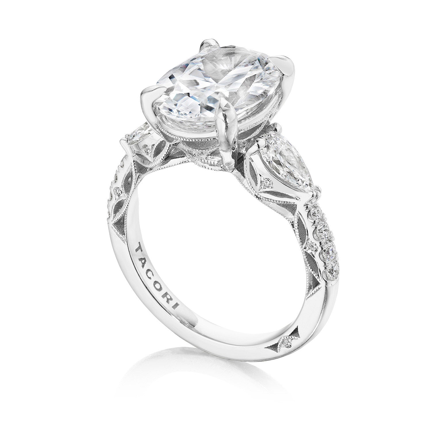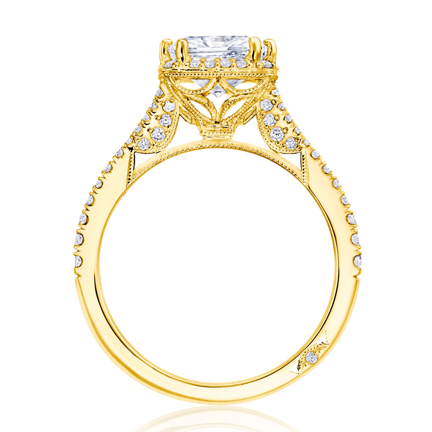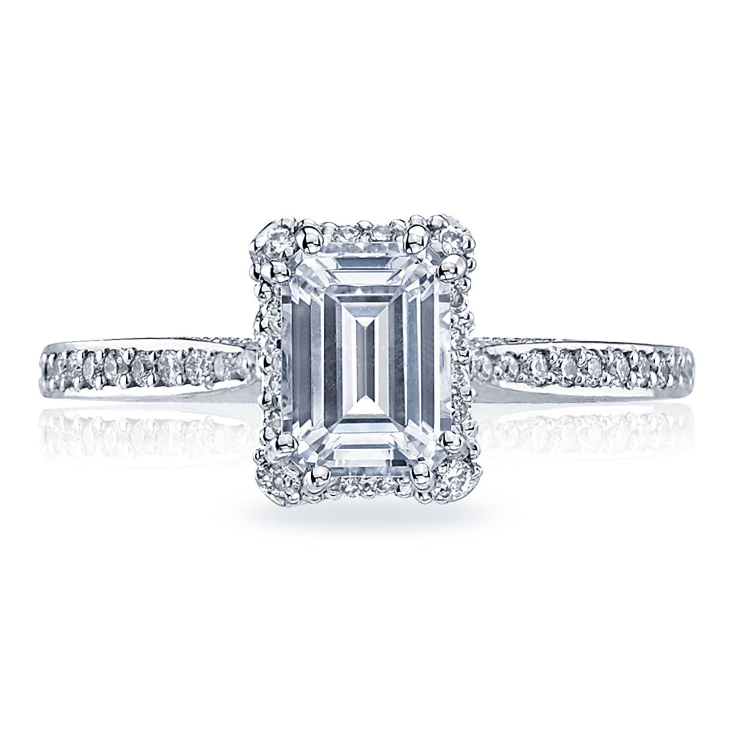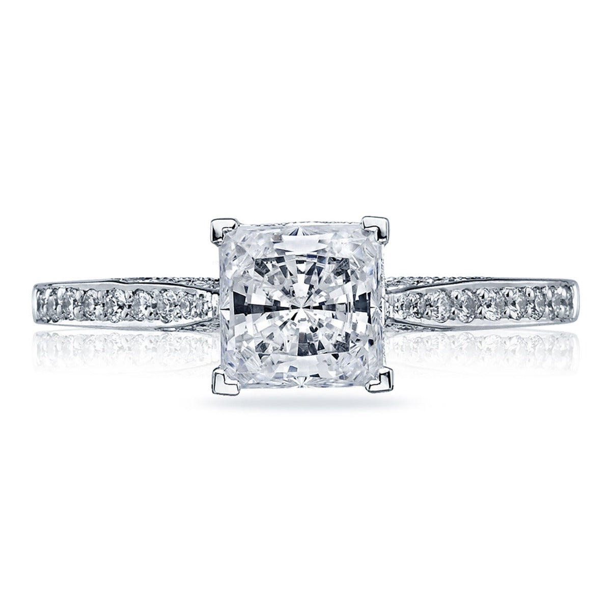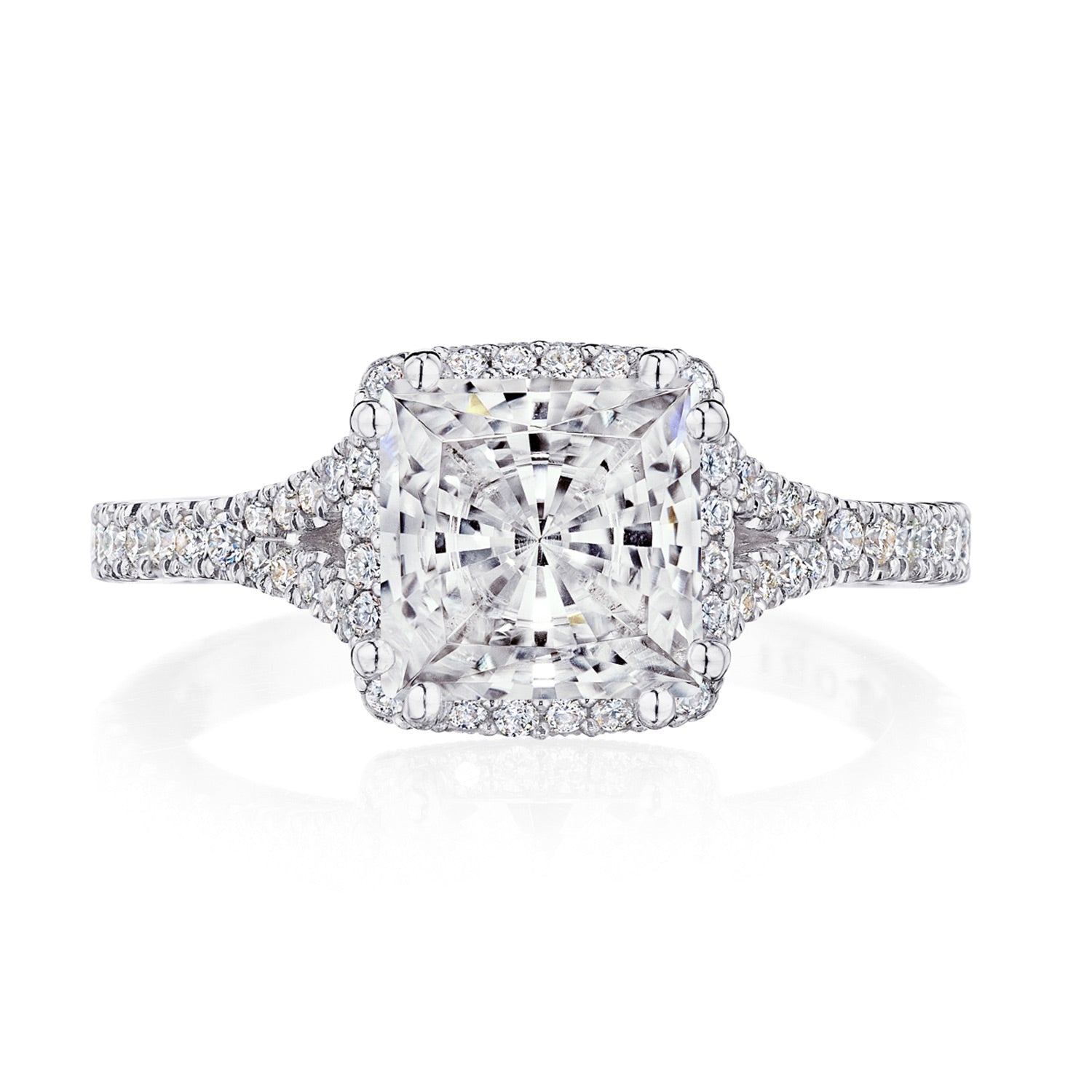 A TACORI bloom elevates the center stone, which rests on a lace-like, milgrian-studded Cathedral foundation. A pavé ceiling branches and embraces the solitaire, while a signature crescent marks the resting point of the ring.