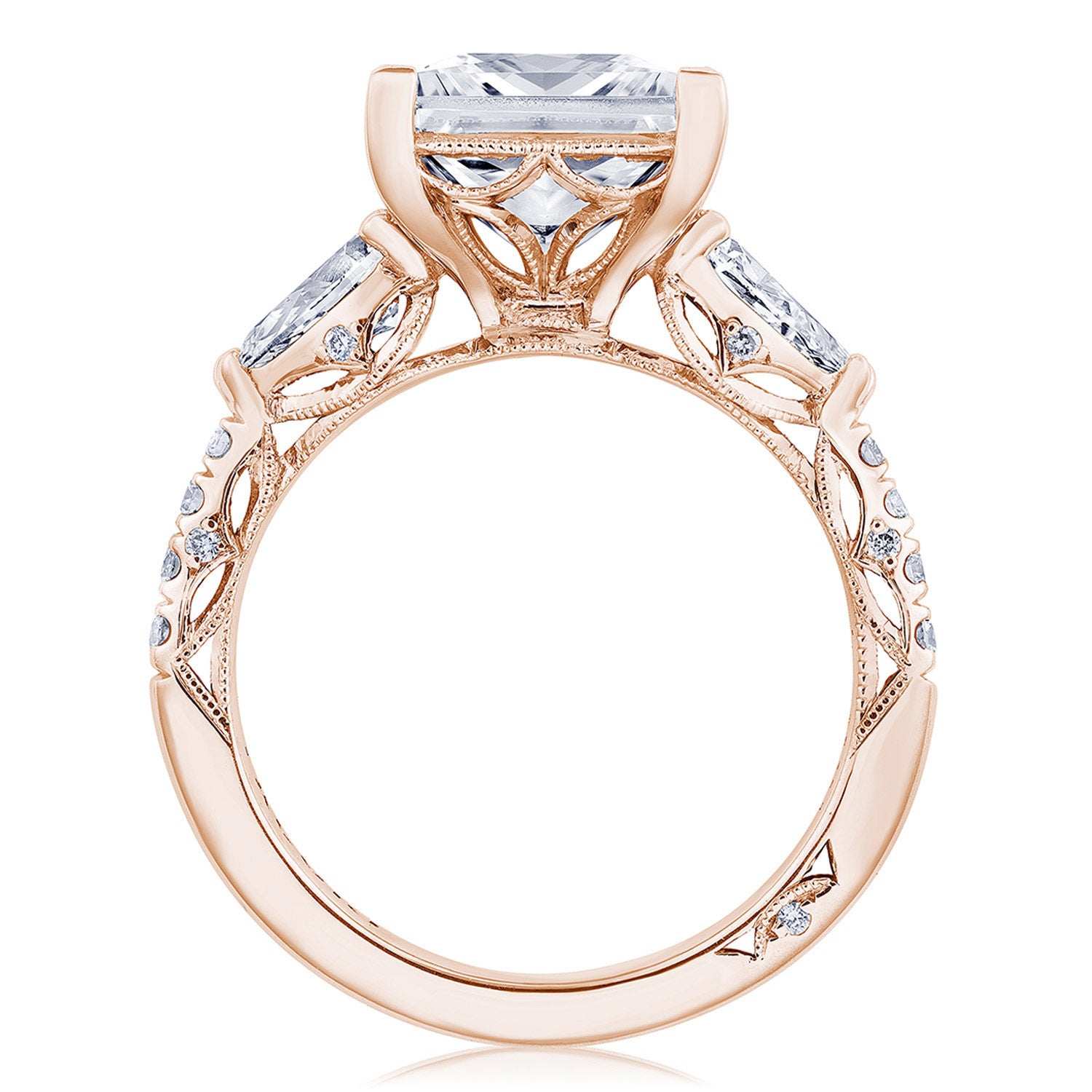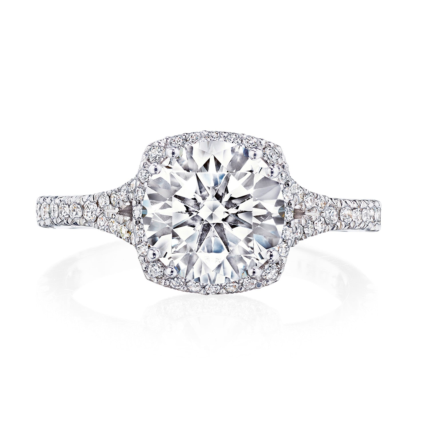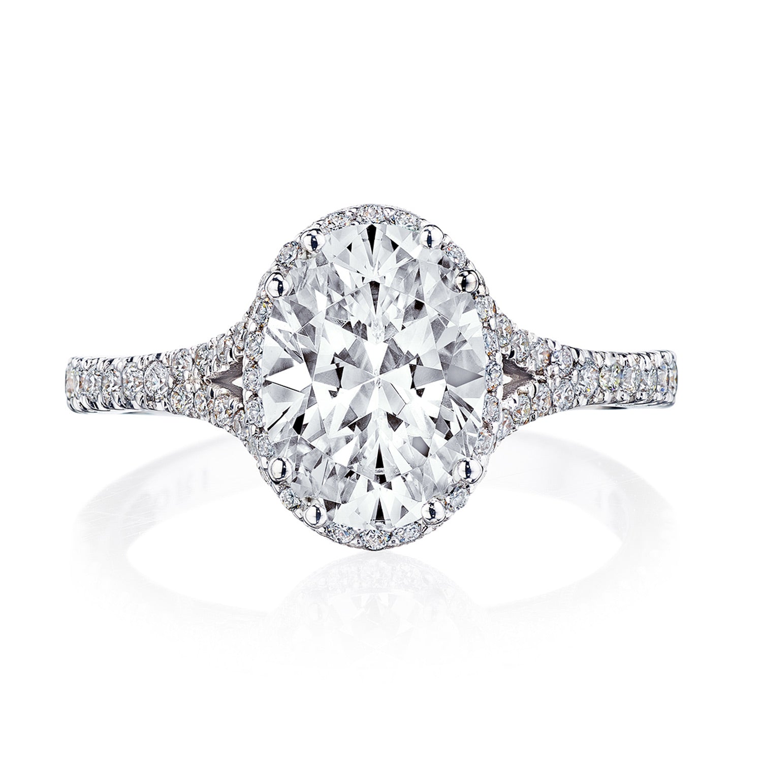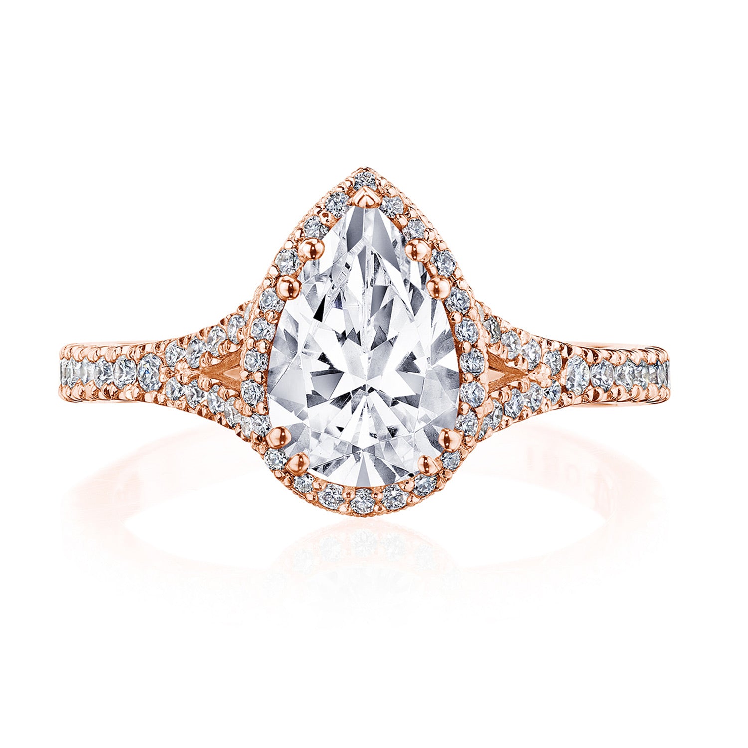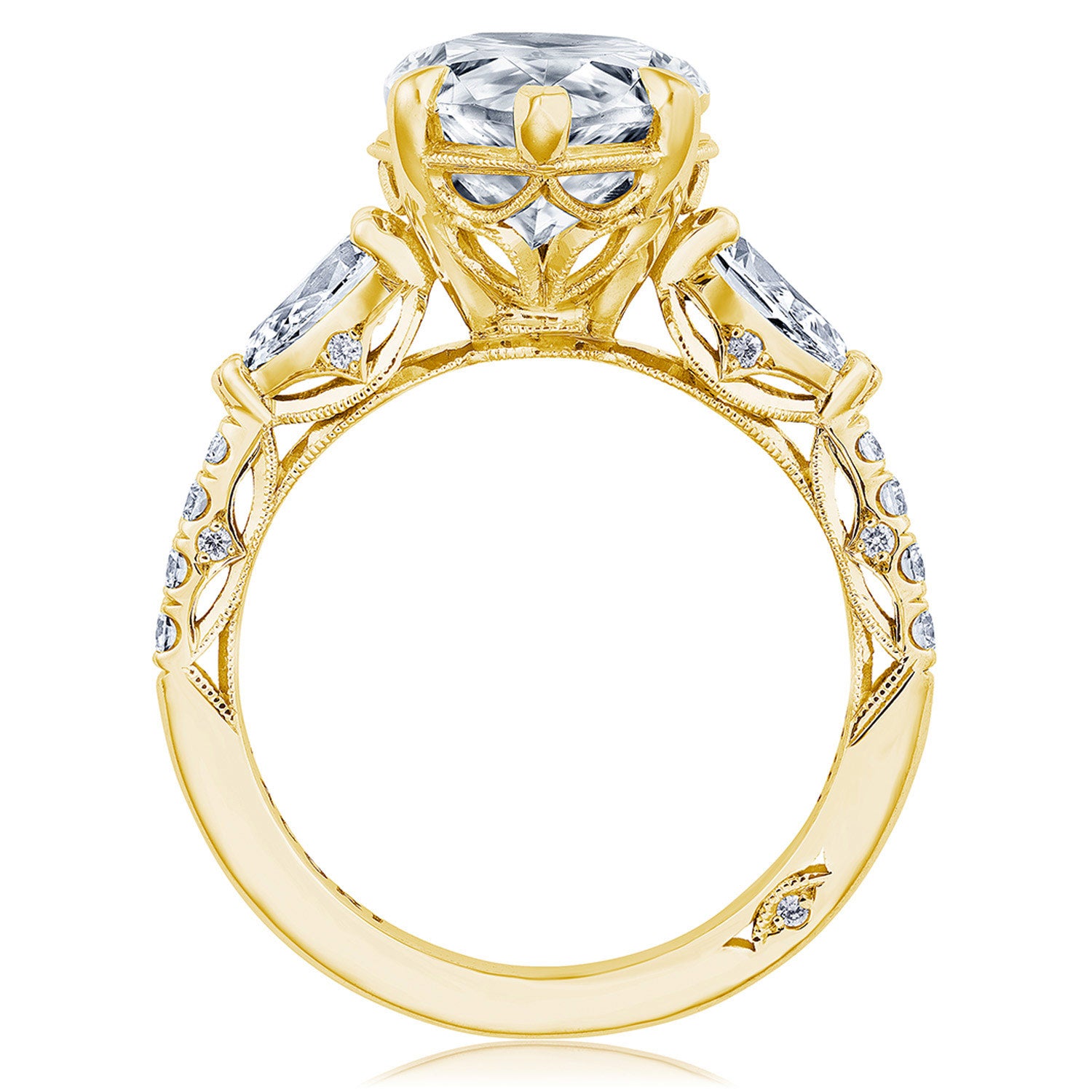 A TACORI bloom elevates the center stone, which rests on a lace-like, milgrian-studded Cathedral foundation. A pavé ceiling branches and embraces the solitaire, while a signature crescent marks the resting point of the ring.