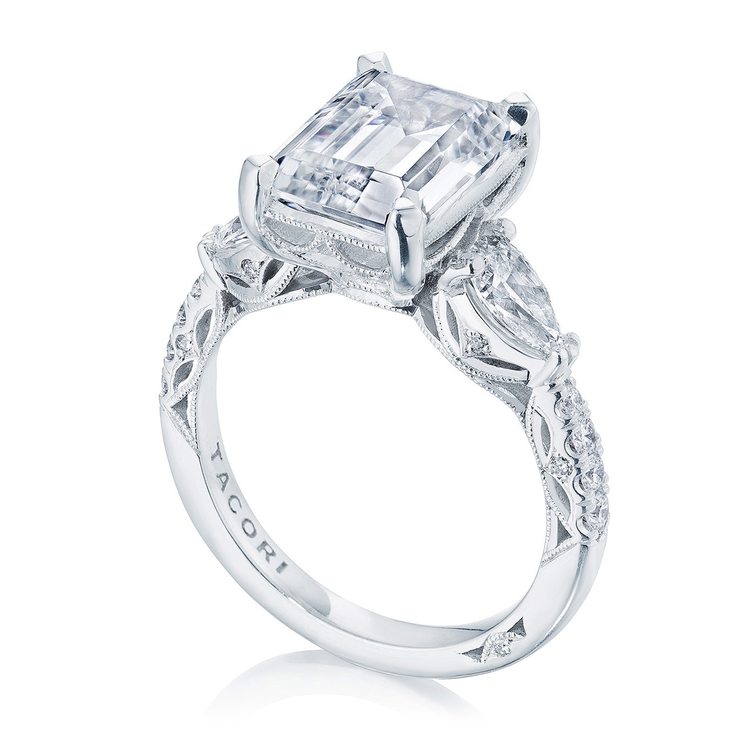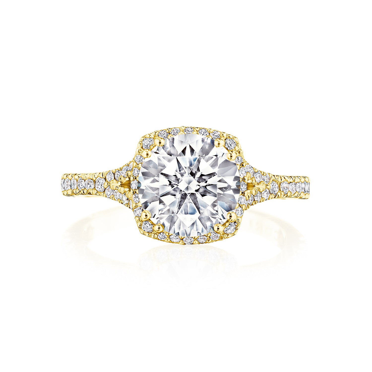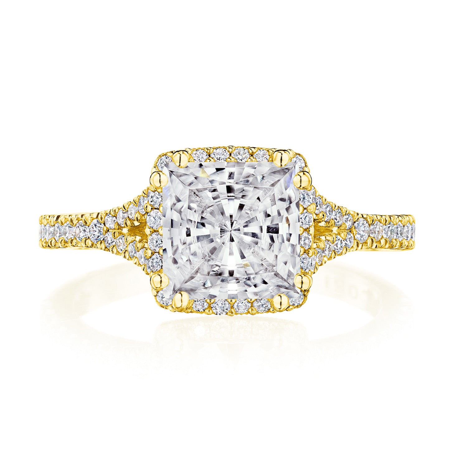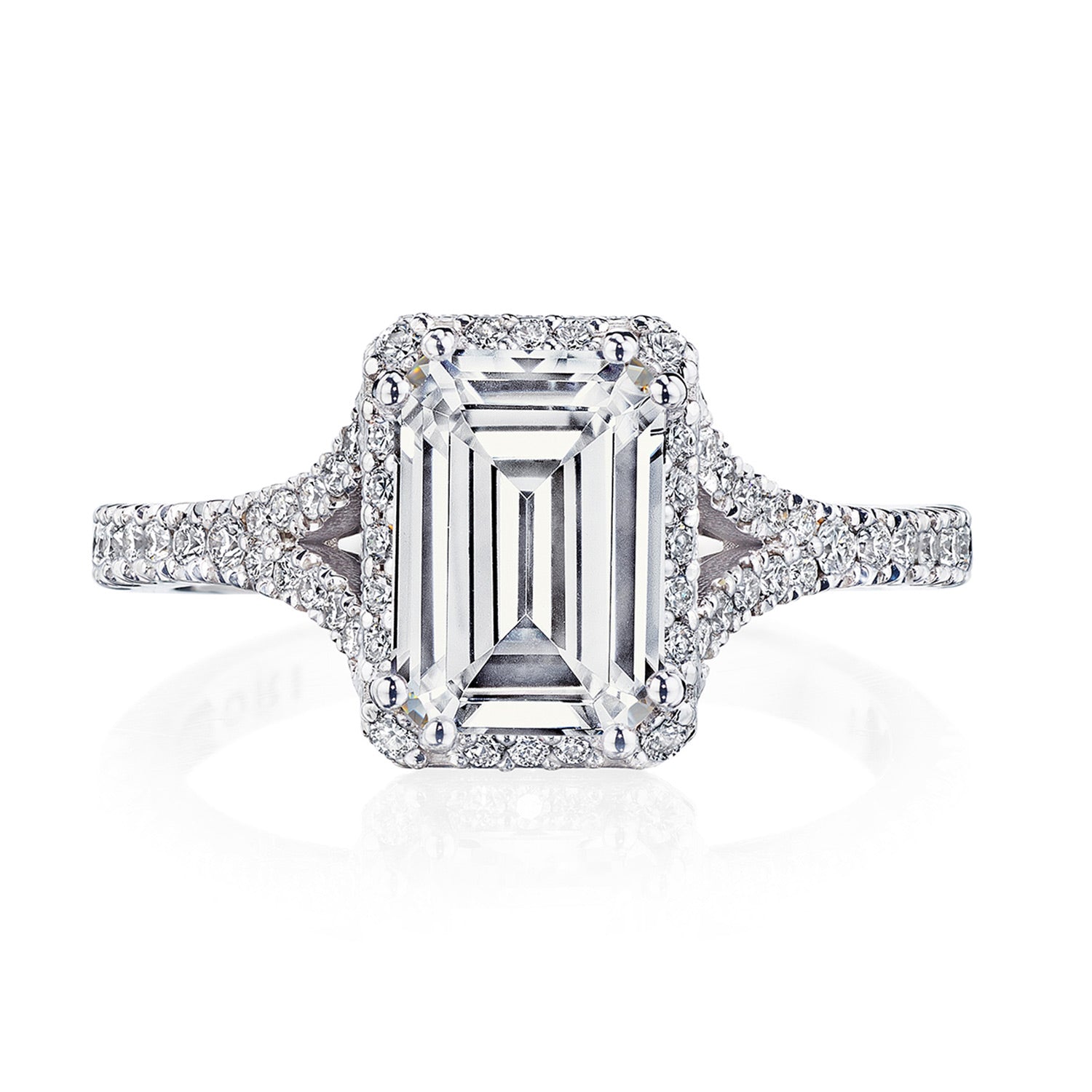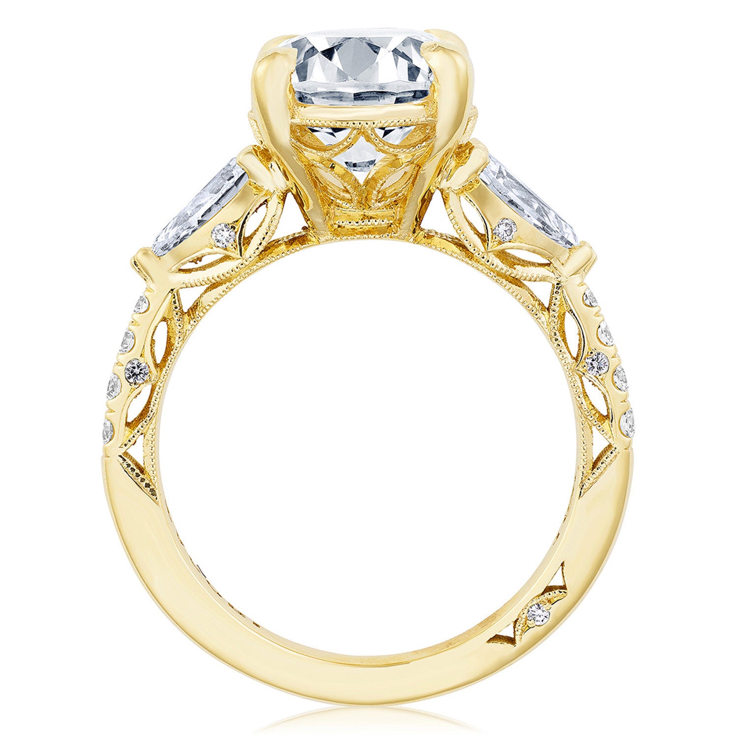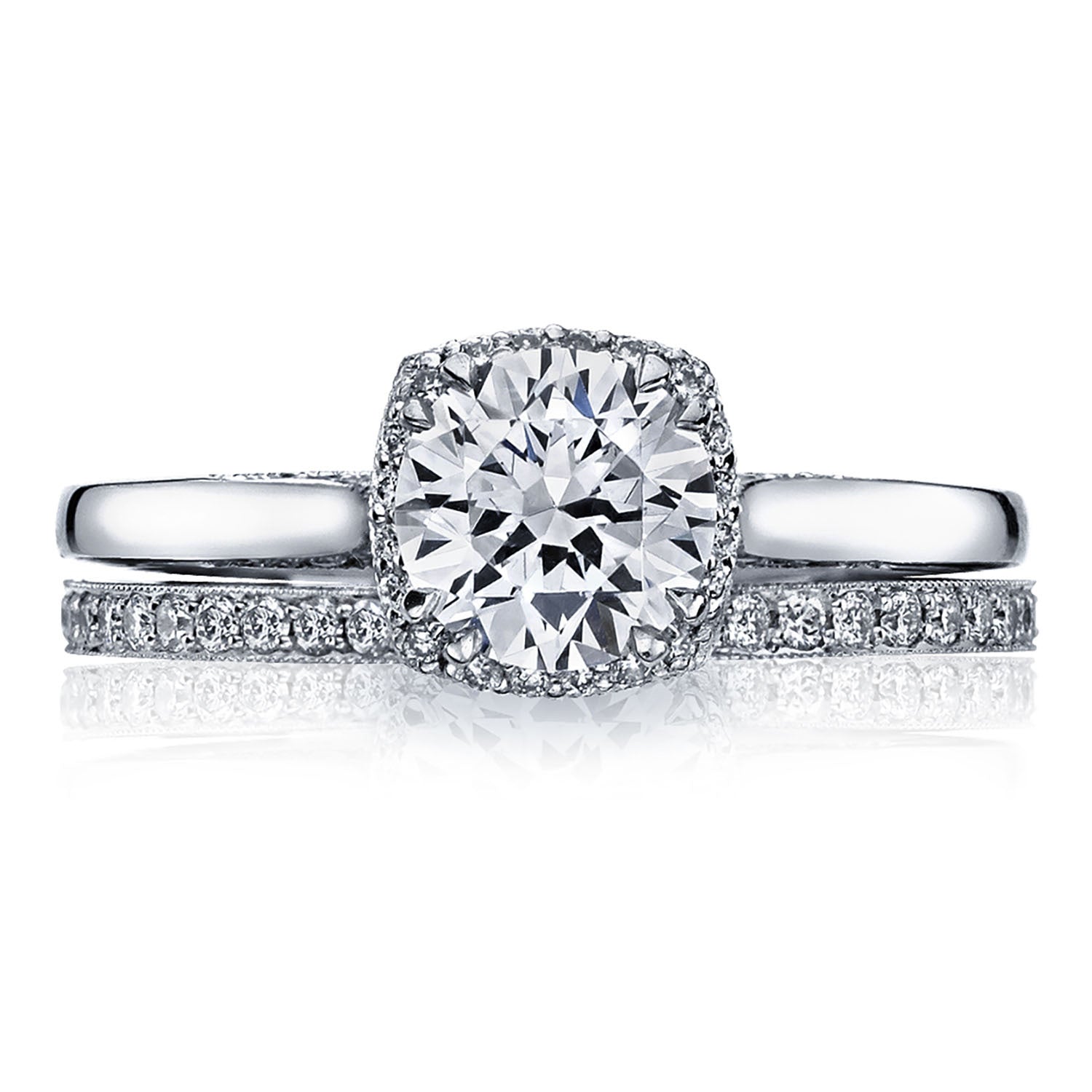 A TACORI bloom elevates the center stone, which rests on a lace-like, milgrian-studded Cathedral foundation. A pavé ceiling branches and embraces the solitaire, while a signature crescent marks the resting point of the ring.