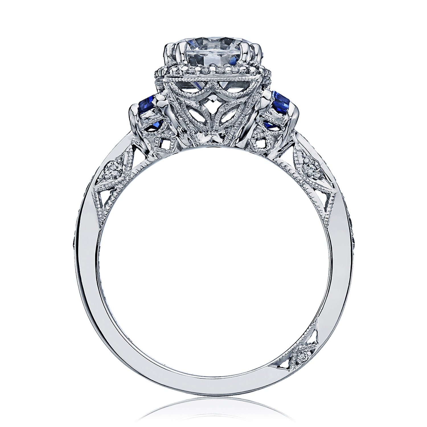 Half-moon sapphires embrace a cushion solitaire with a magnifying cushion bloom. Pave of round-brillaint diamonds traces along the ceiling, while milgrain detailing on the cathedral foundation creates a lace-like effect with unparalleled intricacy.