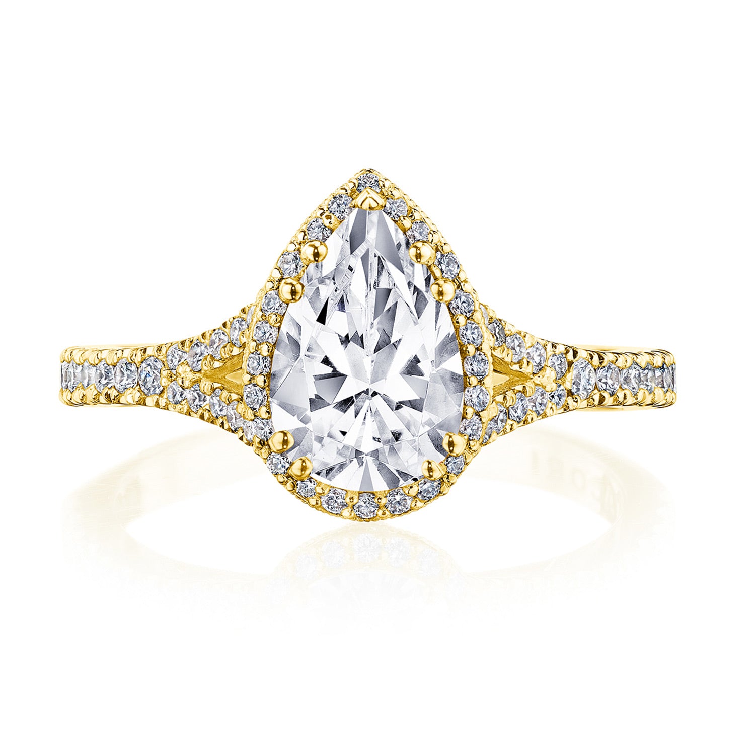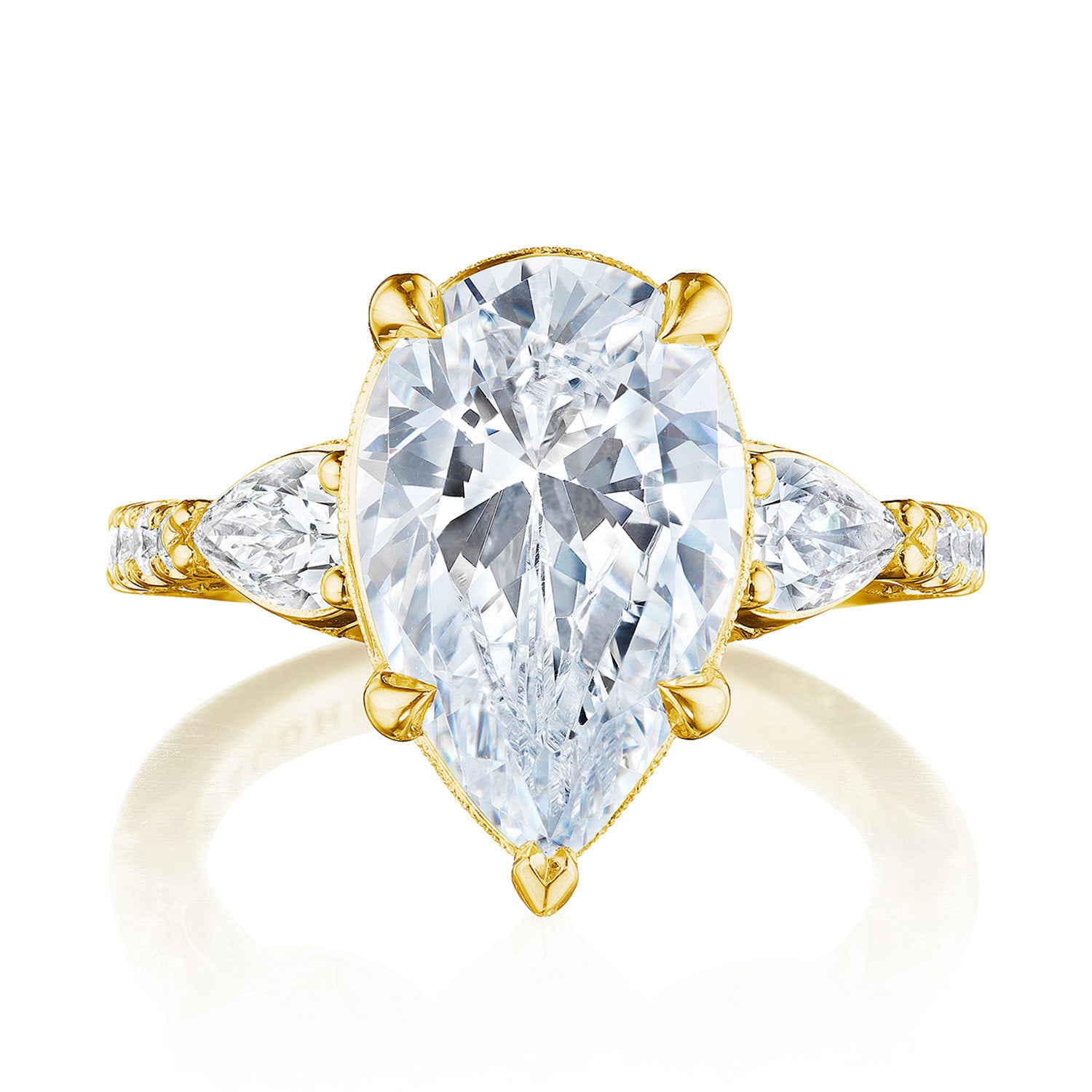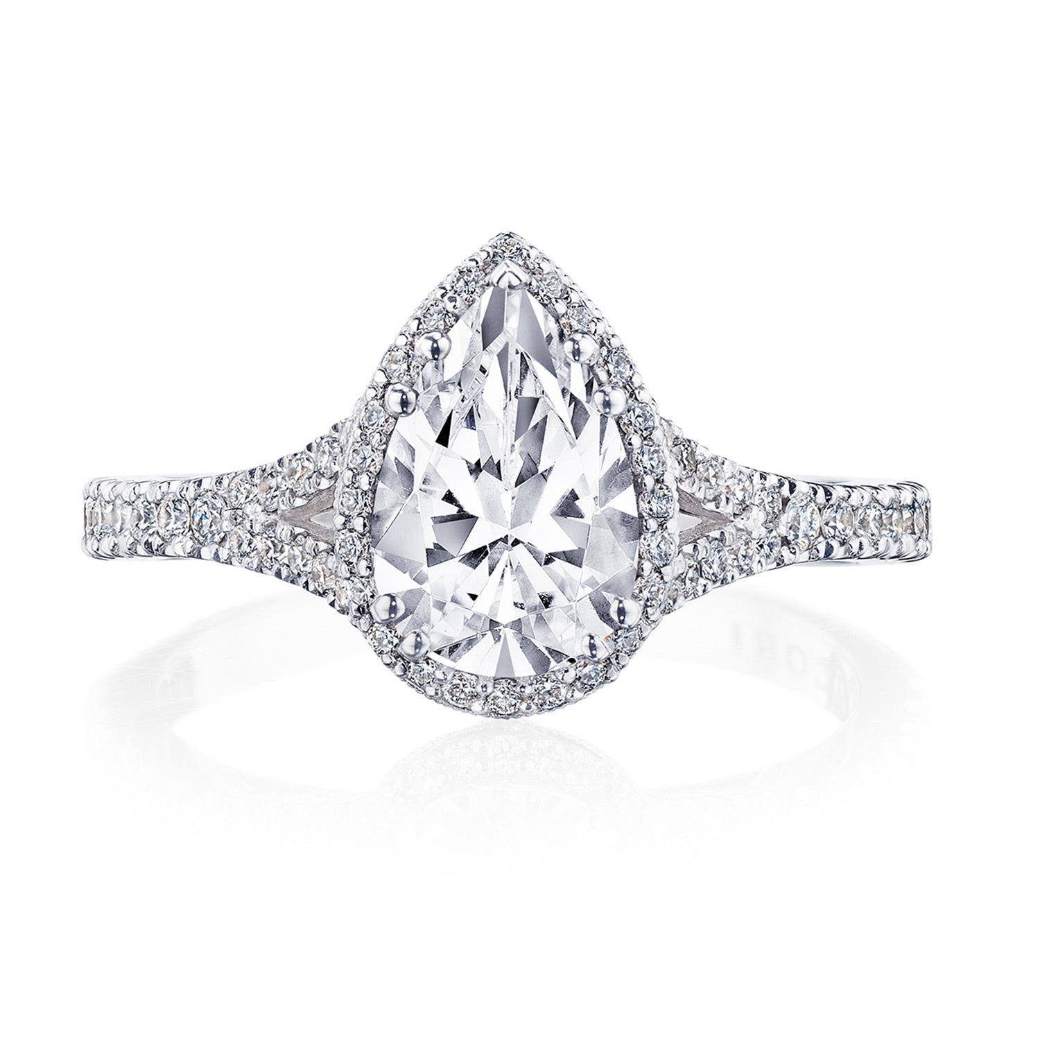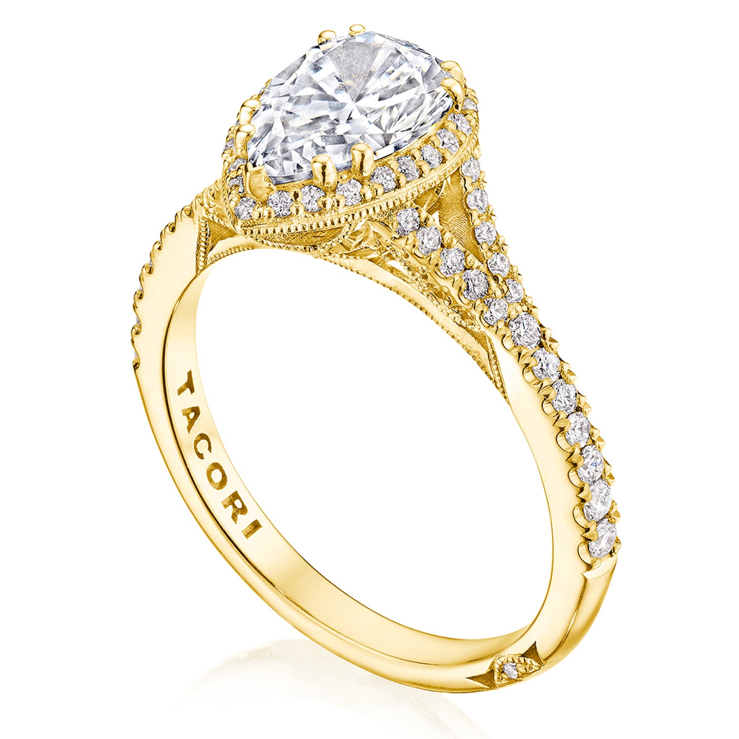 An pear bloom of diamonds around the pear solitaire gives depth and dimension, while a diamond and milgrain-studded Cathedral foundation addes intricacies. A delicate pavé creates distinguished radiance against the high-polish band.