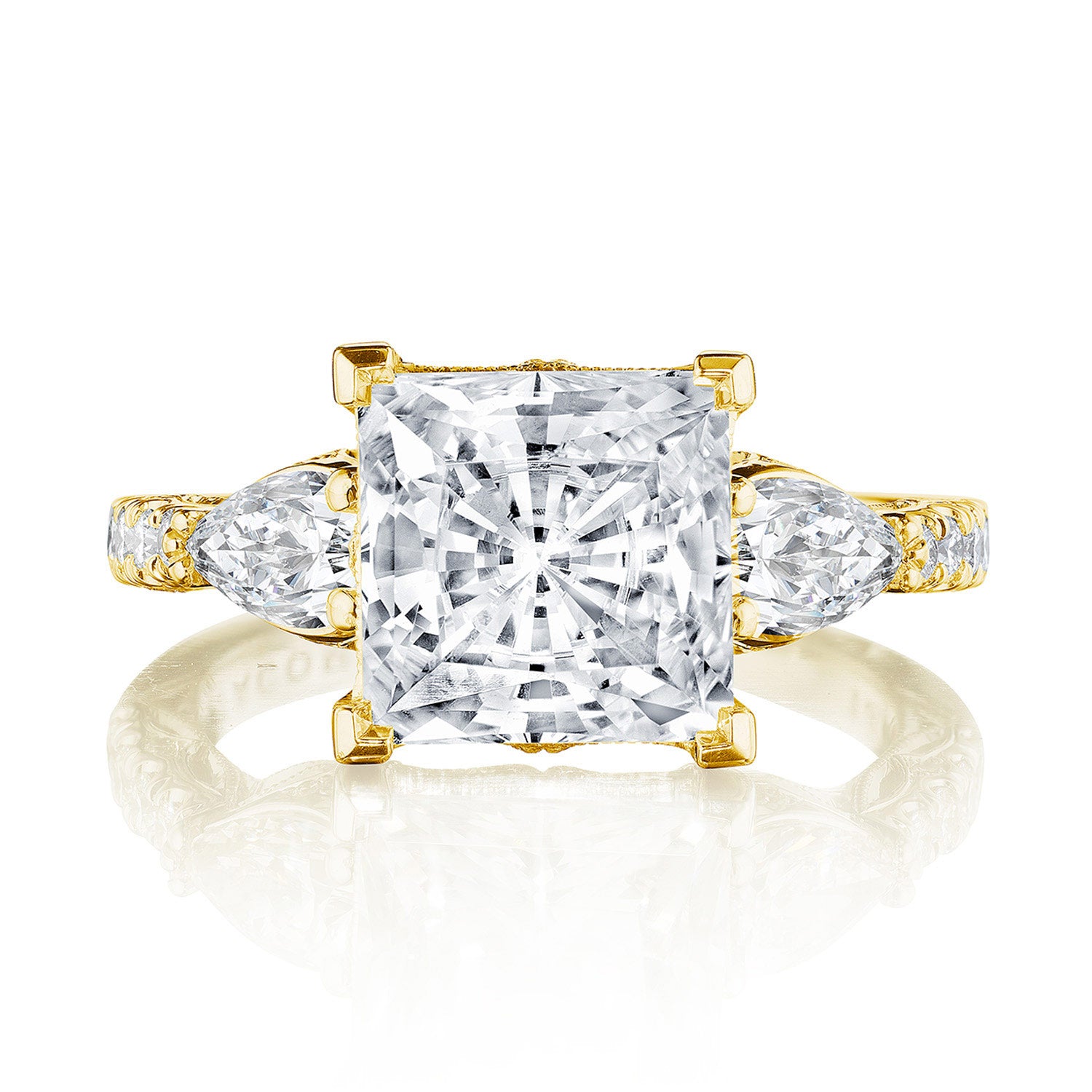 This three stone ring features distinctive pear side stones that sit atop a lace-like crown and foundation of complex, milgrain-edged Dantela Crescent Fabric. Meticulous, hand-set French pavé leads up the ceiling for eye-catching brilliance.