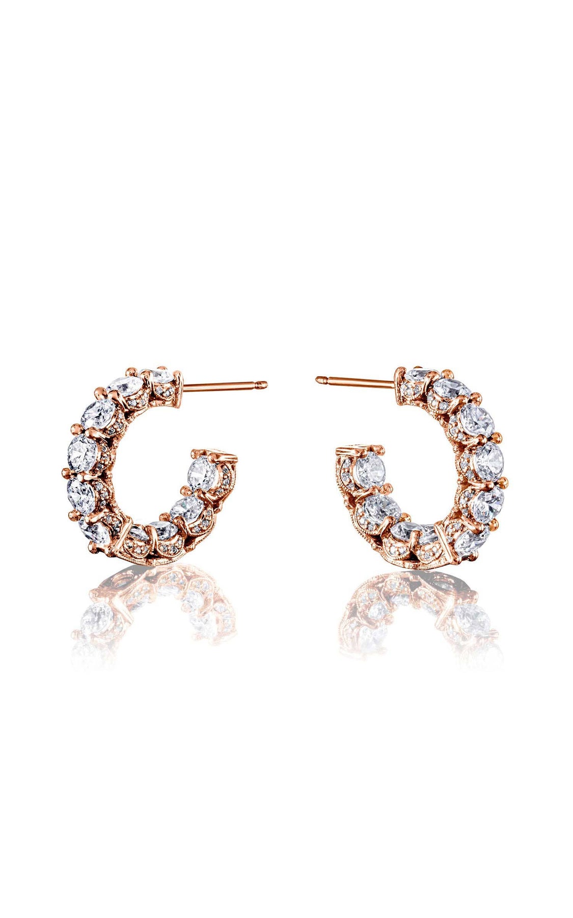 High polish bezel frames enthrall mined diamond centers, while on the reverse, meticulous hidden details of TACORI Crecents and pinpoint mined diamonds add dimensional sparkle.