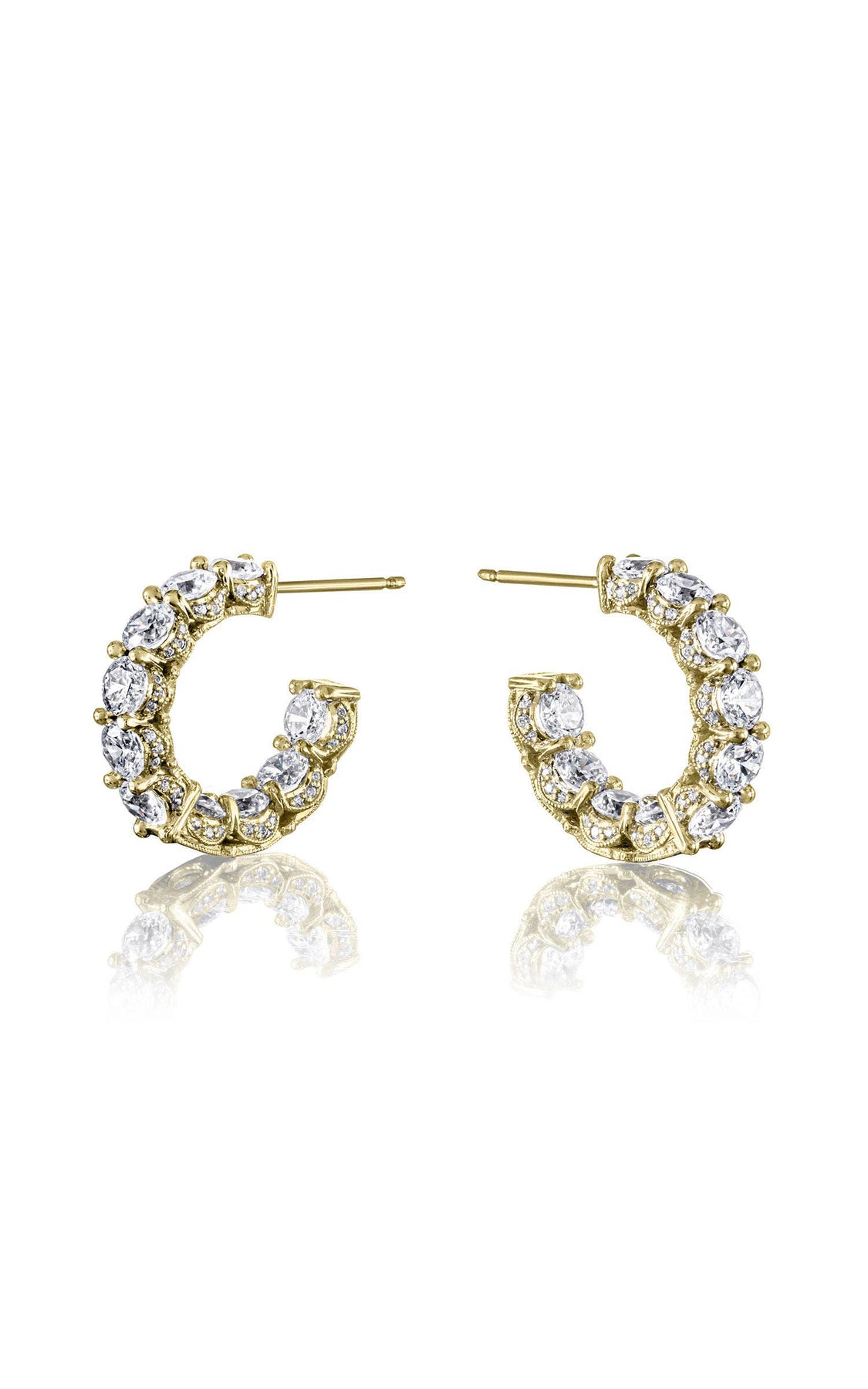 Delicate hoop earrings of 18k White Gold are meticulously hand-set with carré and round brilliant cut diamonds. Milgrain-studded TACORI Crescent detailing decorates the silhouette.