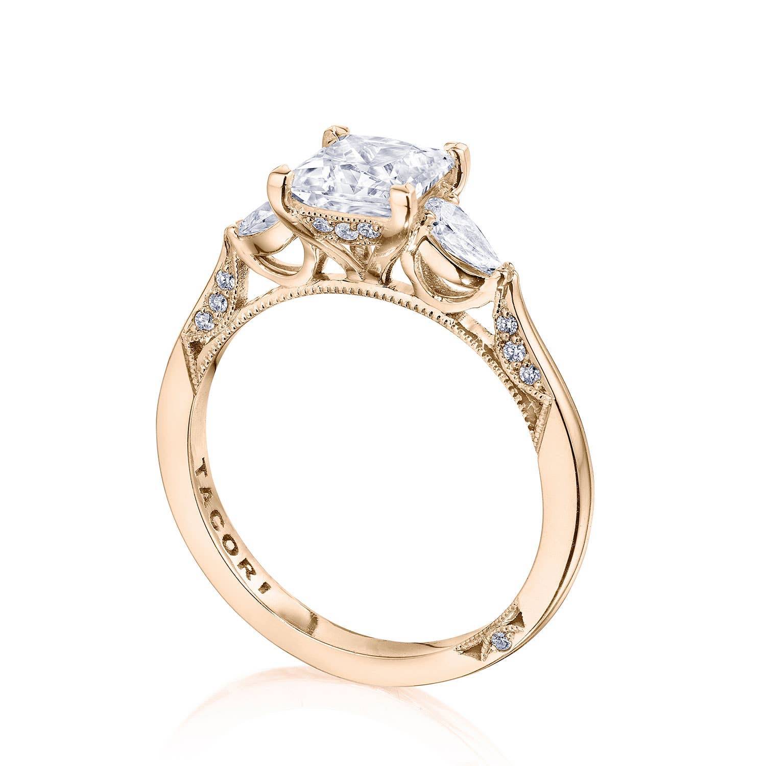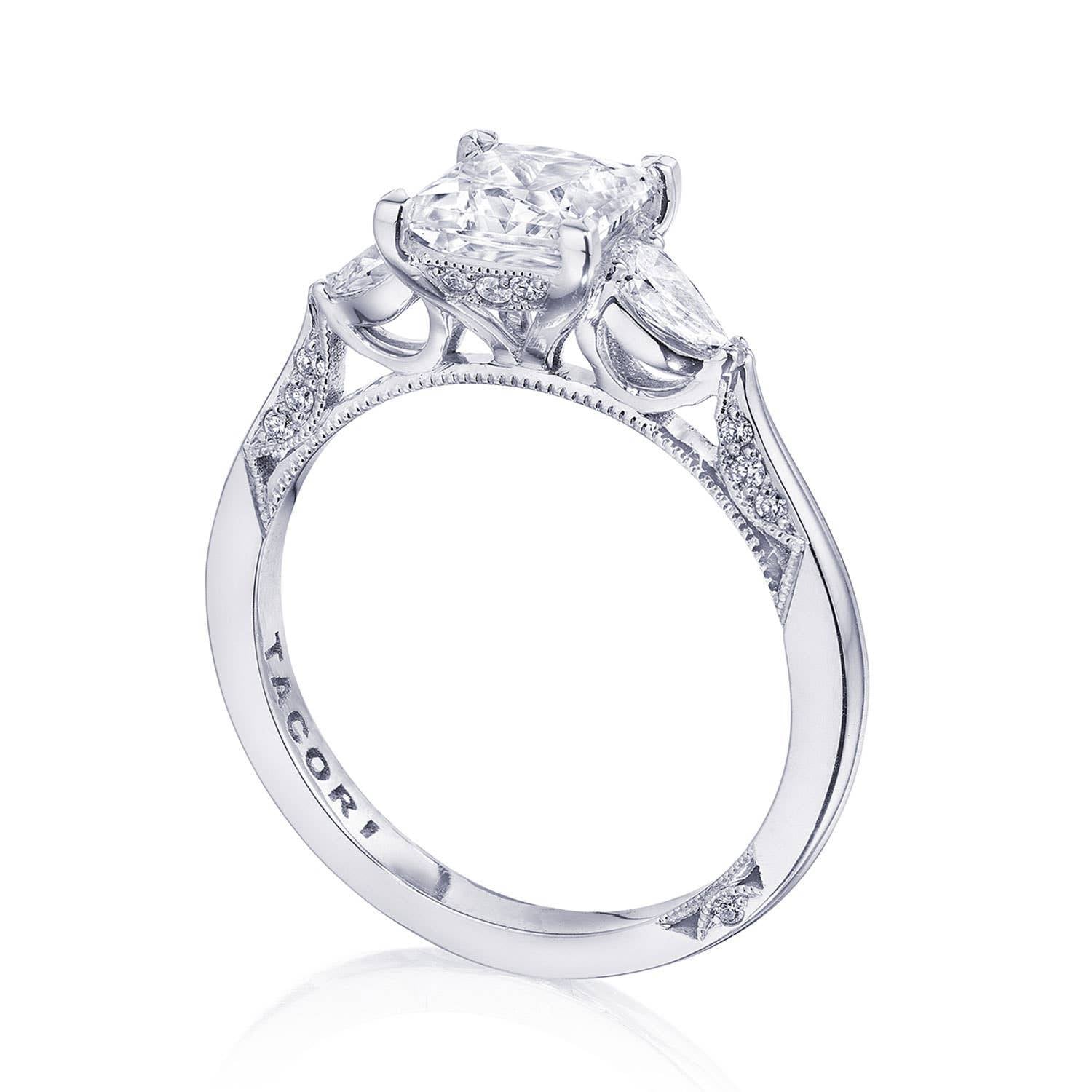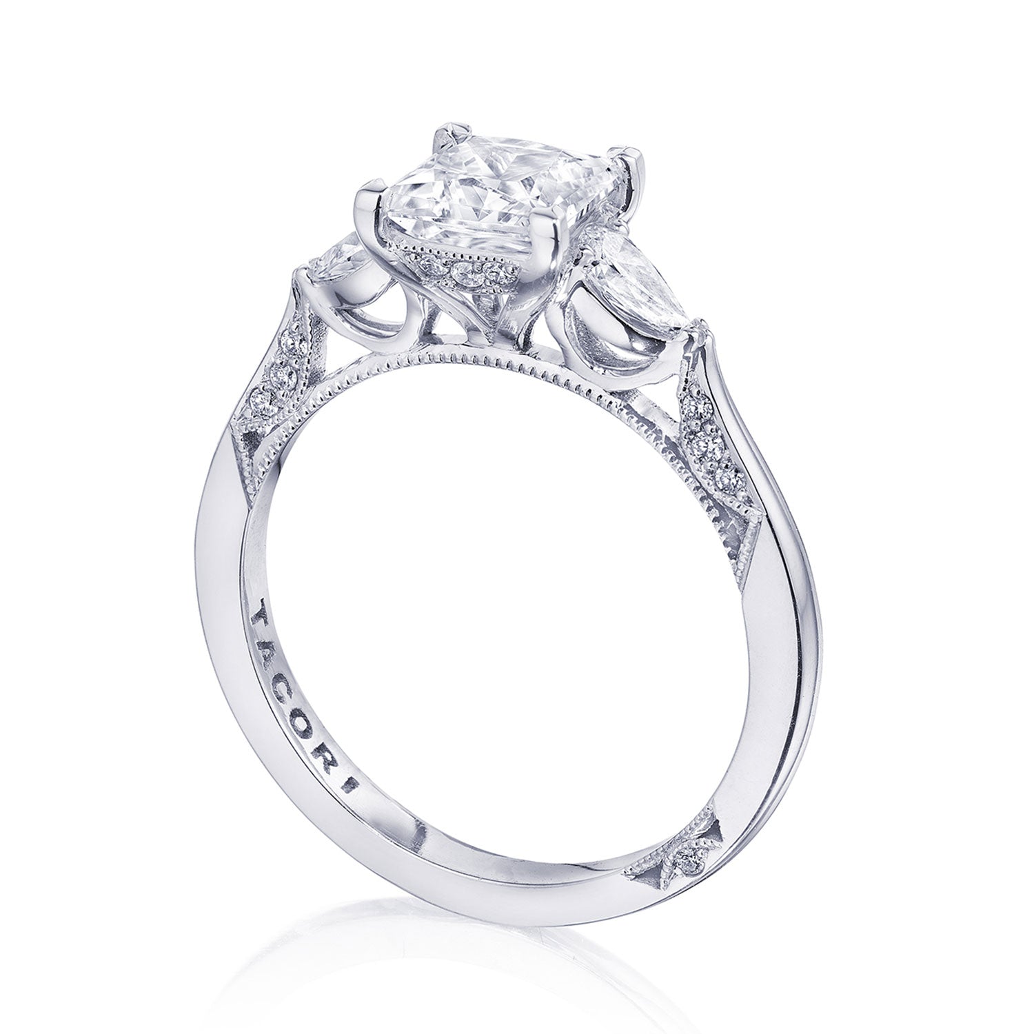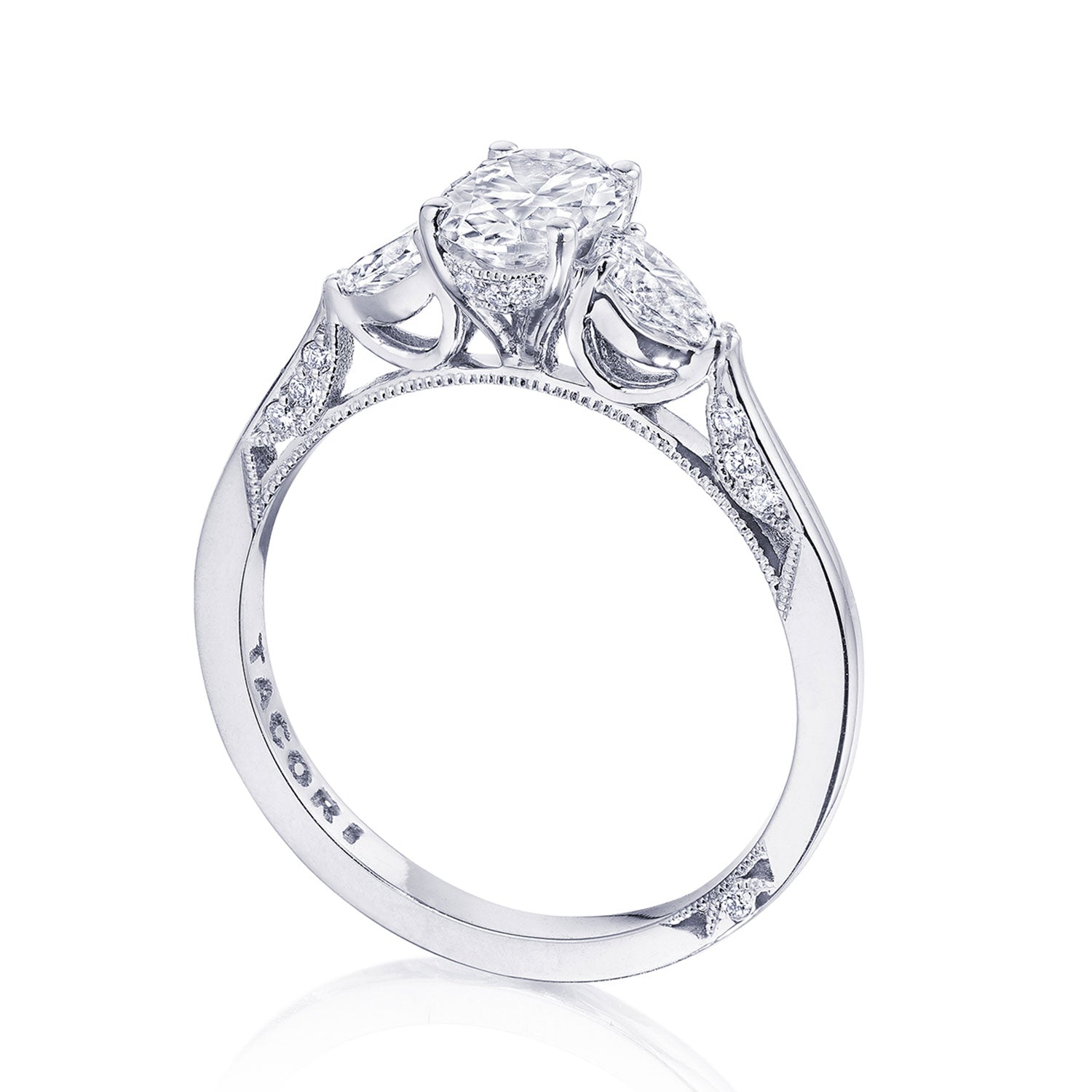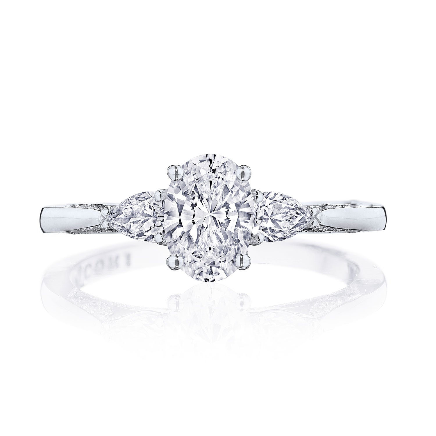 Two pear side stones accentuate the center stone, which sits on a Cathedral foundation with a hidden bloom. Simply Tacori crescent fabric adds diamond detail to the innerface and complements the high-polish band.