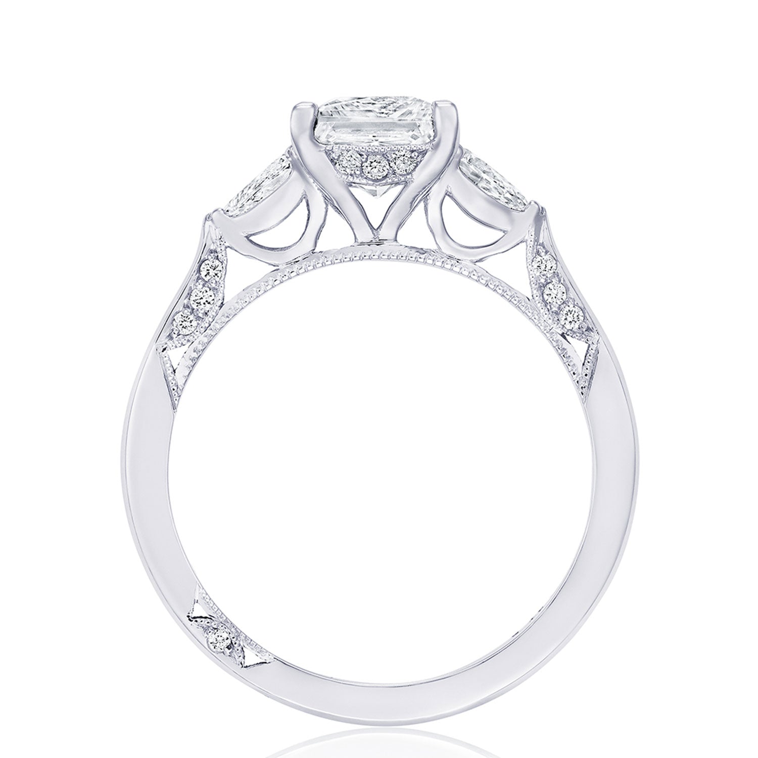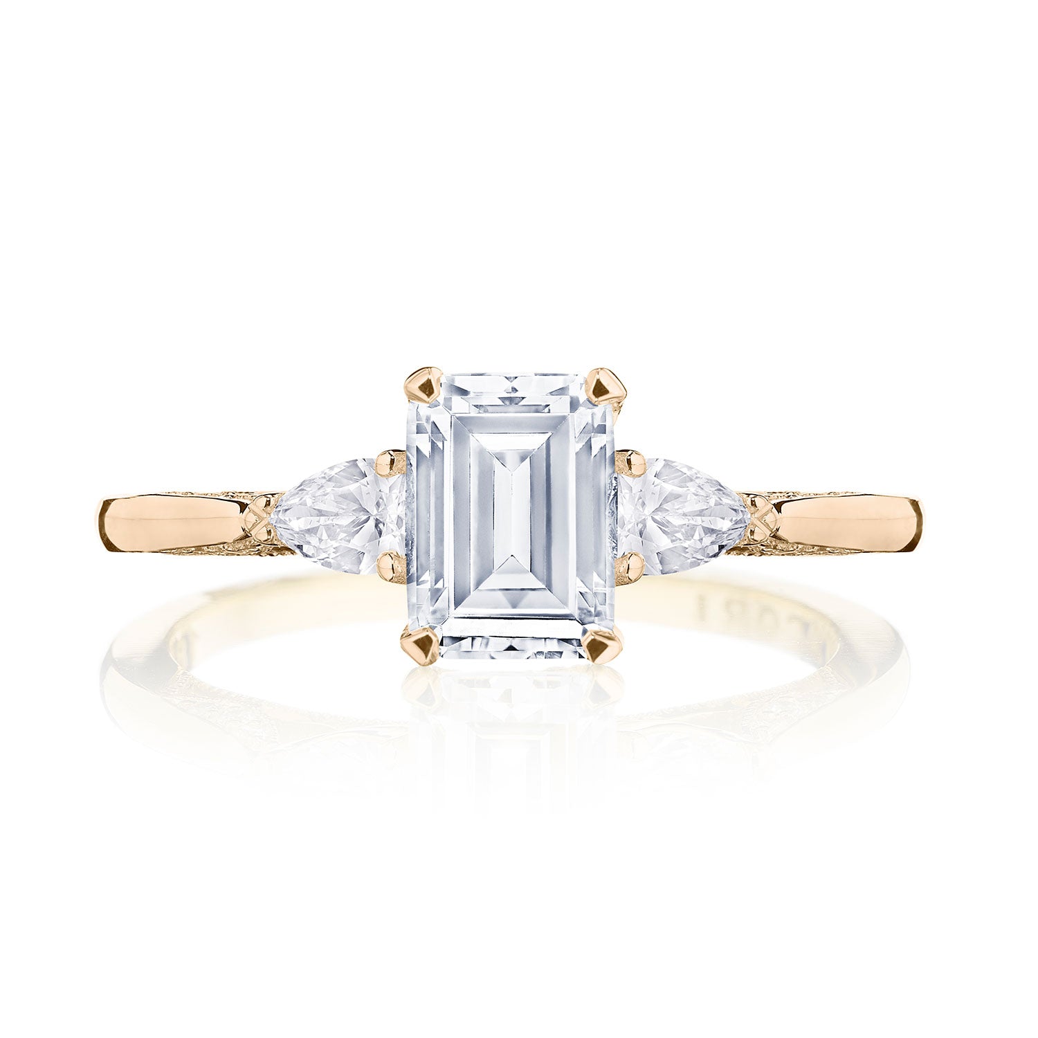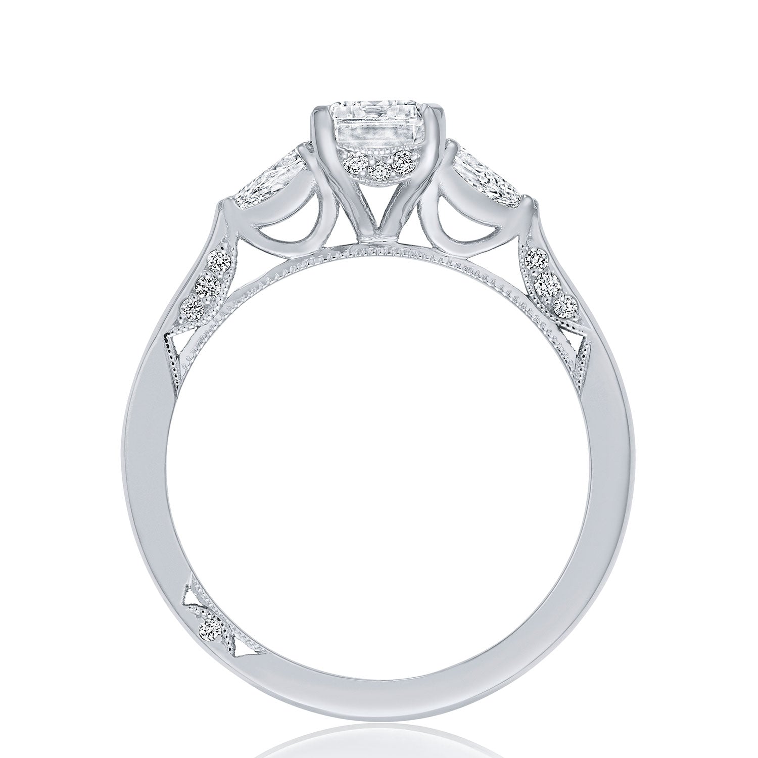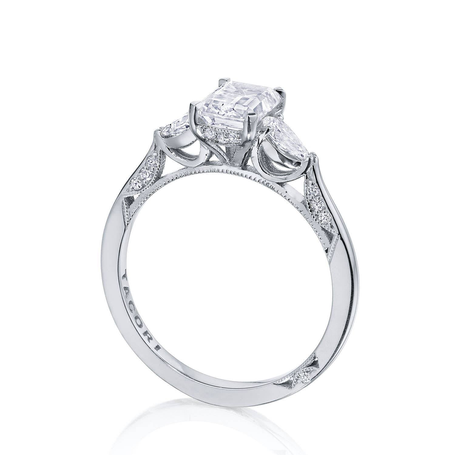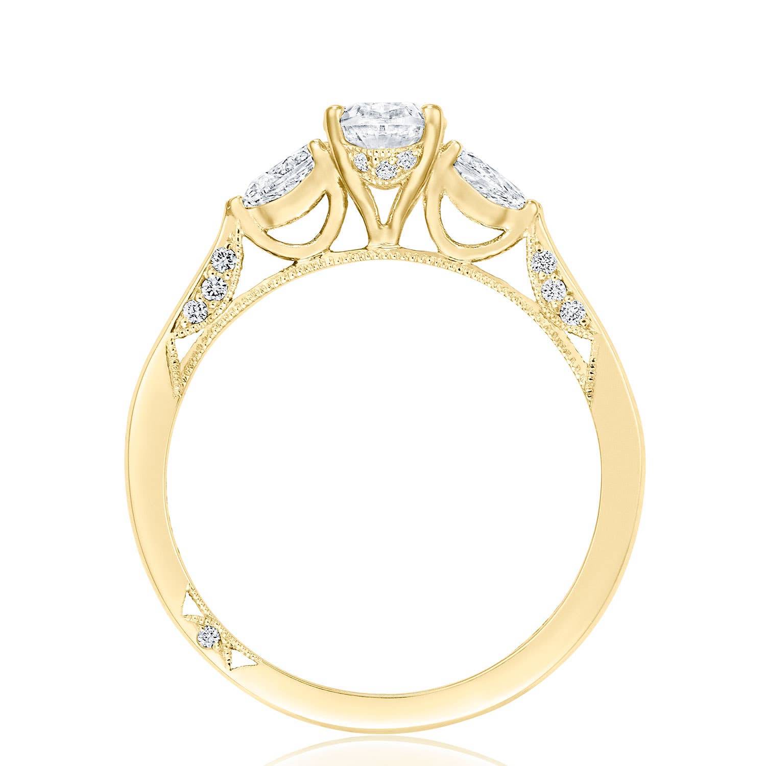 Two pear side stones accentuate the center stone, which sits on a Cathedral foundation with a hidden bloom. Simply Tacori crescent fabric adds diamond detail to the innerface and complements the high-polish band.