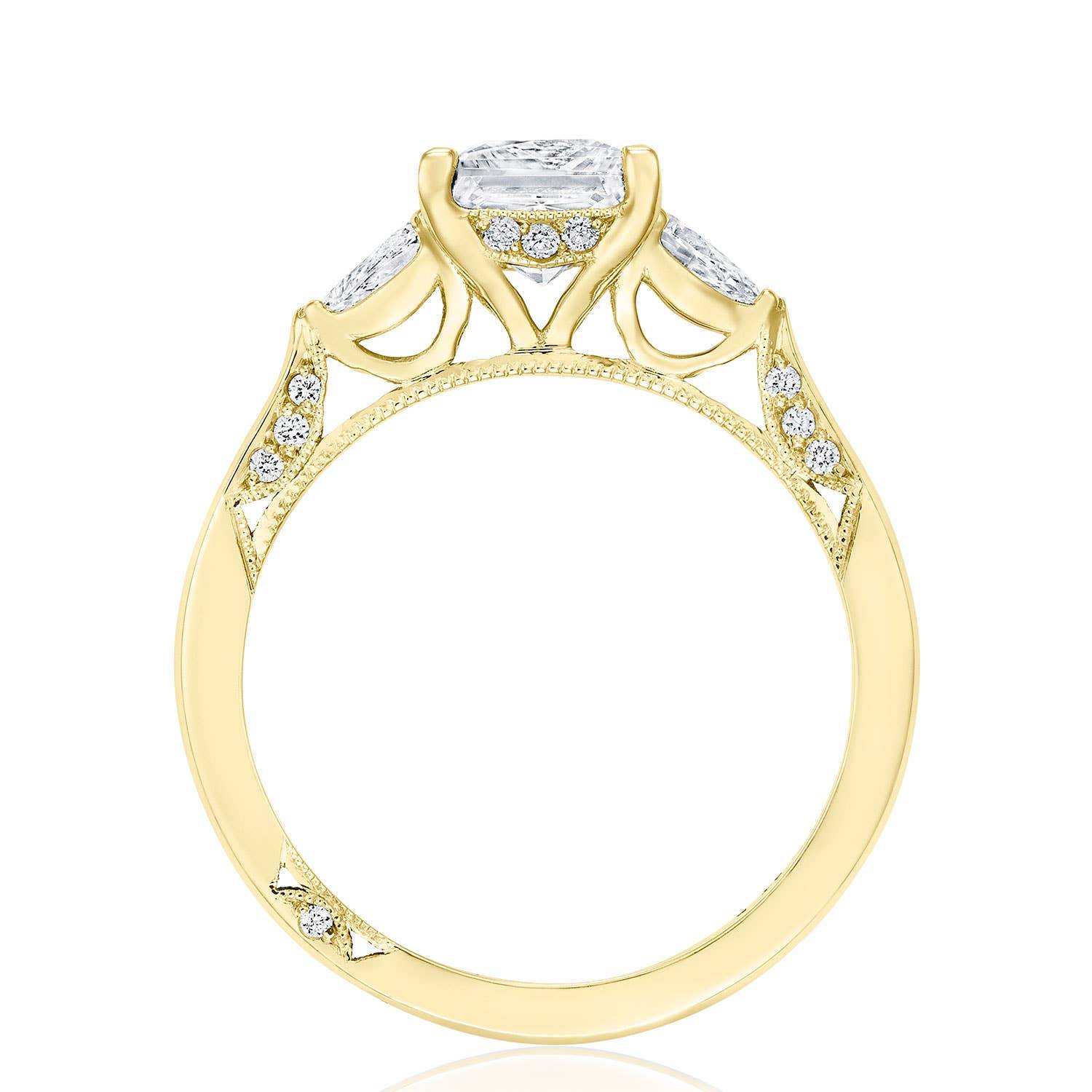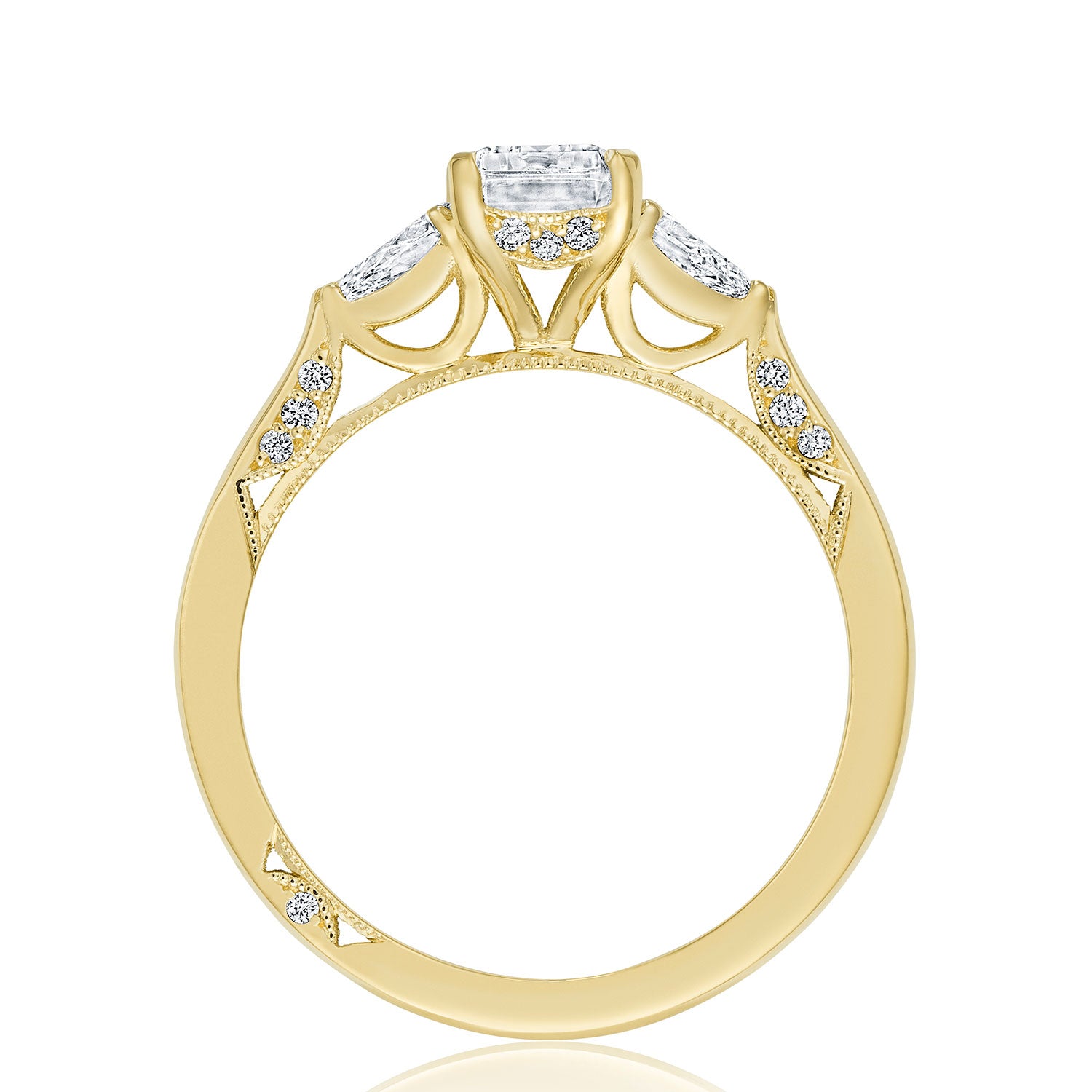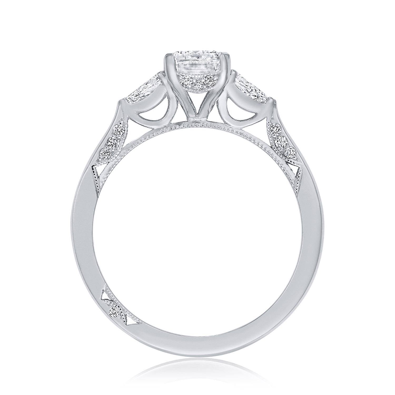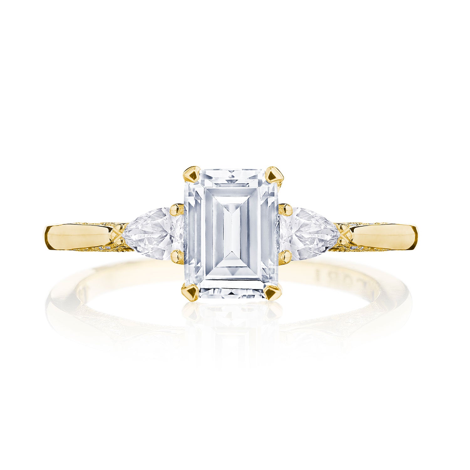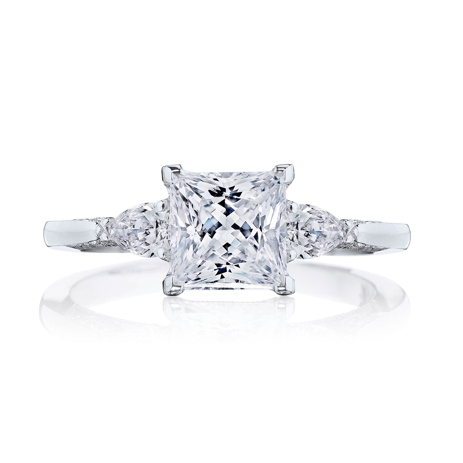 Two pear side stones accentuate the center stone, which sits on a Cathedral foundation with a hidden bloom. Simply Tacori crescent fabric adds diamond detail to the innerface and complements the high-polish band.