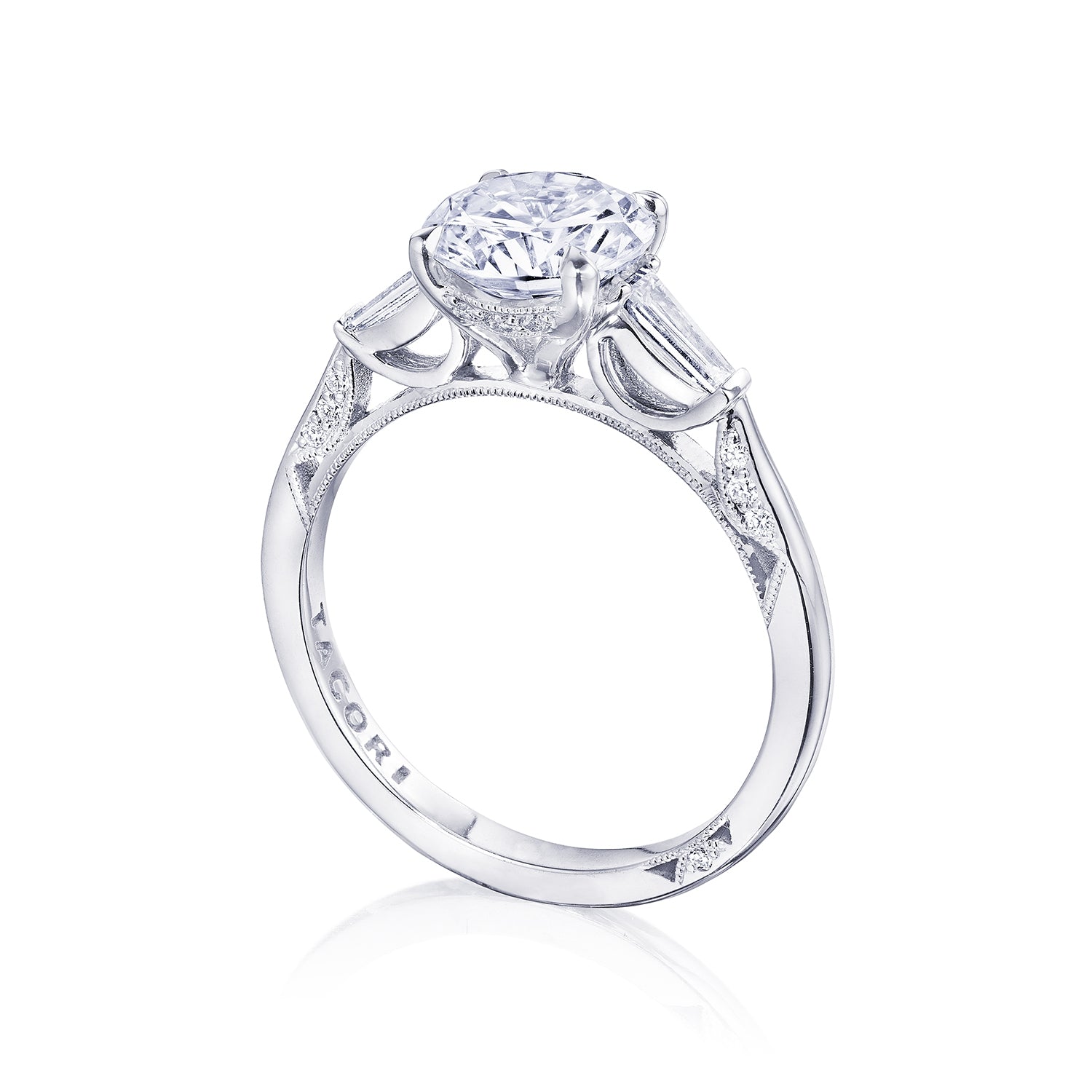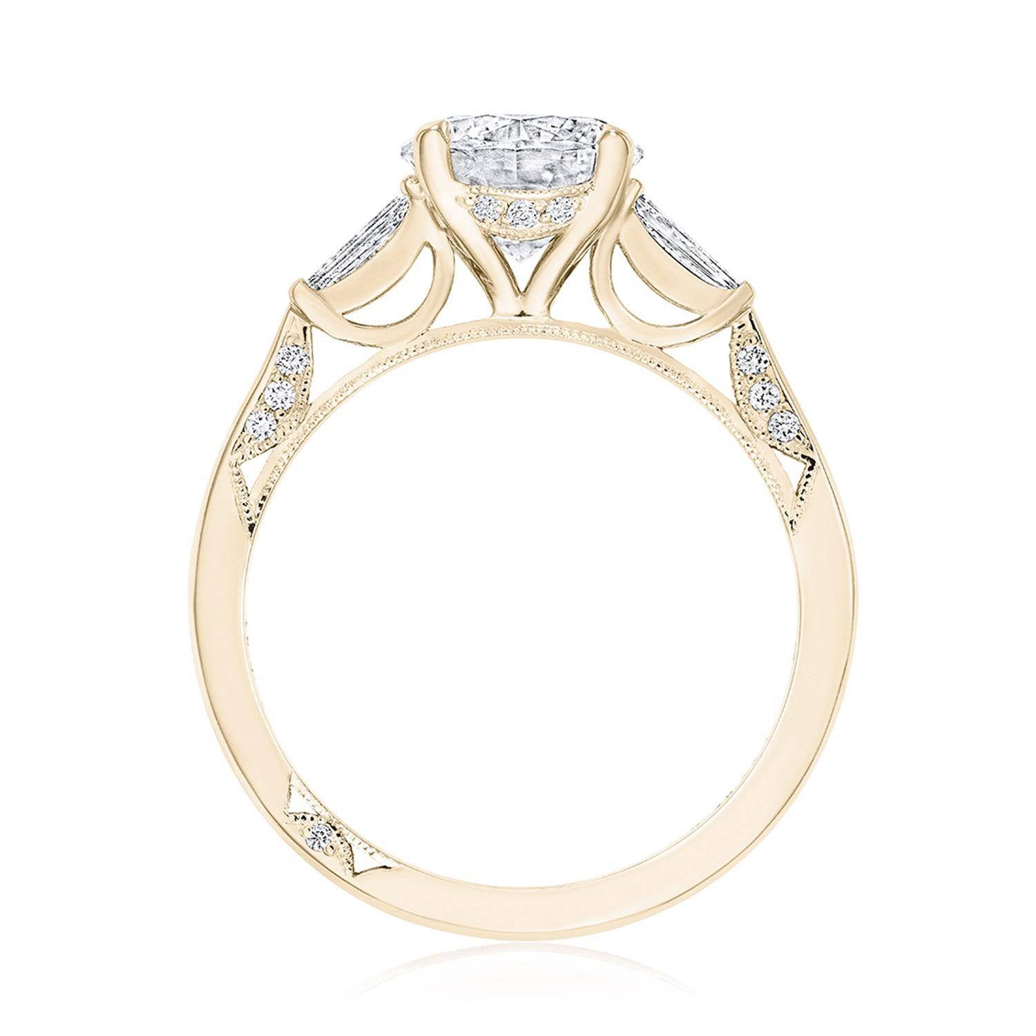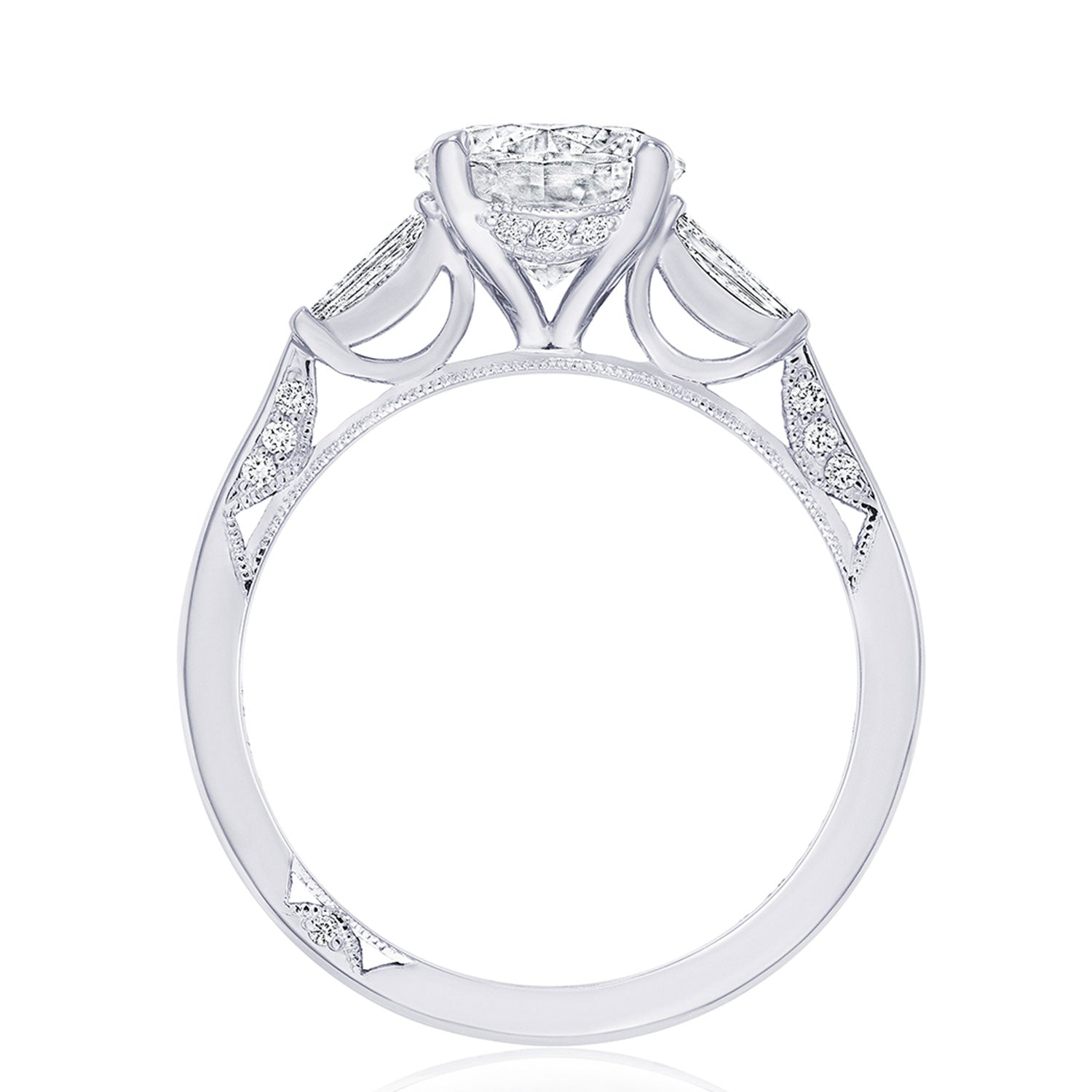 Baguette side stones accentuate the center stone, which sits on a Cathedral foundation with a hidden bloom. Simply Tacori crescent fabric adds diamond detailing to the innerface of the ring and complements the high-polish ceiling.