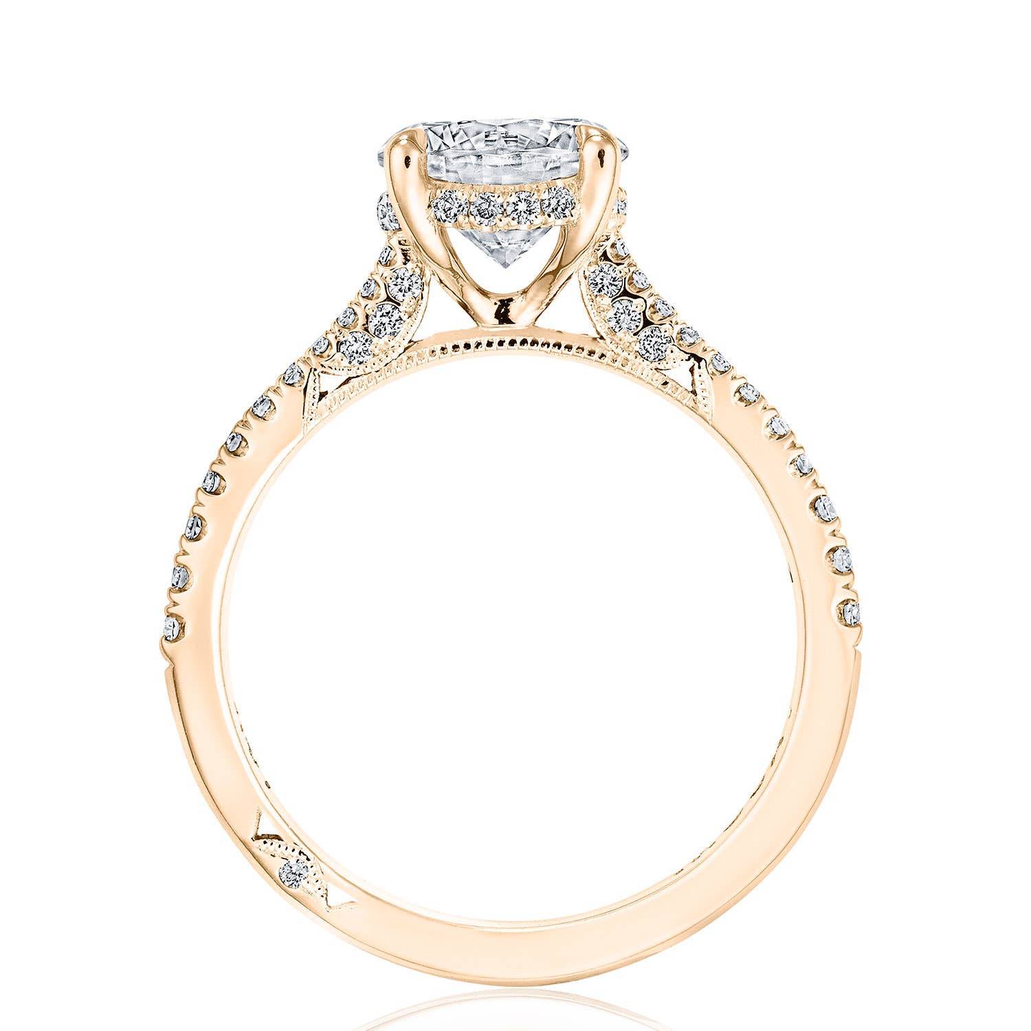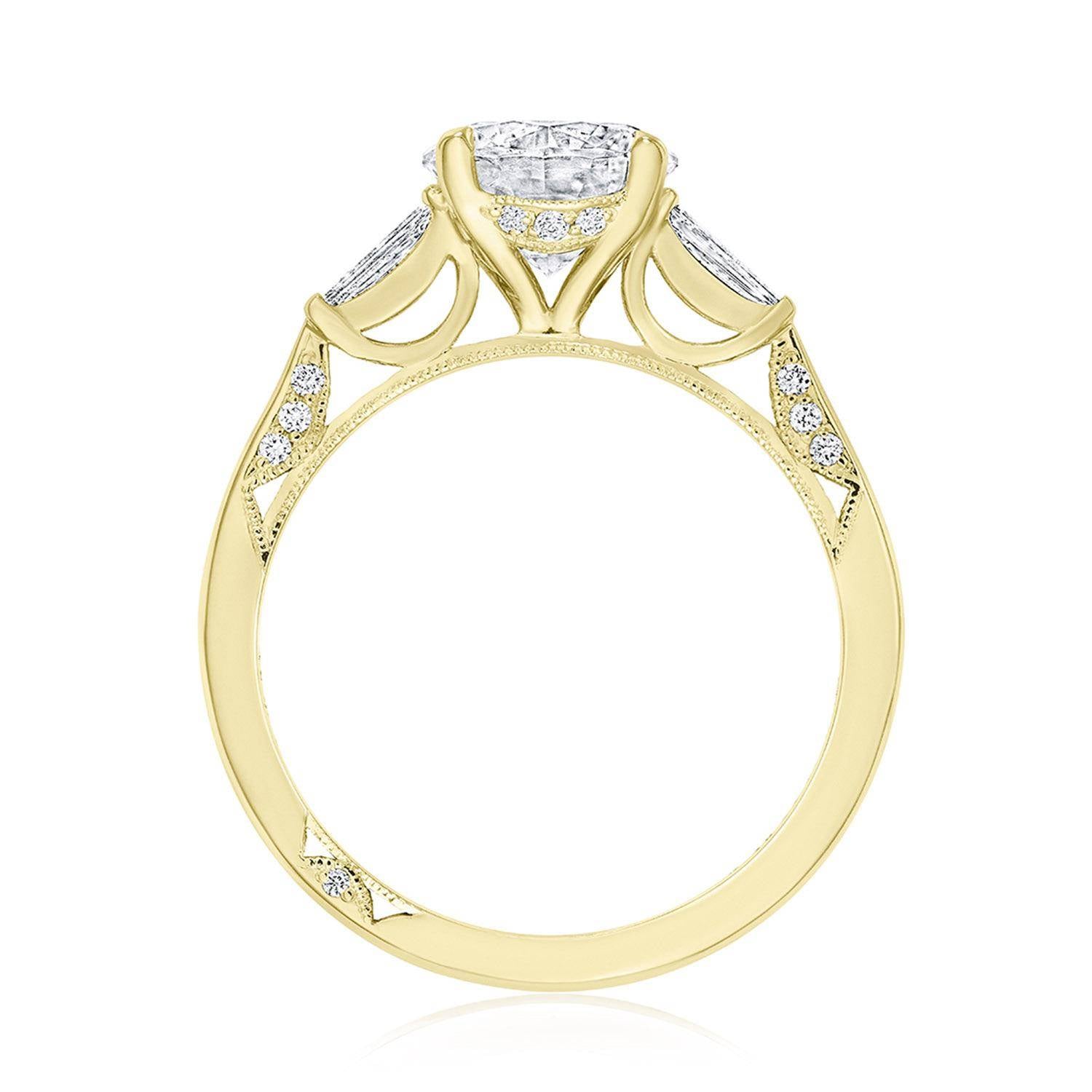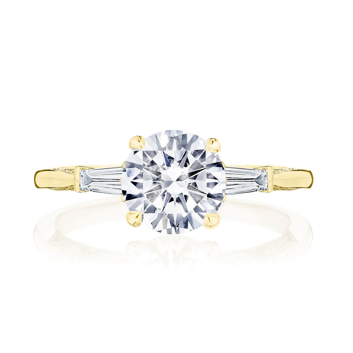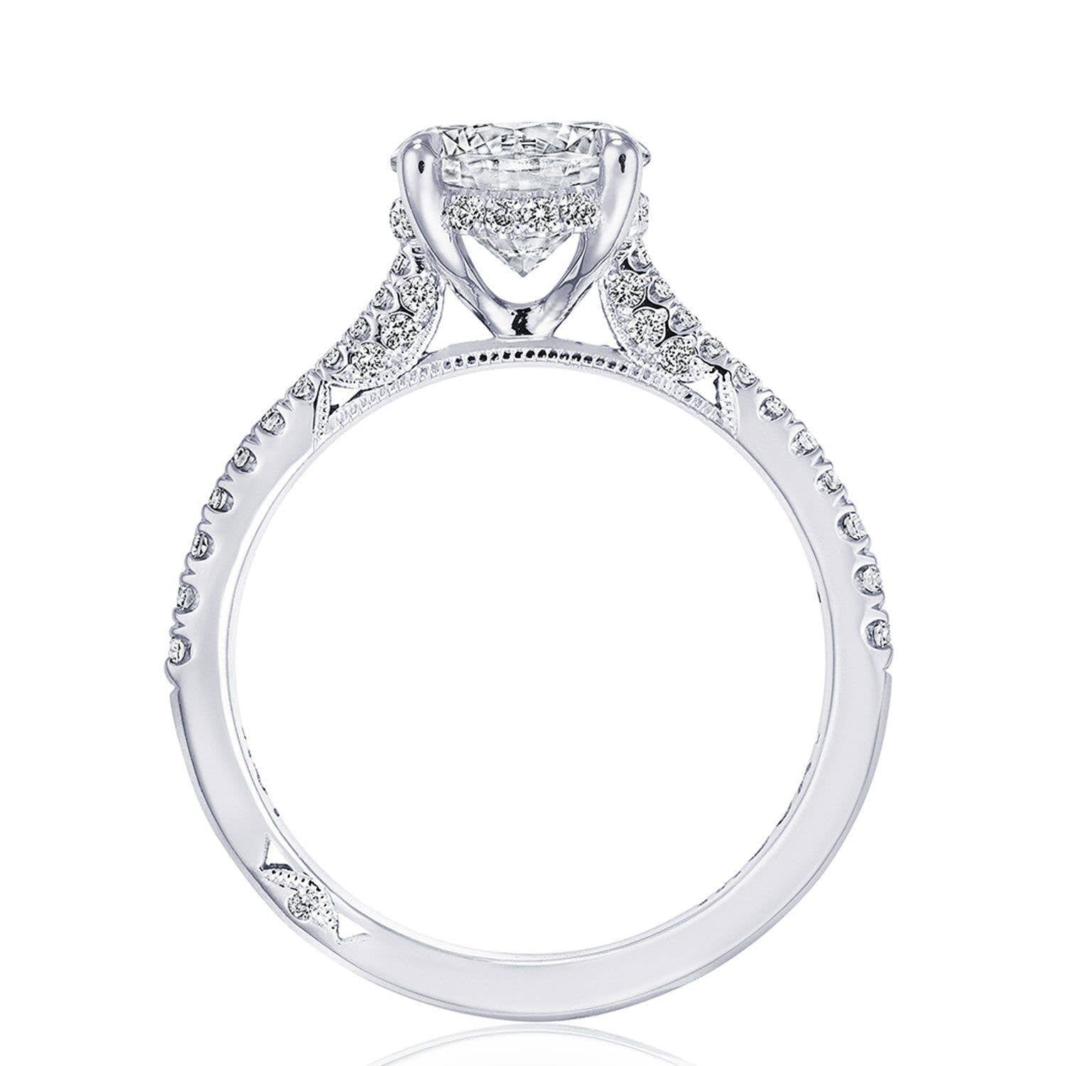 Baguette side stones accentuate the center stone, which sits on a Cathedral foundation with a hidden bloom. Simply Tacori crescent fabric adds diamond detailing to the innerface of the ring and complements the high-polish ceiling.