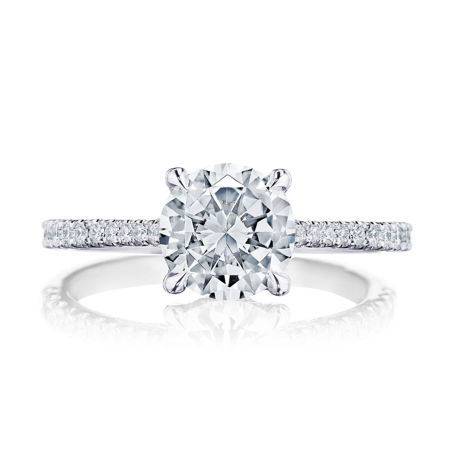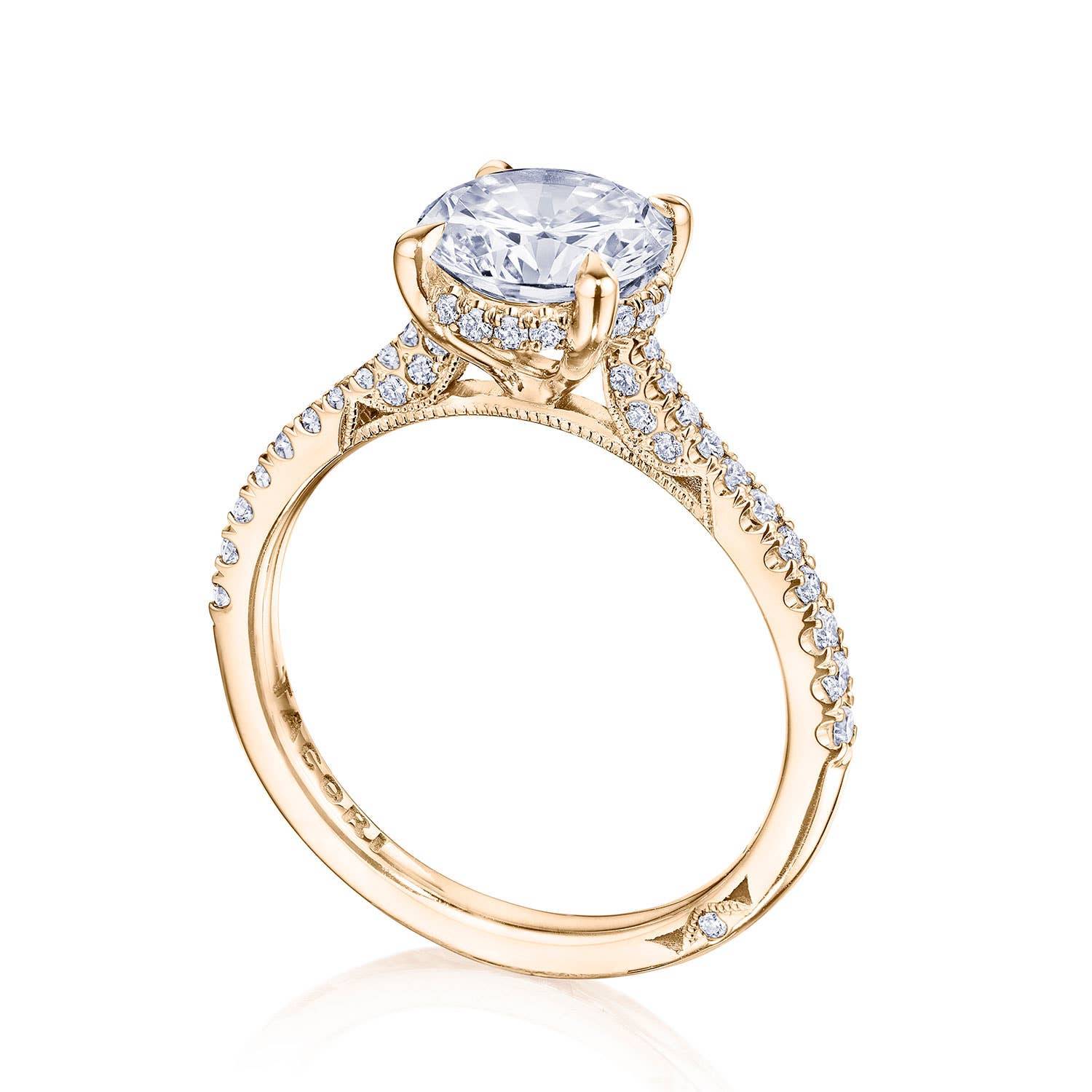 A round brilliant-cut diamond stands on a Cathedral Foundation with a hidden bloom, just above a thin, sparkling French- pavé band. A modern Simply TACORI crescent fabric decorates the band's ceiling, and a signature crescent adorns the resting point.