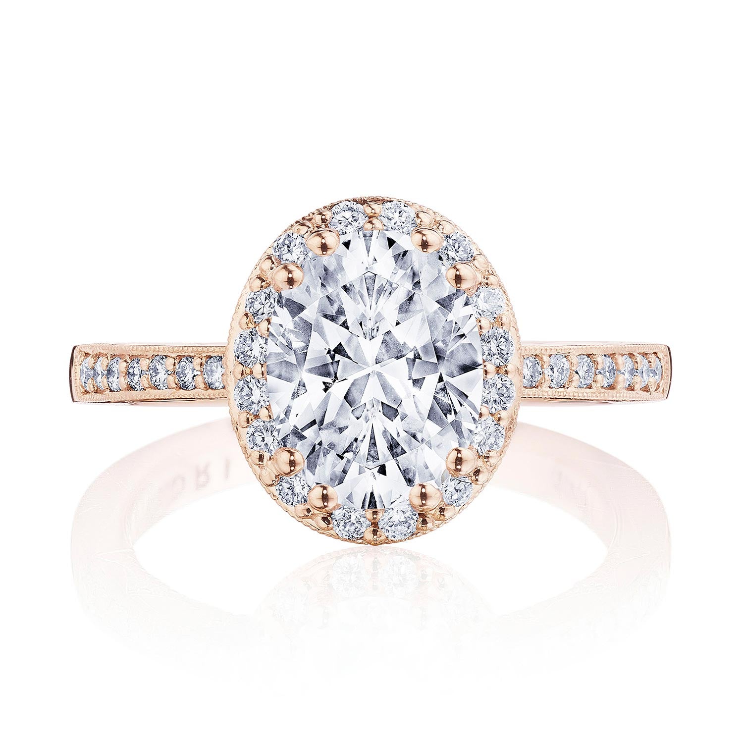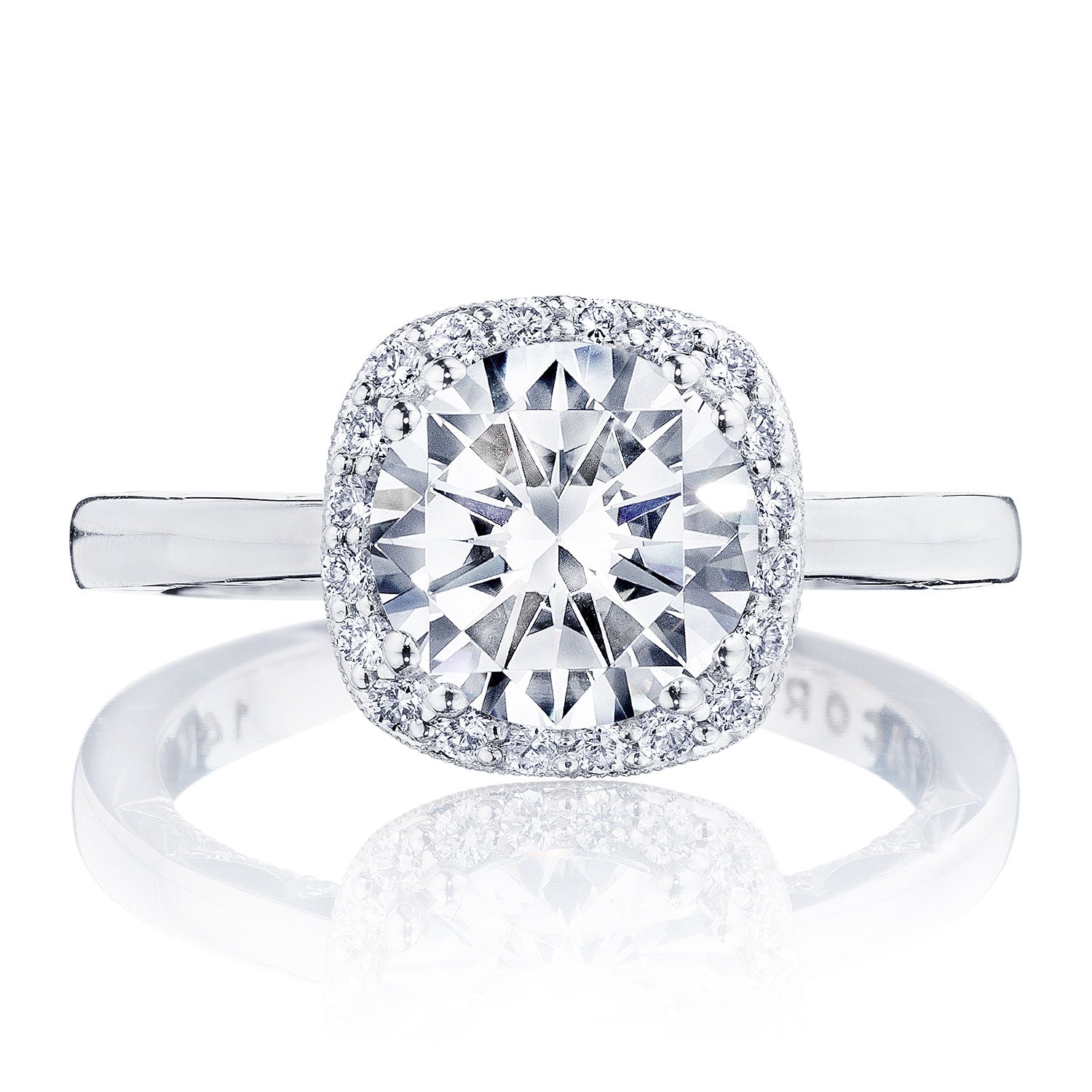 A high-polish ceiling is complemented by a Coastal Crescent fabric on the innerface, which boasts dainty pinpoint diamond detailing. A cushion bloom surrounds the center stone, which rests on a metal-intense, geometric Cathedral Foundation.