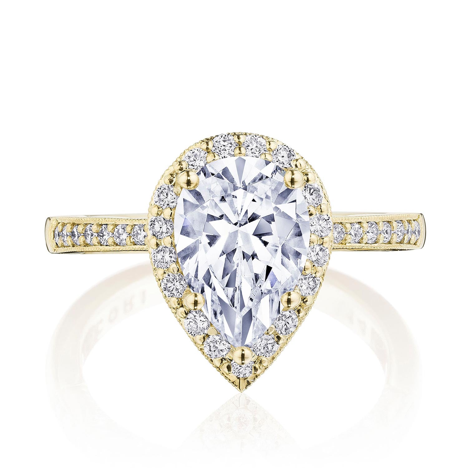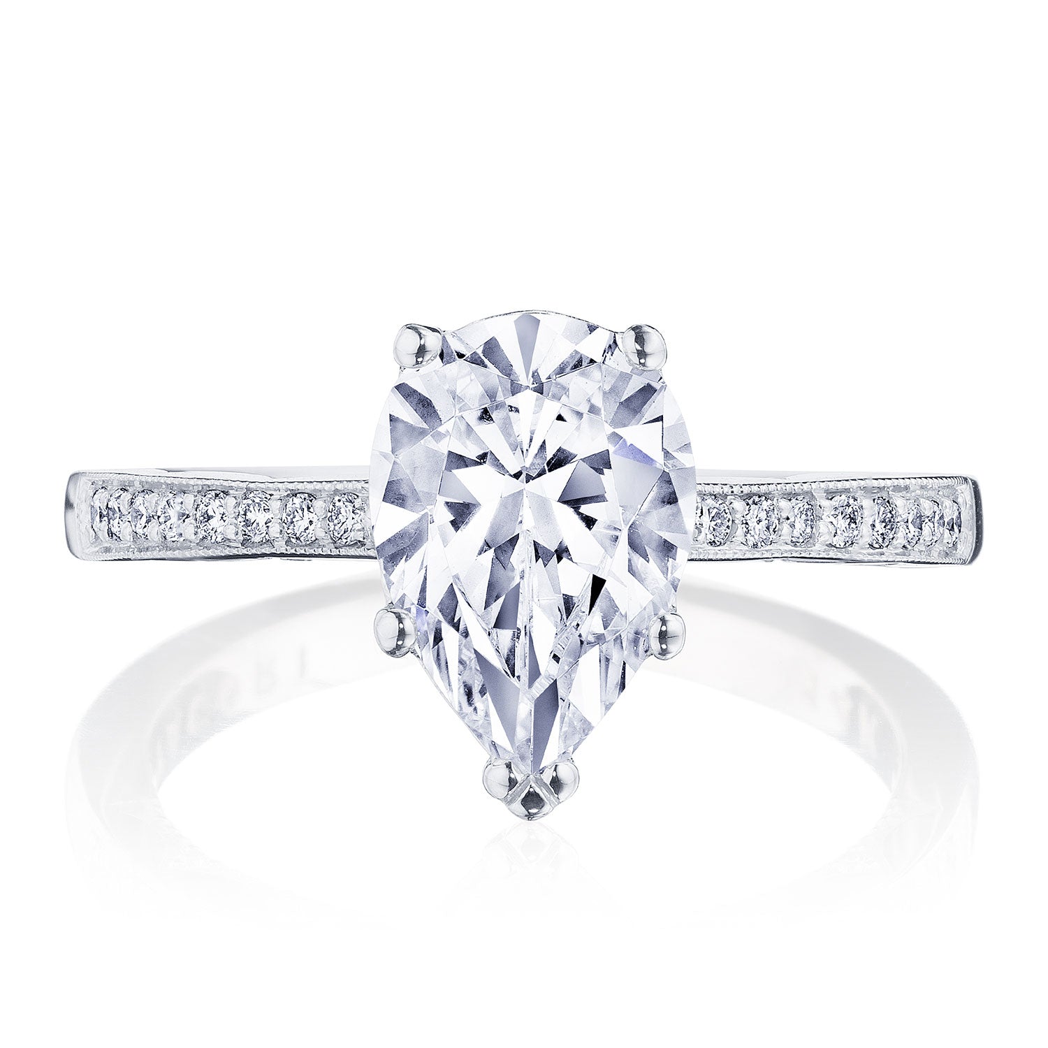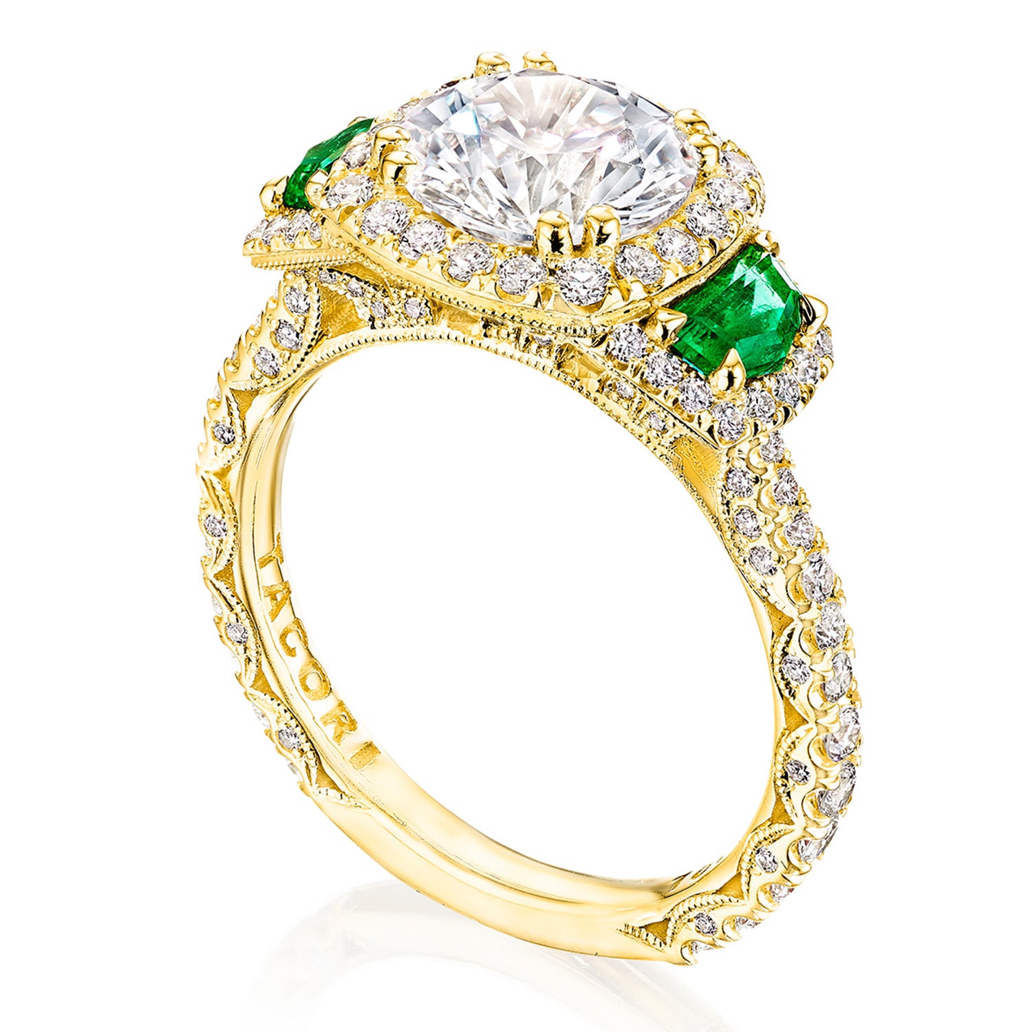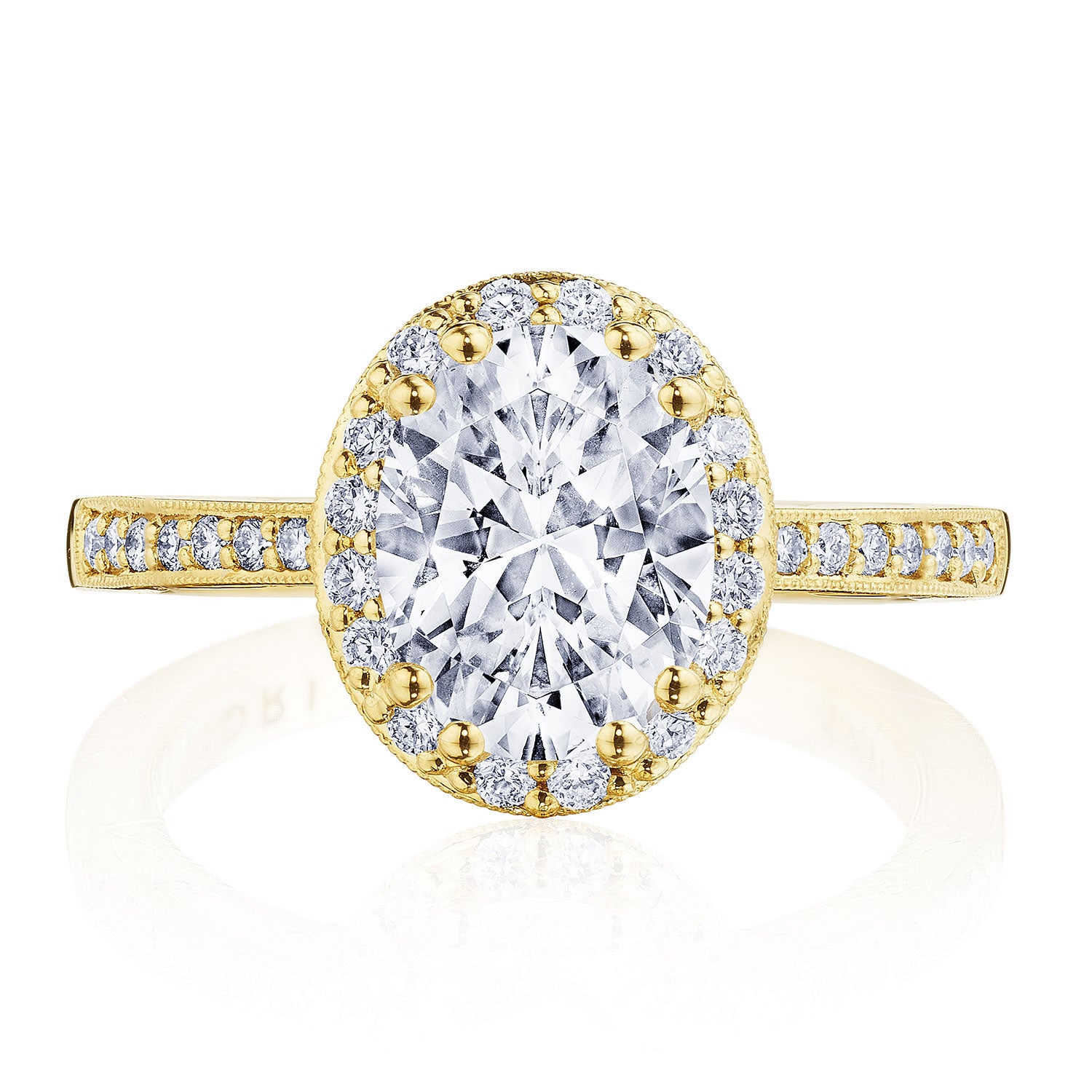 A high-polish ceiling is complemented by a Coastal Crescent fabric on the innerface, which boasts dainty pinpoint diamond detailing. The center stone rests on a metal-intense, geometric Cathedral Foundation.