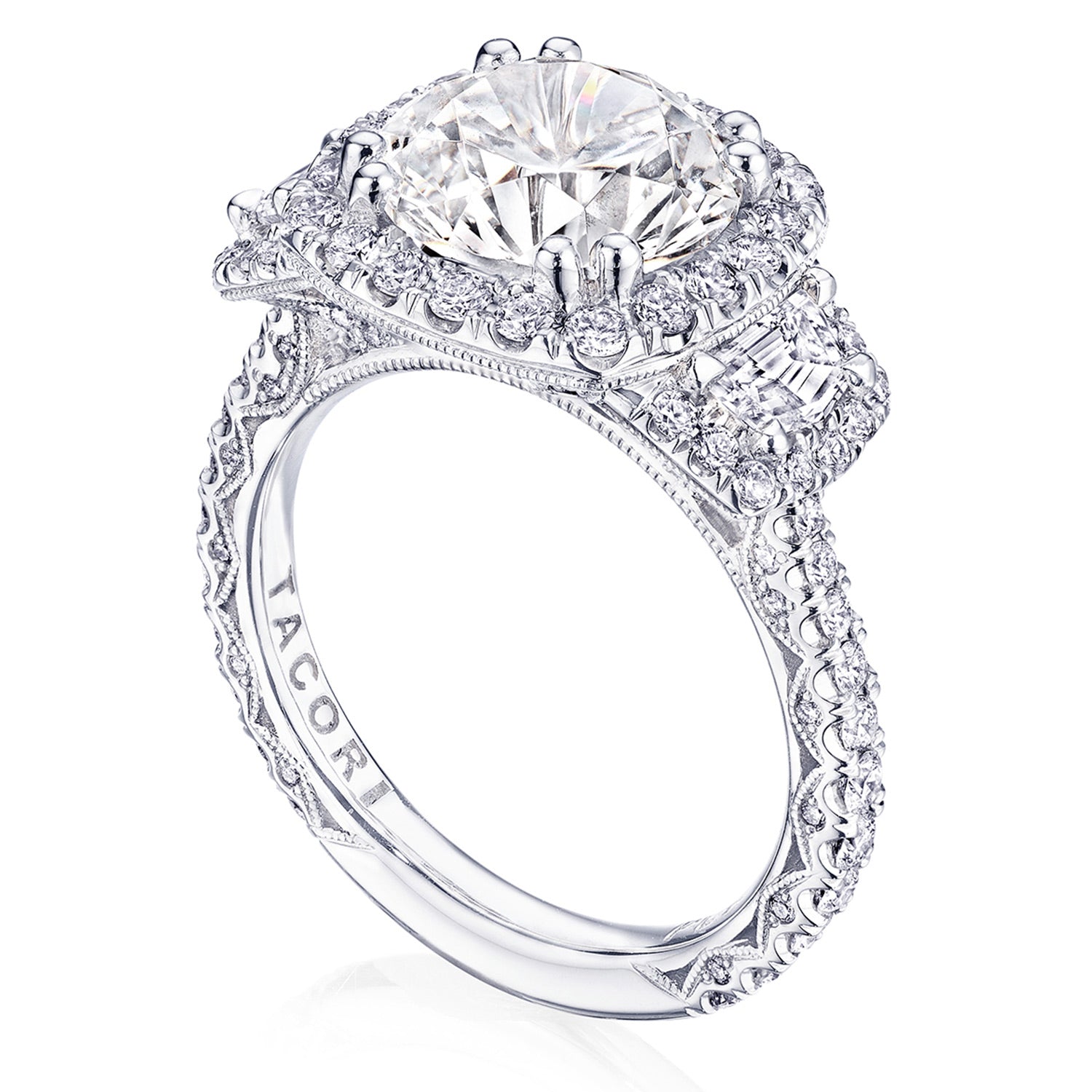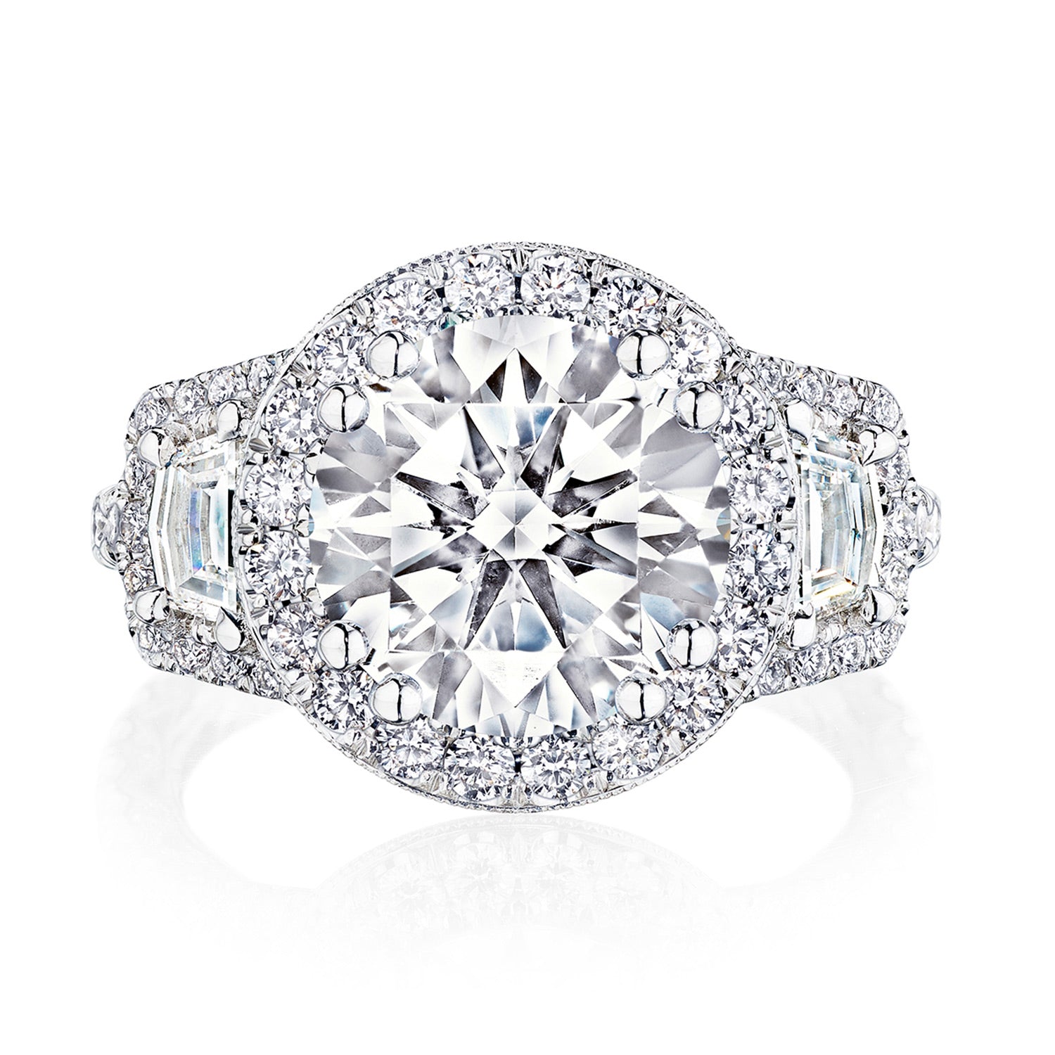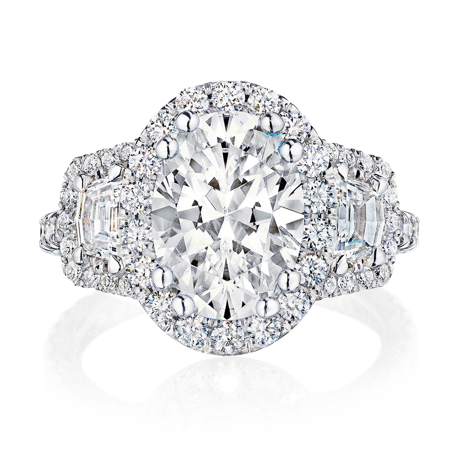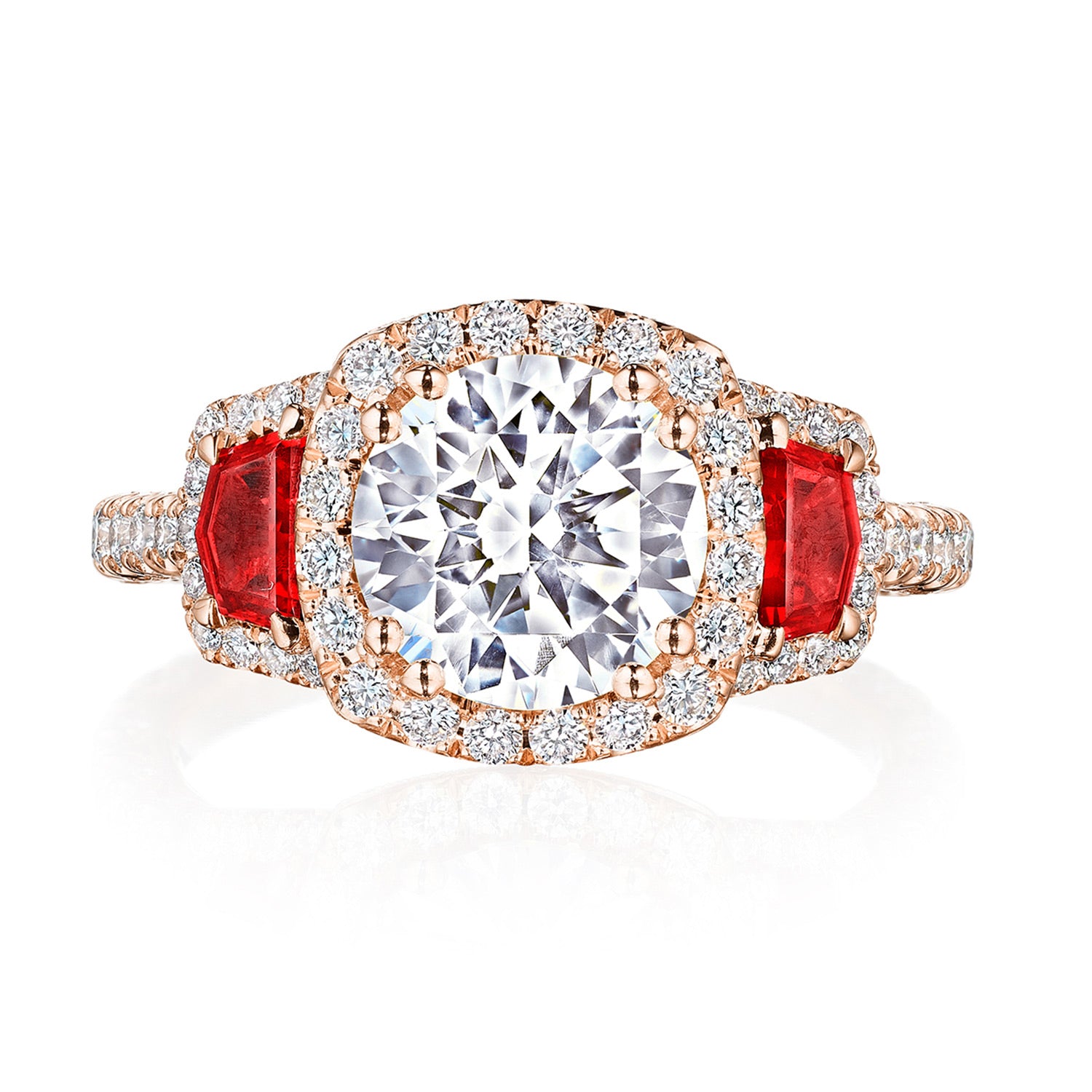 Two cadillac-cut side diamonds embrace the center stone, while a bloom encircles all crowning diamonds. Just below, diamond-studded prongs meet a Petite Crescent fabric and a ceiling of small pavé-set diamonds.