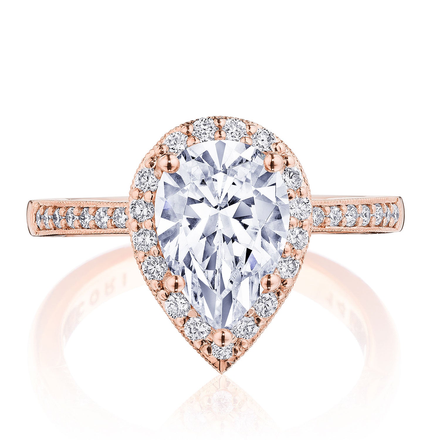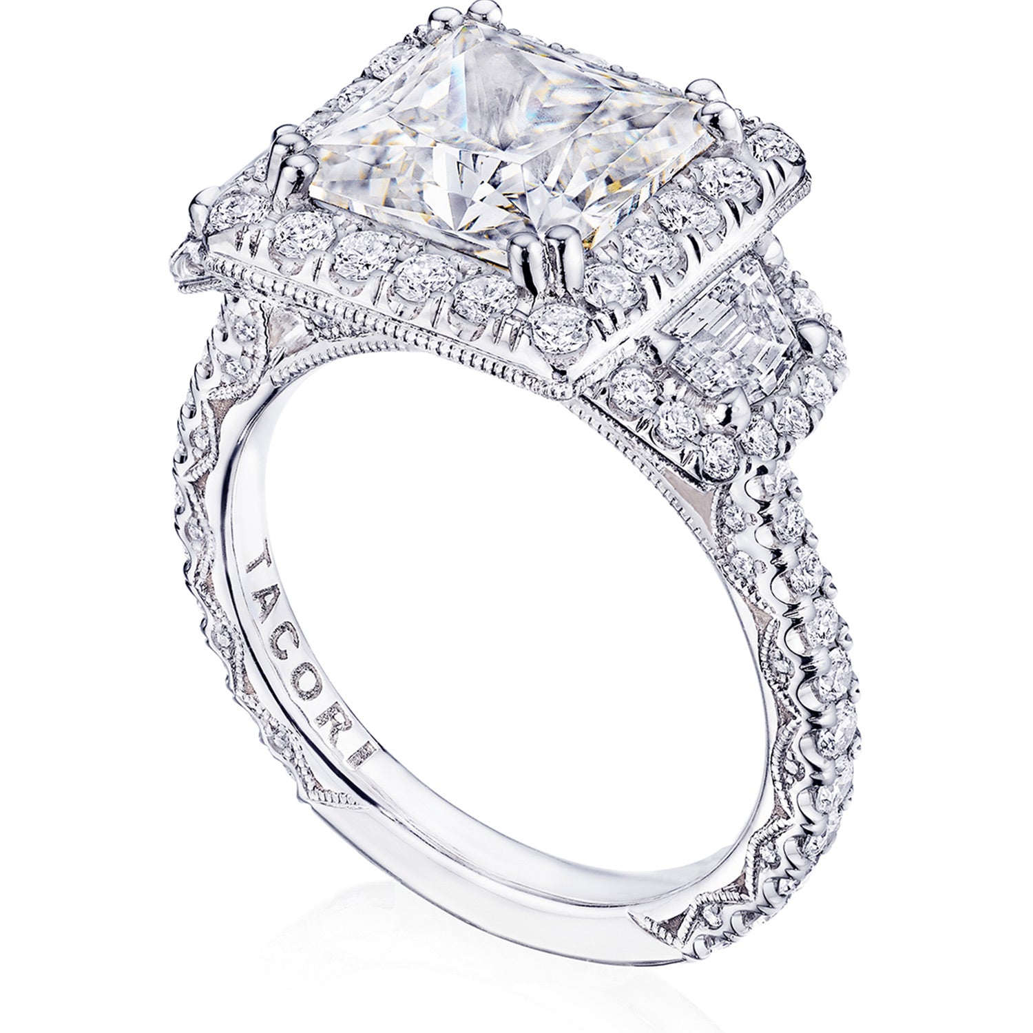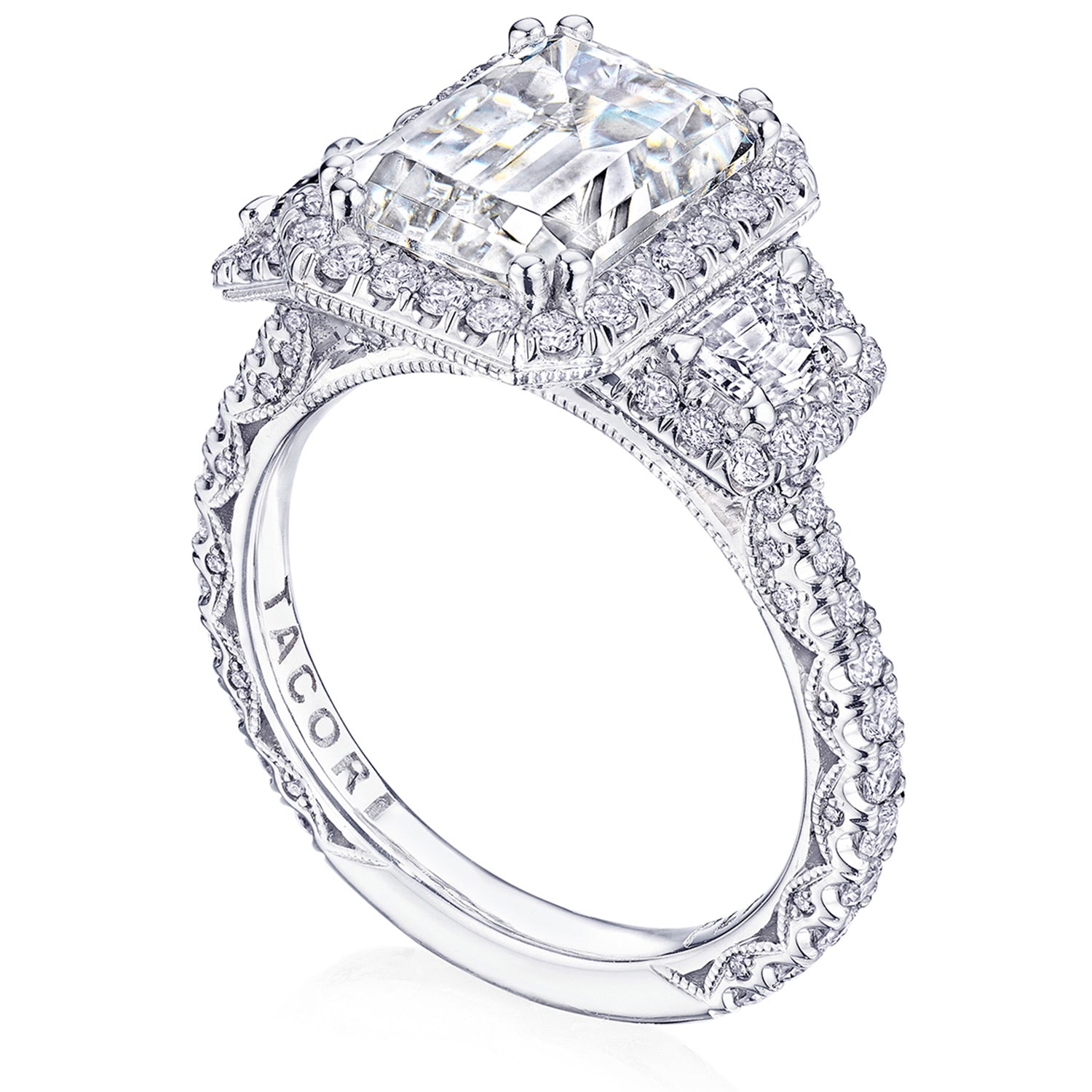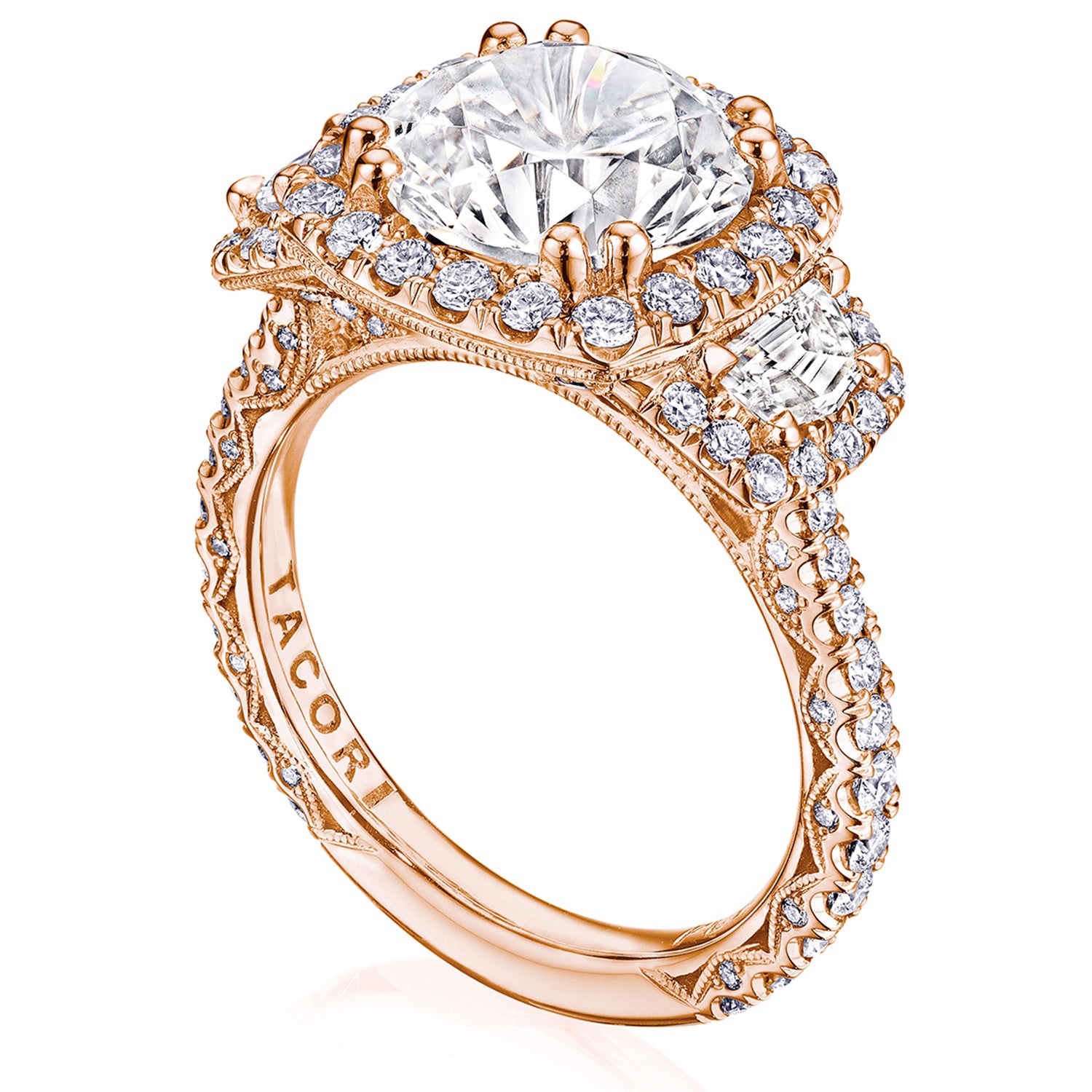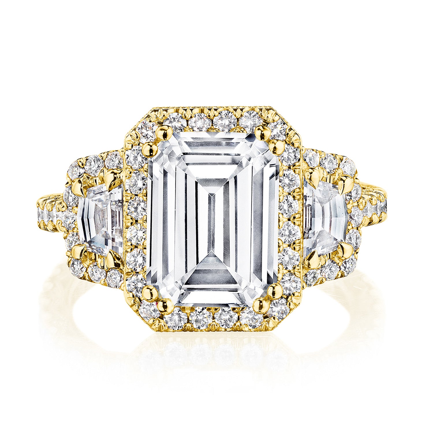 Two cadillac-cut side diamonds embrace the center stone, while a bloom encircles all crowning diamonds. Just below, diamond-studded prongs meet a Petite Crescent fabric and a ceiling of small pavé-set diamonds.
