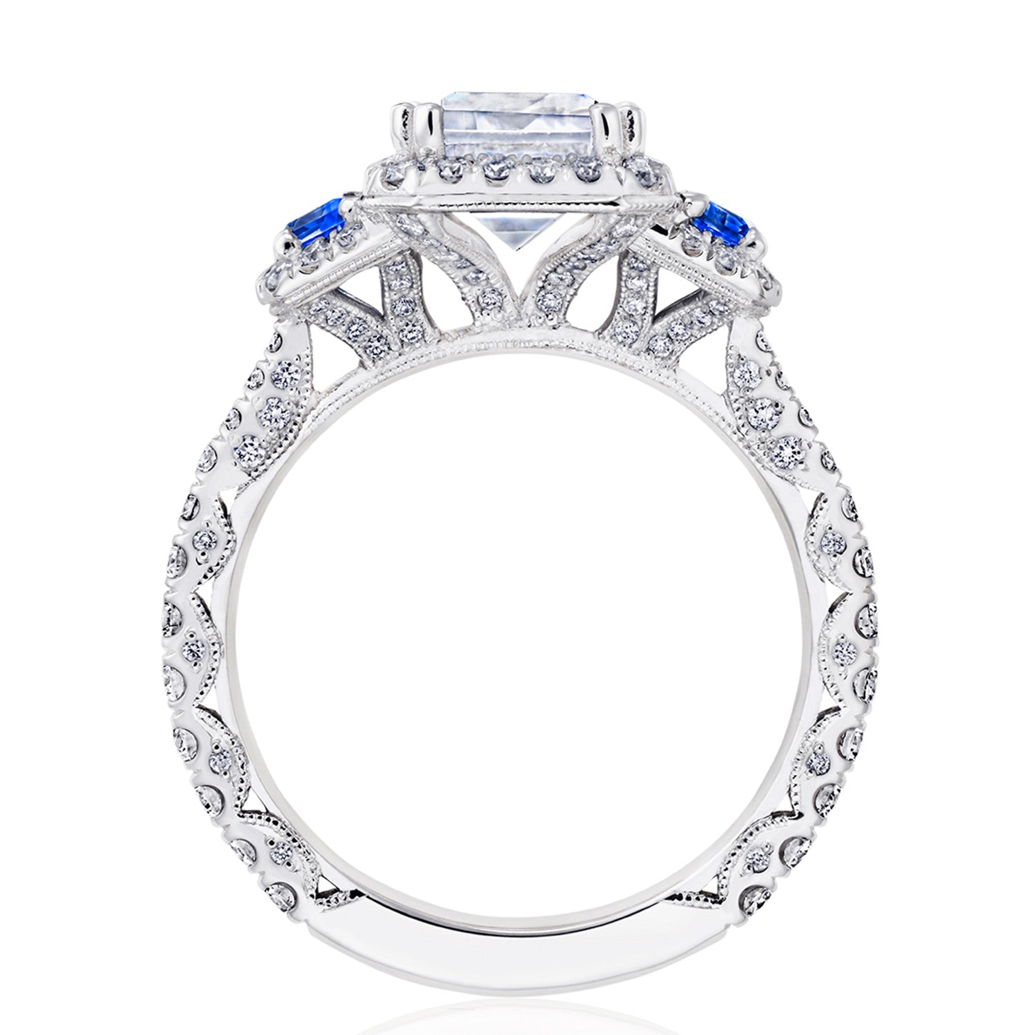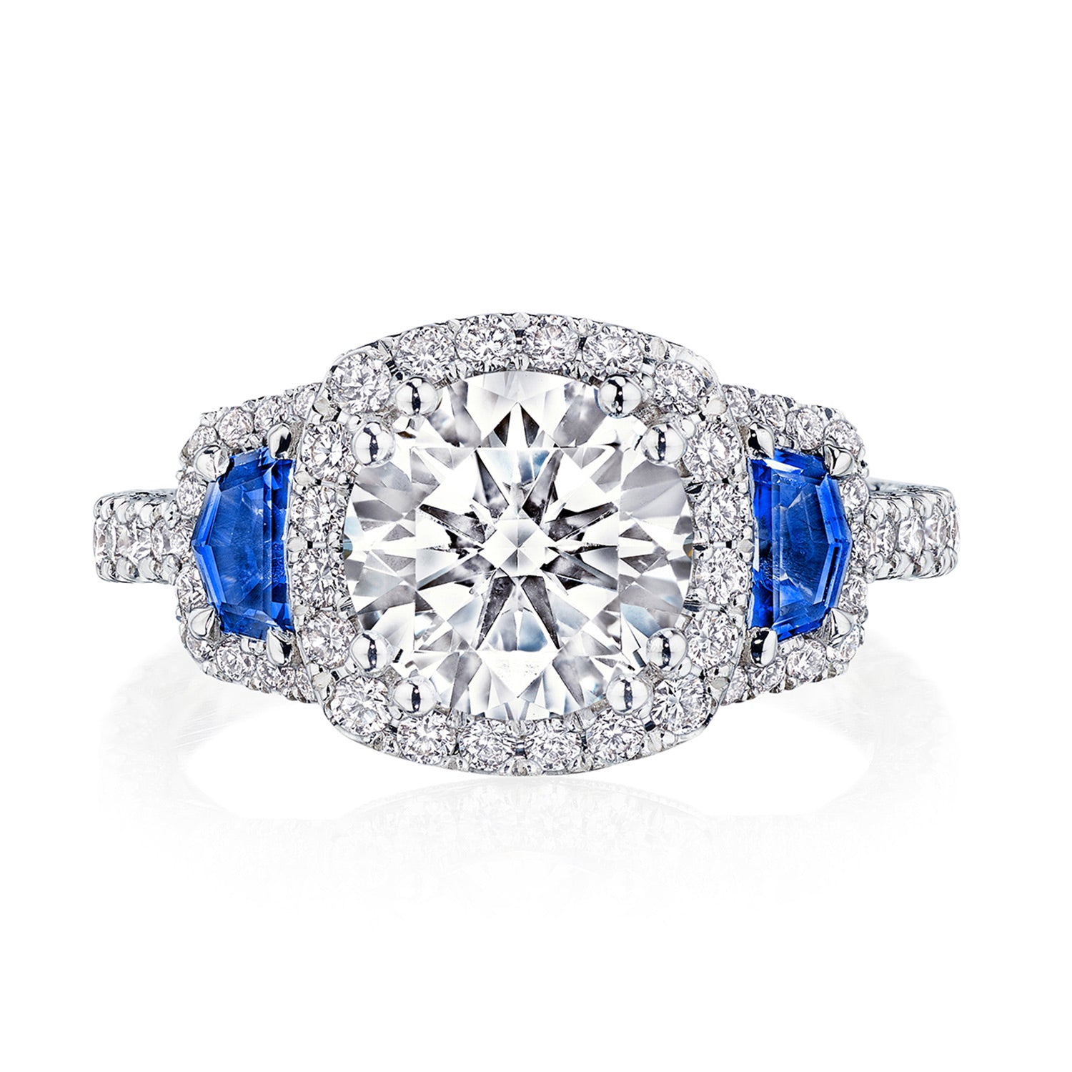 In this three-stone ring, cadillac-cut sapphires embrace the center stone, and a bloom encircles each. Below the crown, diamond-studded prongs meet an innerface of Petite Crescent fabric and a ceiling of pavé.