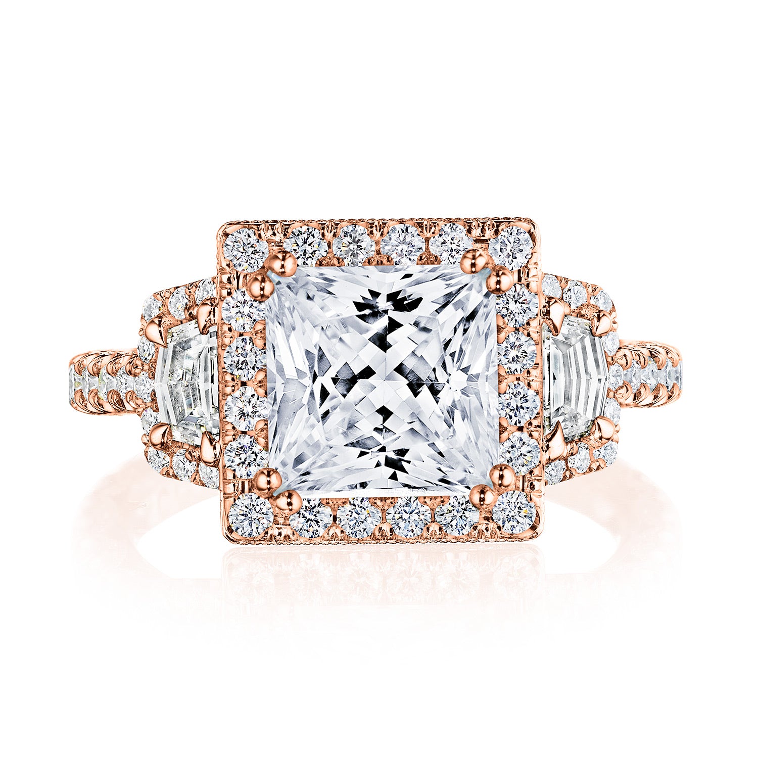 Two cadillac-cut side diamonds embrace the center stone, while a bloom encircles all crowning diamonds. Just below, diamond-studded prongs meet a Petite Crescent fabric and a ceiling of pavé-set diamonds.