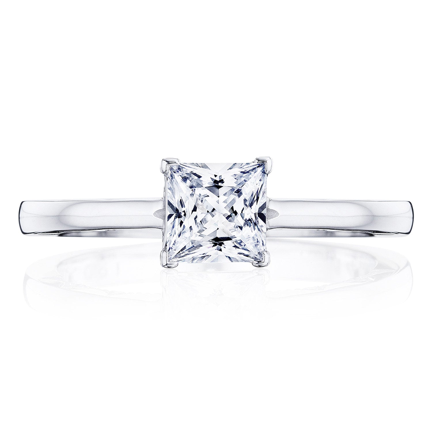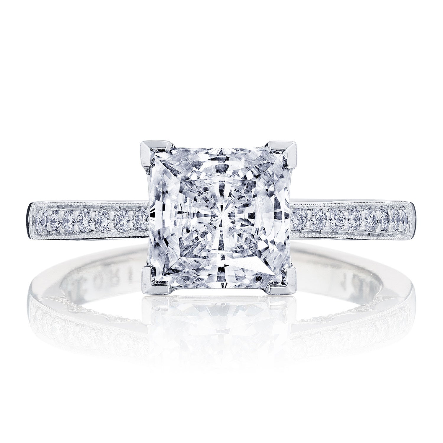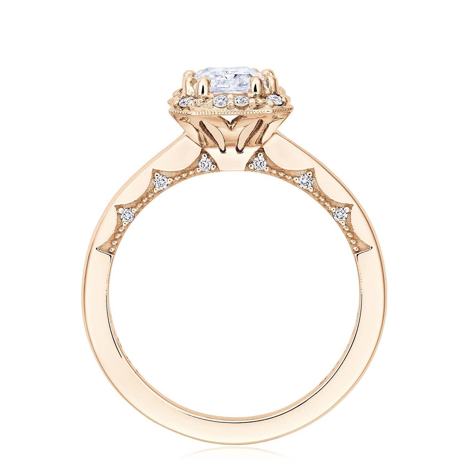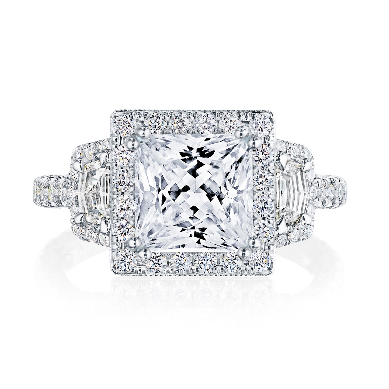 A high-polish ceiling is complemented by a Coastal Crescent fabric on the innerface, which boasts dainty pinpoint diamond detailing. A princess bloom surrounds the center stone, which rests on a metal-intense, geometric Cathedral Foundation.