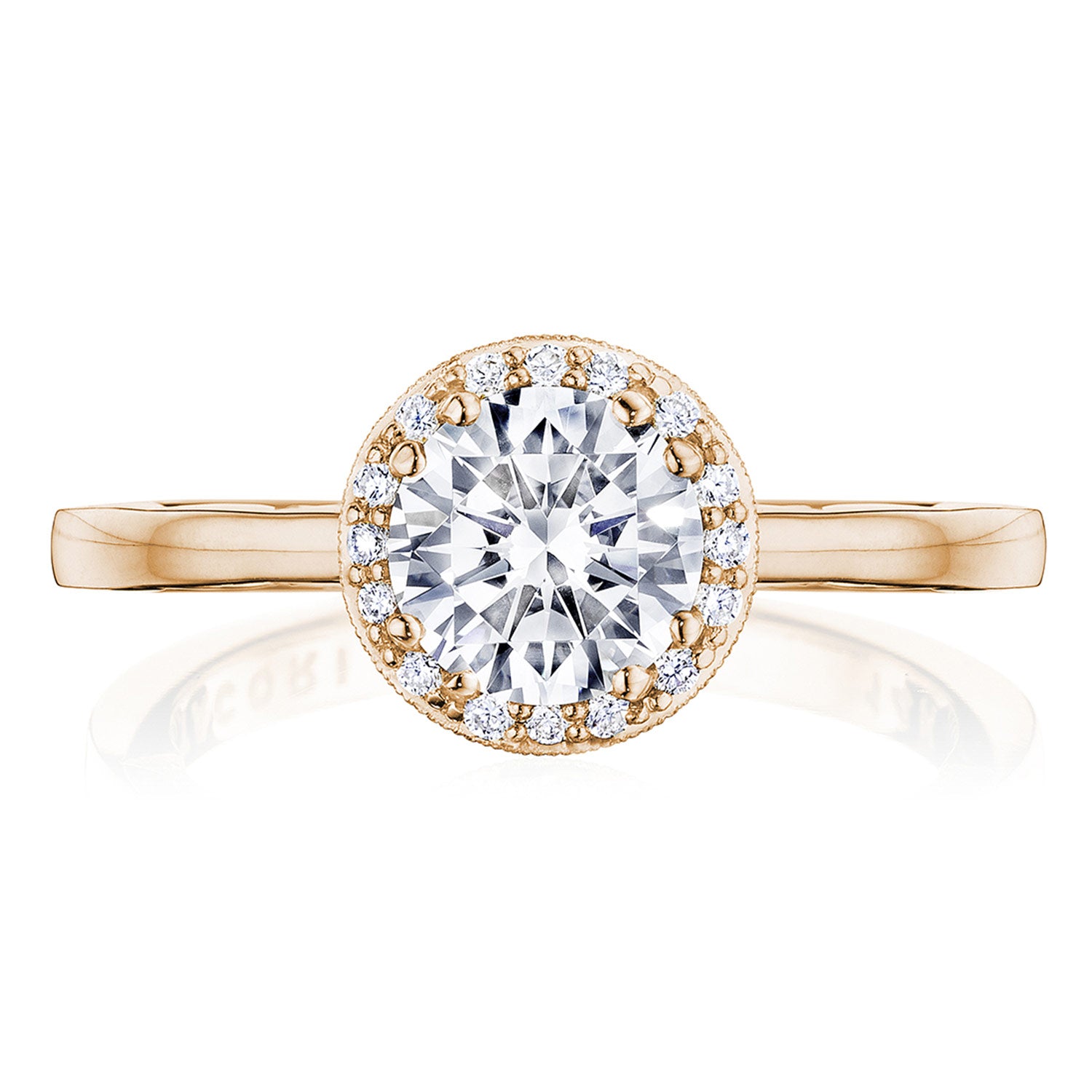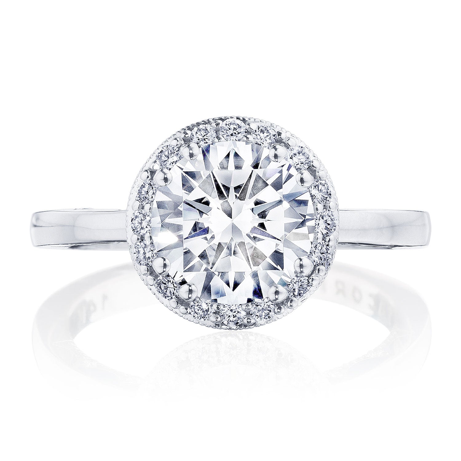 A dainty and clean high-polish band is decorated with Coastal Crescent fabric that boasts delicate pinpoint diamond details. A Classic 360 foundation embraces the center stone and gives it a floating appearance above the band.