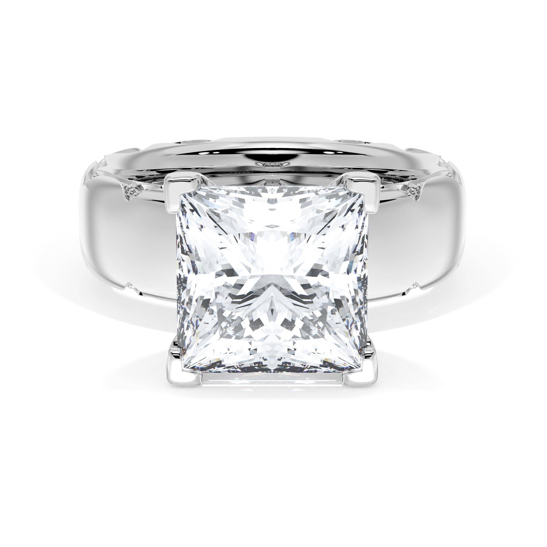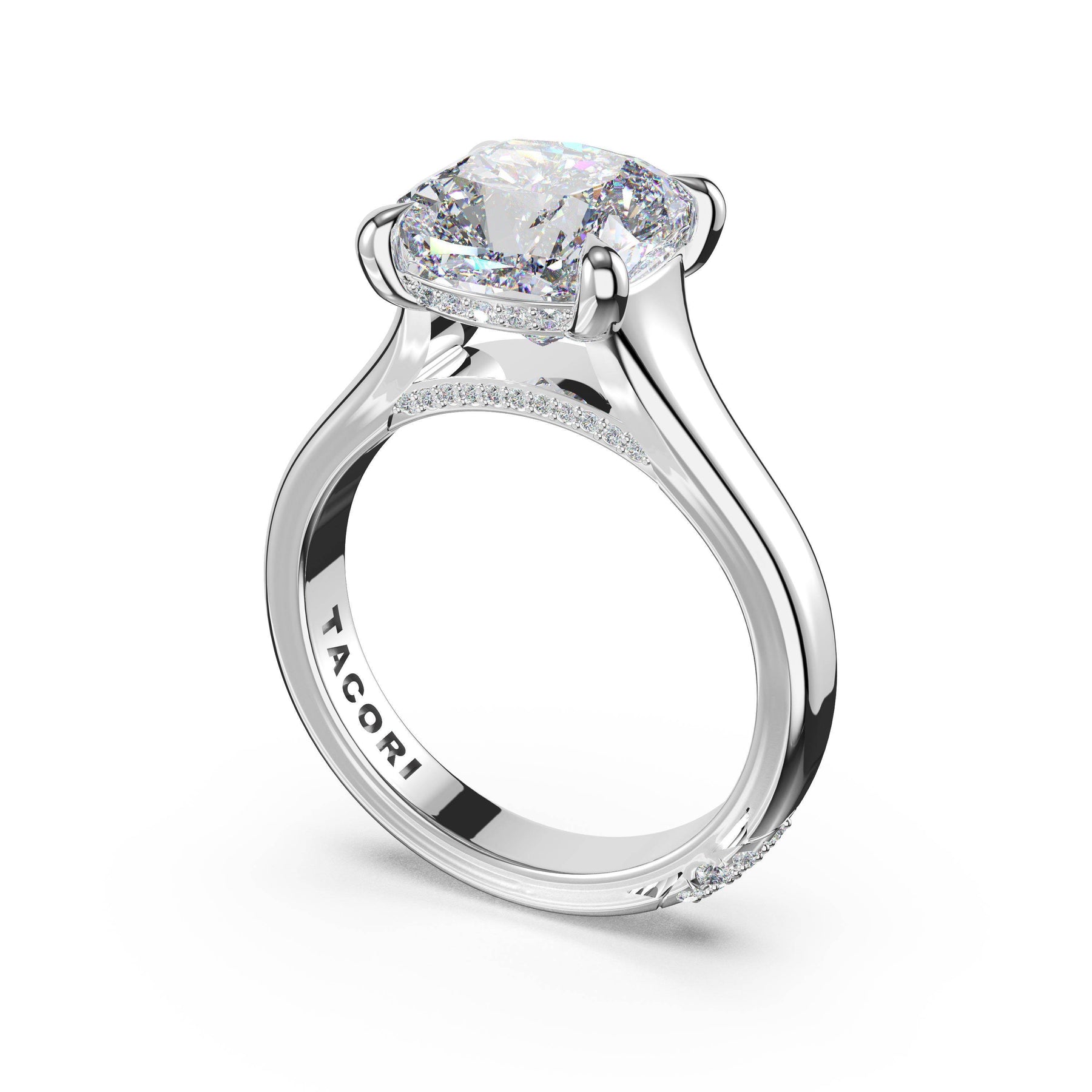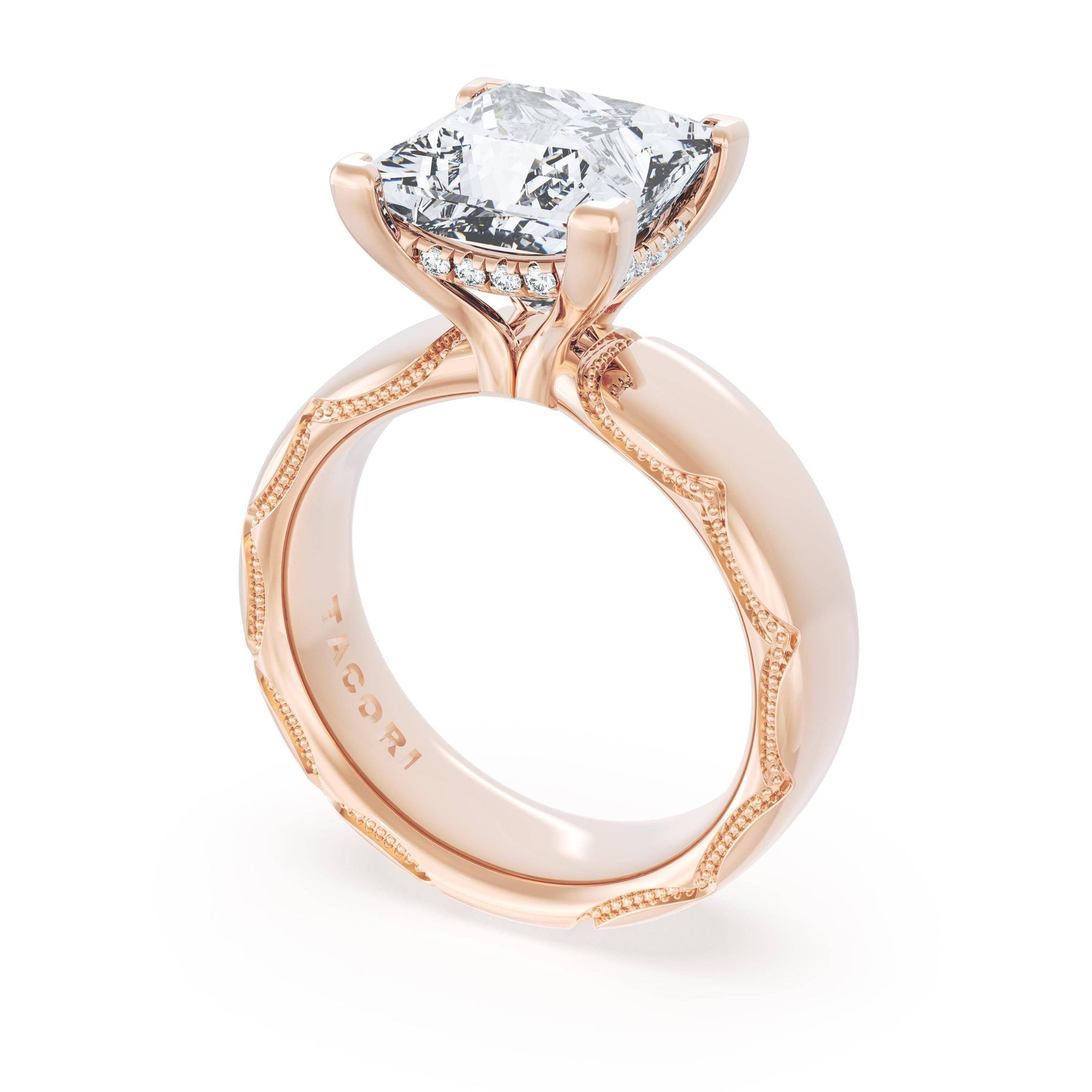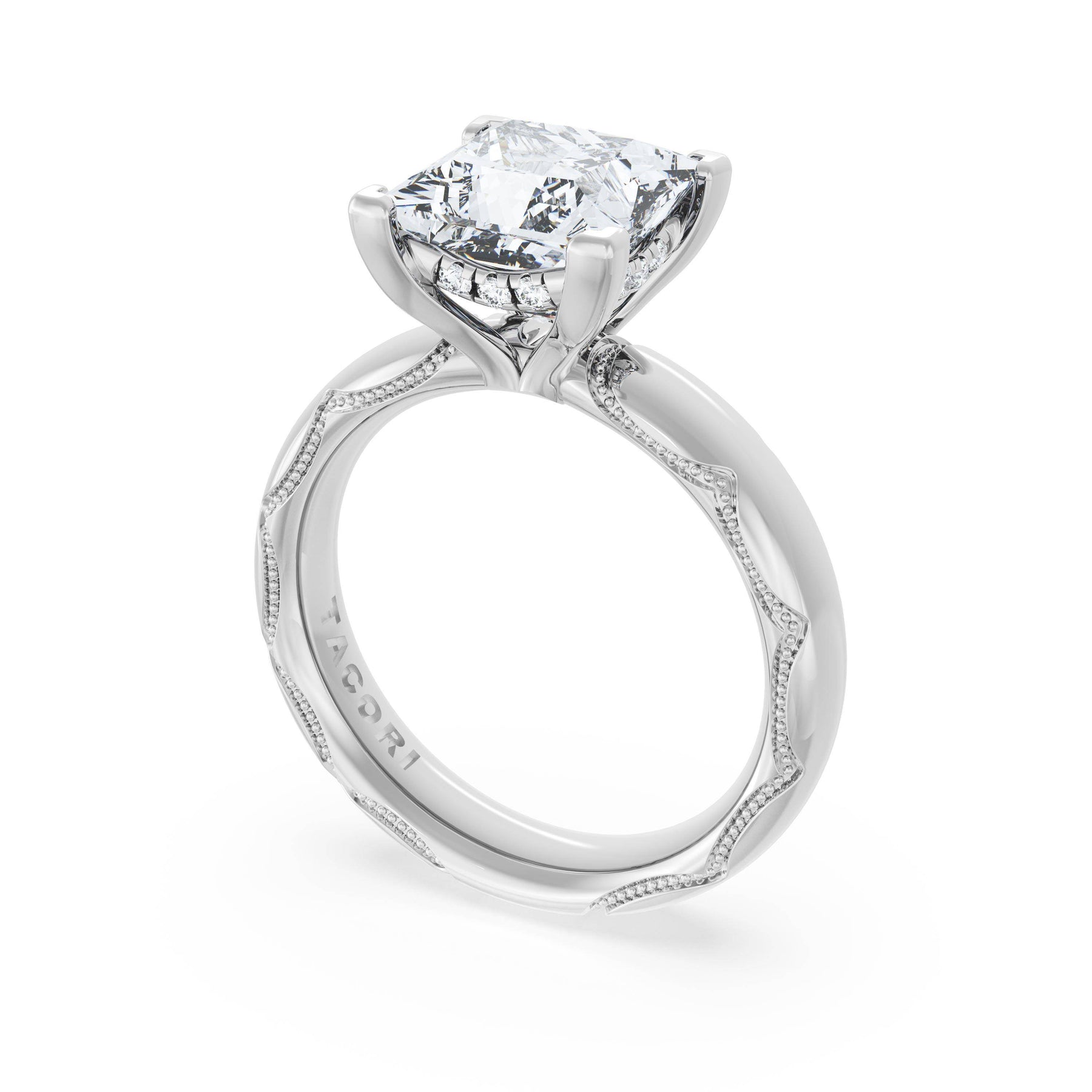 The princess solitaire sits on a Cathedral foundation with a hidden bloom, which adds the TACORI touch. A high-polish band of premium metals is studded with a diamond-studded Signature Crescent at the foundation