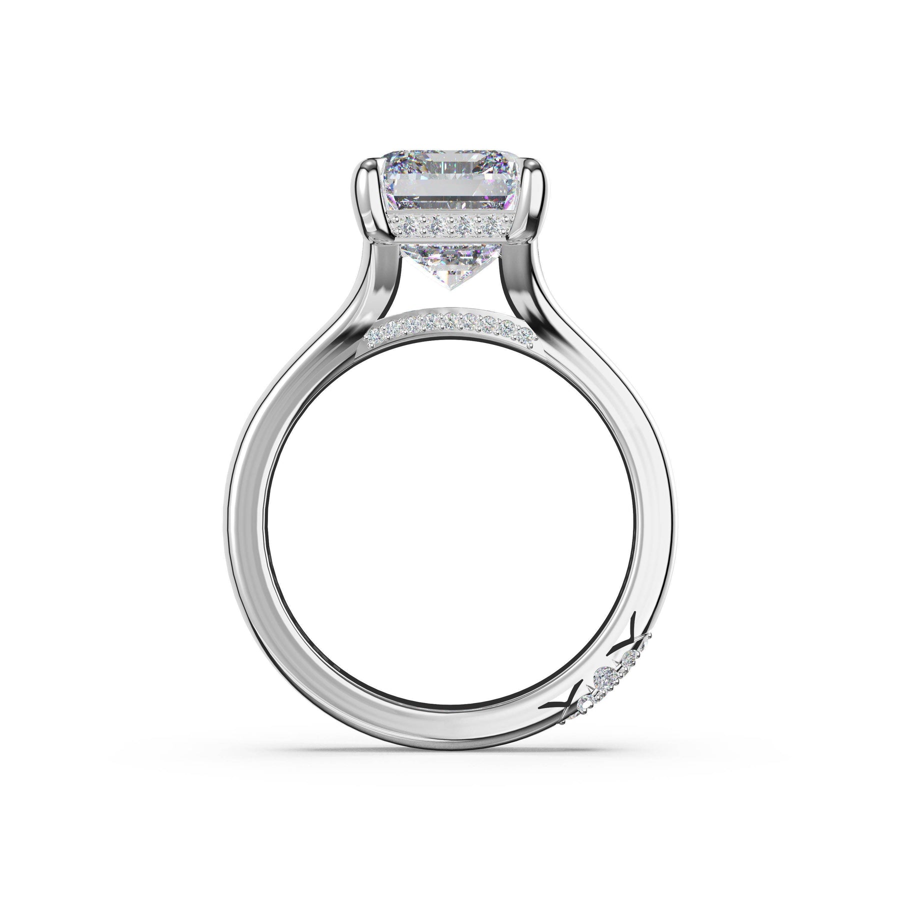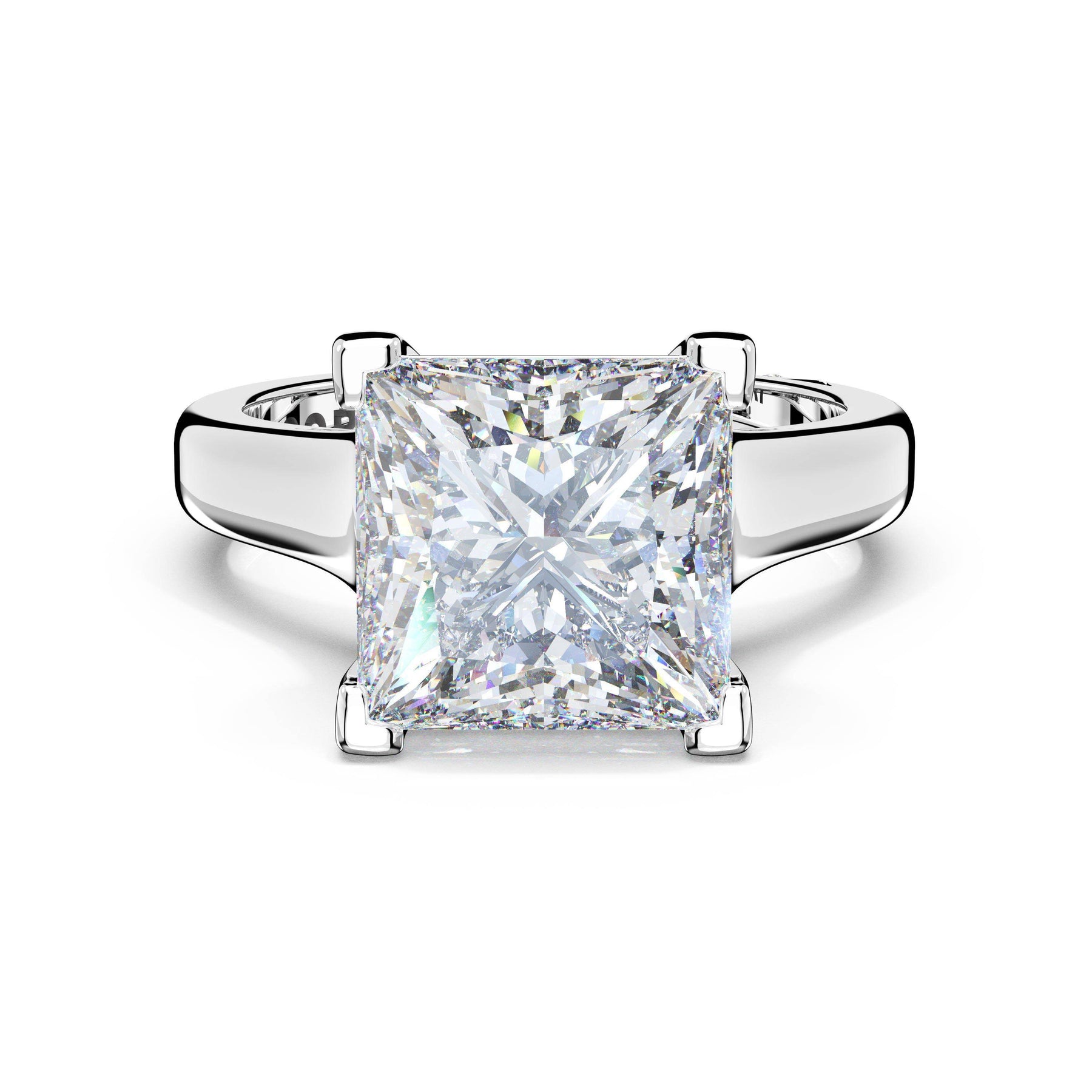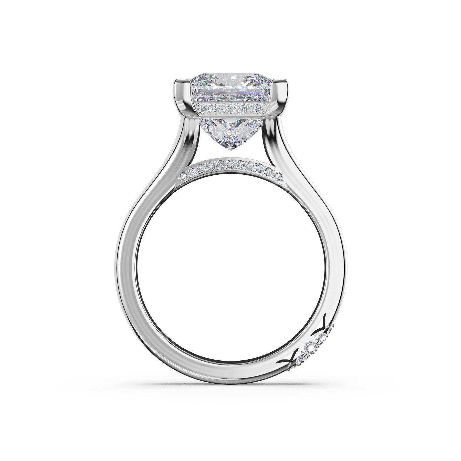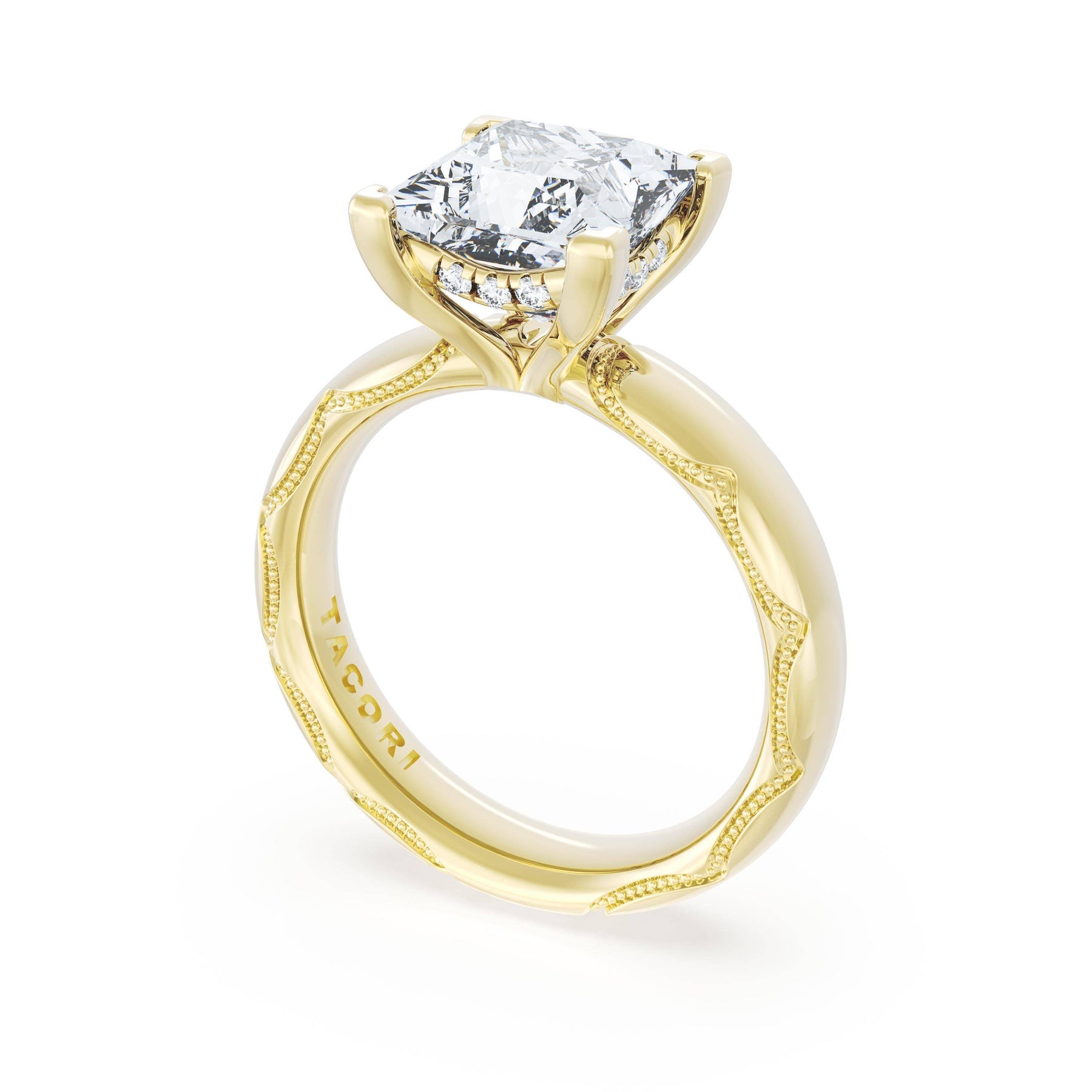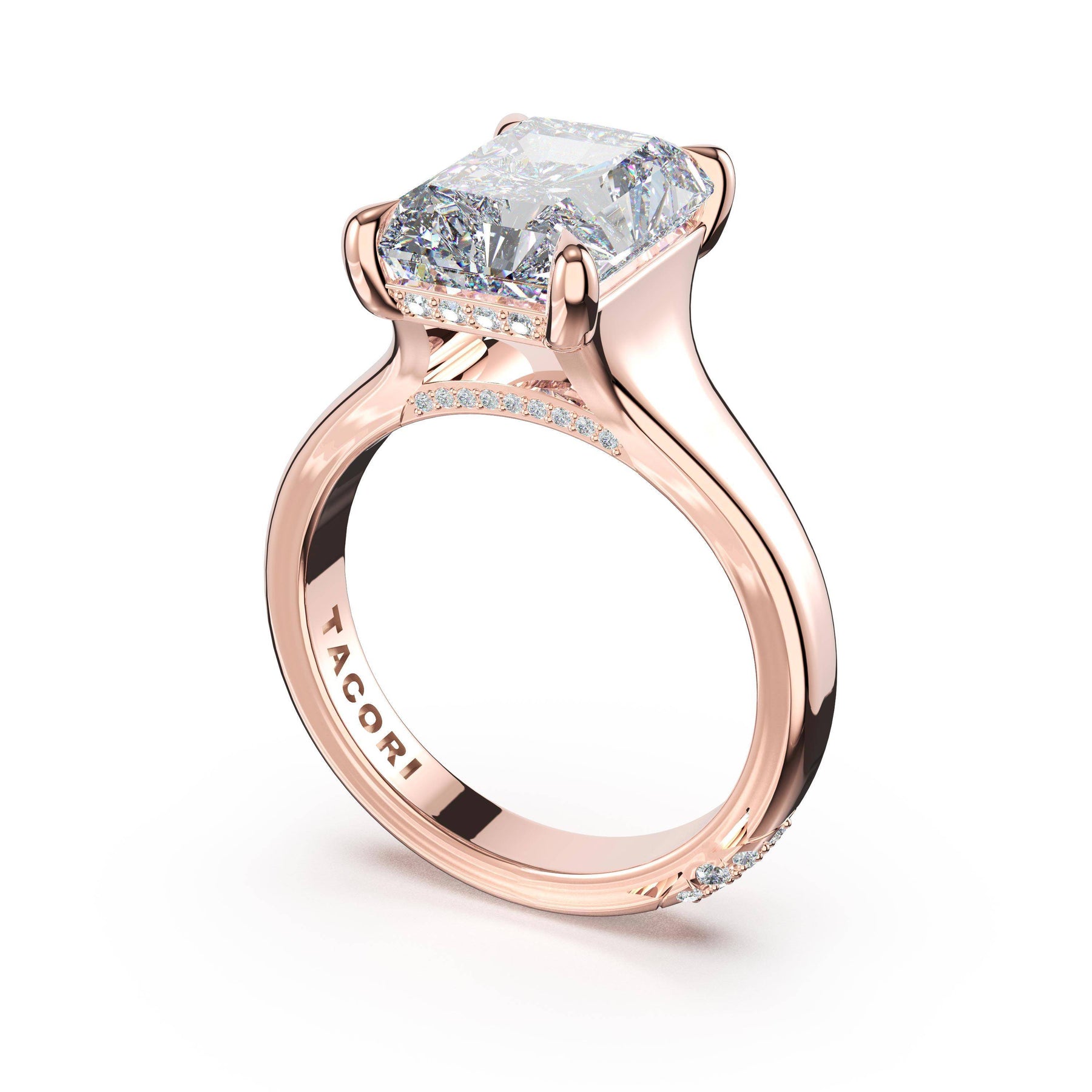 The princess solitaire sits on a Cathedral foundation with a hidden bloom, which adds the TACORI touch. A high-polish band of premium metals is studded with a diamond-studded Signature Crescent at the foundation