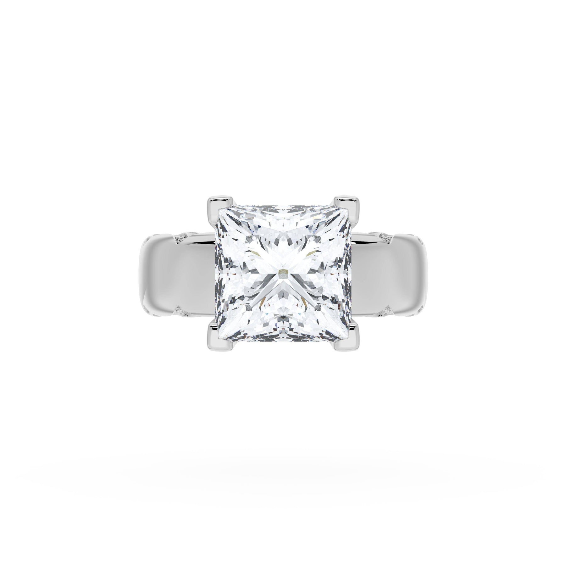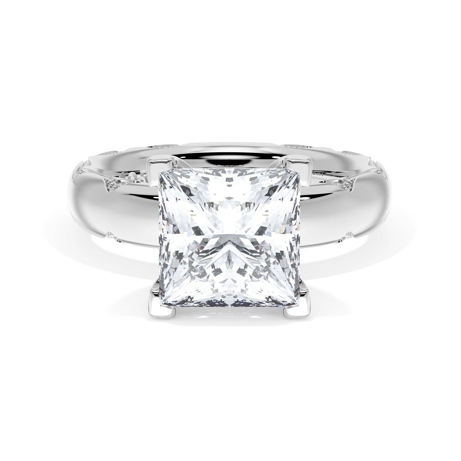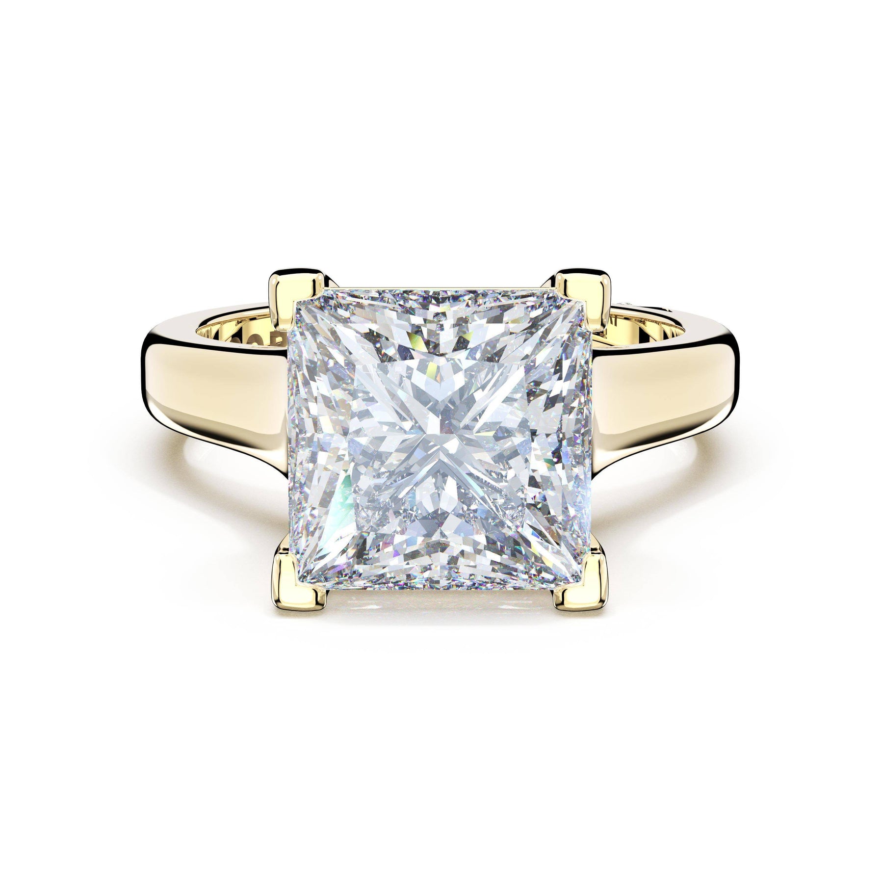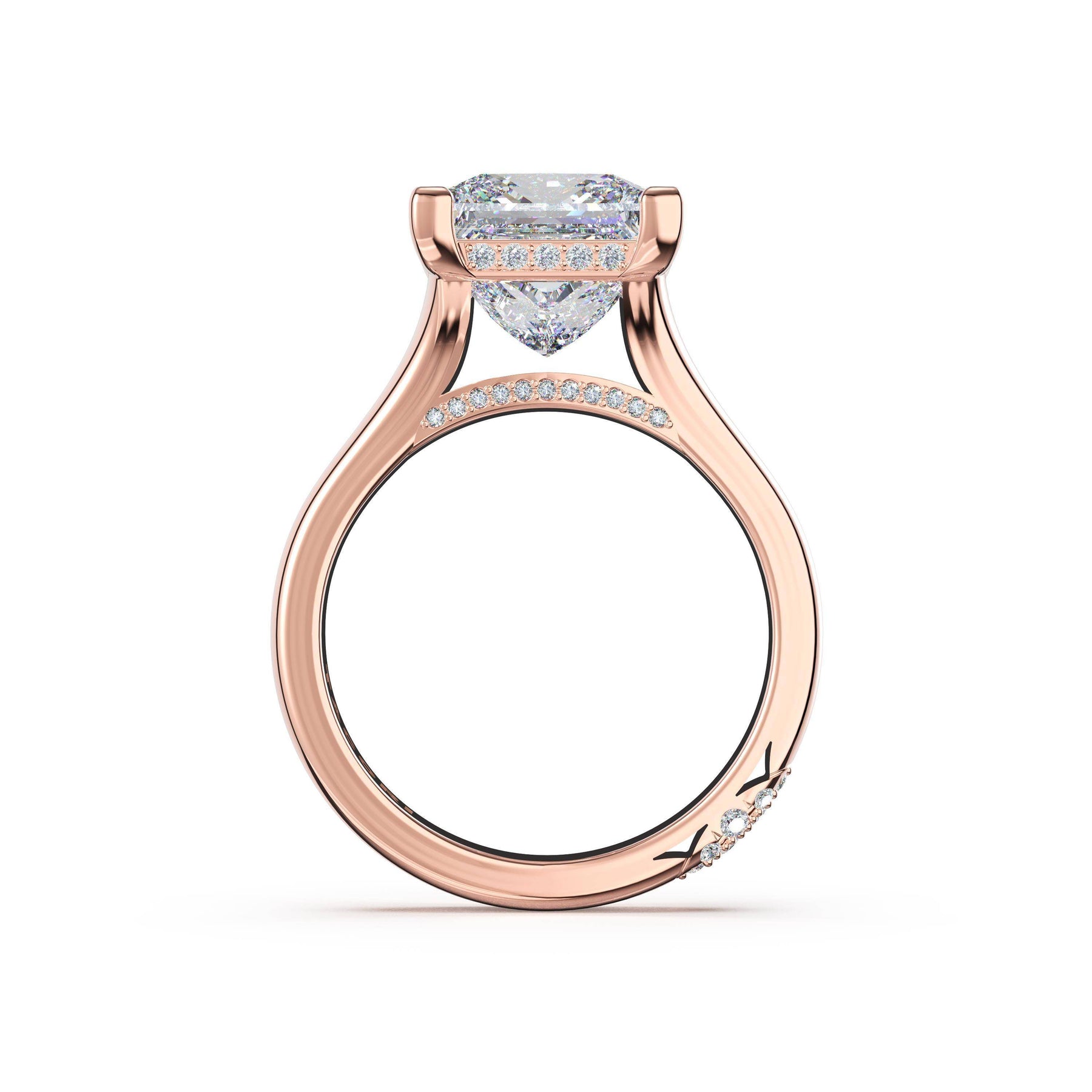 The princess solitaire sits on a Cathedral foundation with a hidden bloom, which adds the TACORI touch. A high-polish band of premium metals is studded with a diamond-studded Signature Crescent at the foundation