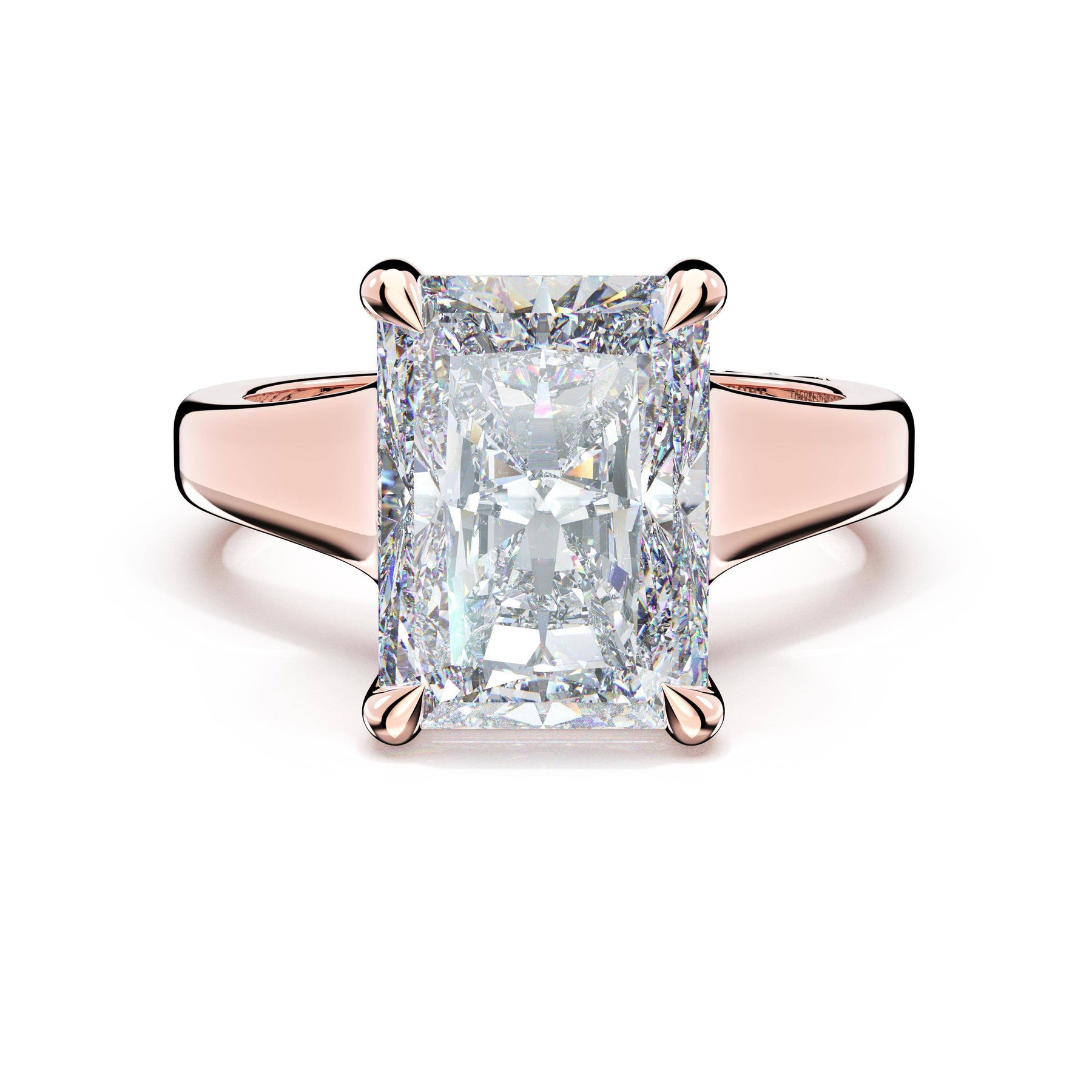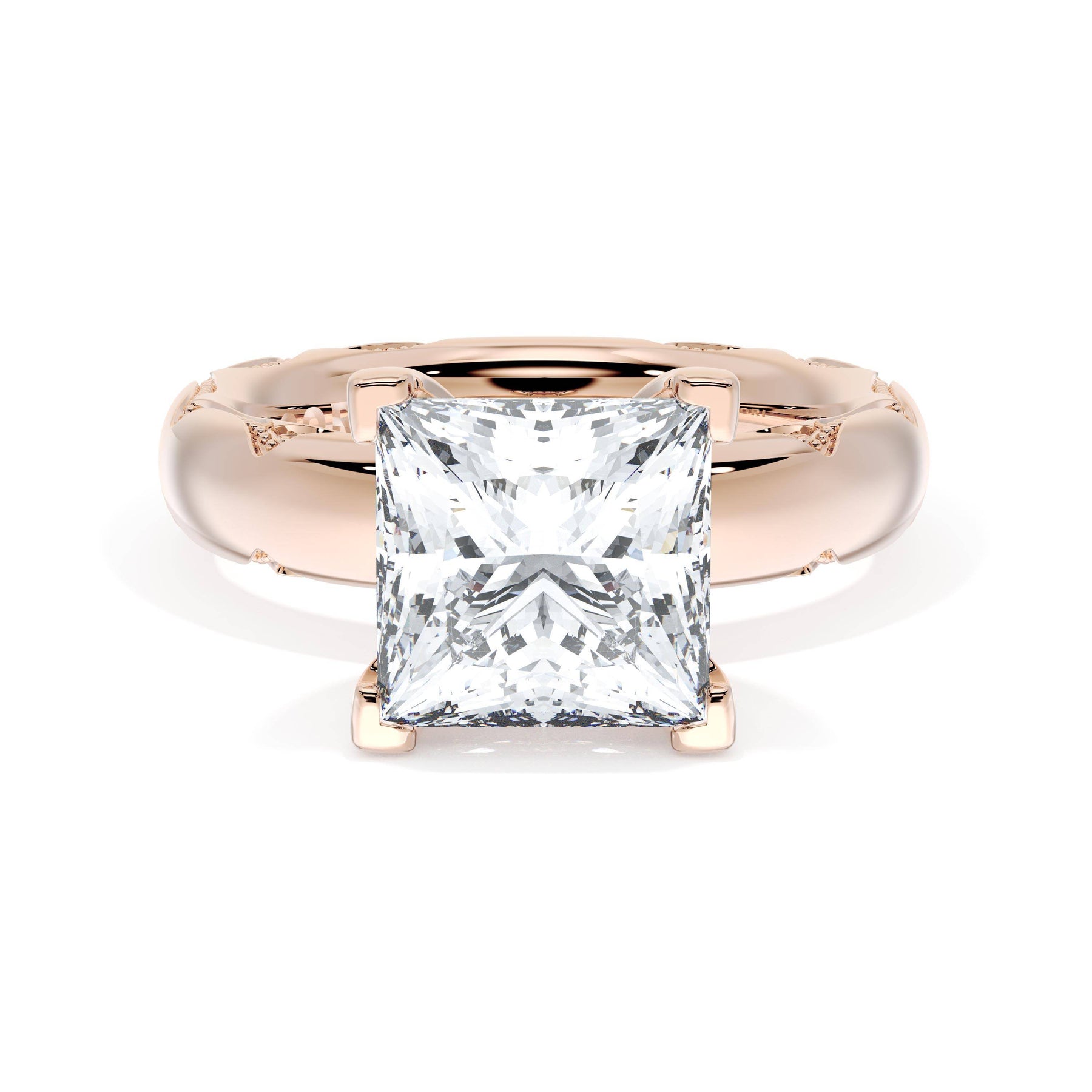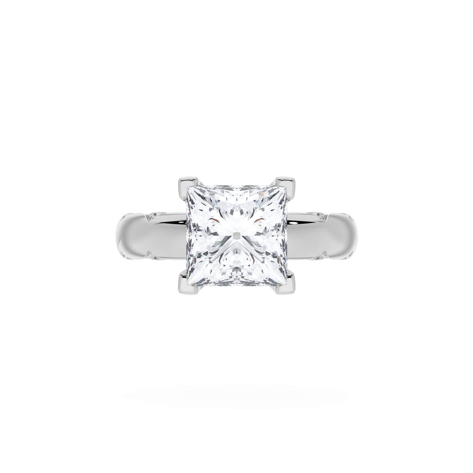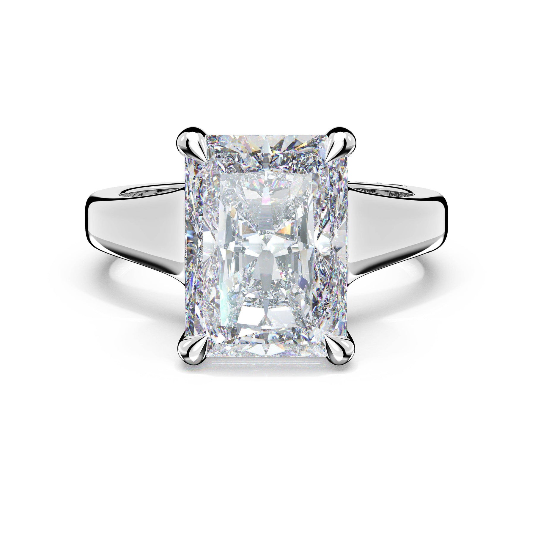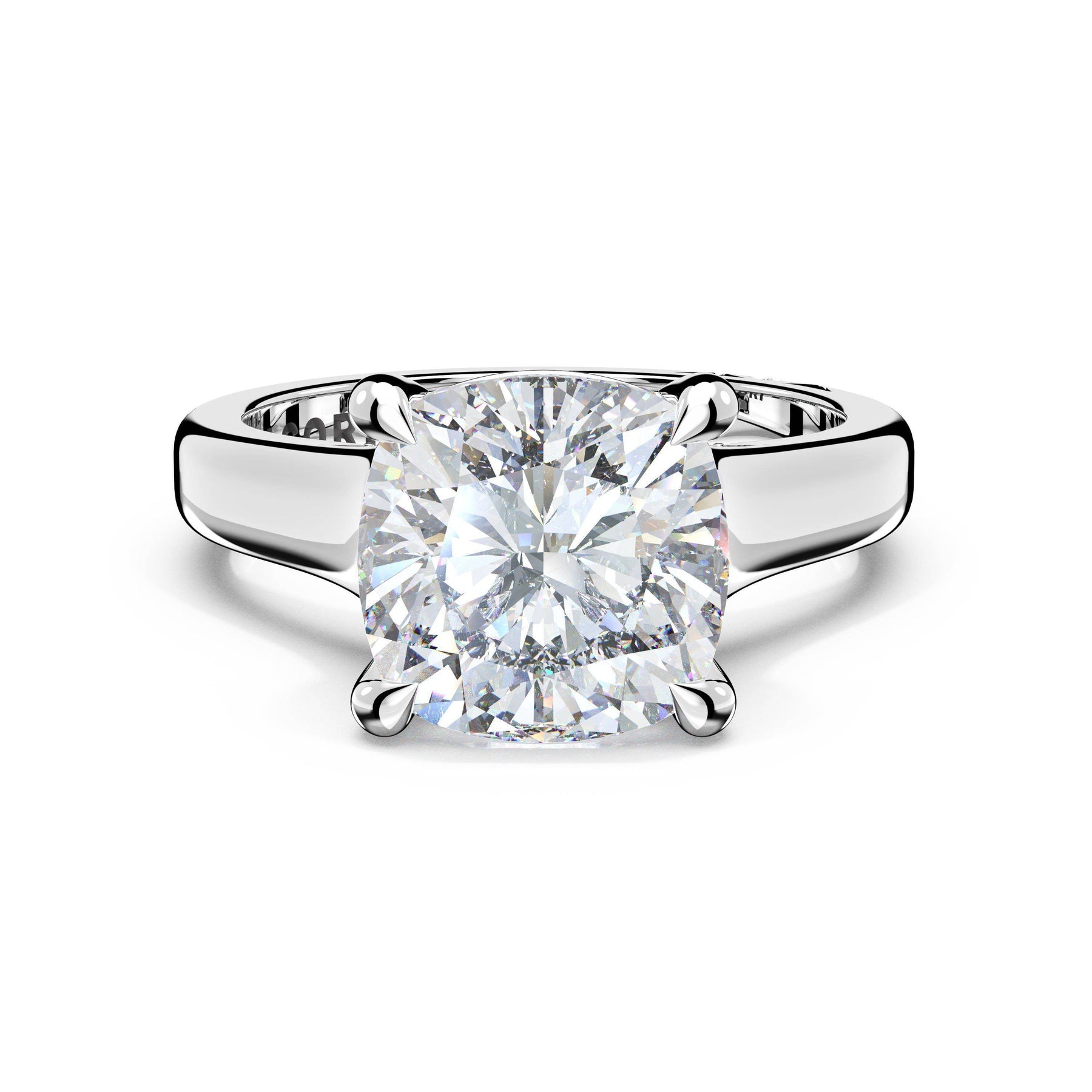 The princess solitaire sits on a Cathedral foundation with a hidden bloom, which adds the TACORI touch. A high-polish band of premium metals is studded with a diamond-studded Signature Crescent at the foundation