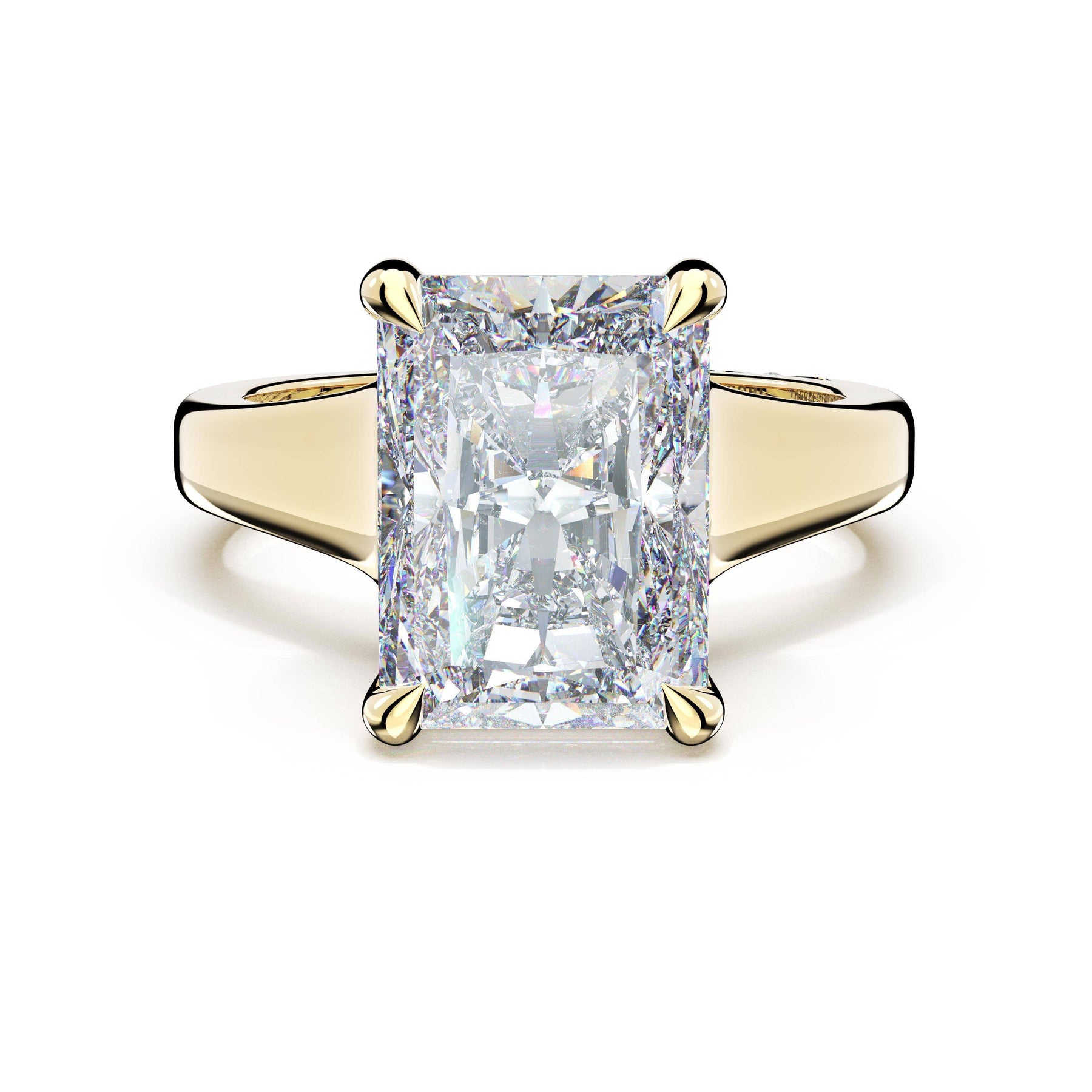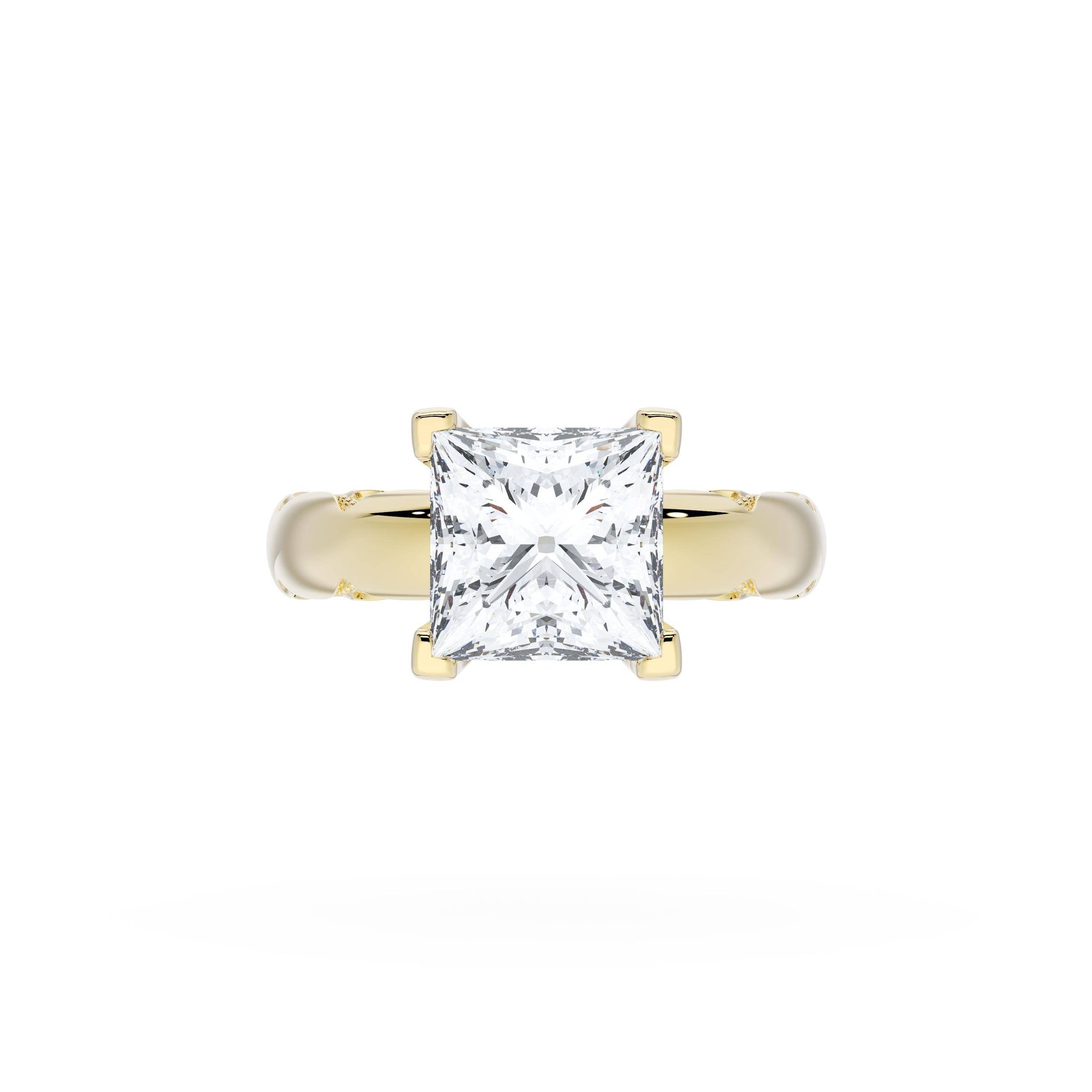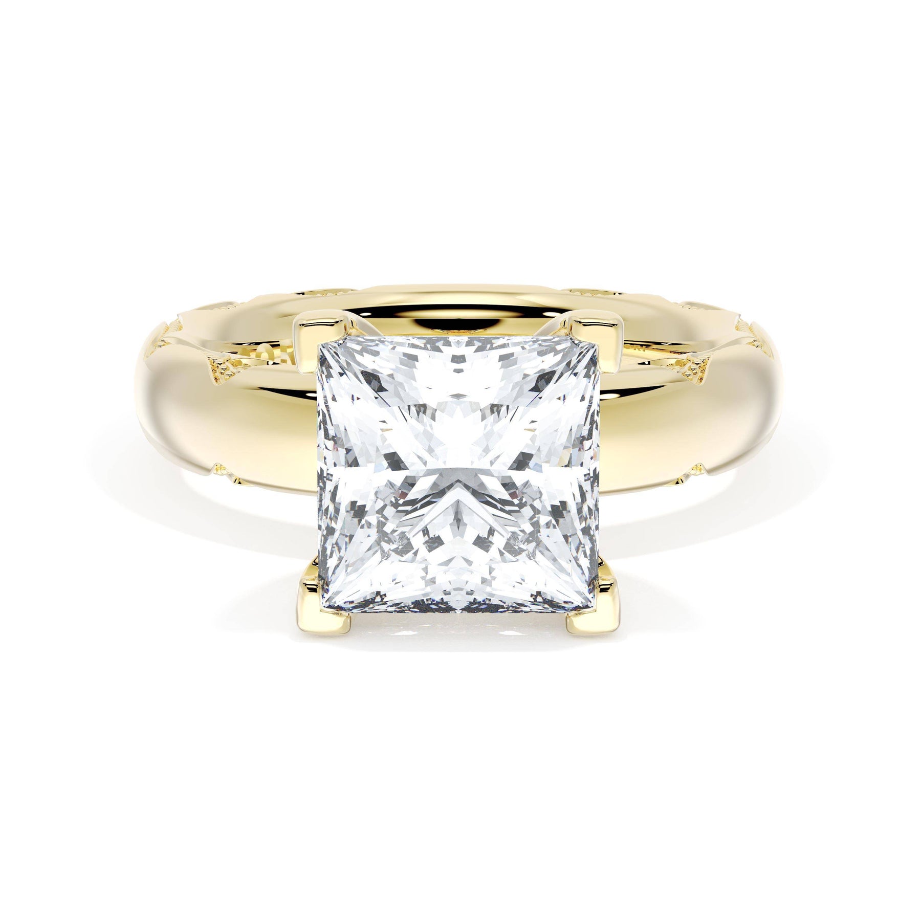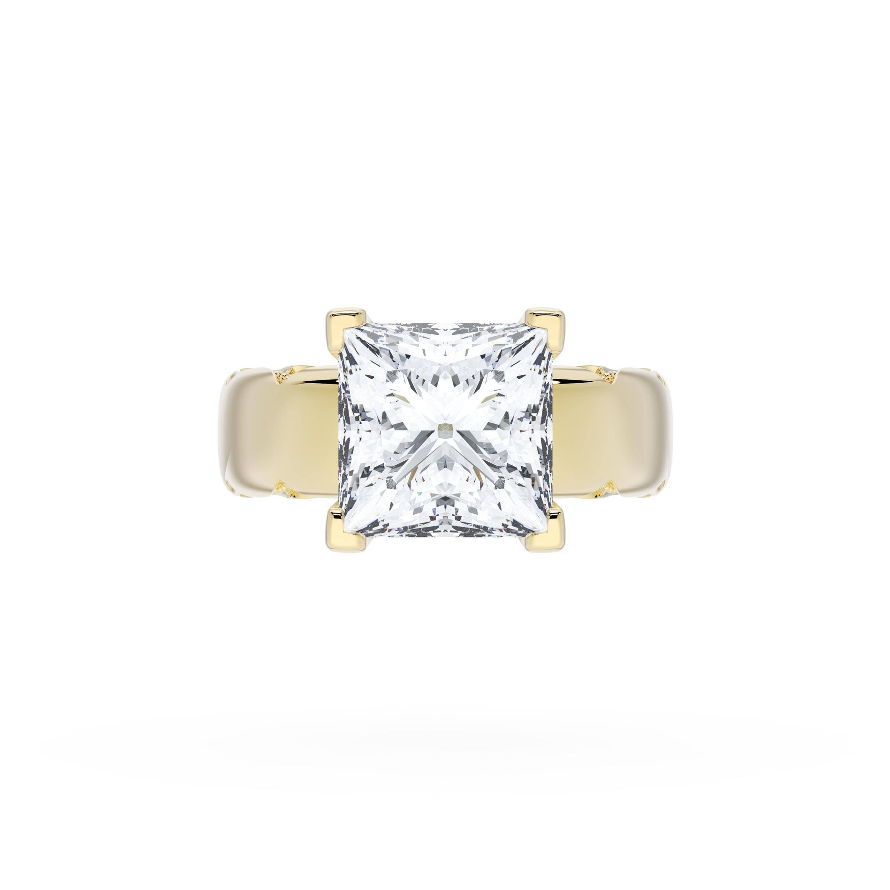 The princess solitaire sits on a Cathedral foundation with a hidden bloom, which adds the TACORI touch. A high-polish band of premium metals is studded with a diamond-studded Signature Crescent at the foundation