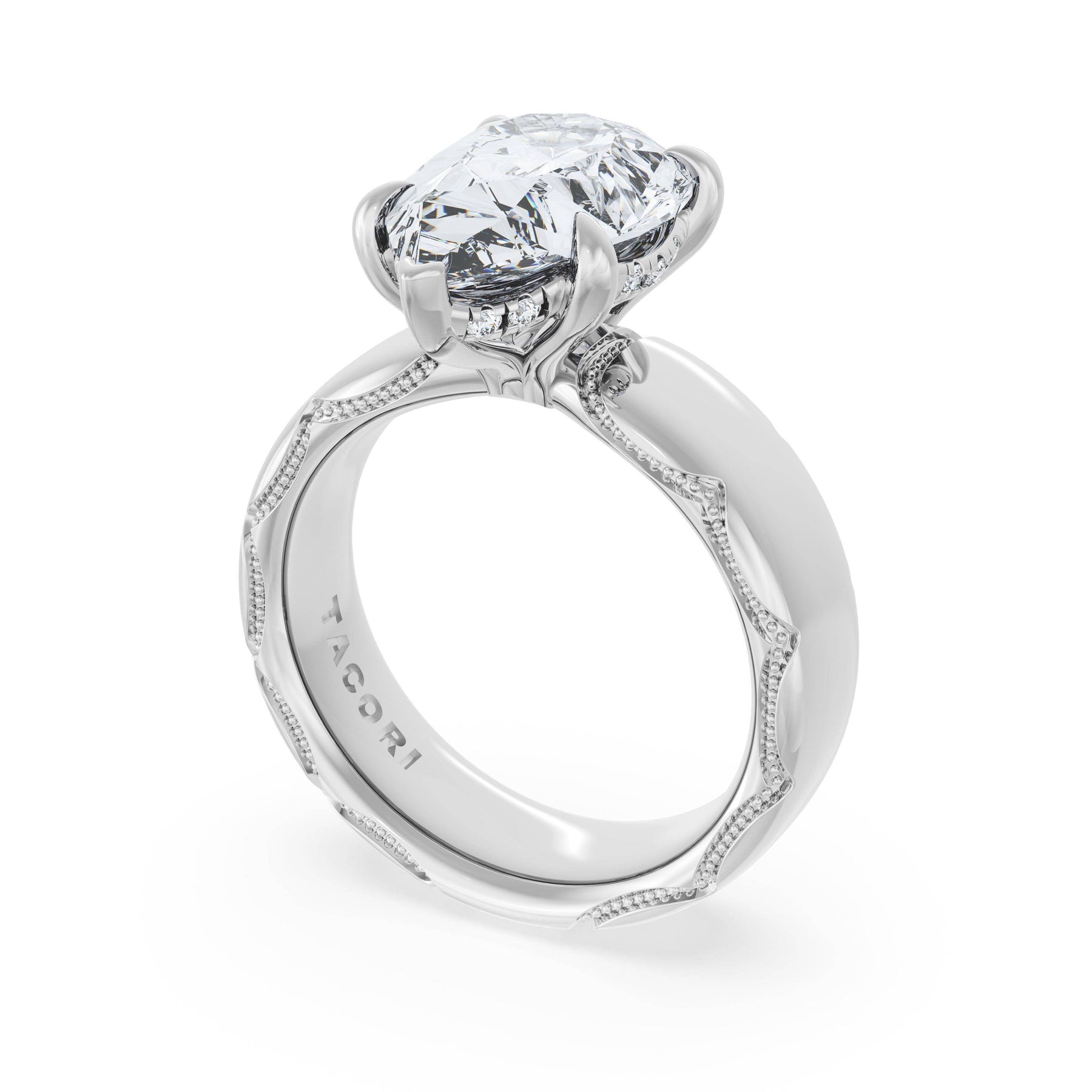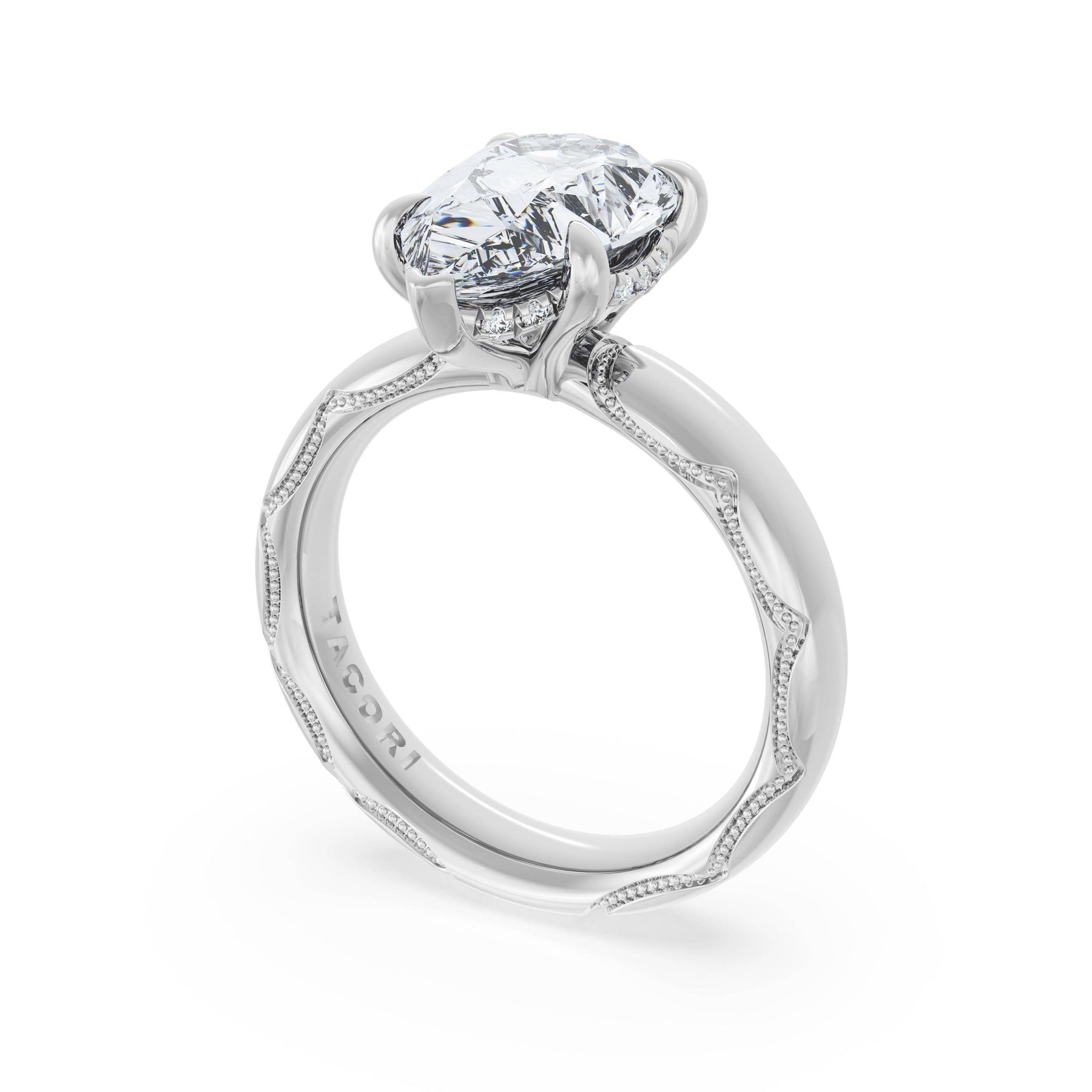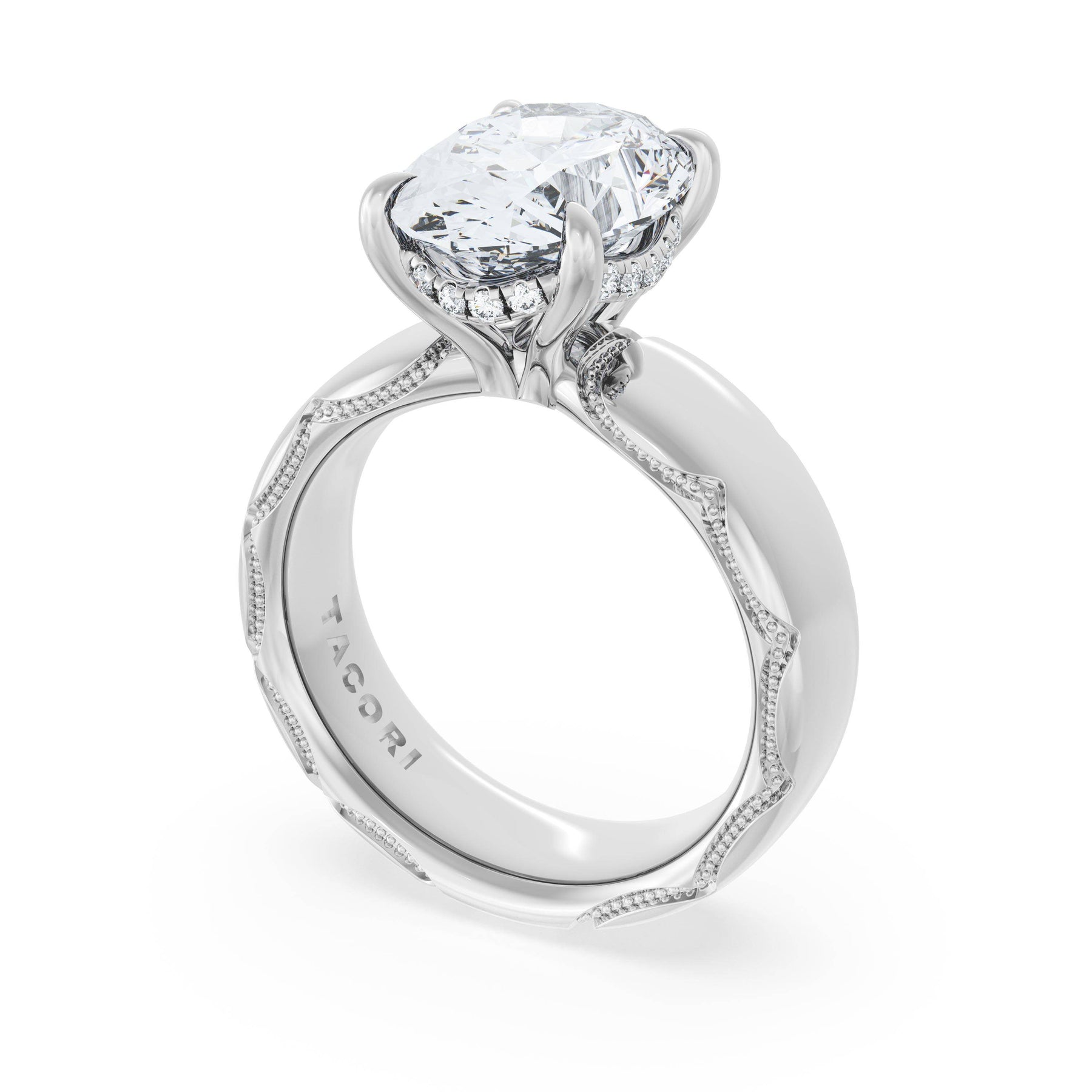 The oval solitaire sits on a Cathedral foundation with a hidden bloom, which adds the TACORI touch. A high-polish band of premium metals is studded with a diamond-studded Signature Crescent at the foundation