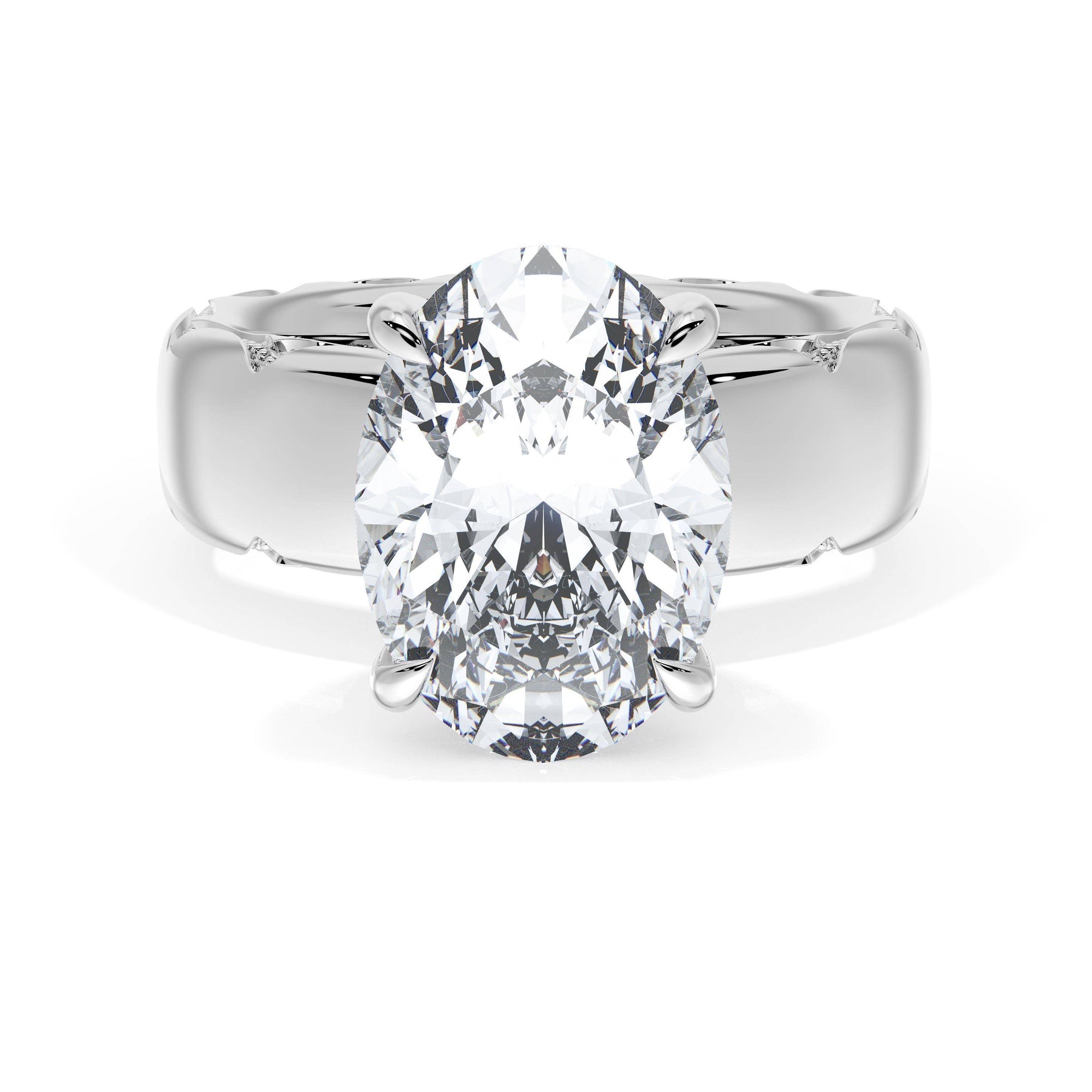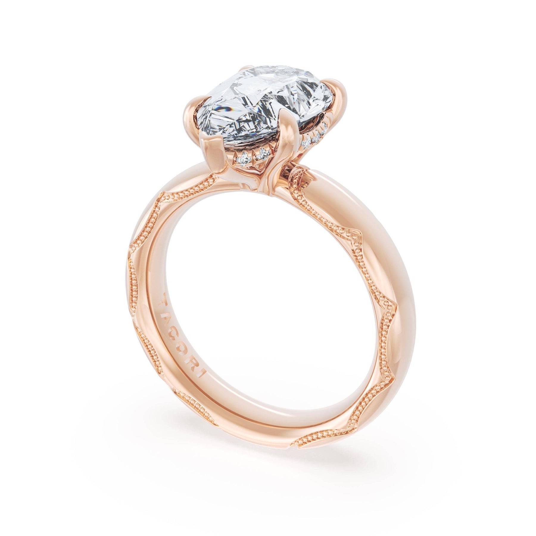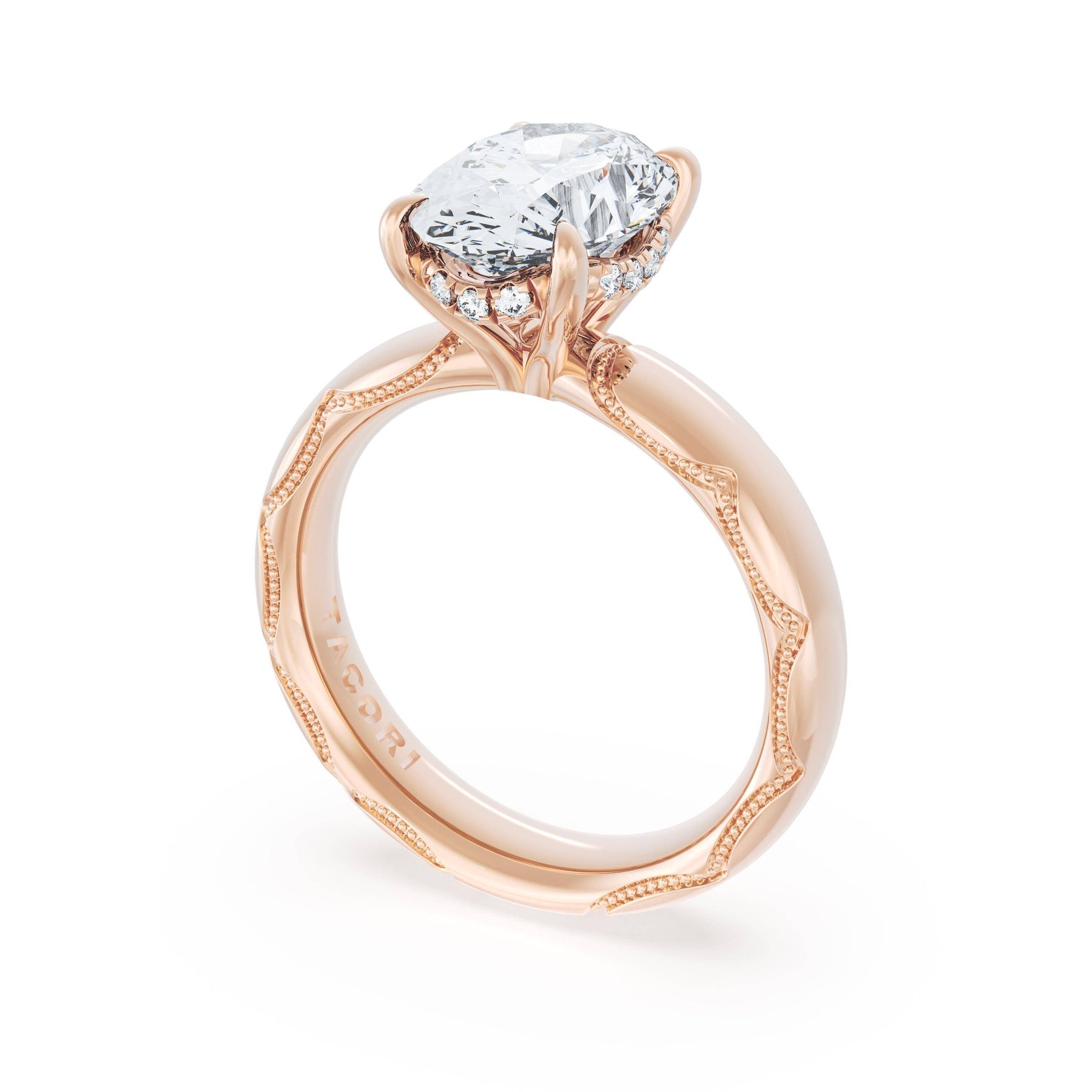 The oval solitaire sits on a Cathedral foundation with a hidden bloom, which adds the TACORI touch. A high-polish band of premium metals is studded with a diamond-studded Signature Crescent at the foundation