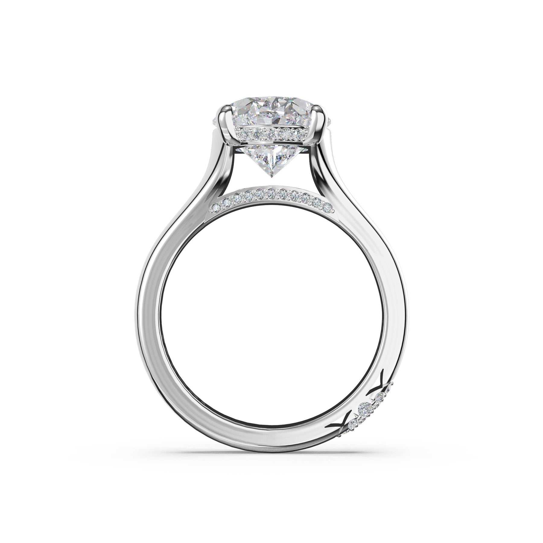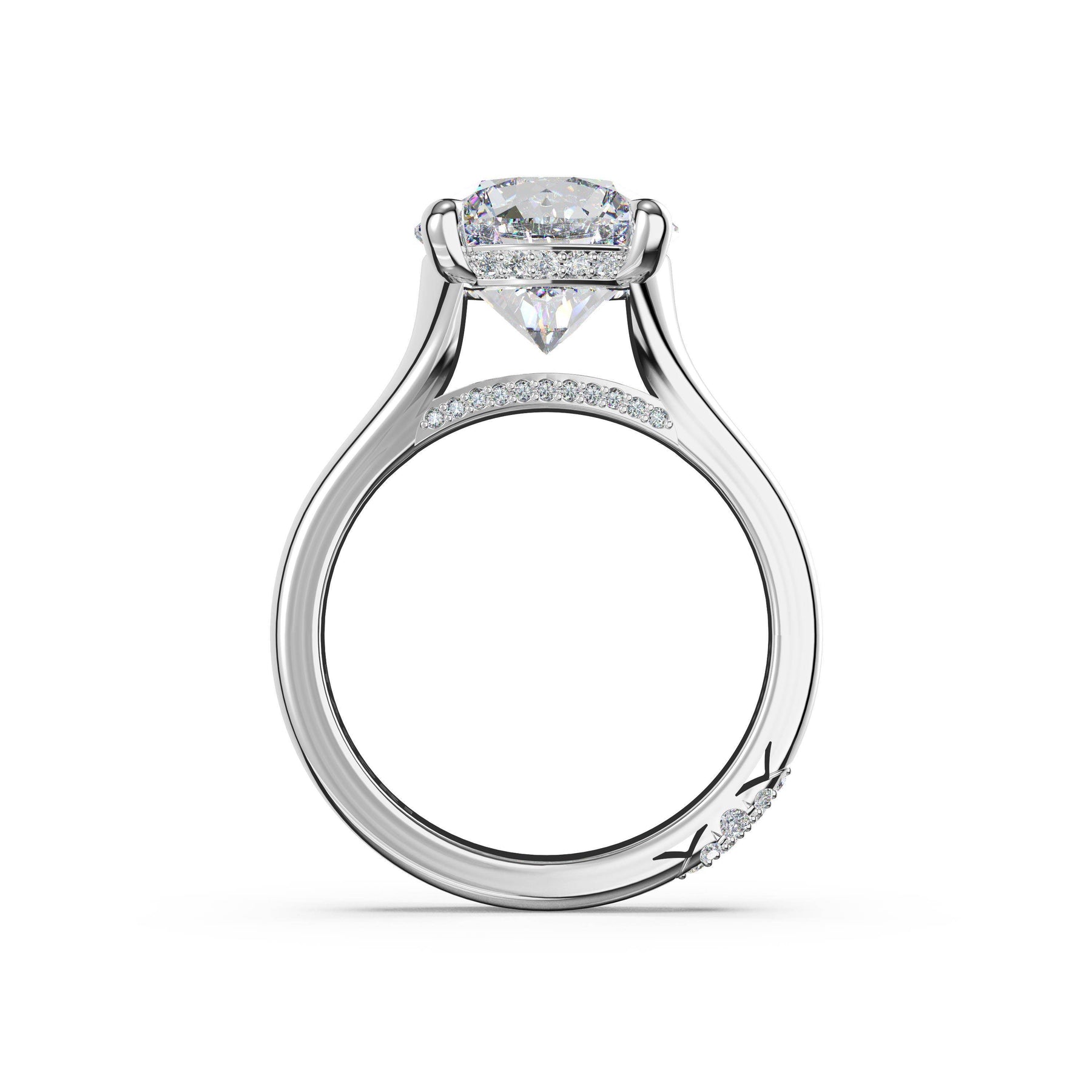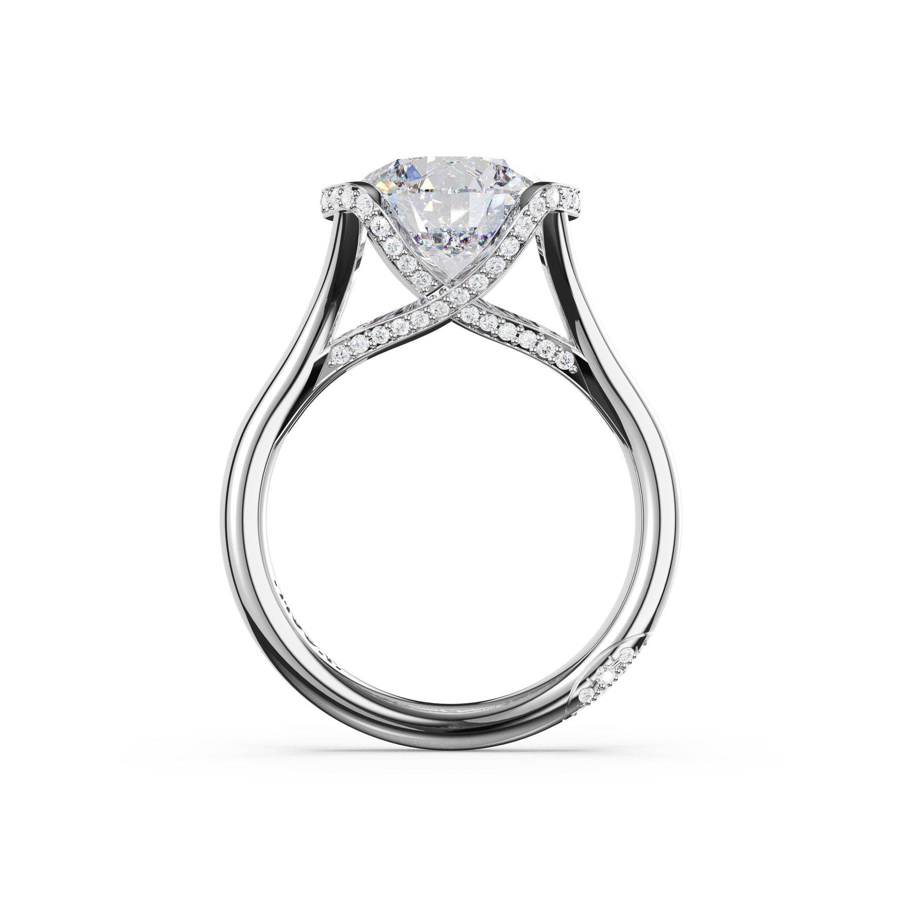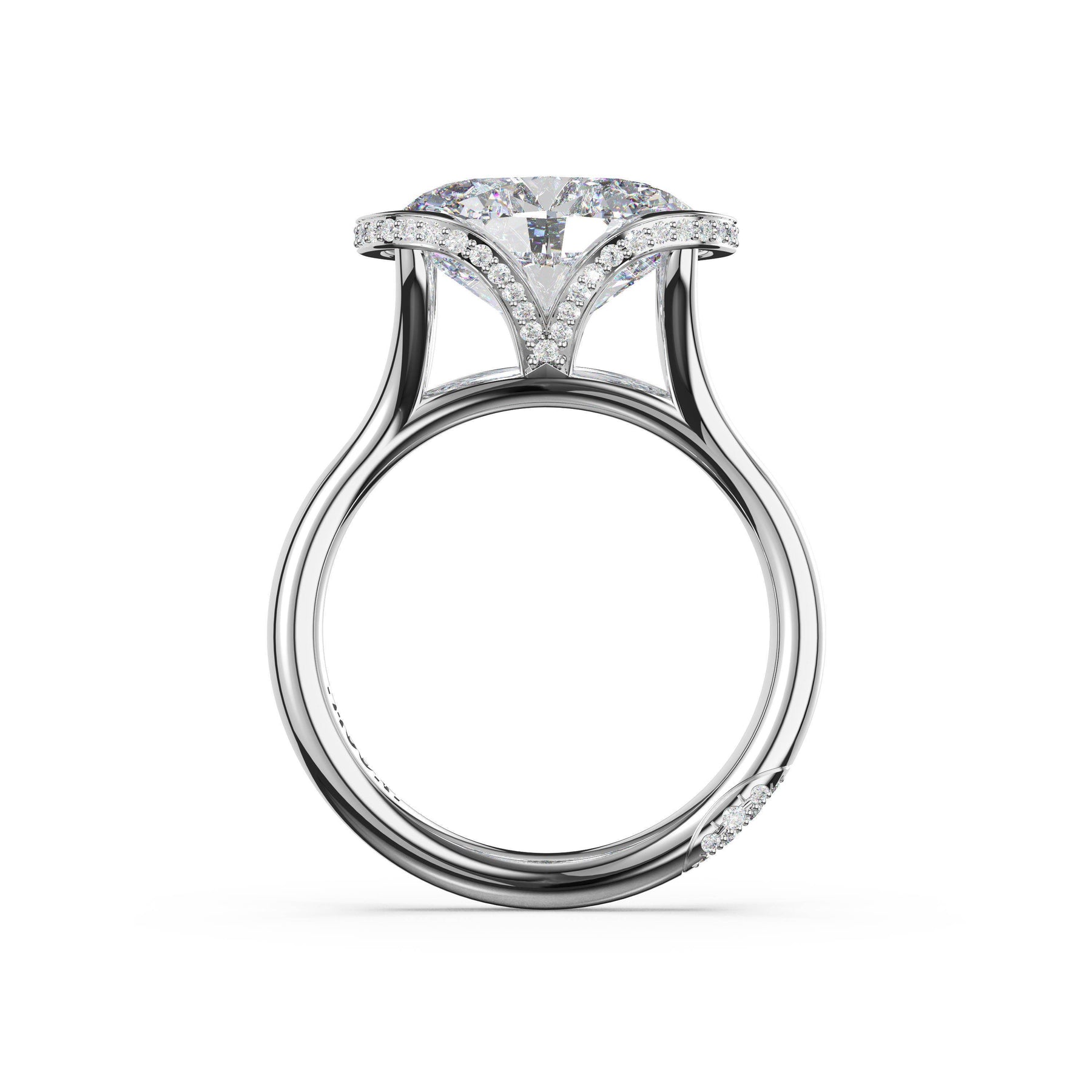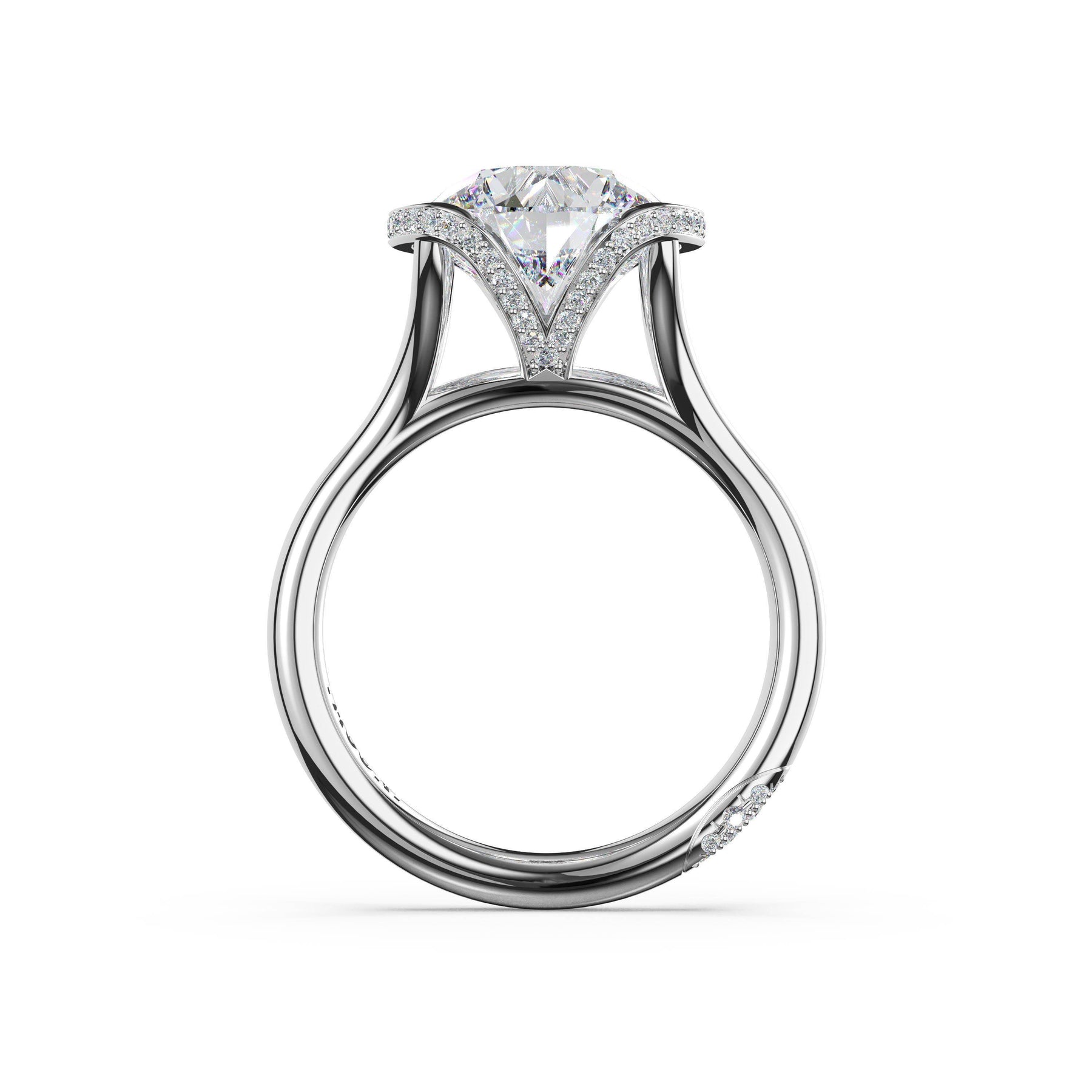 Triple pavé of decorates the ceiling, leading to a solitaire that sits atop a Cathedral foundation with a hidden bloom. A Founder's Crescent marks the foundation of the ring.