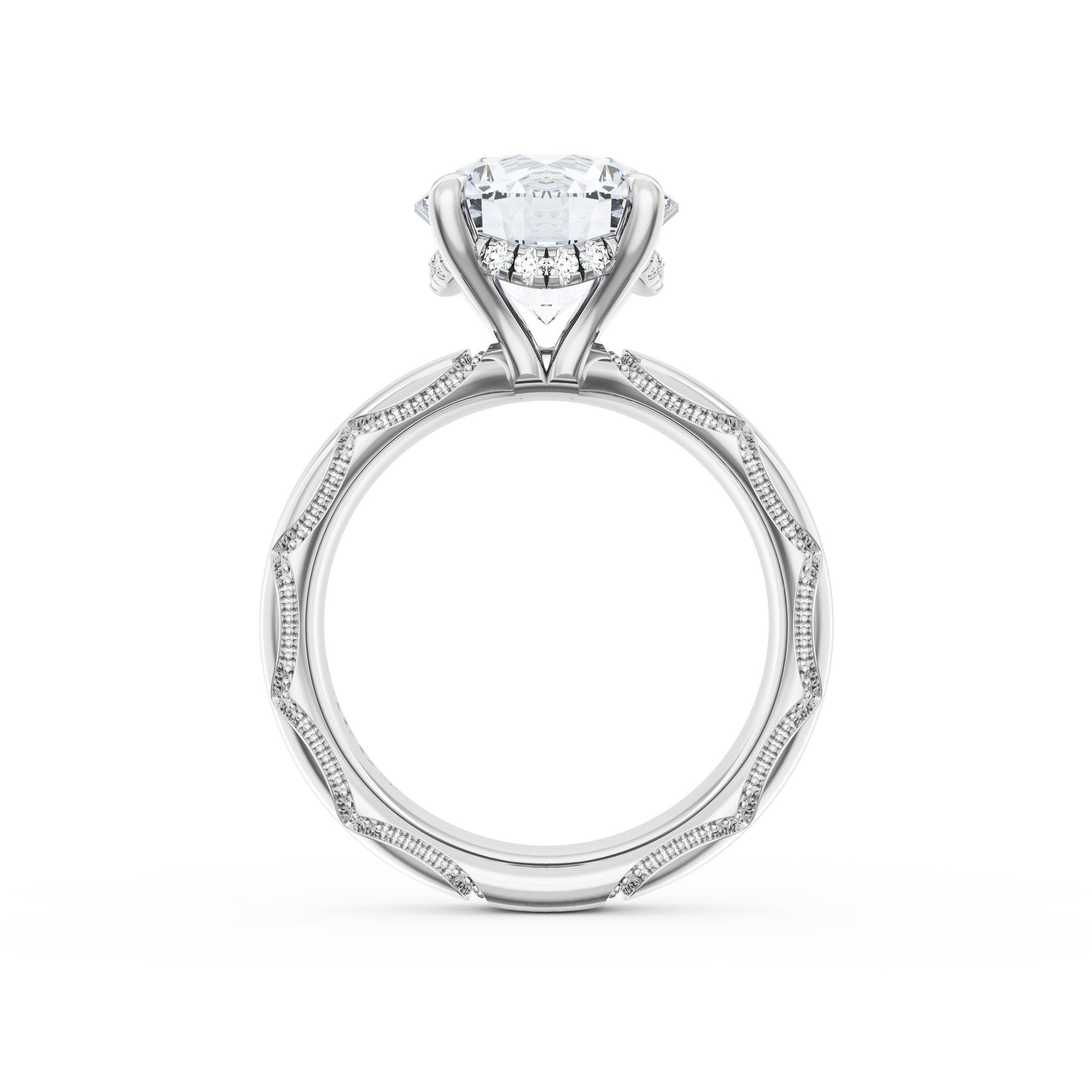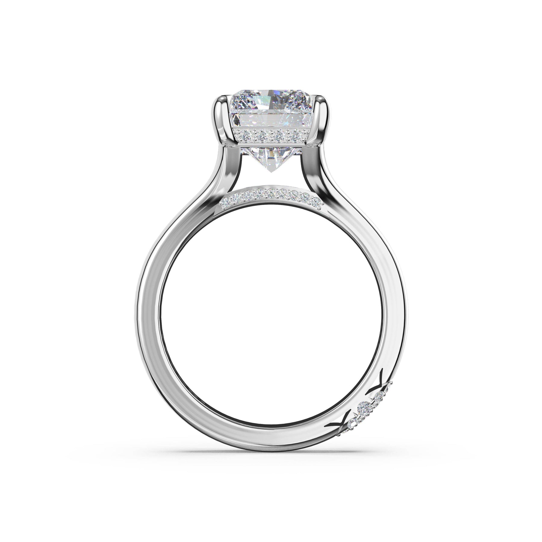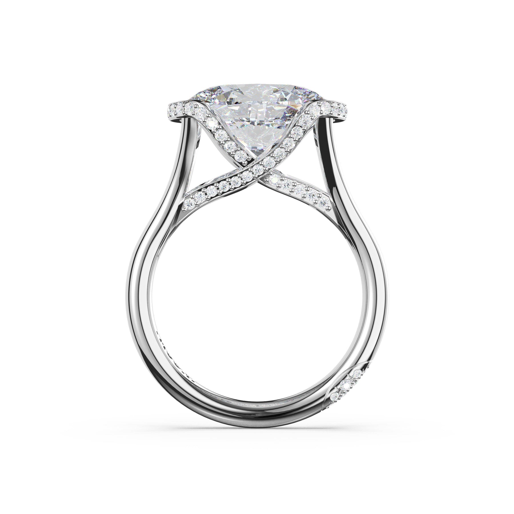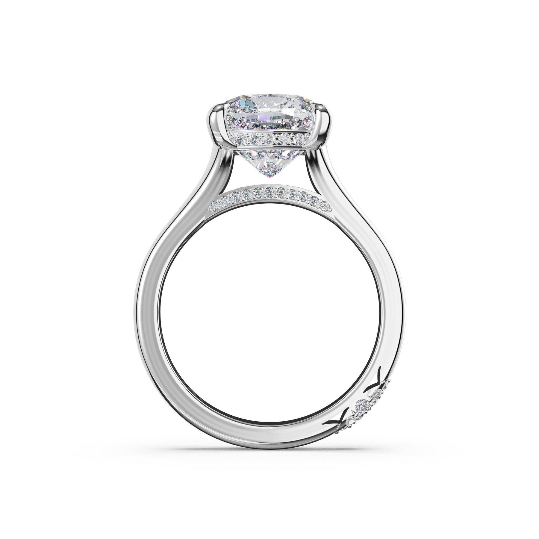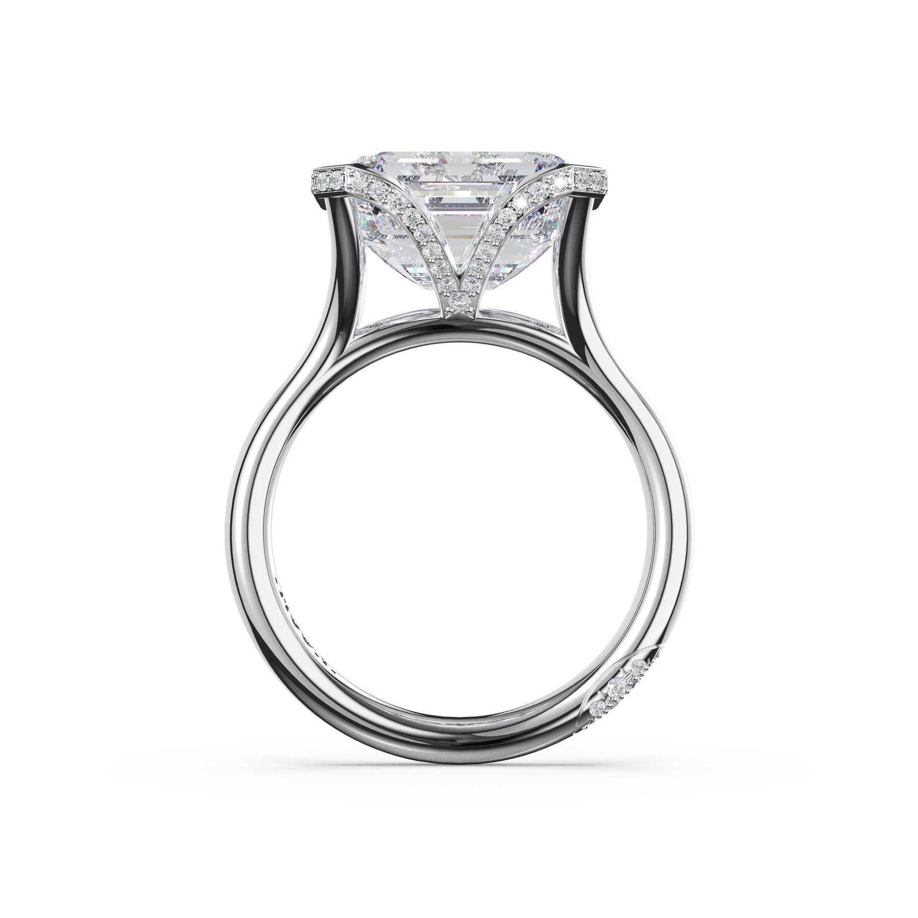 Triple pavé of decorates the ceiling, leading to a solitaire that sits atop a Cathedral foundation with a hidden bloom. A Founder's Crescent marks the foundation of the ring.