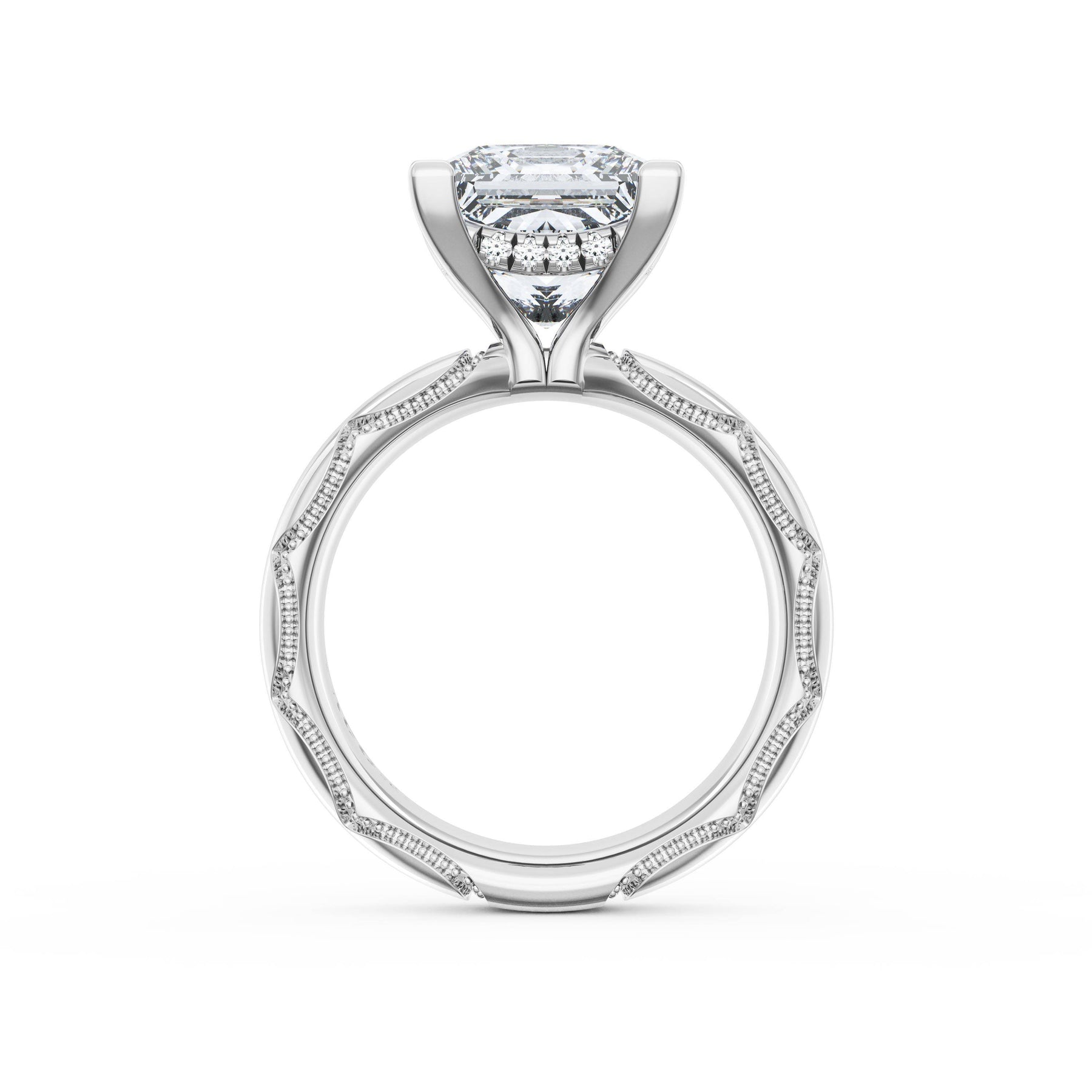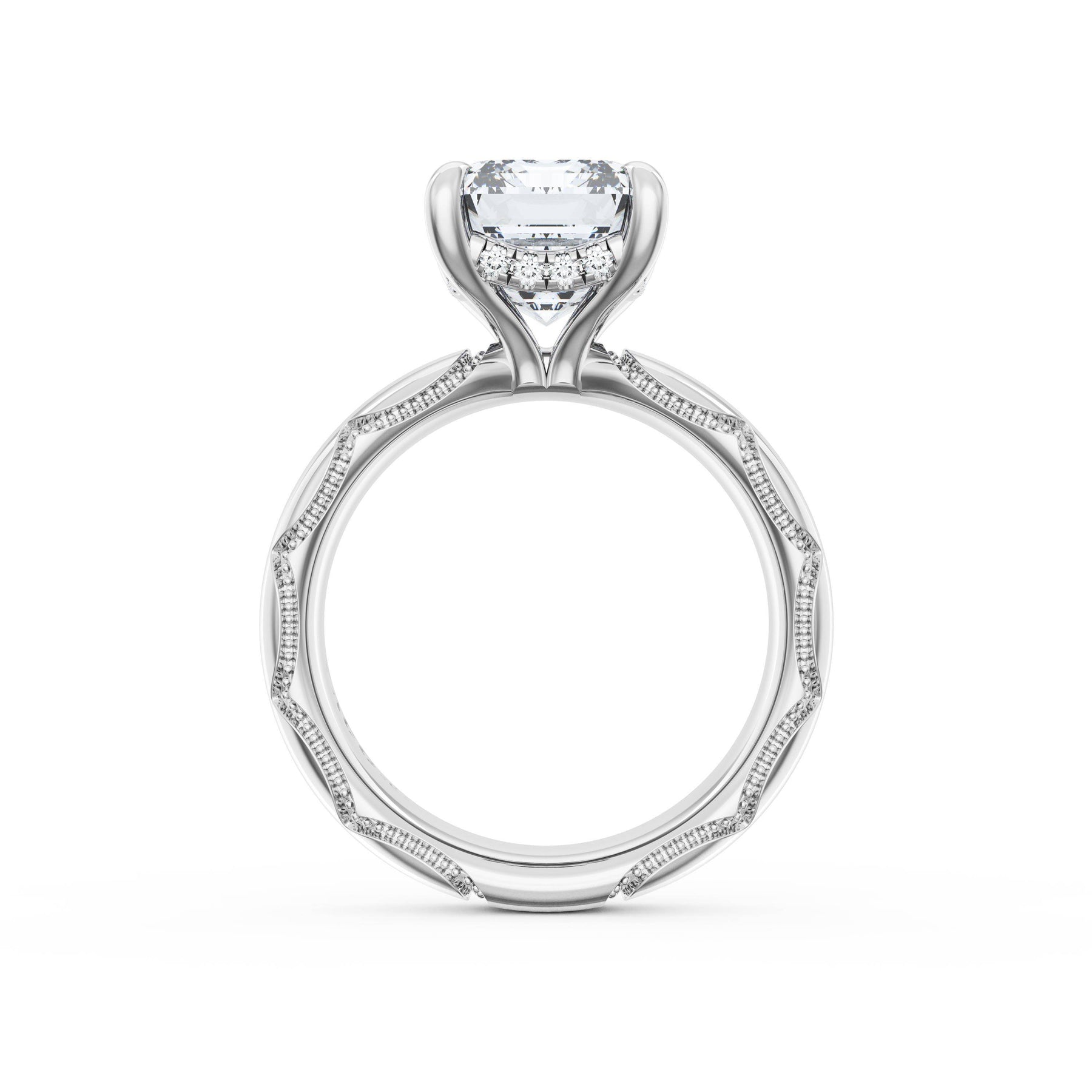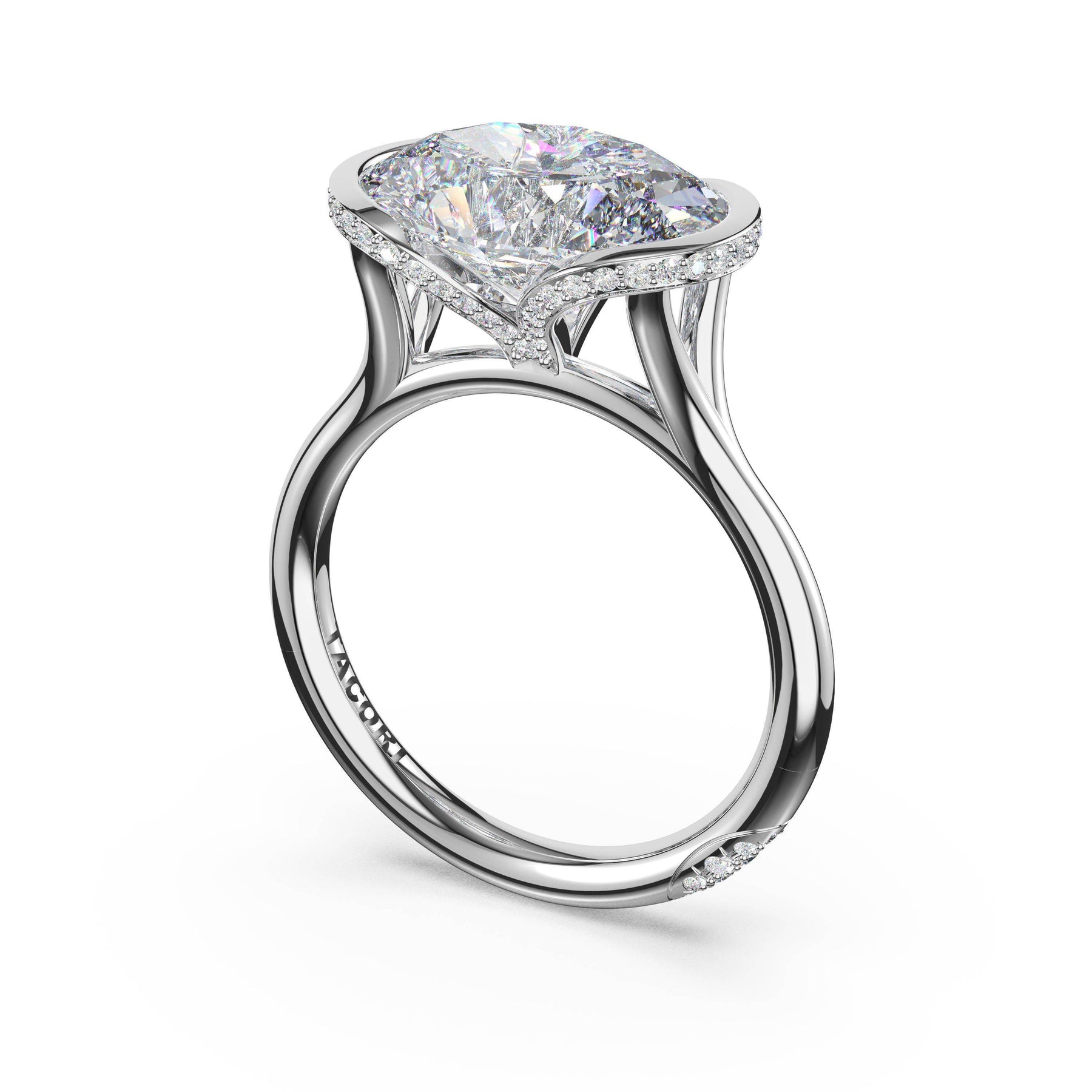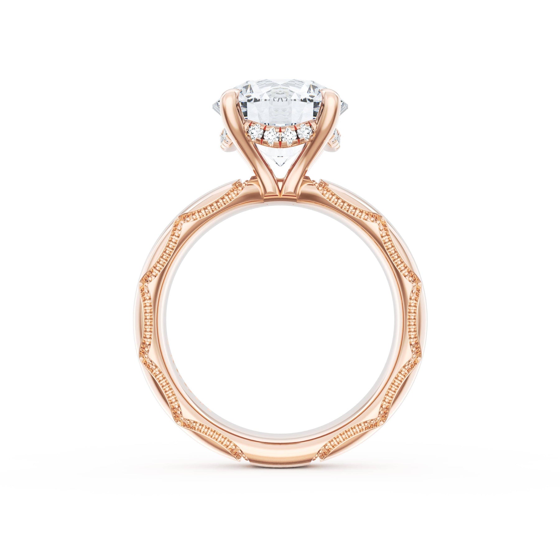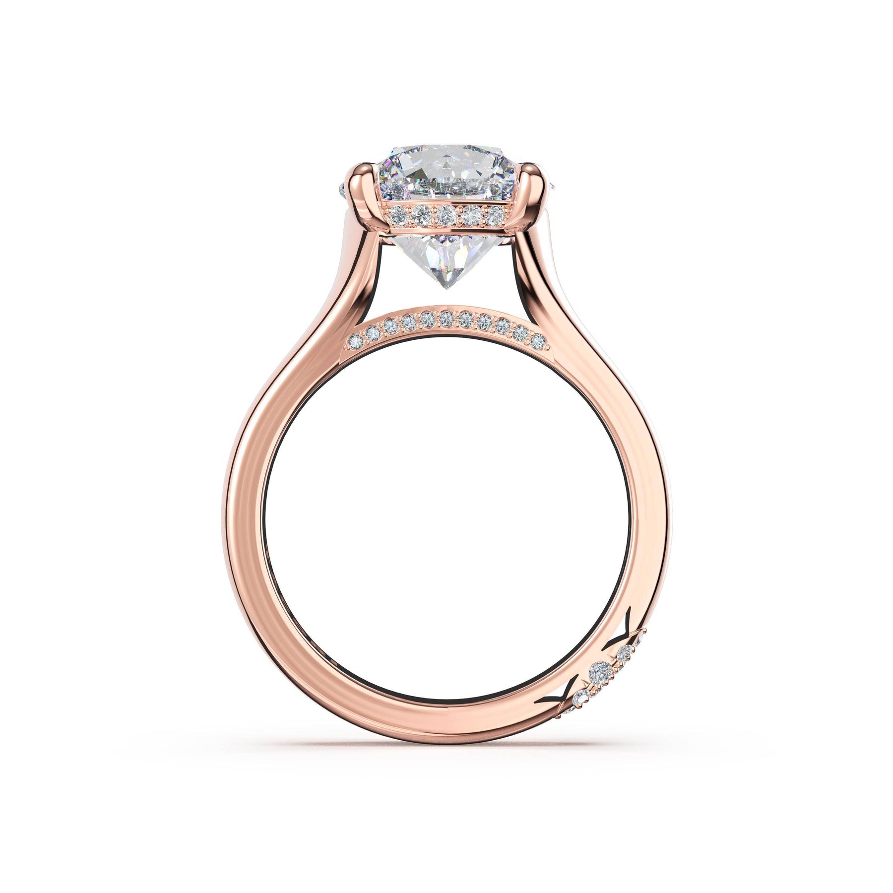 Triple pavé of decorates the ceiling, leading to a solitaire that sits atop a Cathedral foundation with a hidden bloom. A Founder's Crescent marks the foundation of the ring.