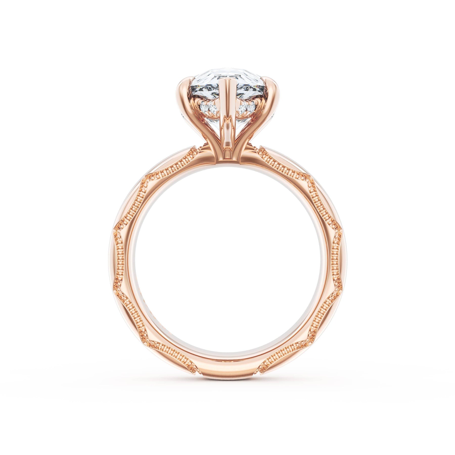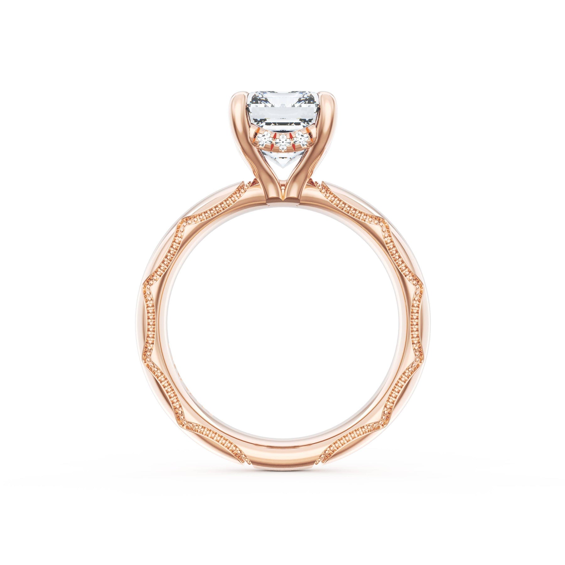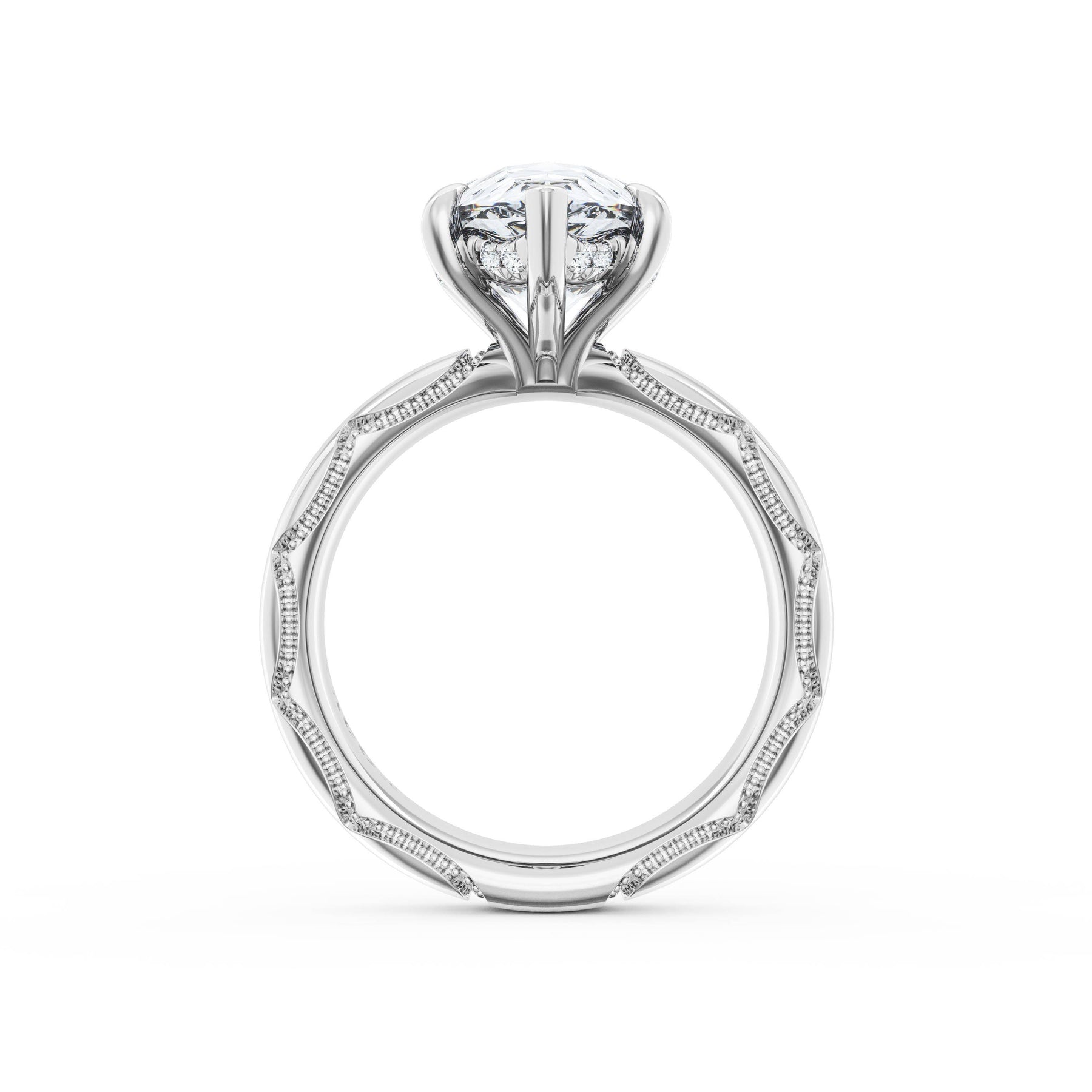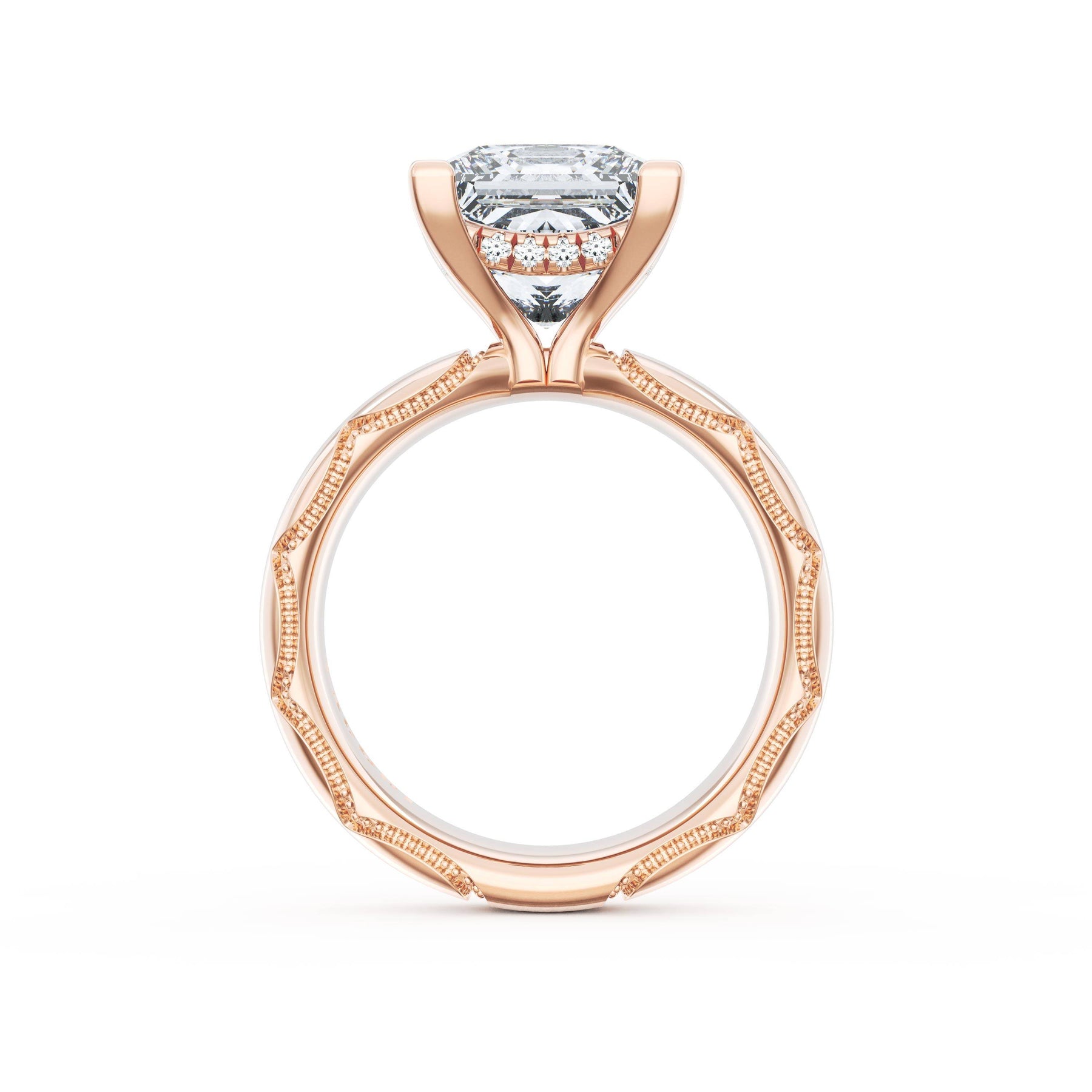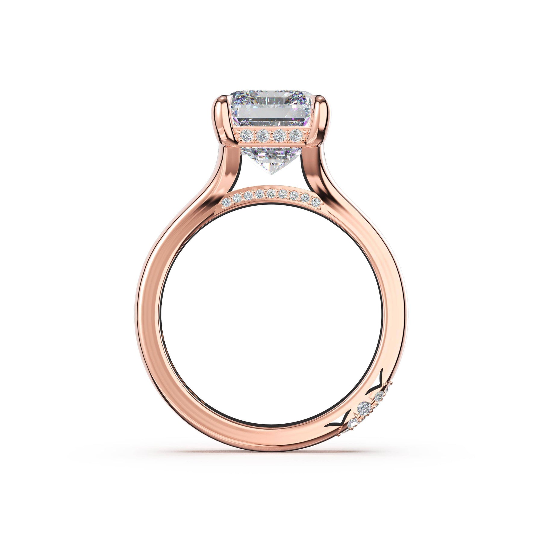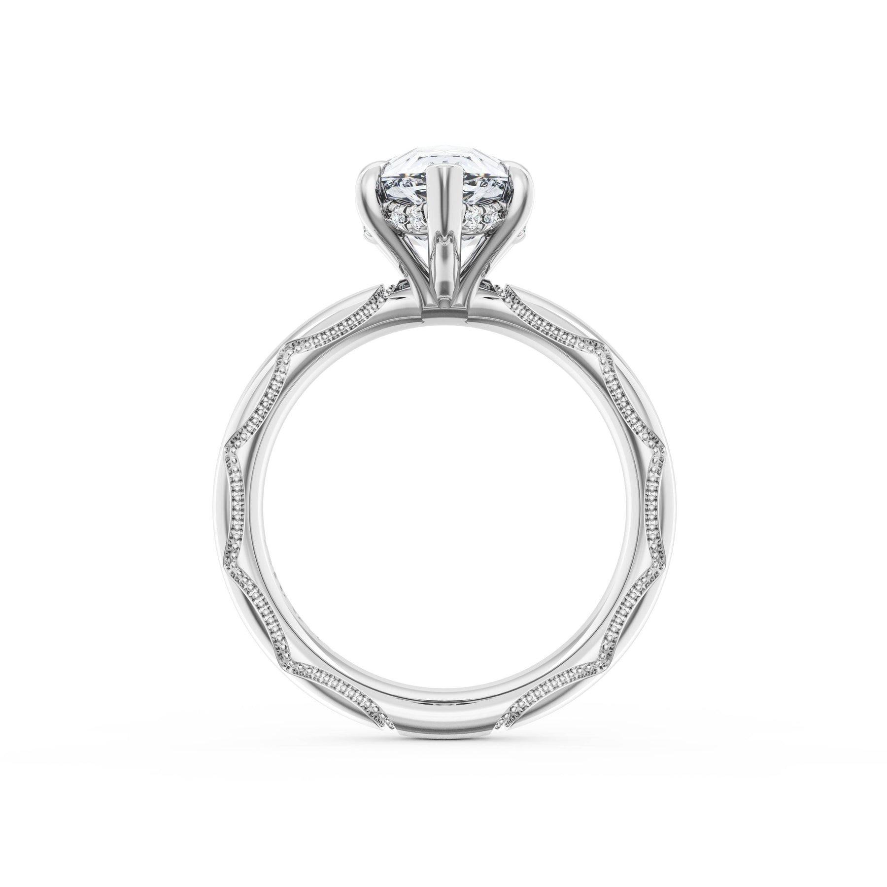 Triple pavé of decorates the ceiling, leading to a solitaire that sits atop a Cathedral foundation with a hidden bloom. A Founder's Crescent marks the foundation of the ring.