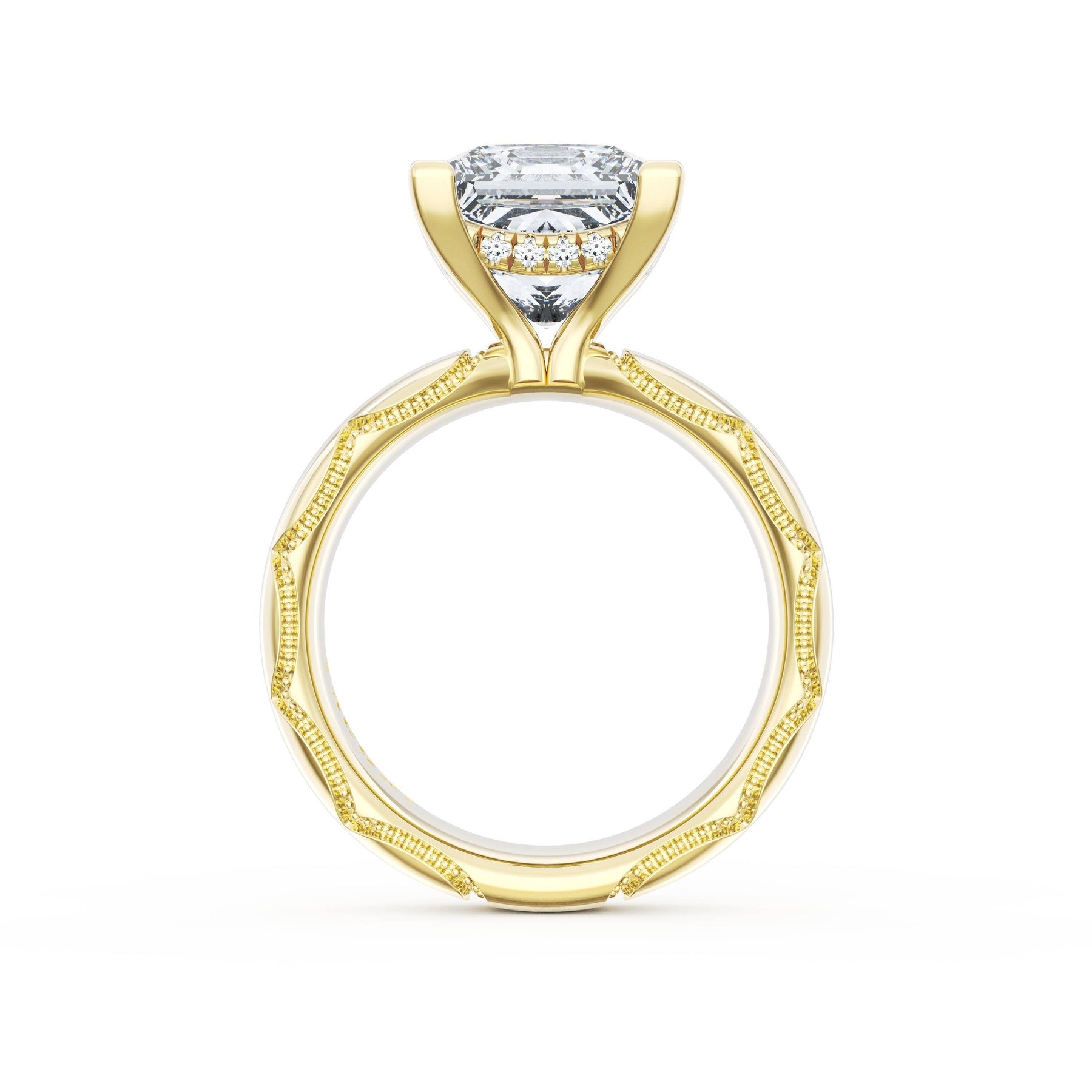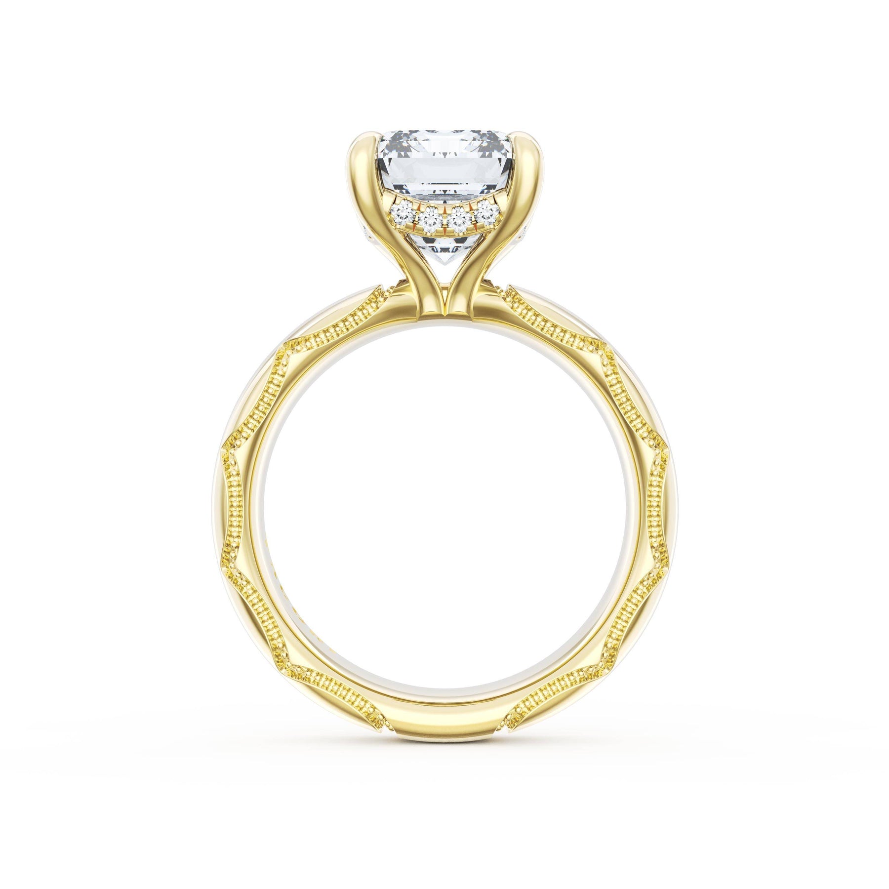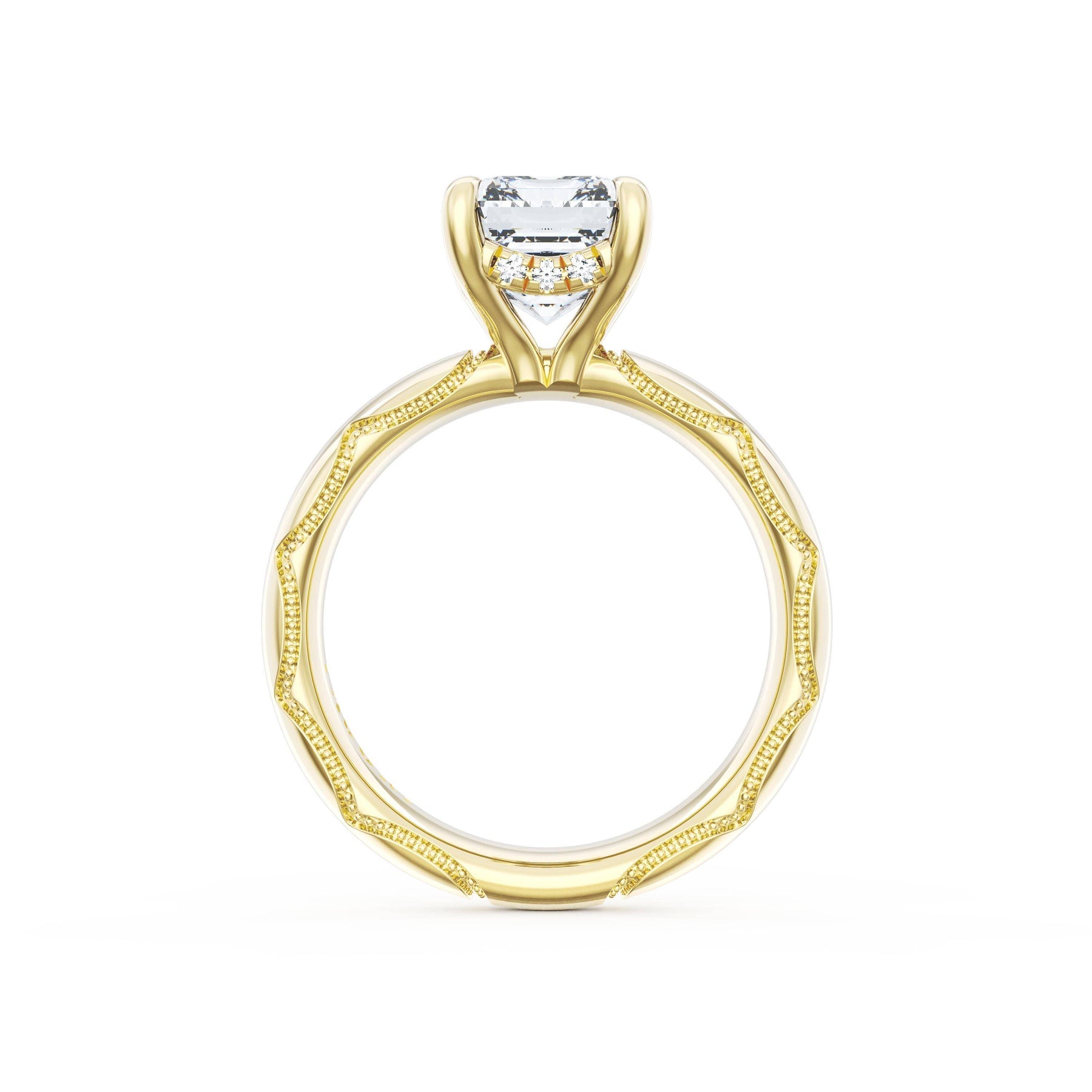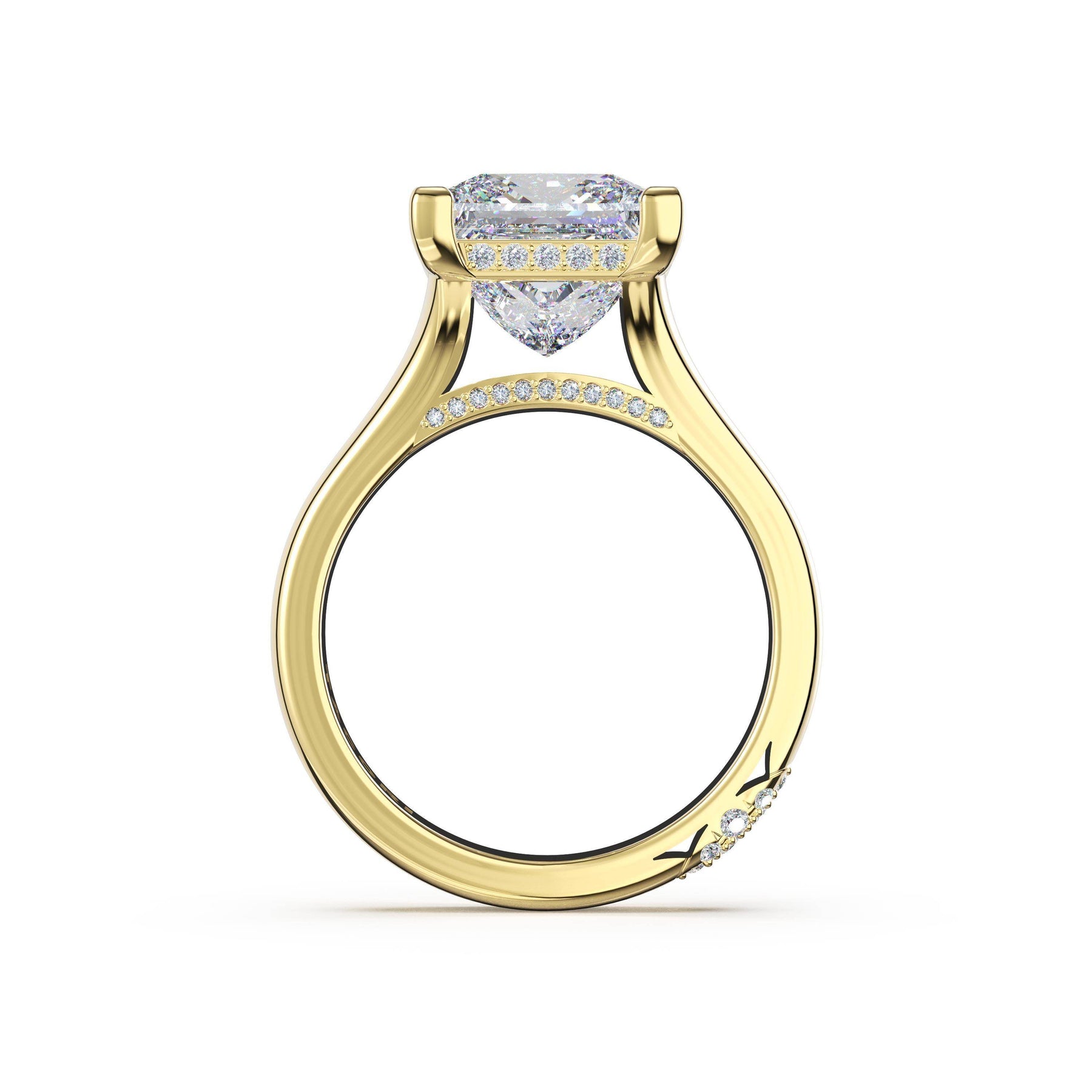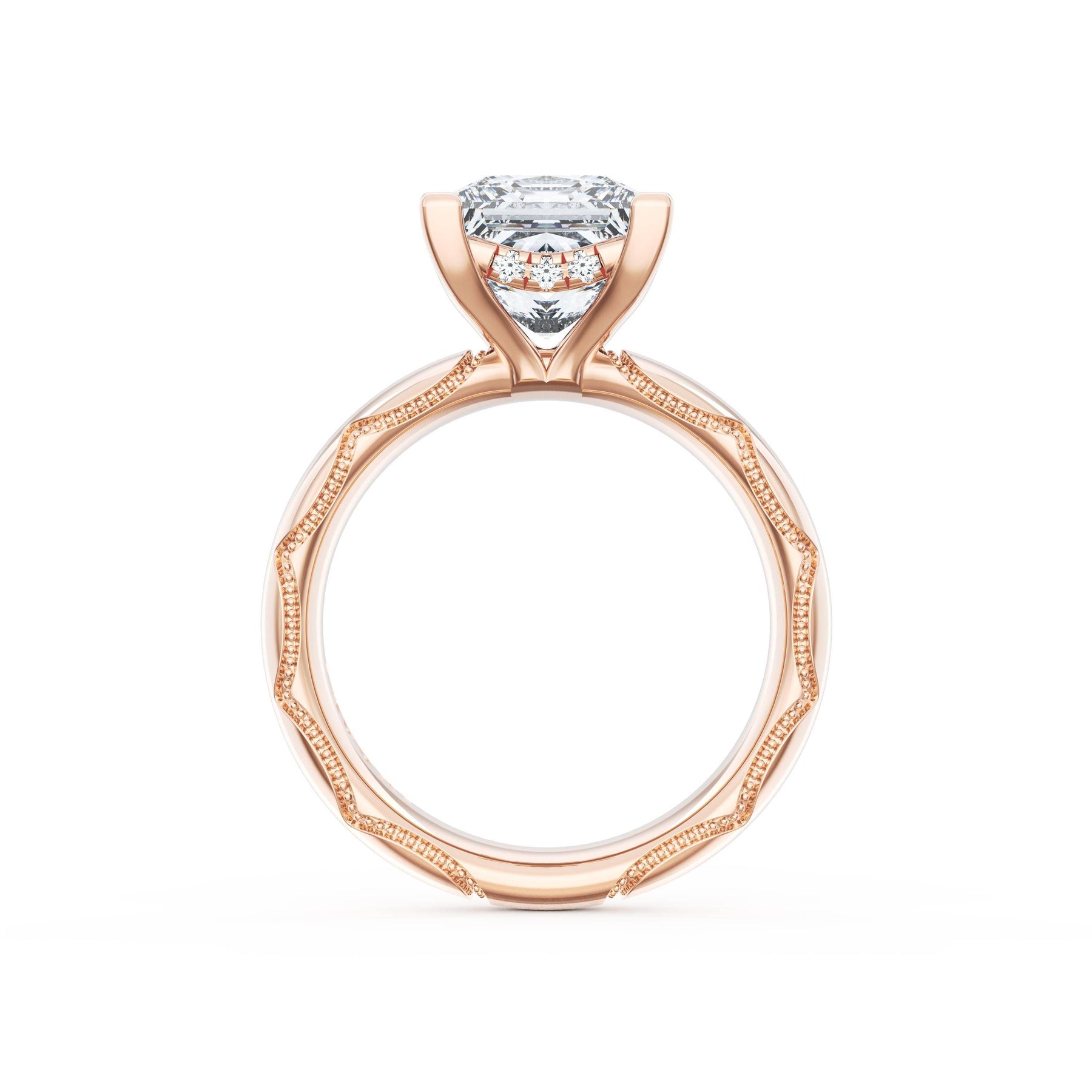 Triple pavé of decorates the ceiling, leading to a solitaire that sits atop a Cathedral foundation with a hidden bloom. A Founder's Crescent marks the foundation of the ring.