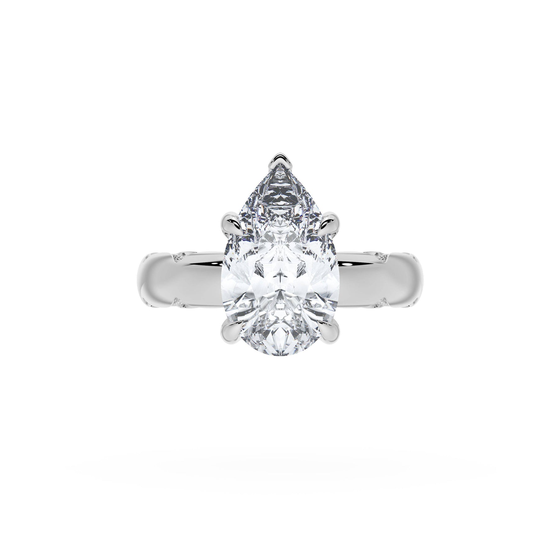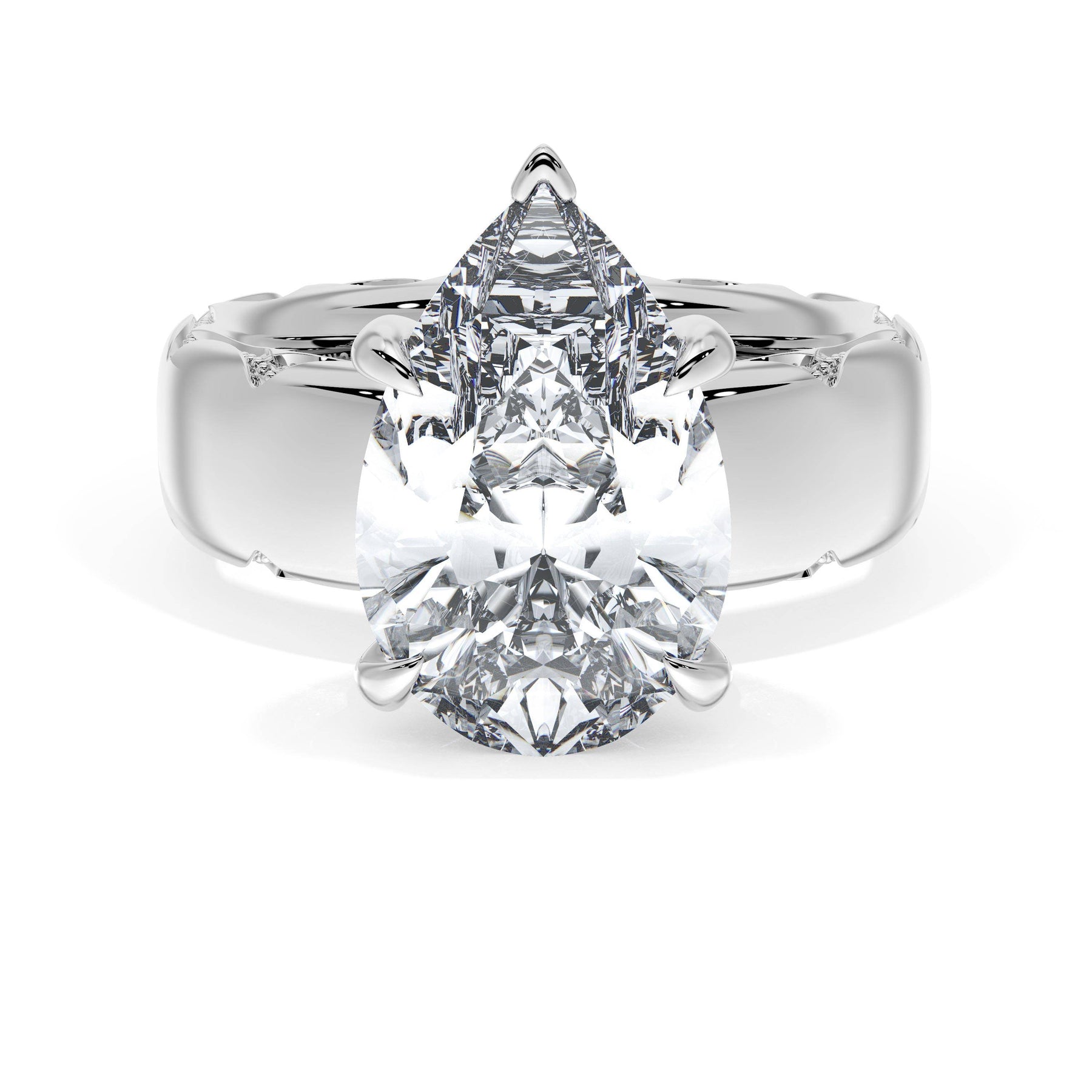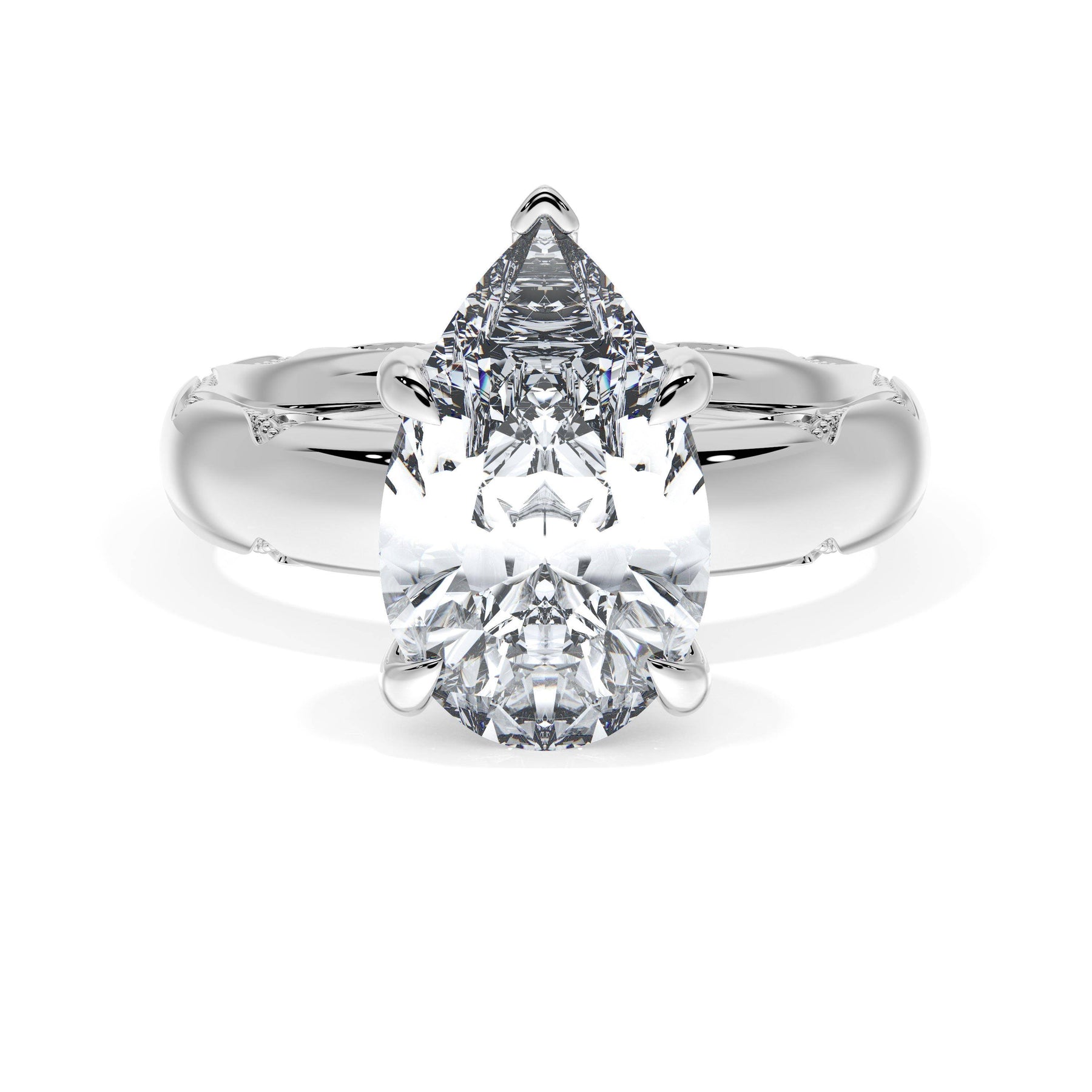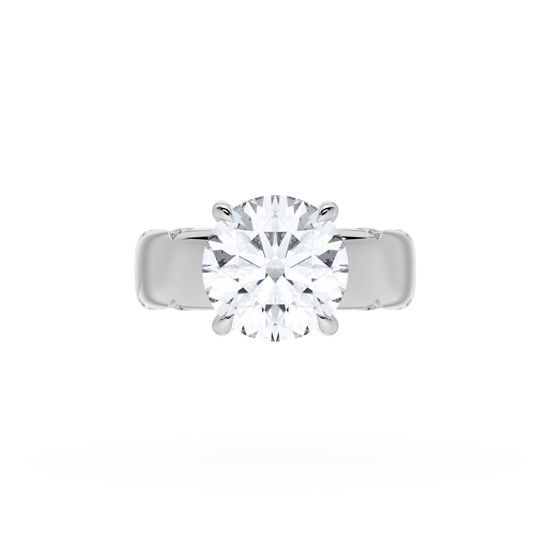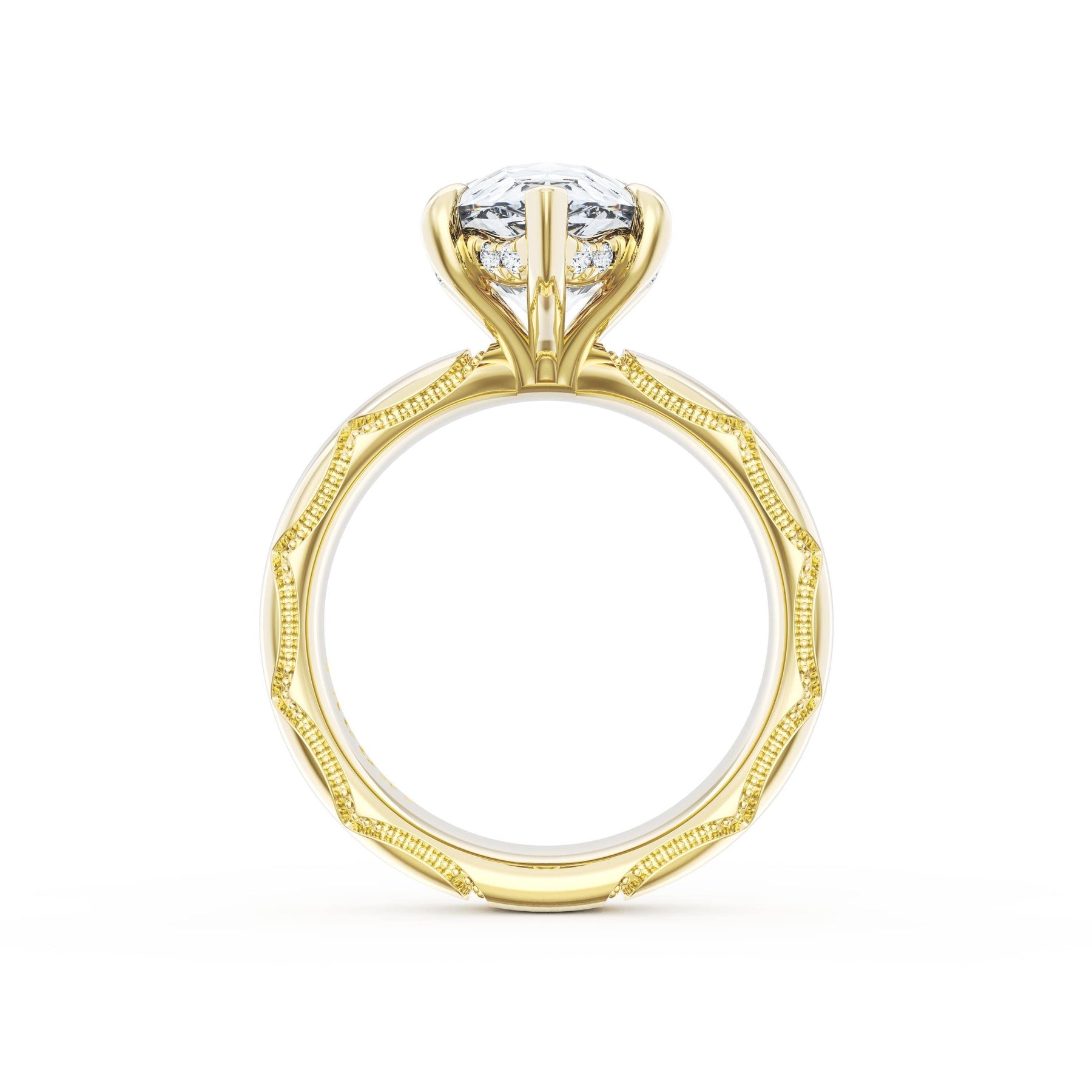 Triple pavé of decorates the ceiling, leading to a solitaire that sits atop a Cathedral foundation with a hidden bloom. A Founder's Crescent marks the foundation of the ring.