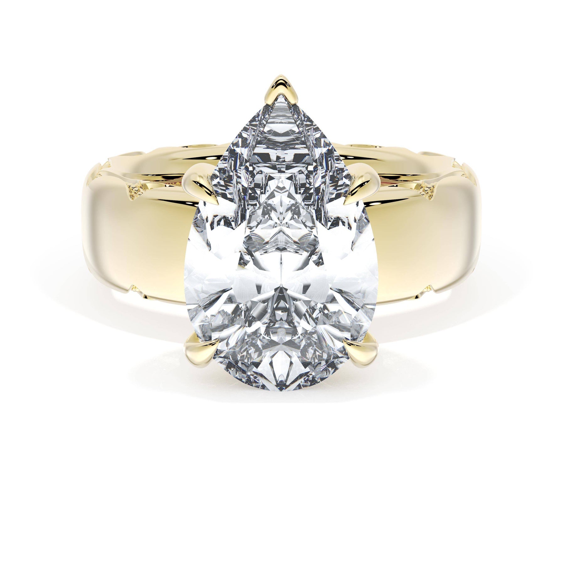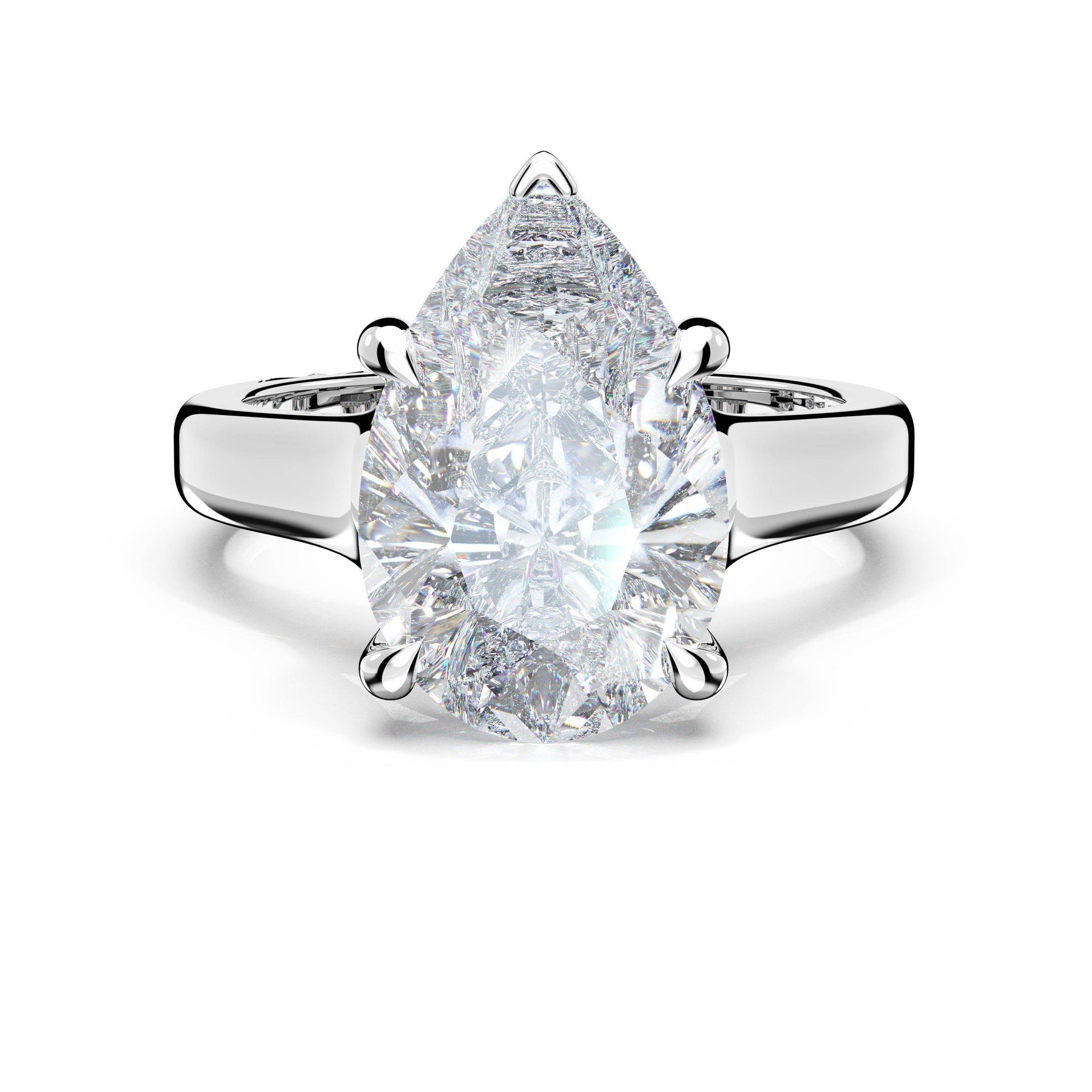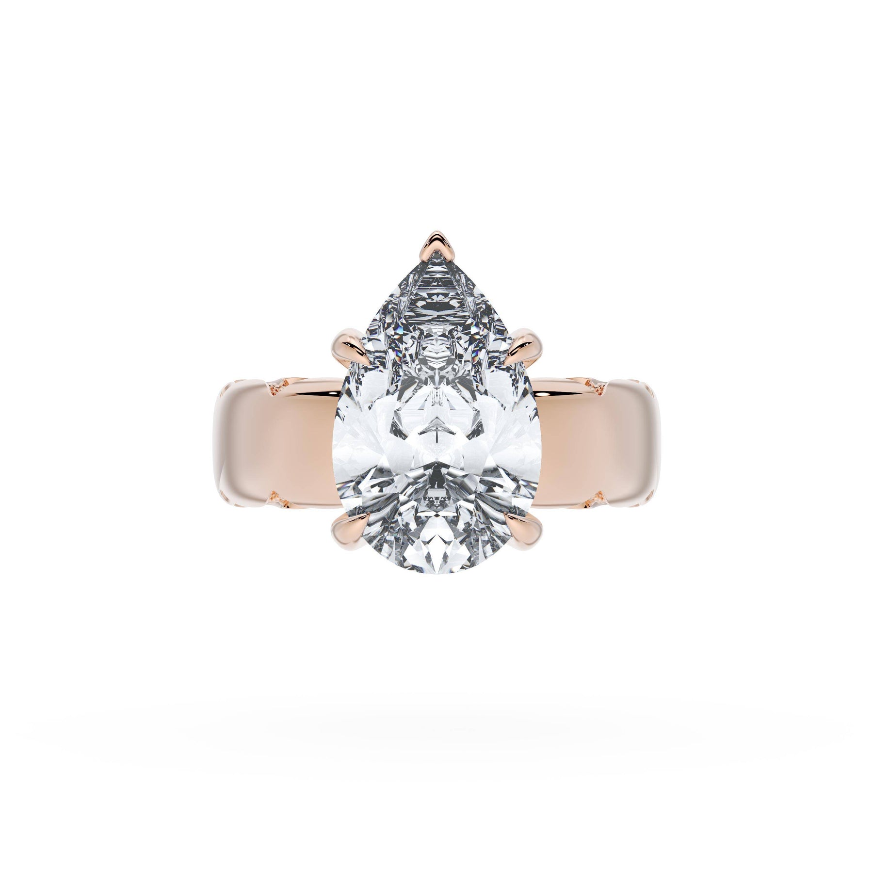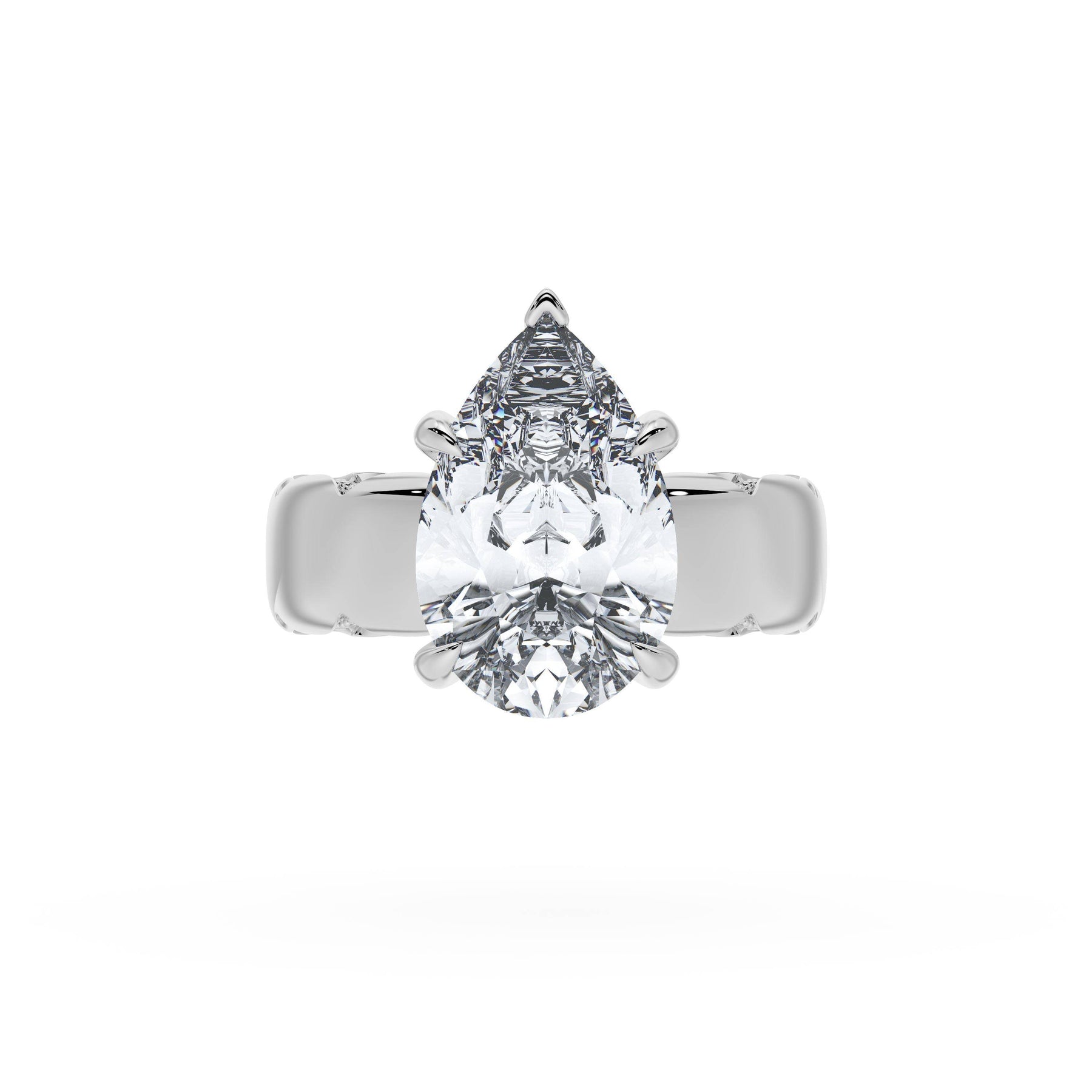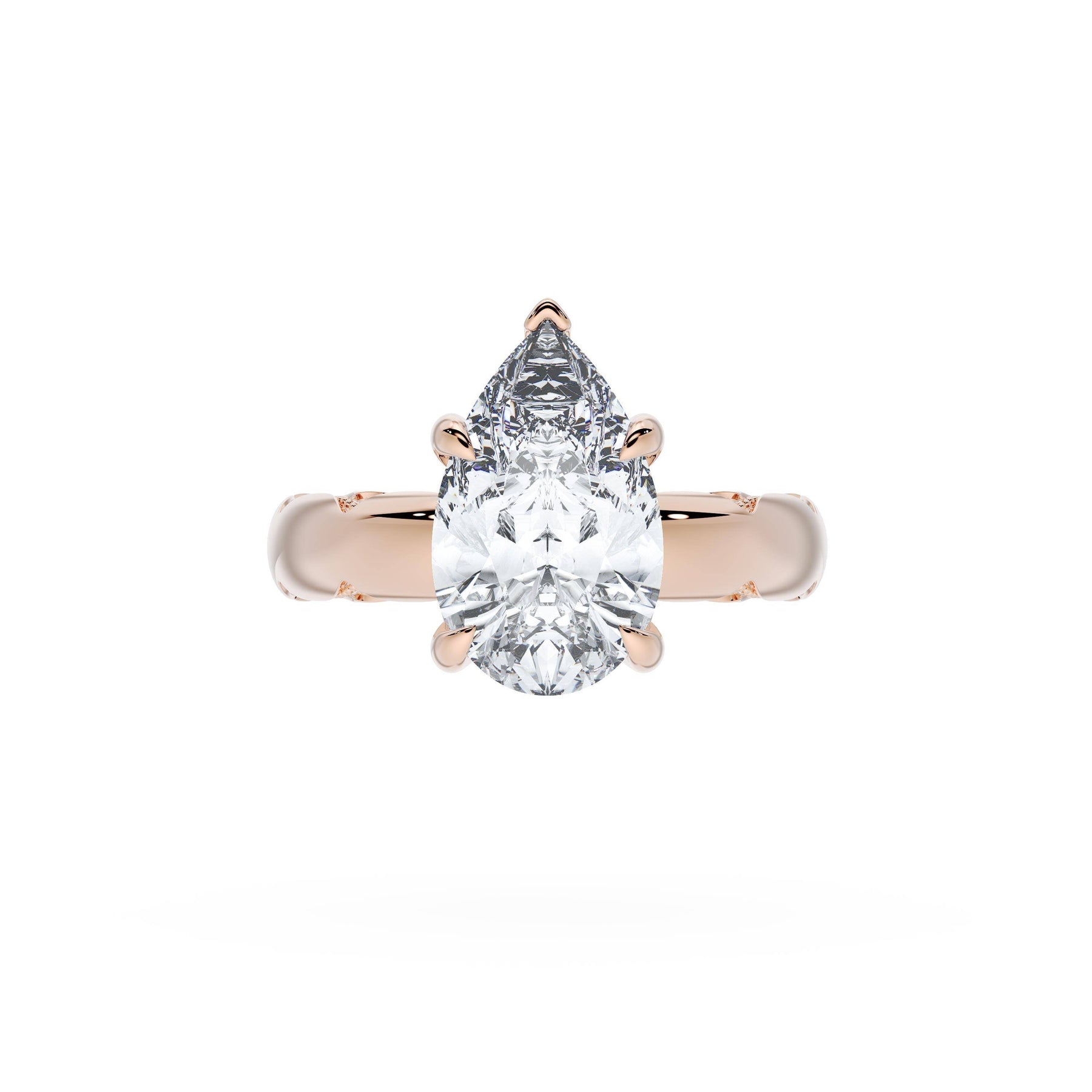 Triple pavé of decorates the ceiling, leading to a solitaire that sits atop a Cathedral foundation with a hidden bloom. A Founder's Crescent marks the foundation of the ring.