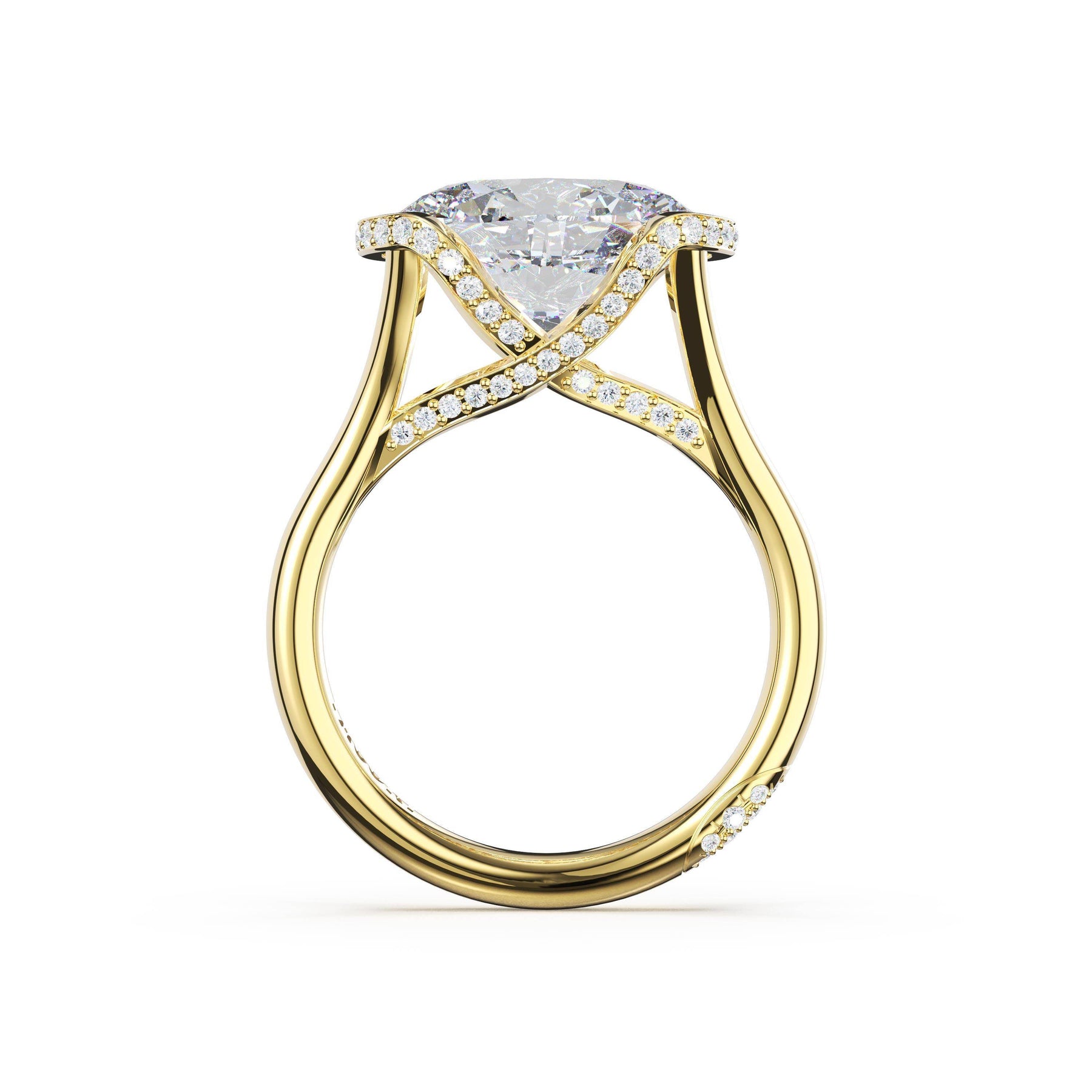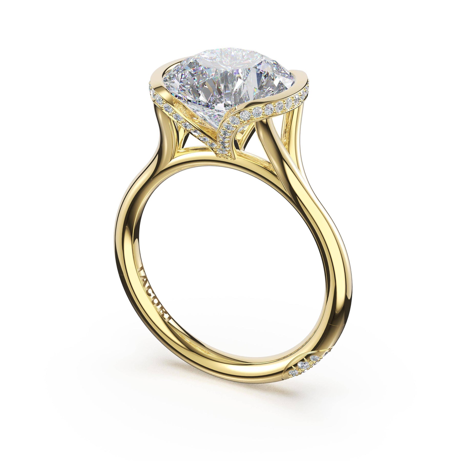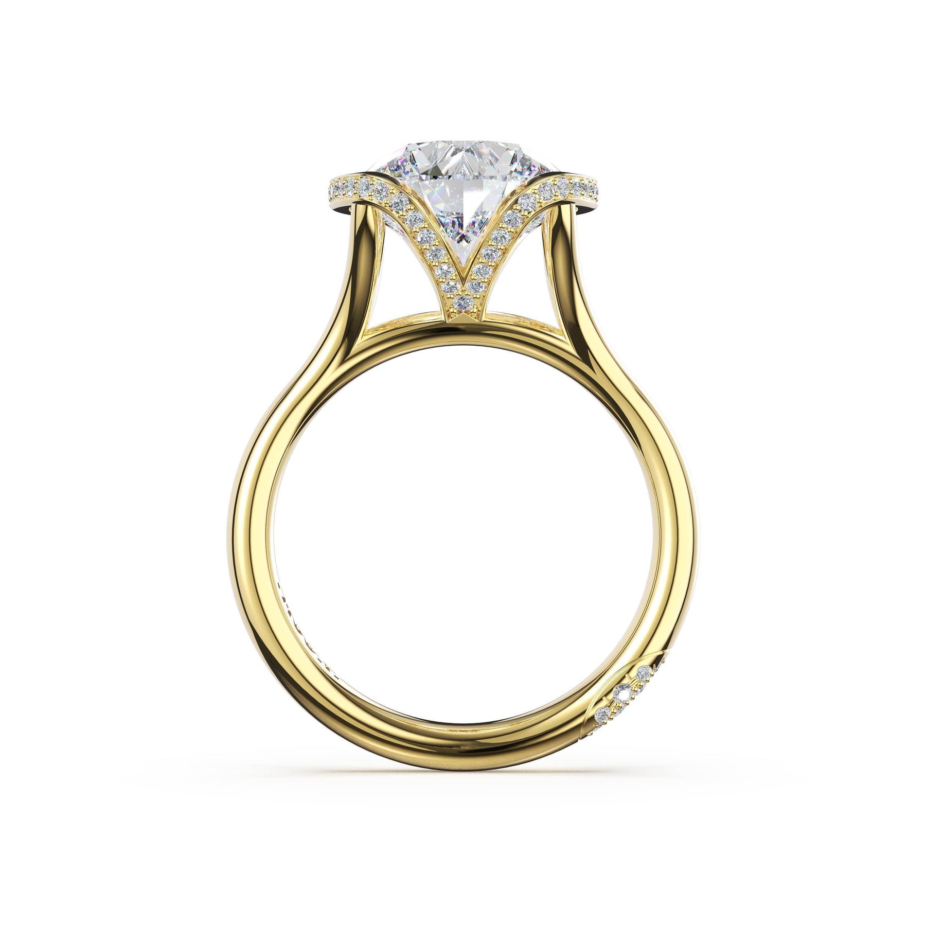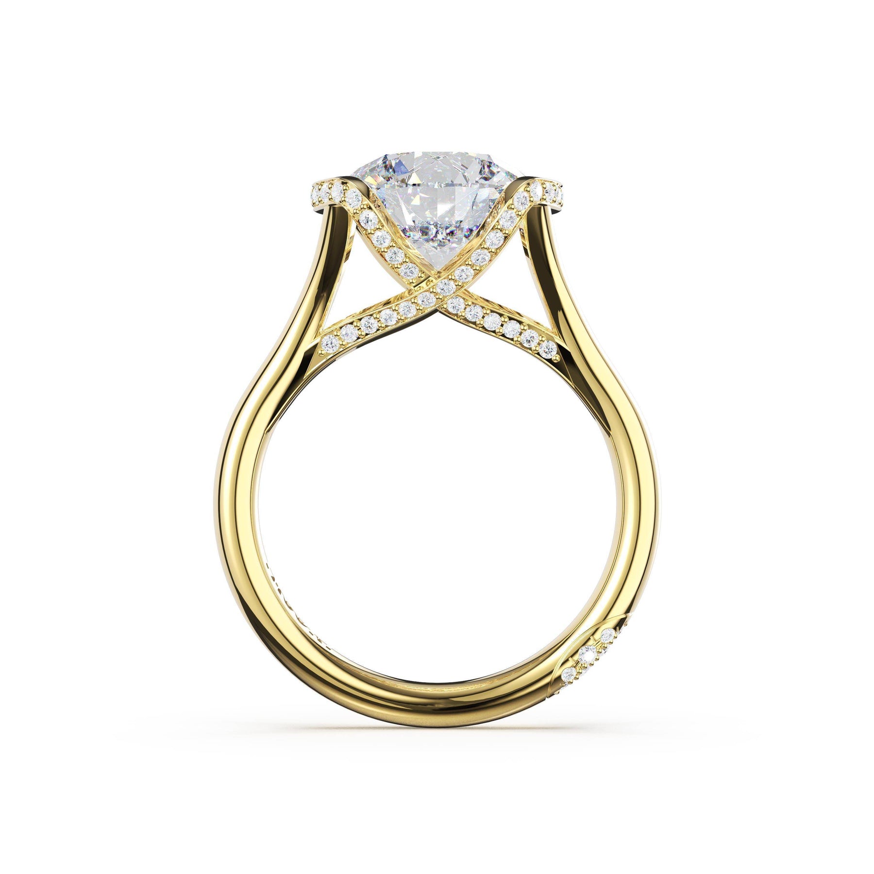 Round-brilliant diamonds add sparkle to the ceiling, while a Signature Crescent marks the resting point. The round-brilliant solitaire sits on a Cathedral foundation, decorated with a hidden bloom of diamonds for added brilliance.