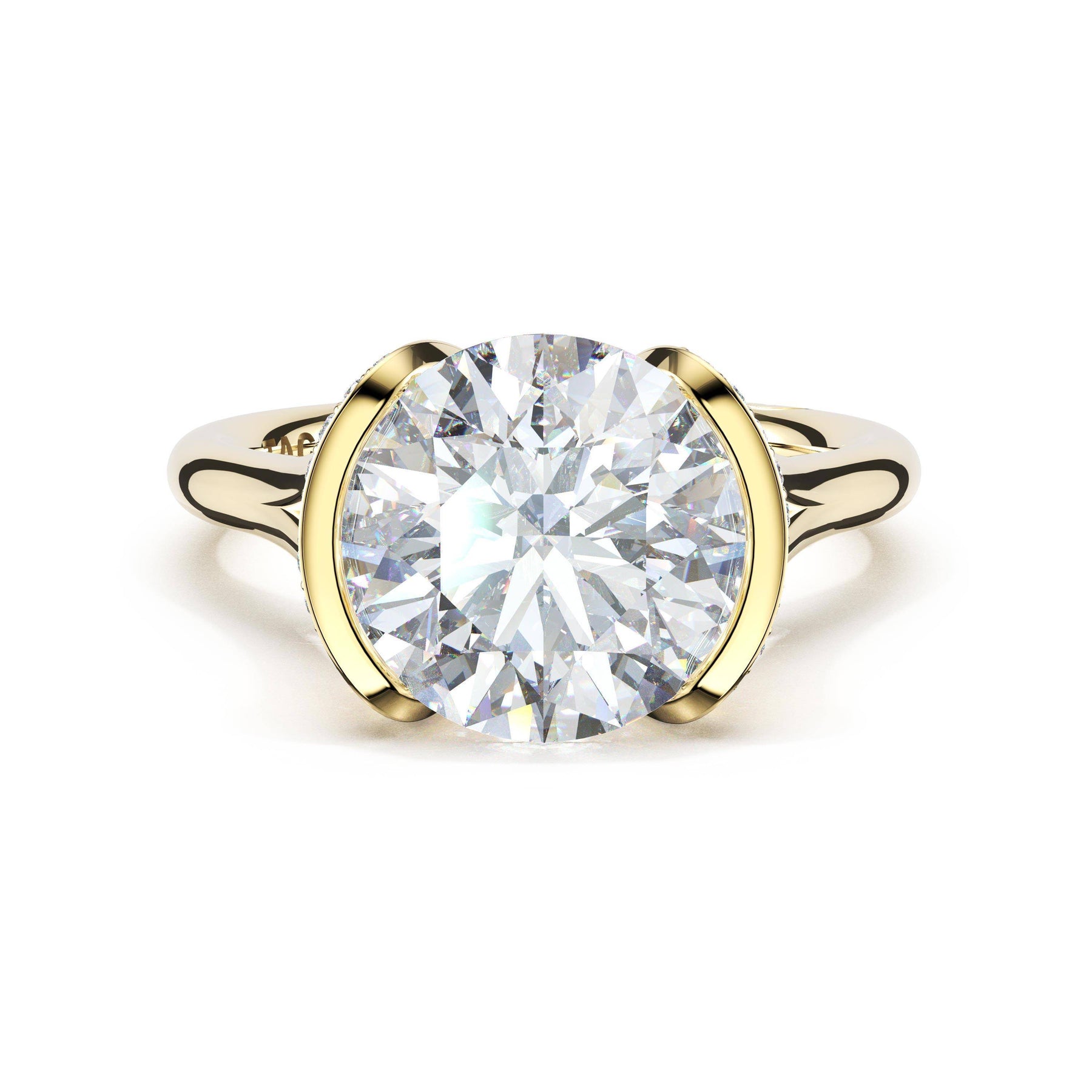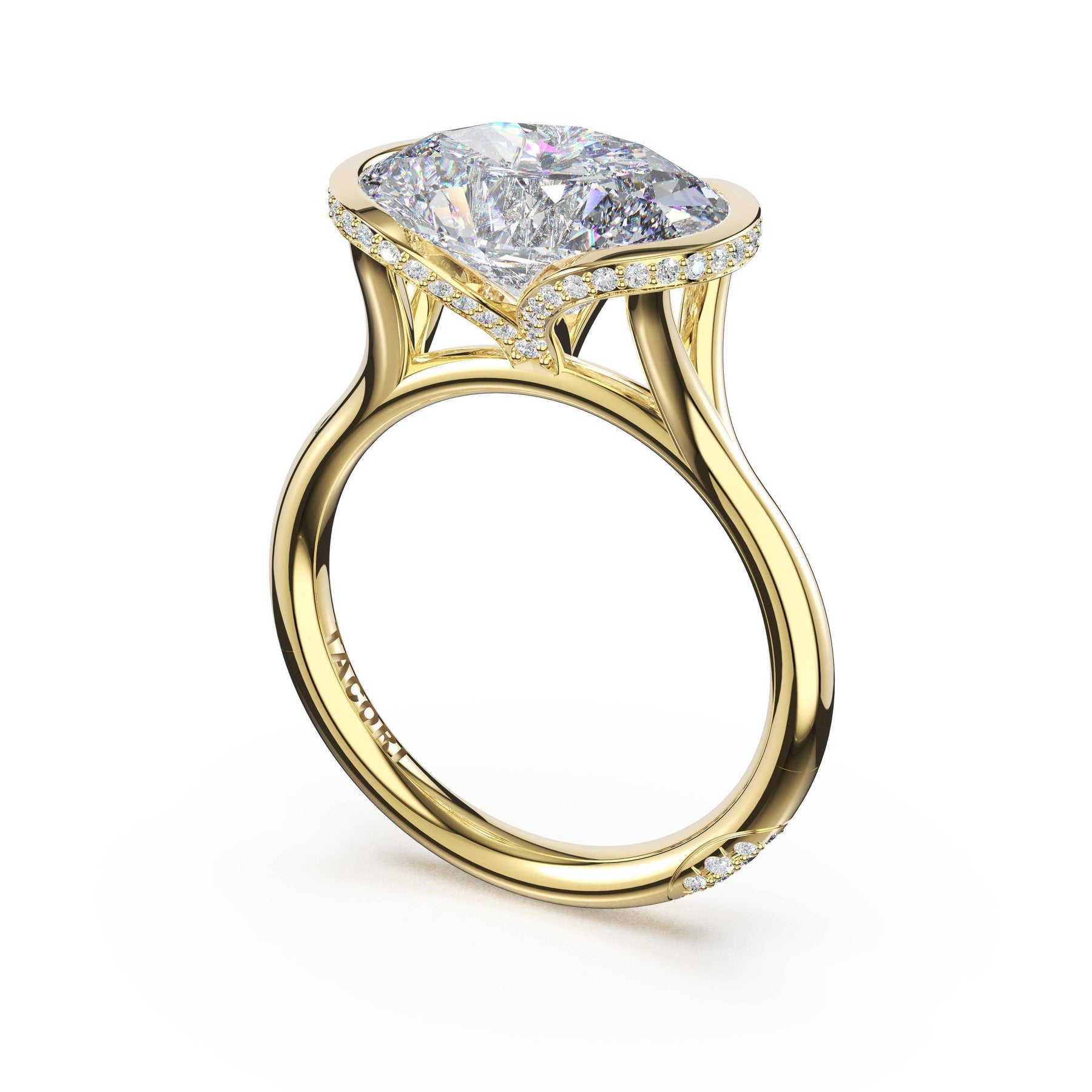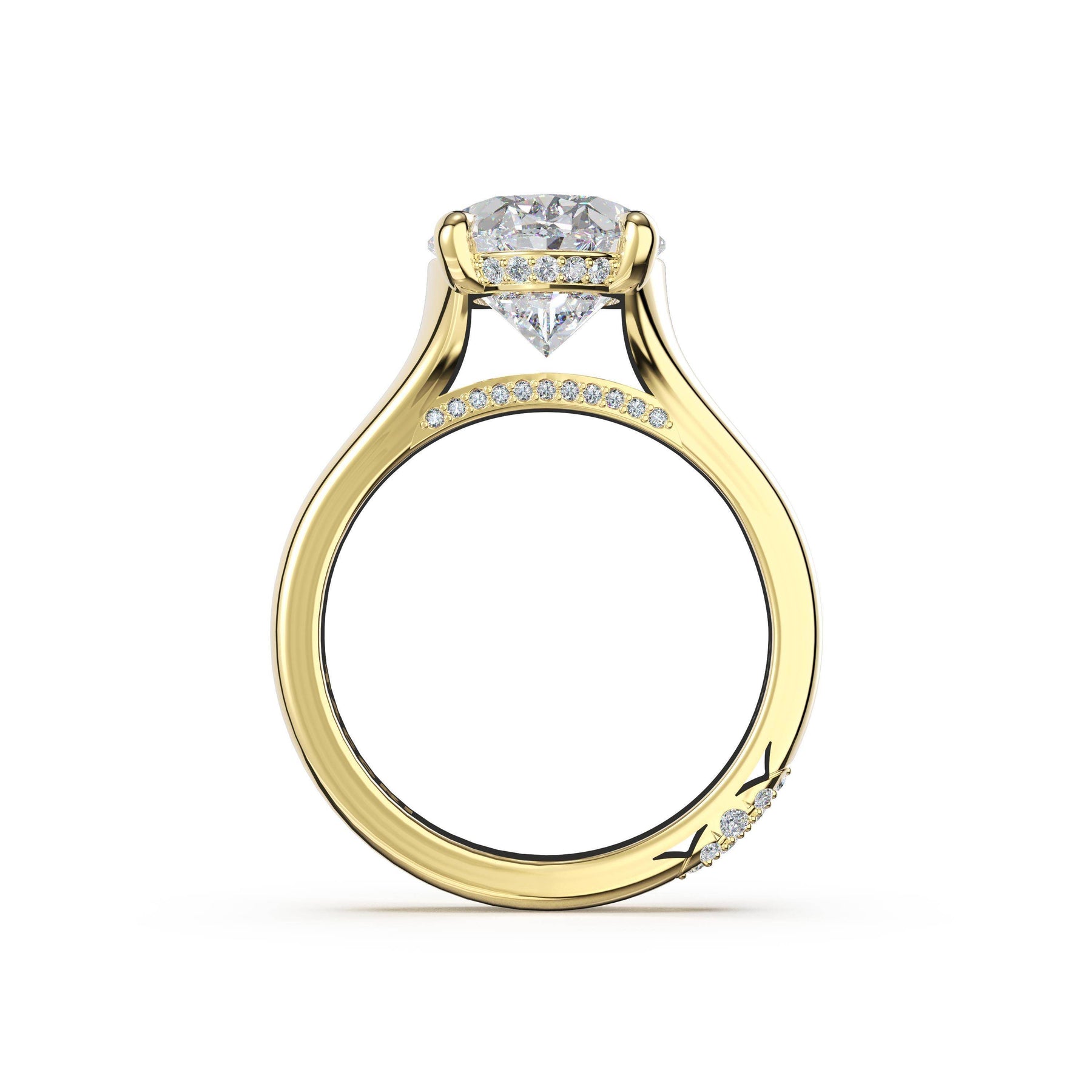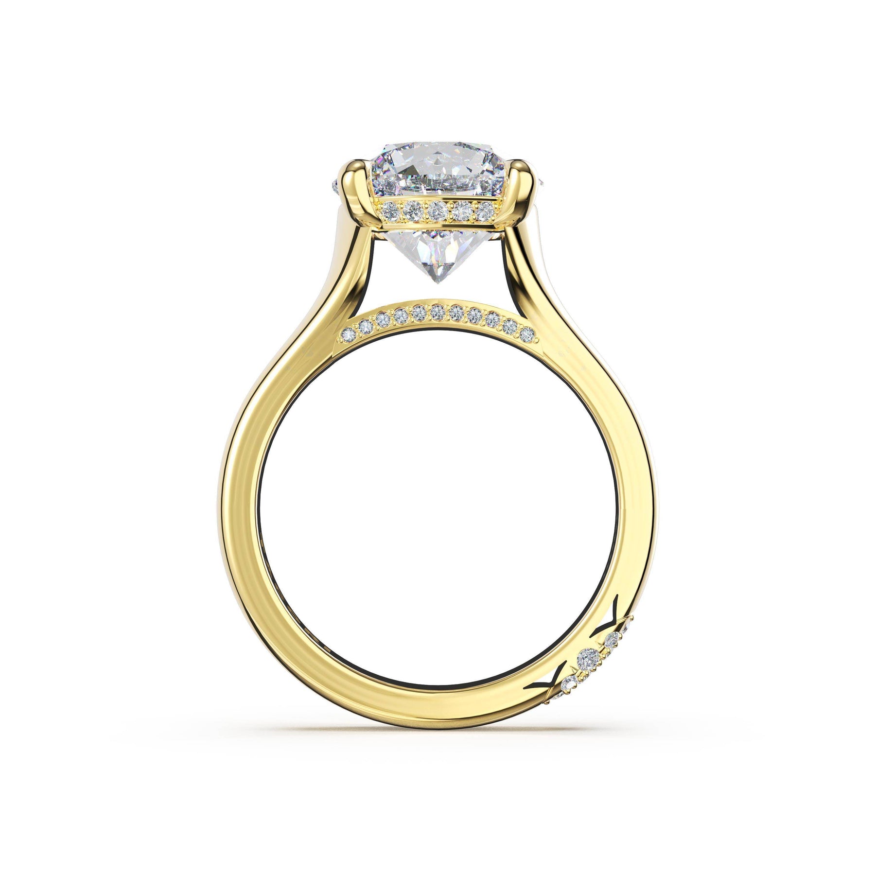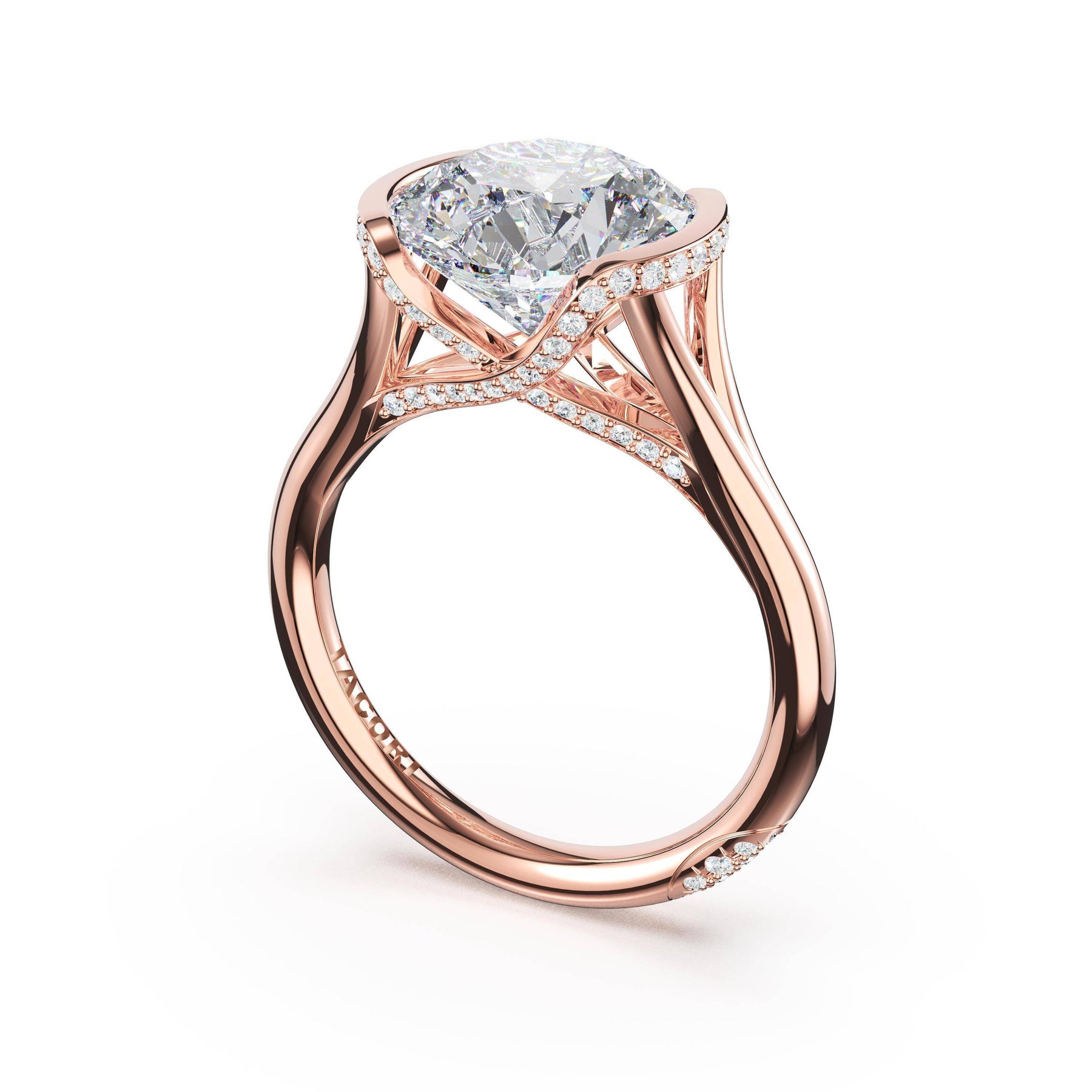 Round-brilliant diamonds add sparkle to the ceiling, while a Signature Crescent marks the resting point. The round-brilliant solitaire sits on a Cathedral foundation, decorated with a hidden bloom of diamonds for added brilliance.