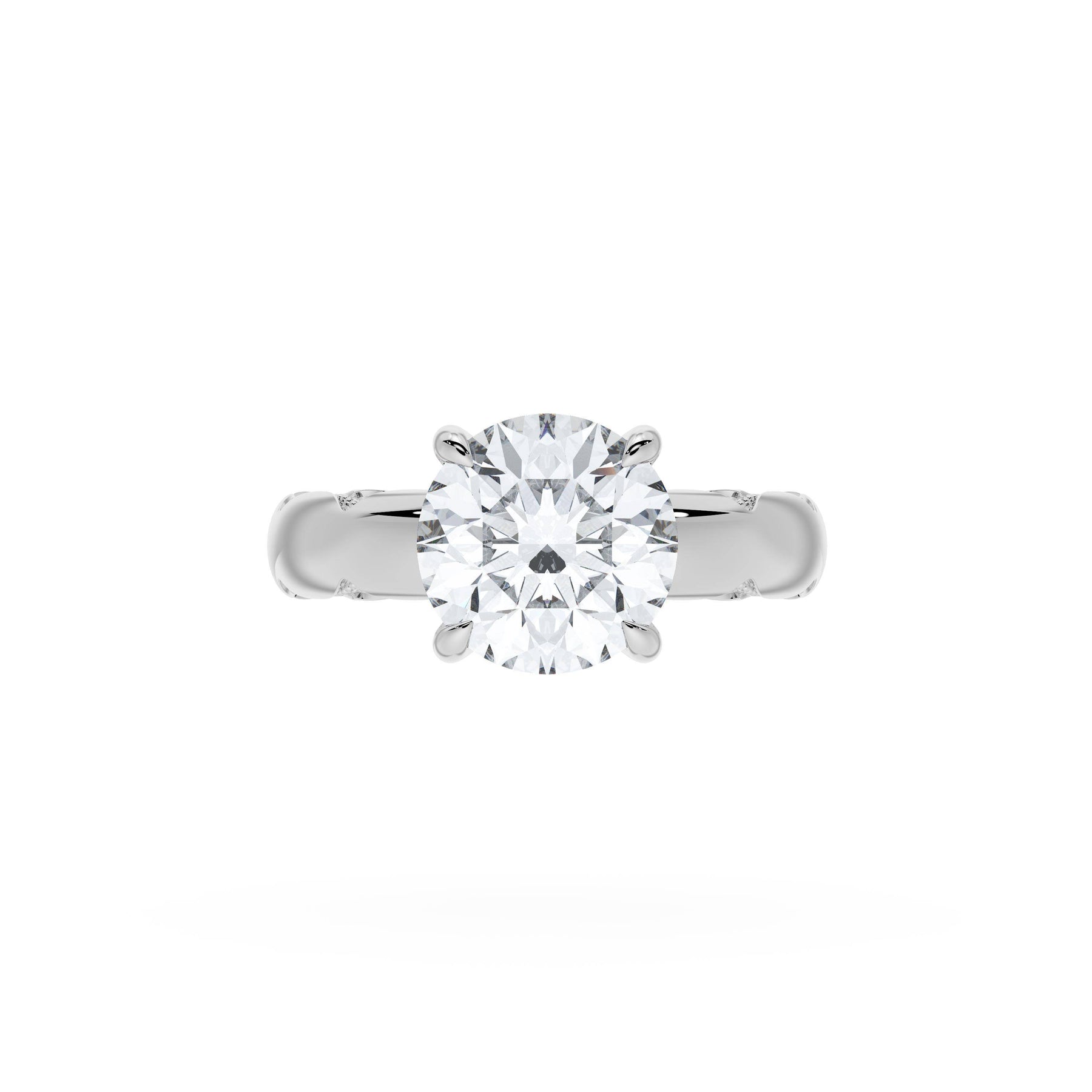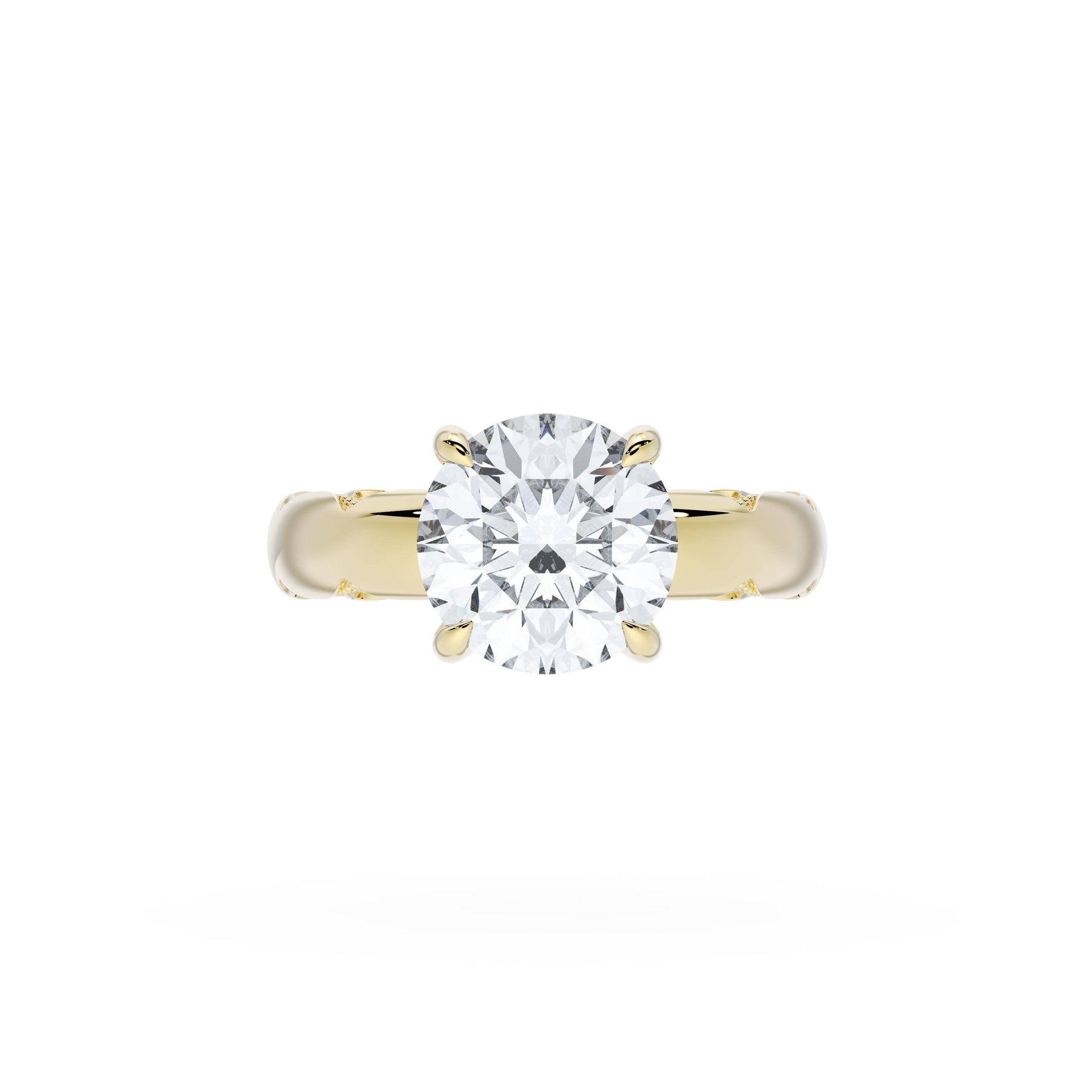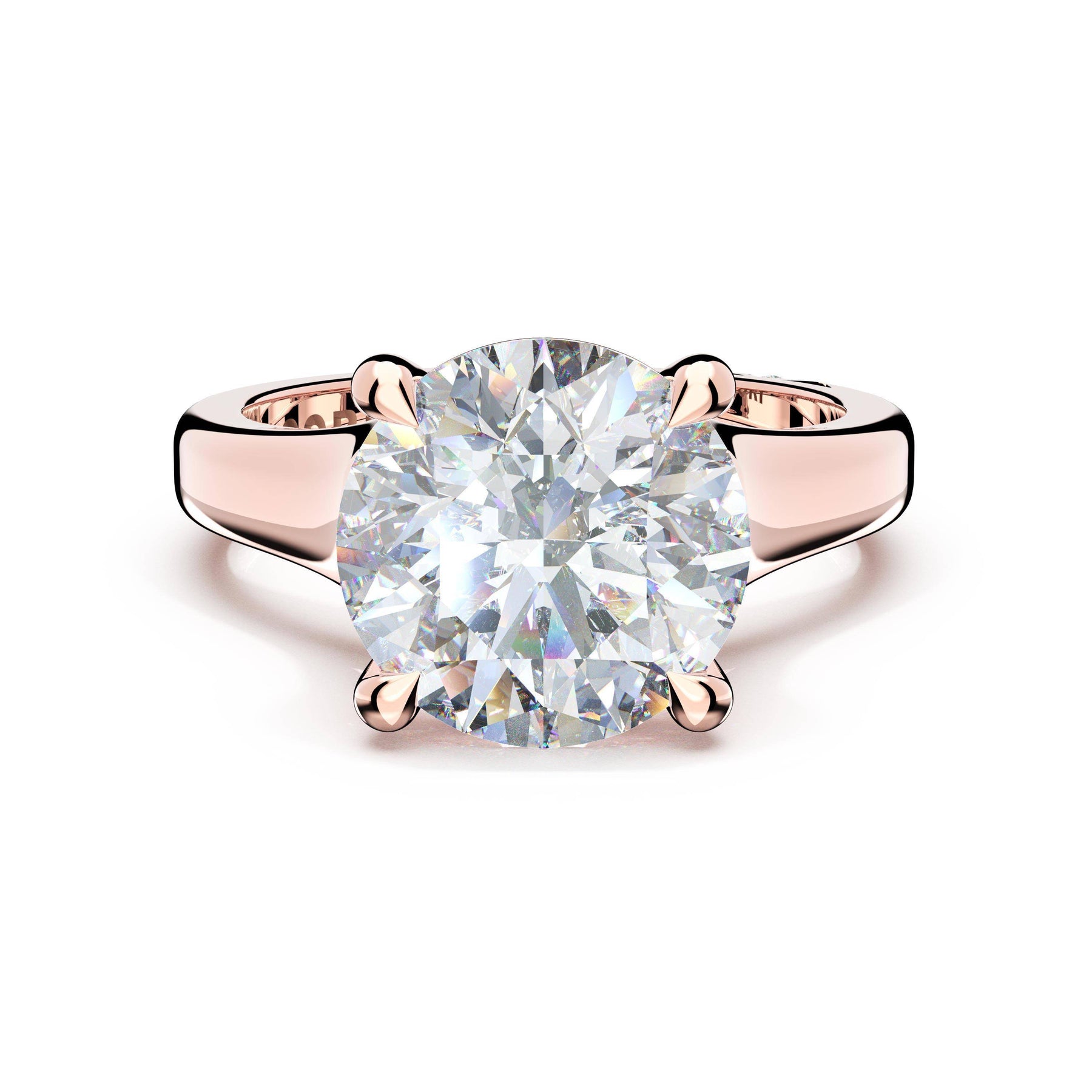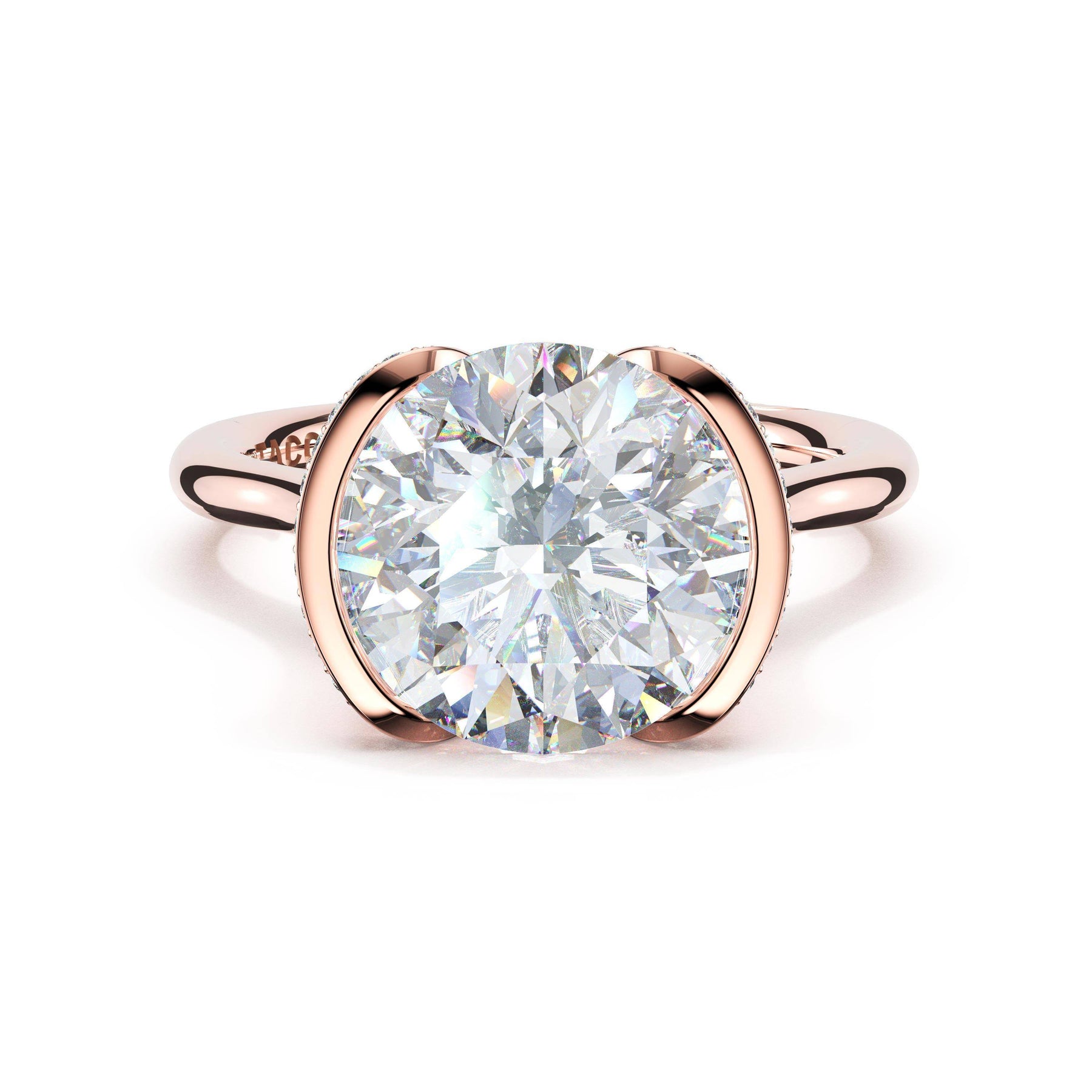 Round-brilliant diamonds add sparkle to the ceiling, while a Signature Crescent marks the resting point. The round-brilliant solitaire sits on a Cathedral foundation, decorated with a hidden bloom of diamonds for added brilliance.