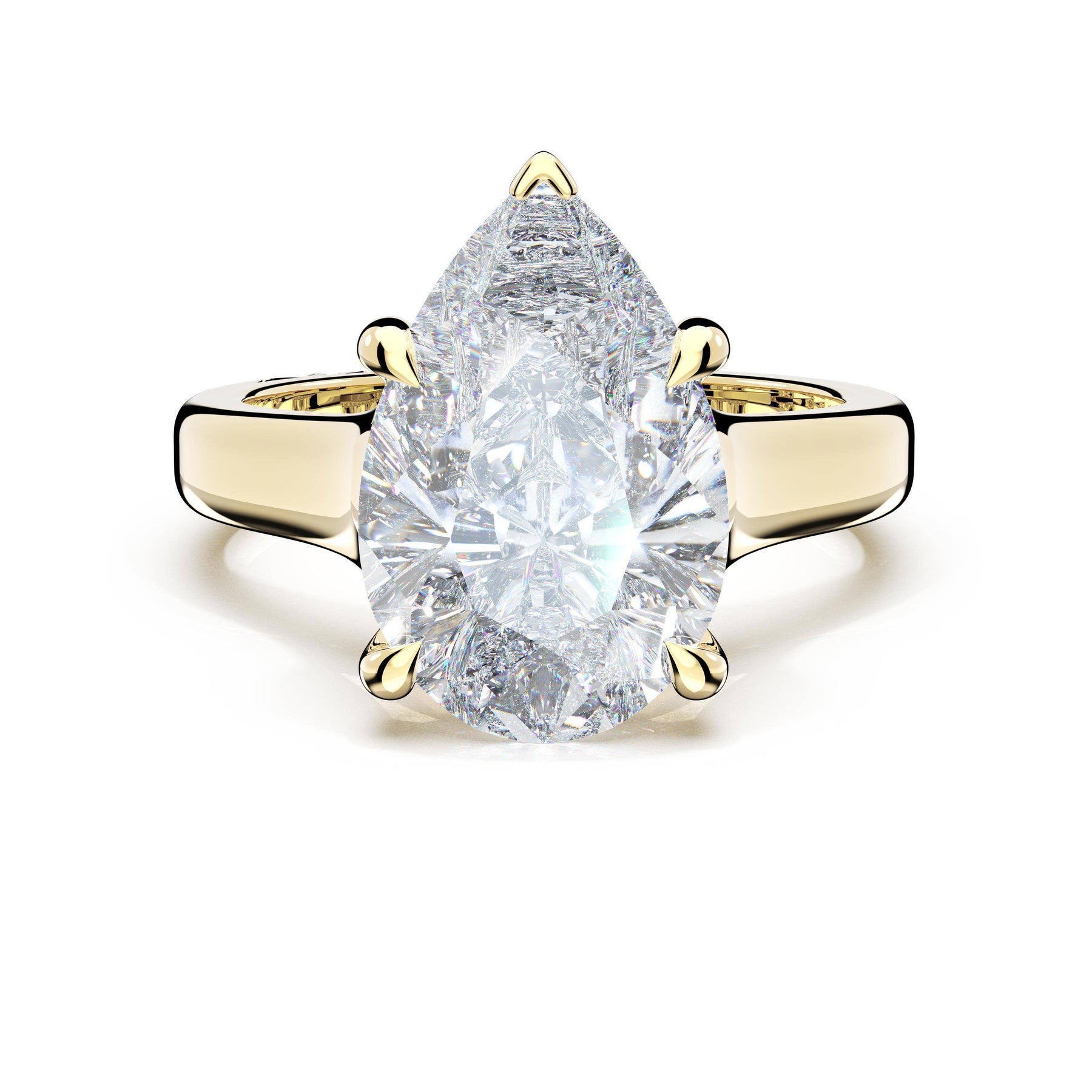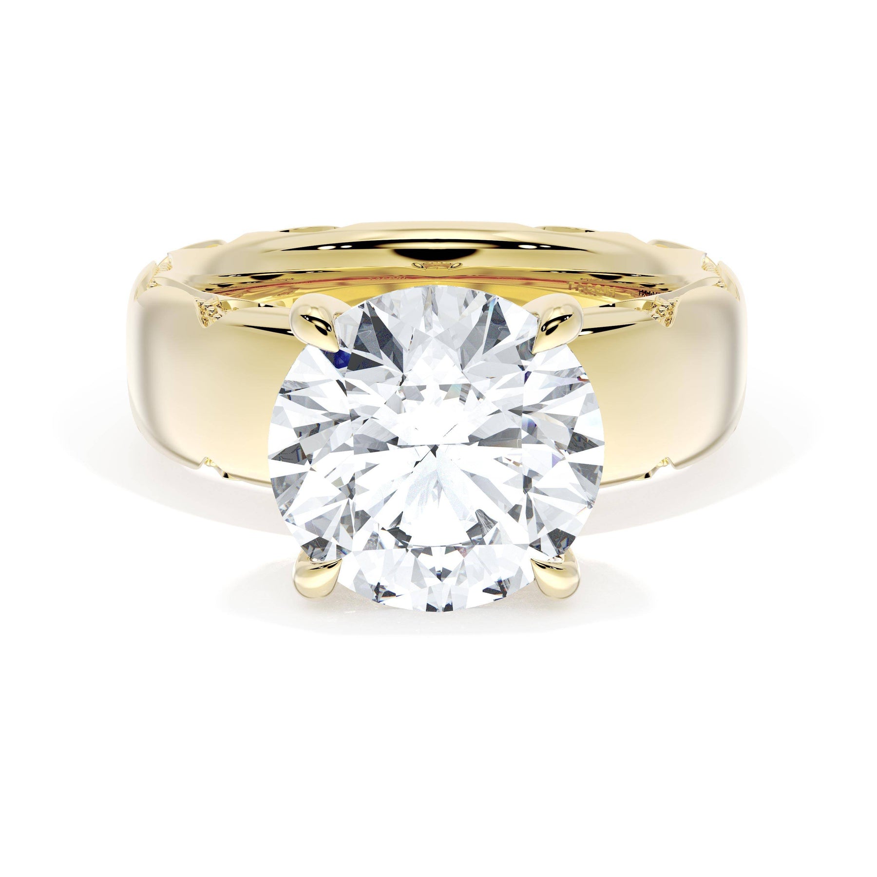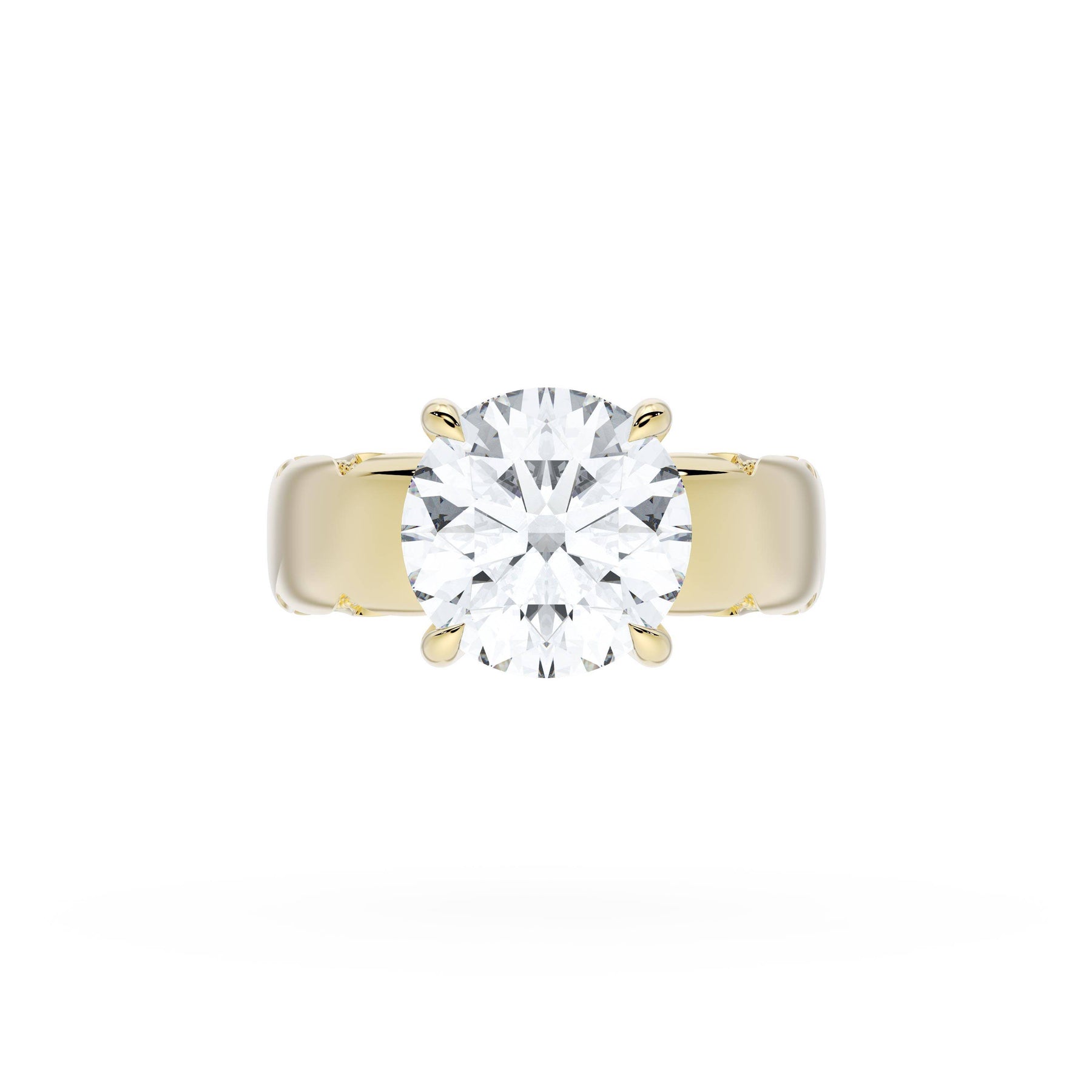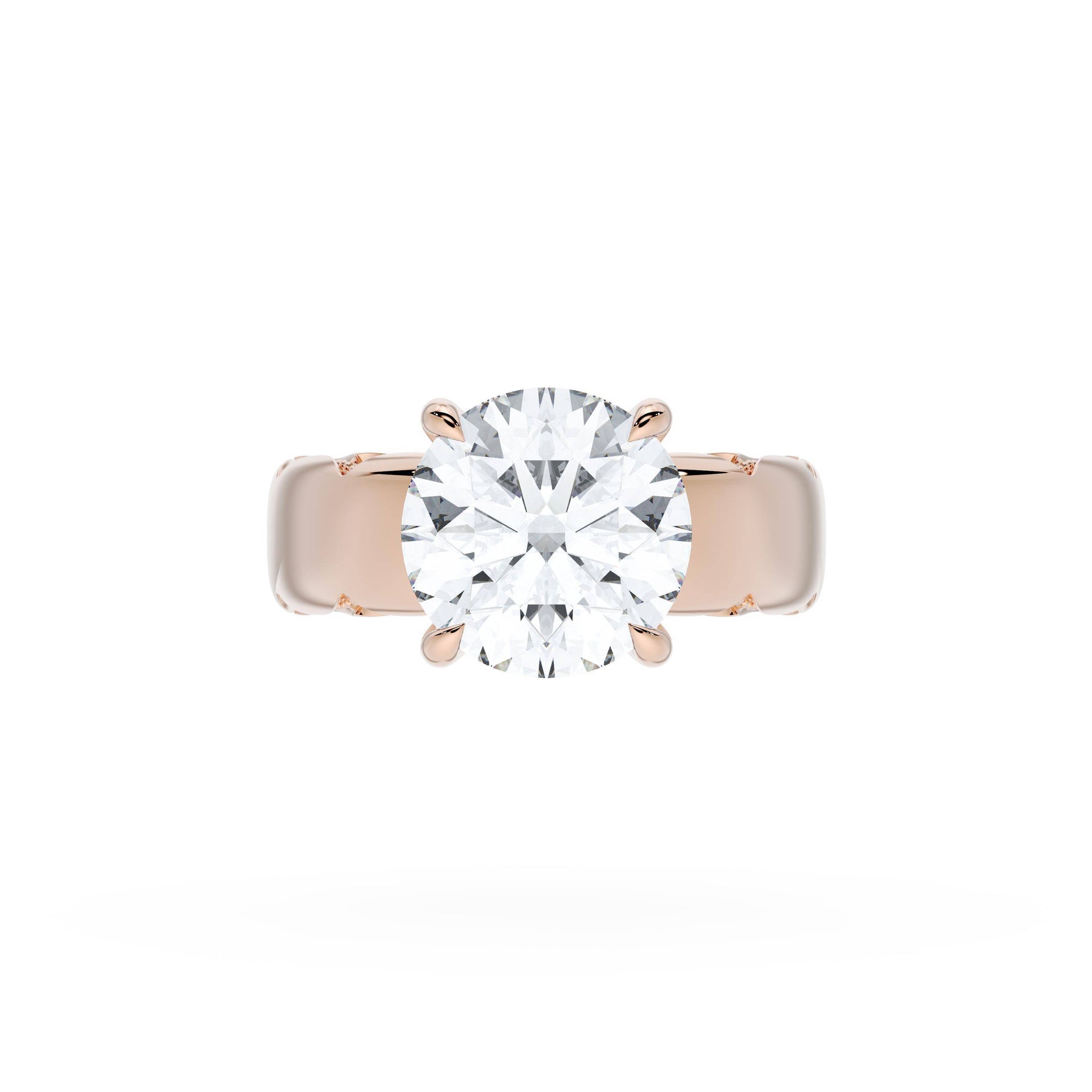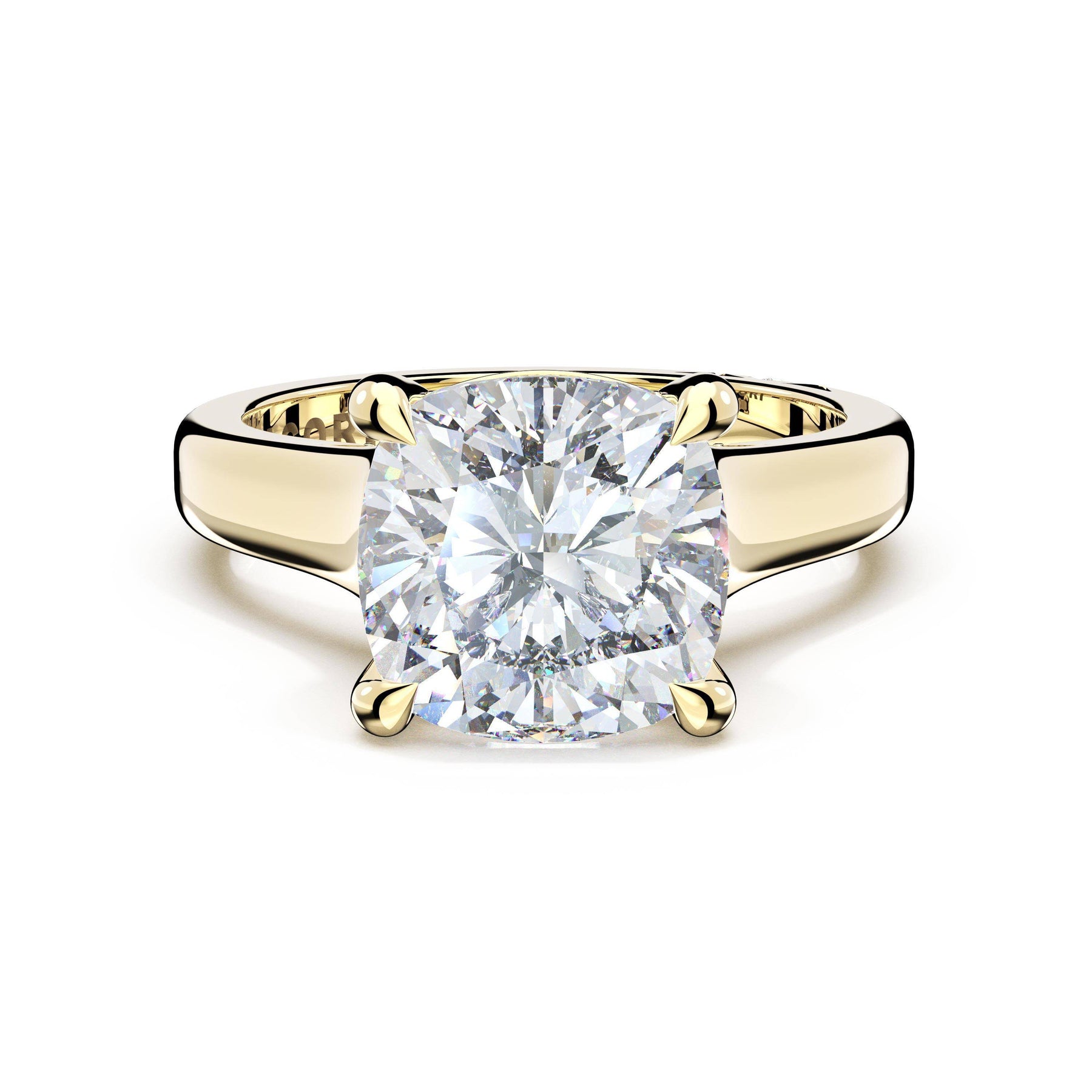 Round-brilliant diamonds add sparkle to the ceiling, while a Signature Crescent marks the resting point. The round-brilliant solitaire sits on a Cathedral foundation, decorated with a hidden bloom of diamonds for added brilliance.