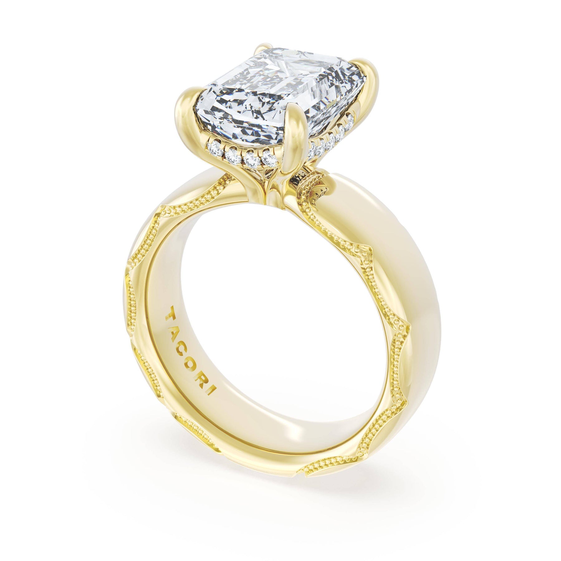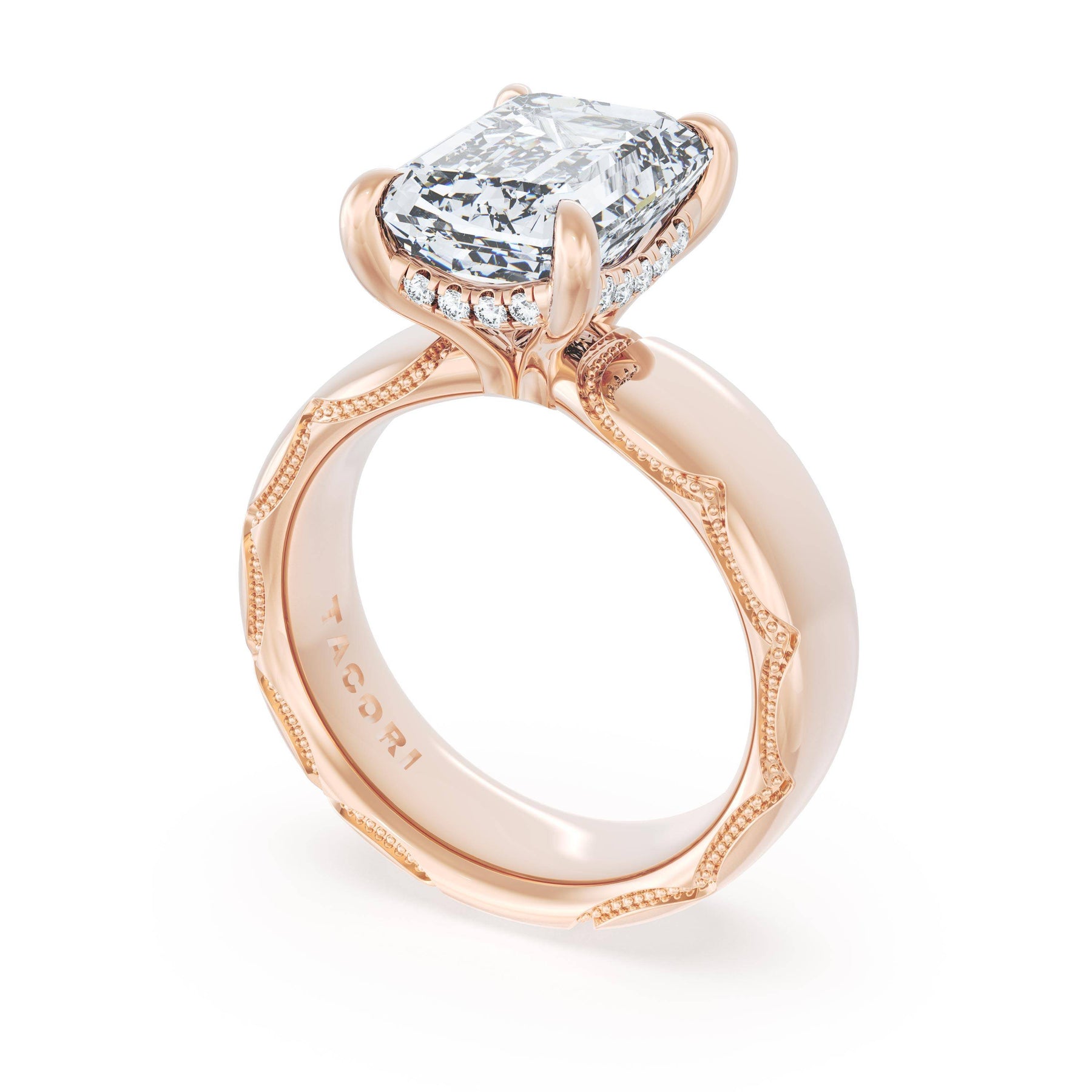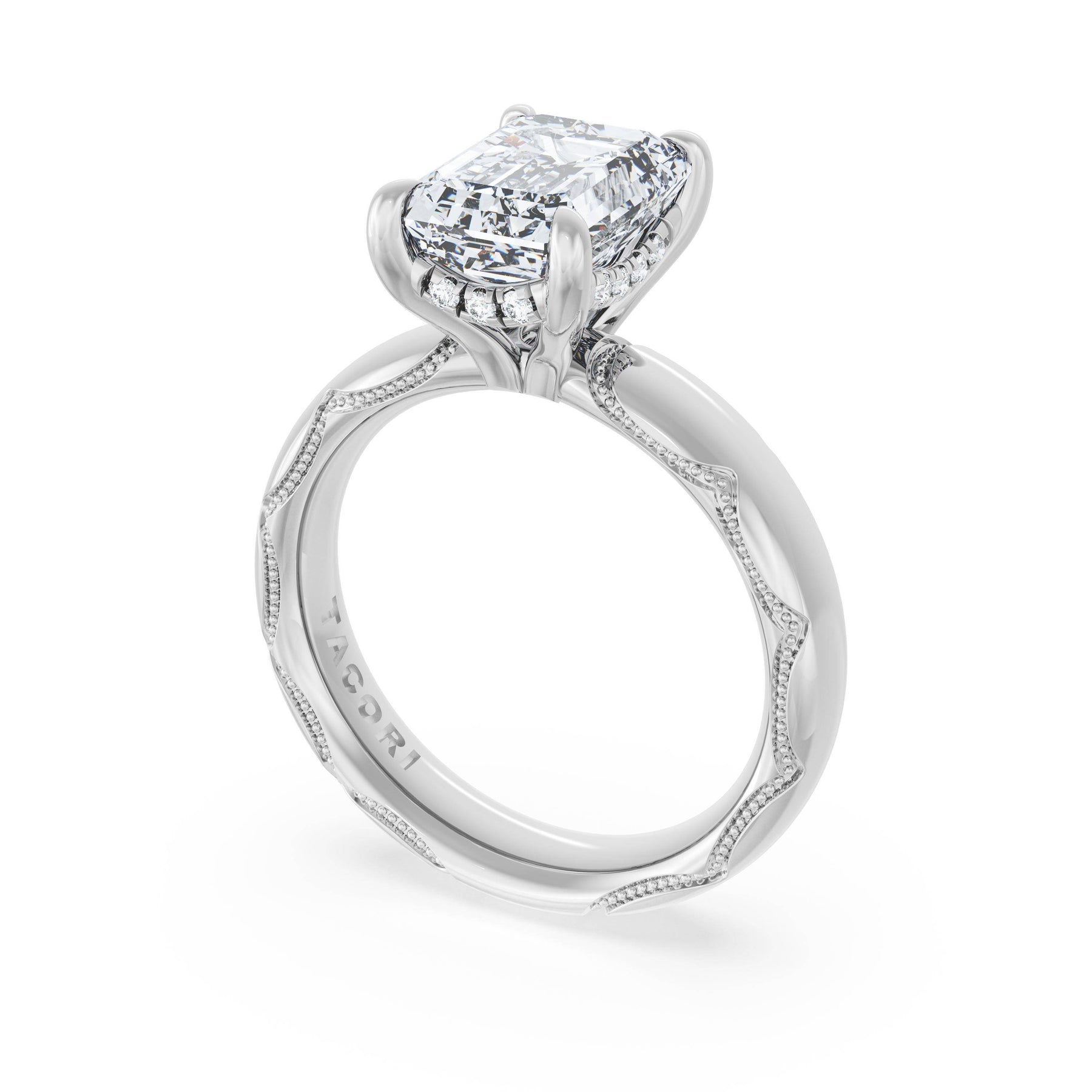 The emerald solitaire sits on a Cathedral foundation with a hidden bloom, which adds the TACORI touch. A high-polish band of premium metals is studded with a diamond-studded Signature Crescent at the foundation