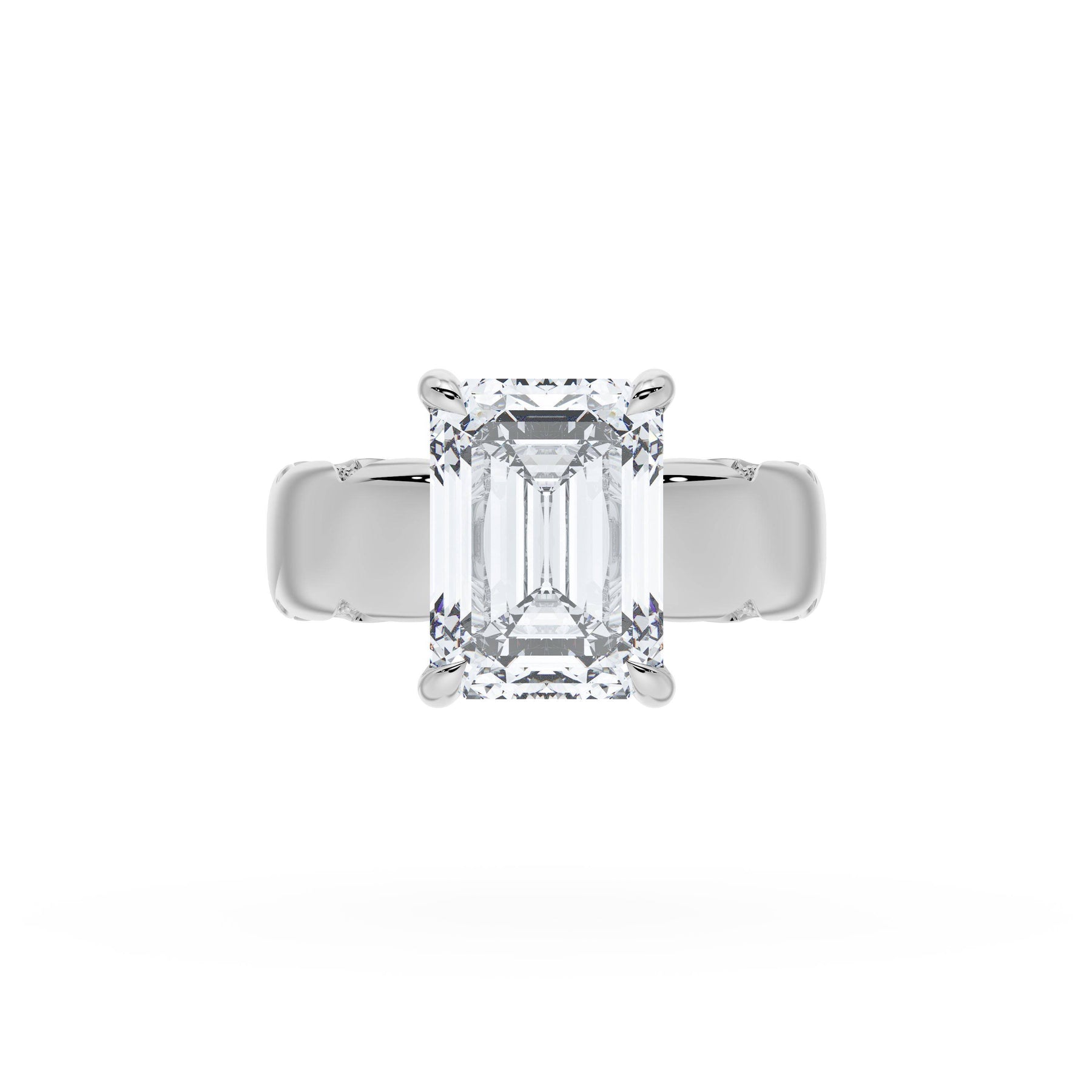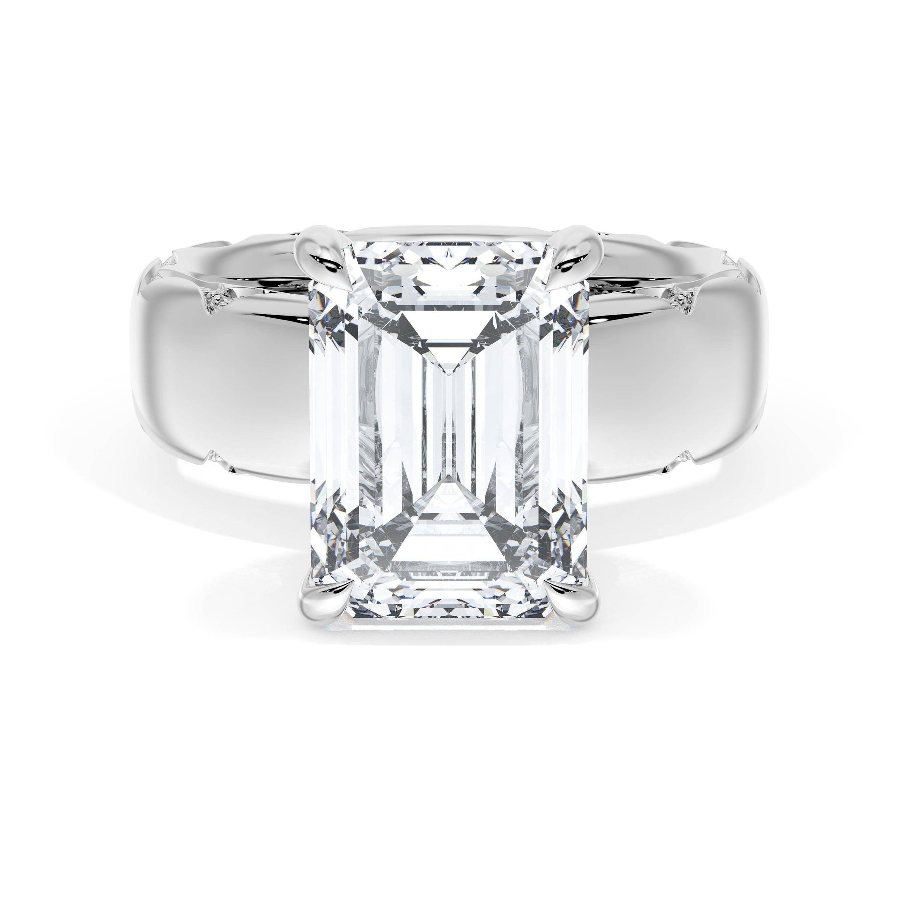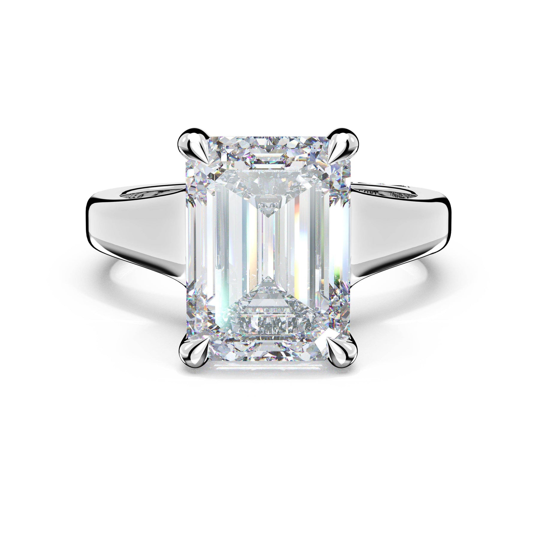 The emerald solitaire sits on a Cathedral foundation with a hidden bloom, which adds the TACORI touch. A high-polish band of premium metals is studded with a diamond-studded Signature Crescent at the foundation