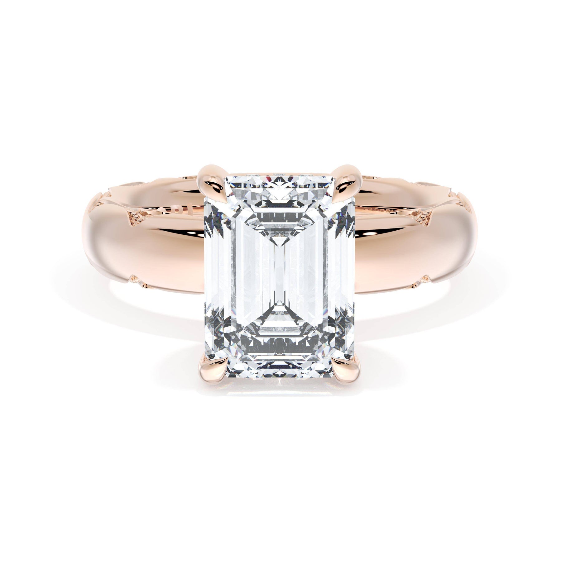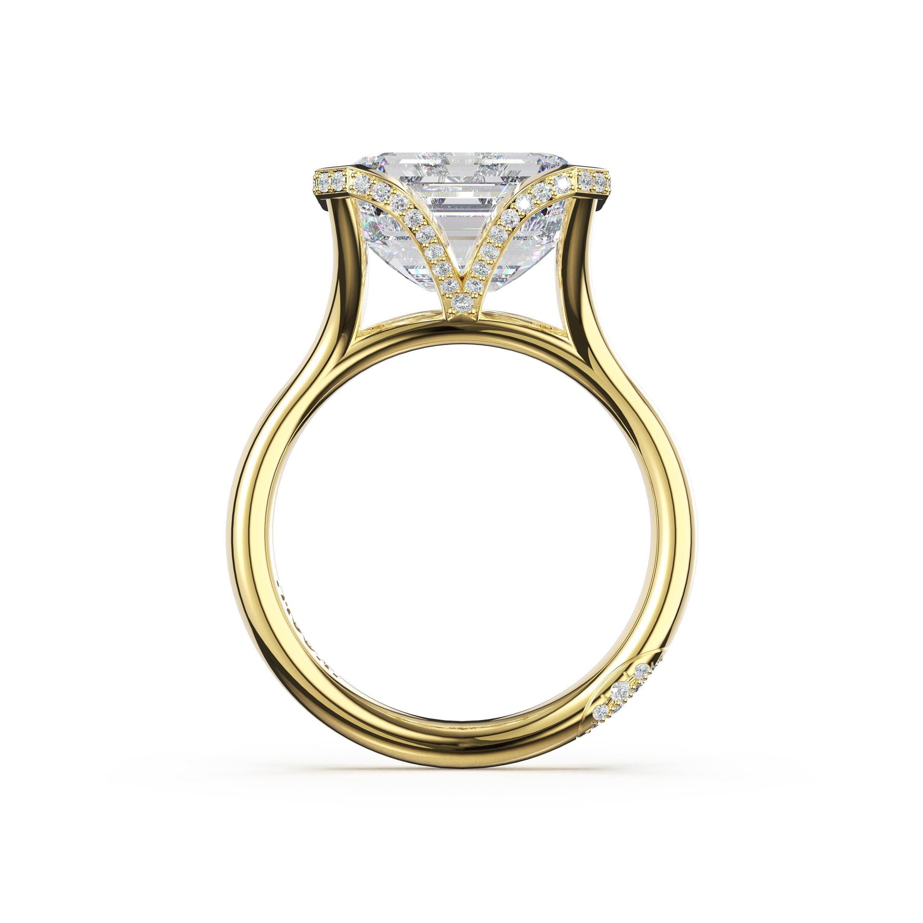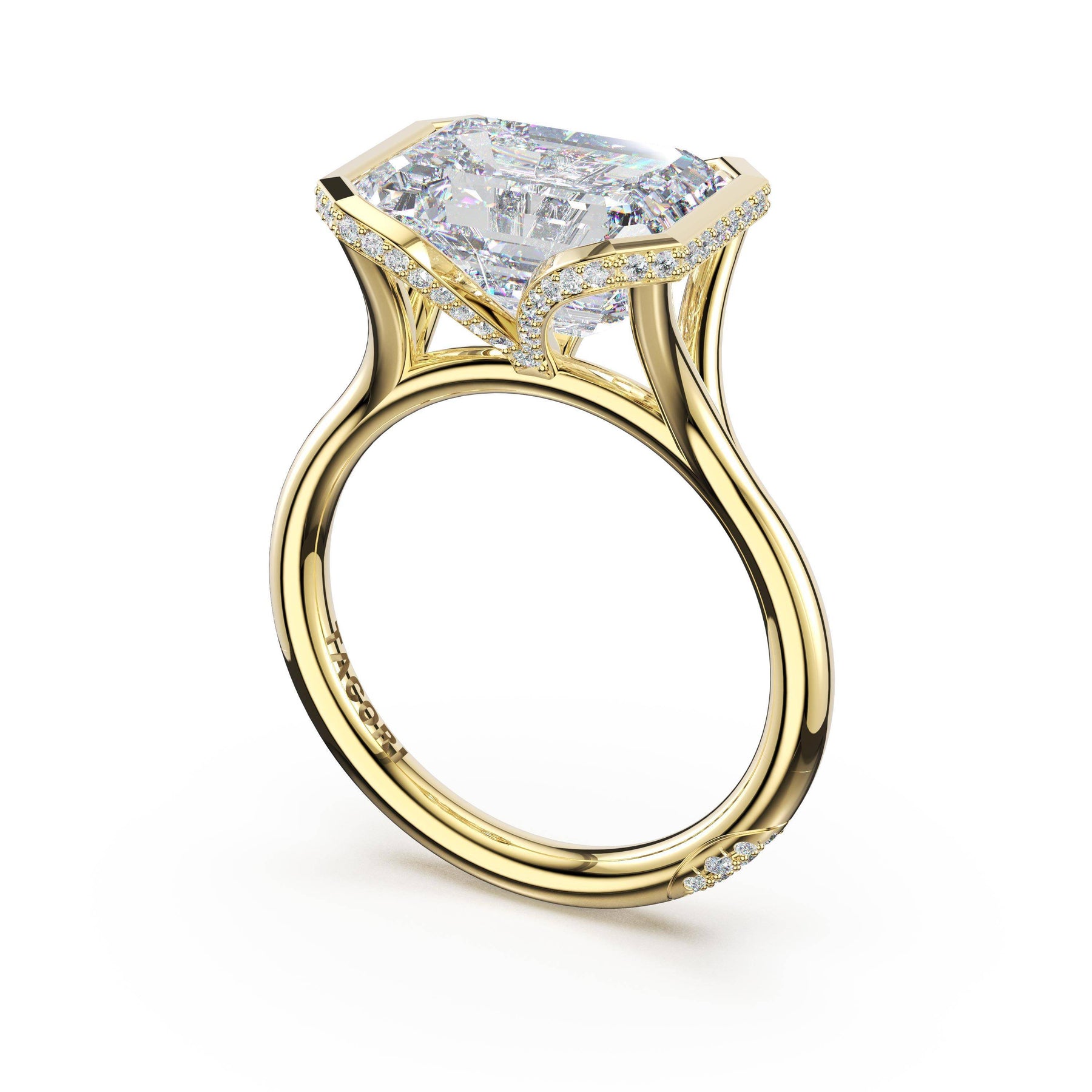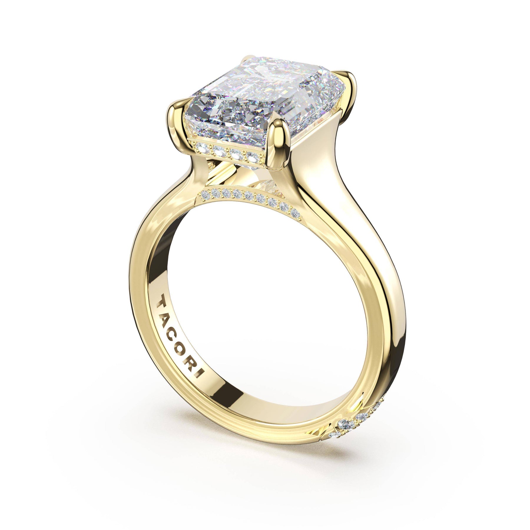 Round-brilliant diamonds add sparkle to the ceiling, while a Signature Crescent marks the resting point. The emerald solitaire sits on a Cathedral foundation, decorated with a hidden bloom of diamonds for added brilliance.