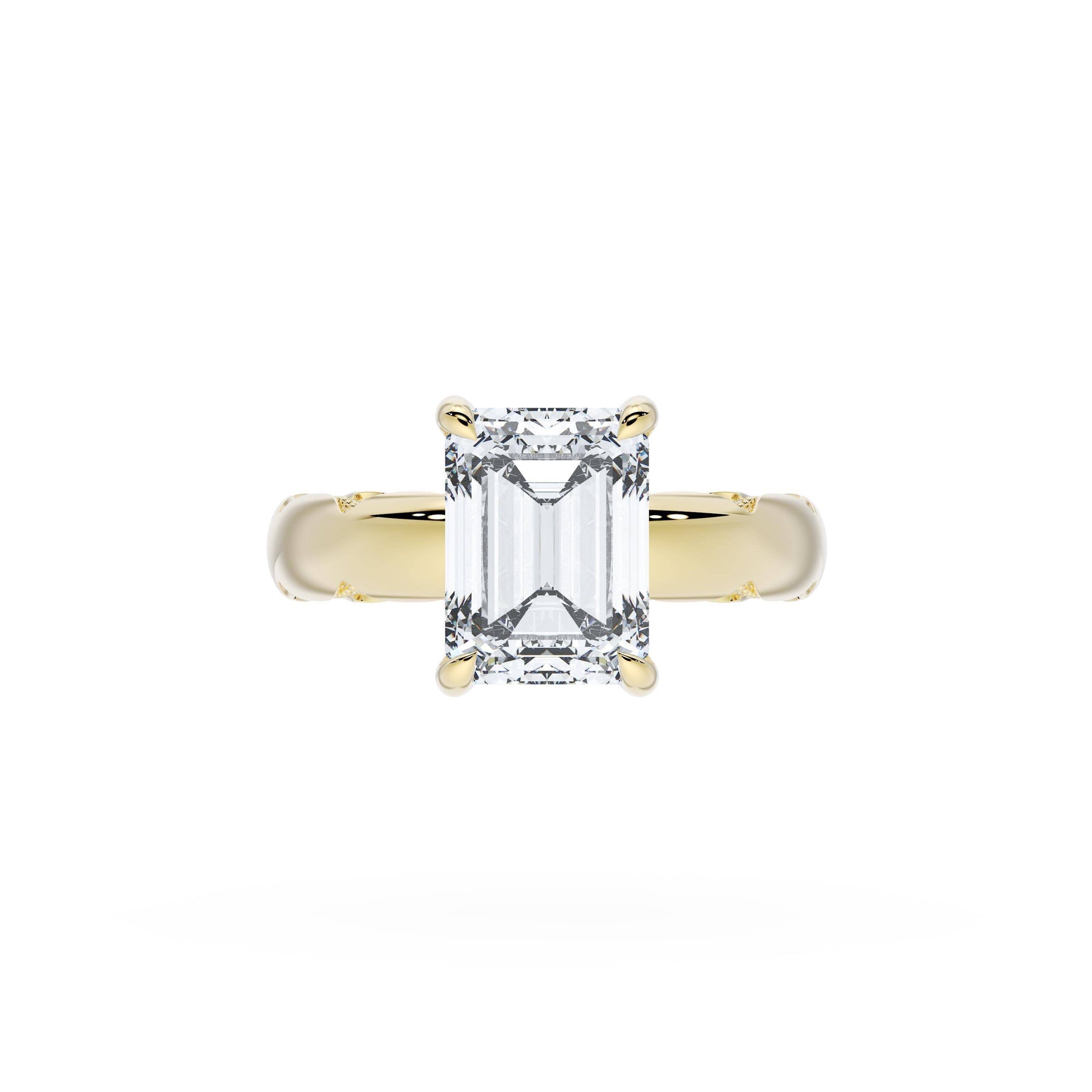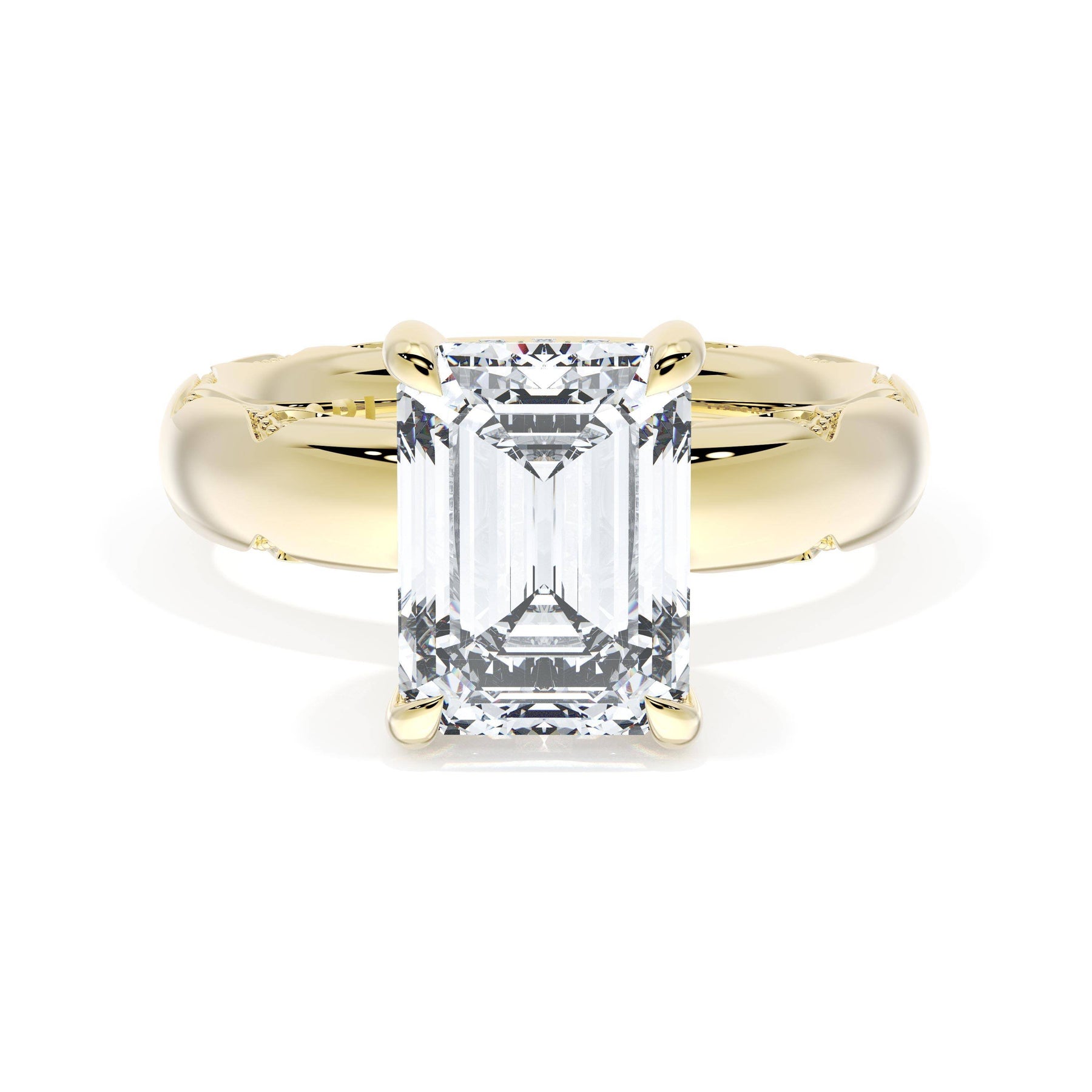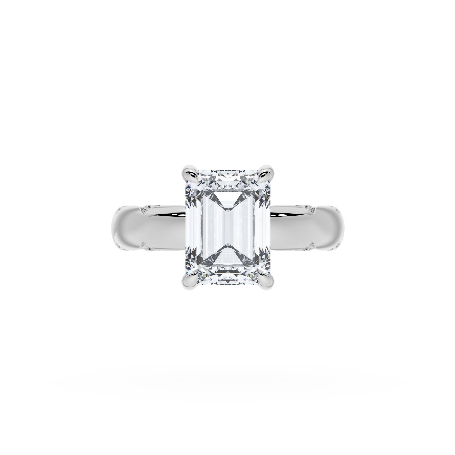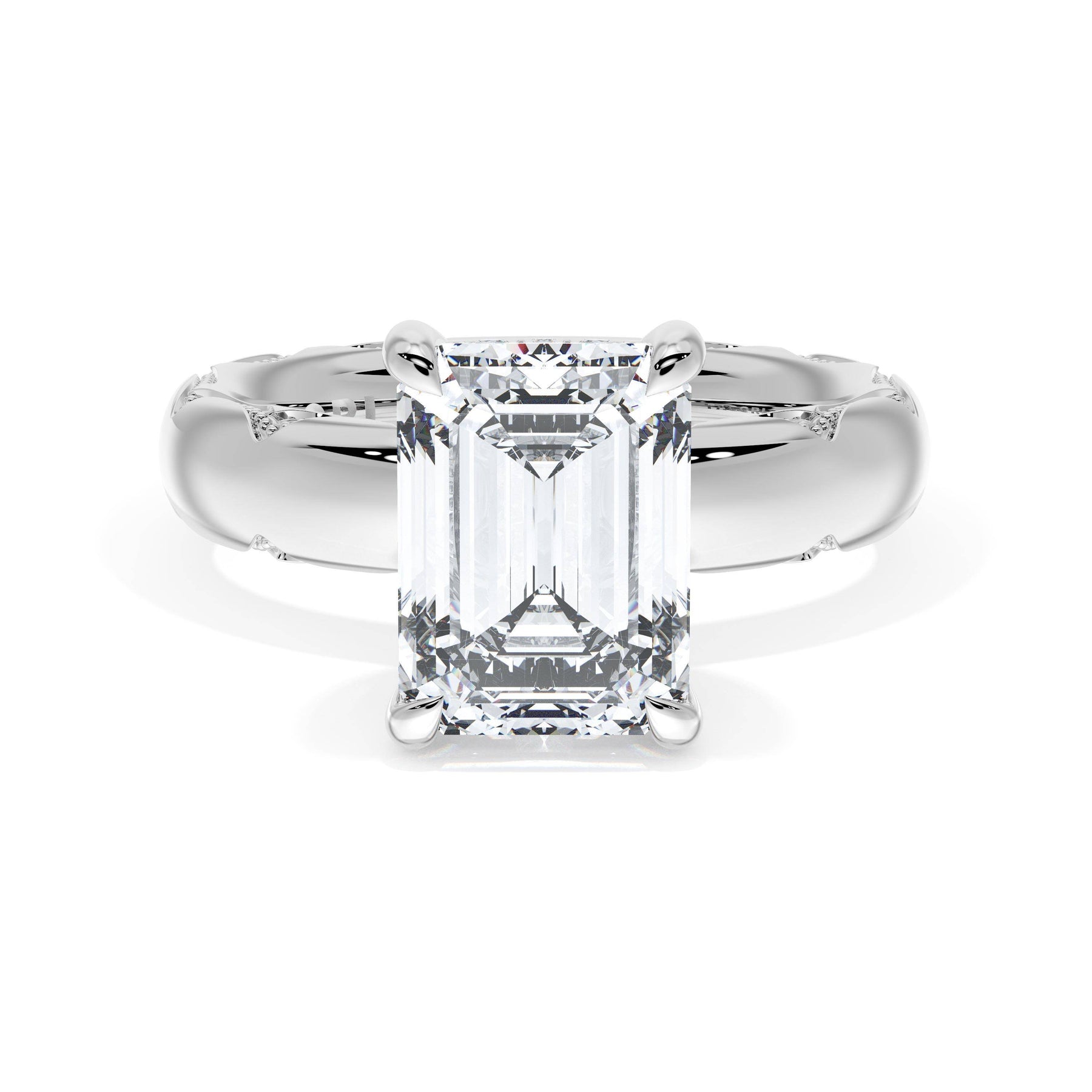 Round-brilliant diamonds add sparkle to the ceiling, while a Signature Crescent marks the resting point. The emerald solitaire sits on a Cathedral foundation, decorated with a hidden bloom of diamonds for added brilliance.