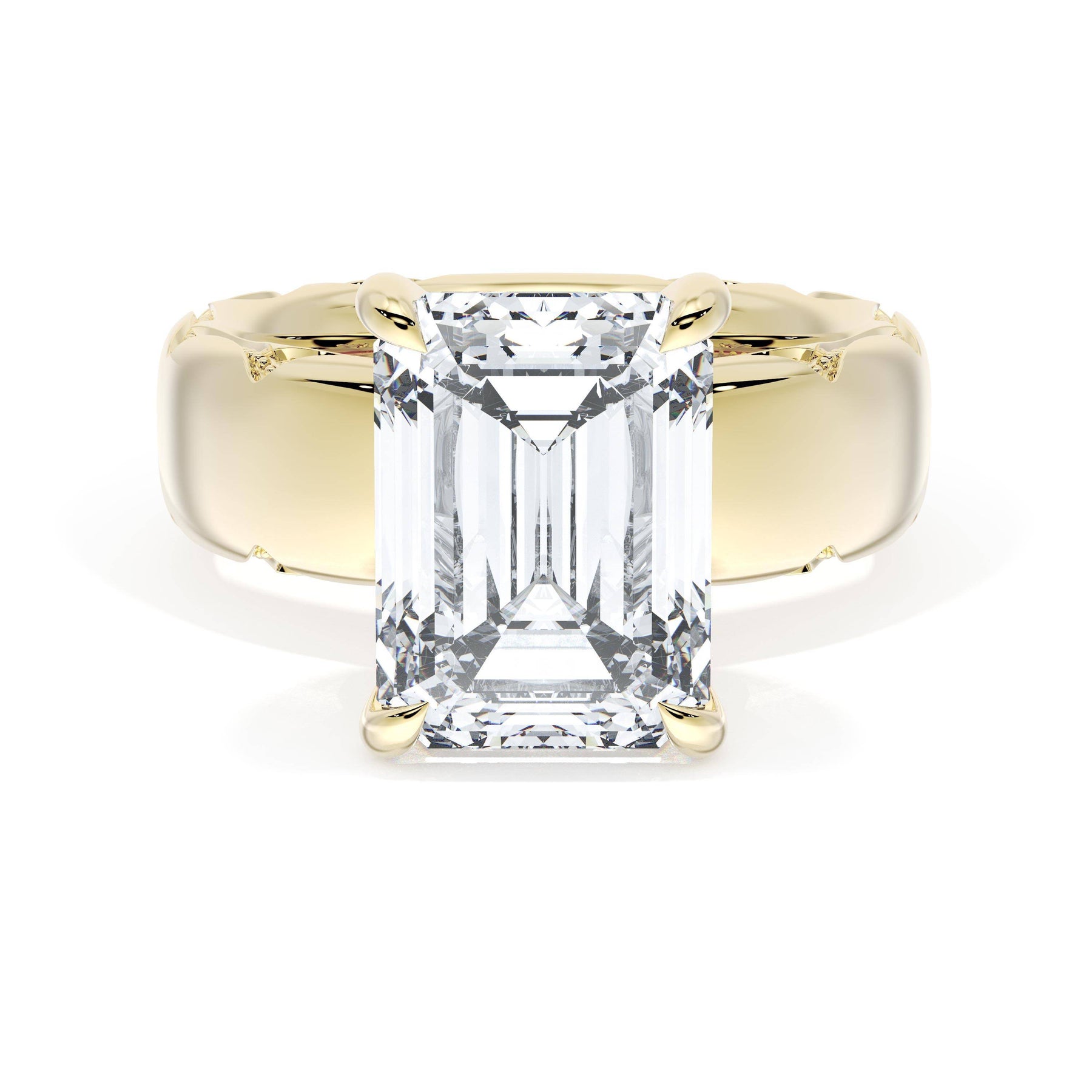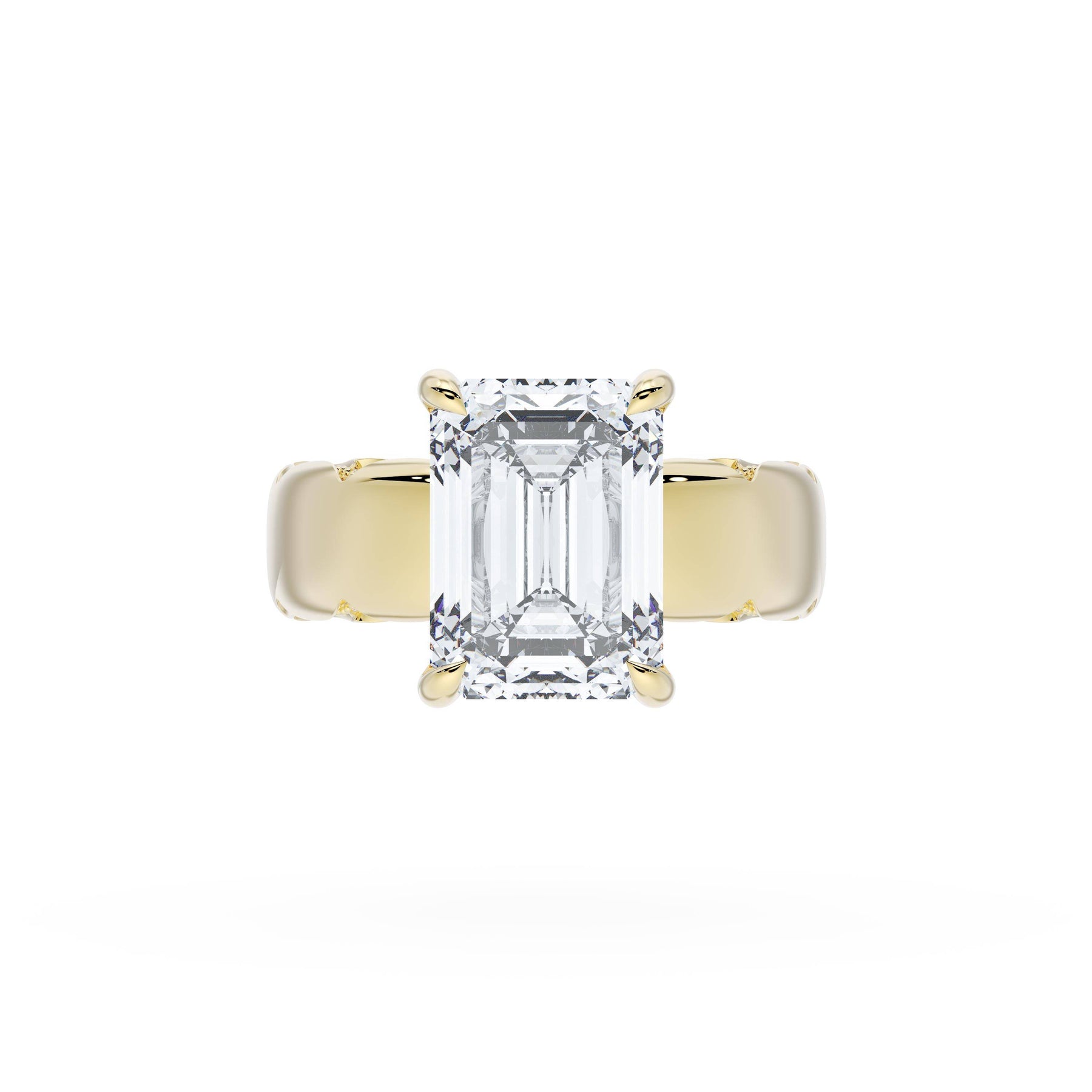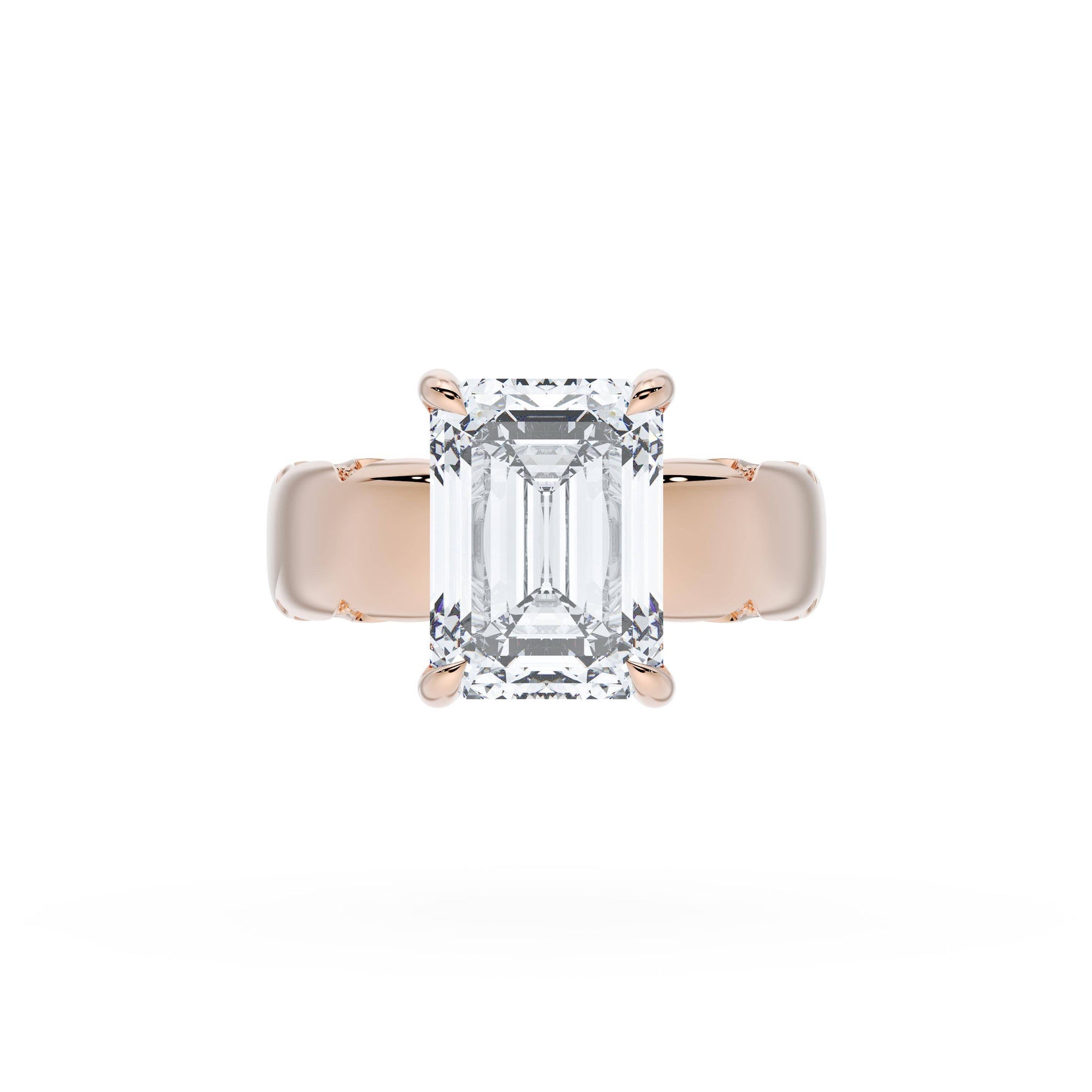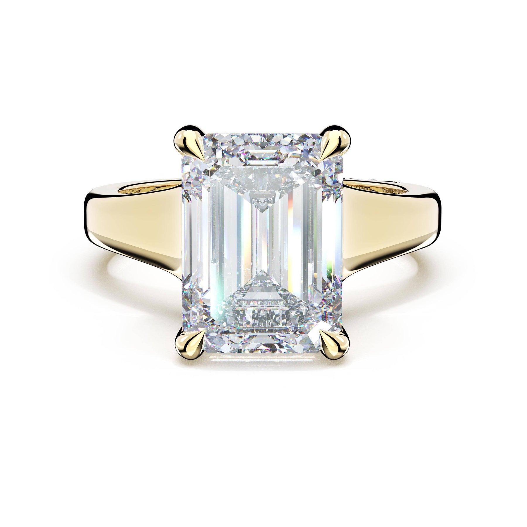 Round-brilliant diamonds add sparkle to the ceiling, while a Signature Crescent marks the resting point. The emerald solitaire sits on a Cathedral foundation, decorated with a hidden bloom of diamonds for added brilliance.