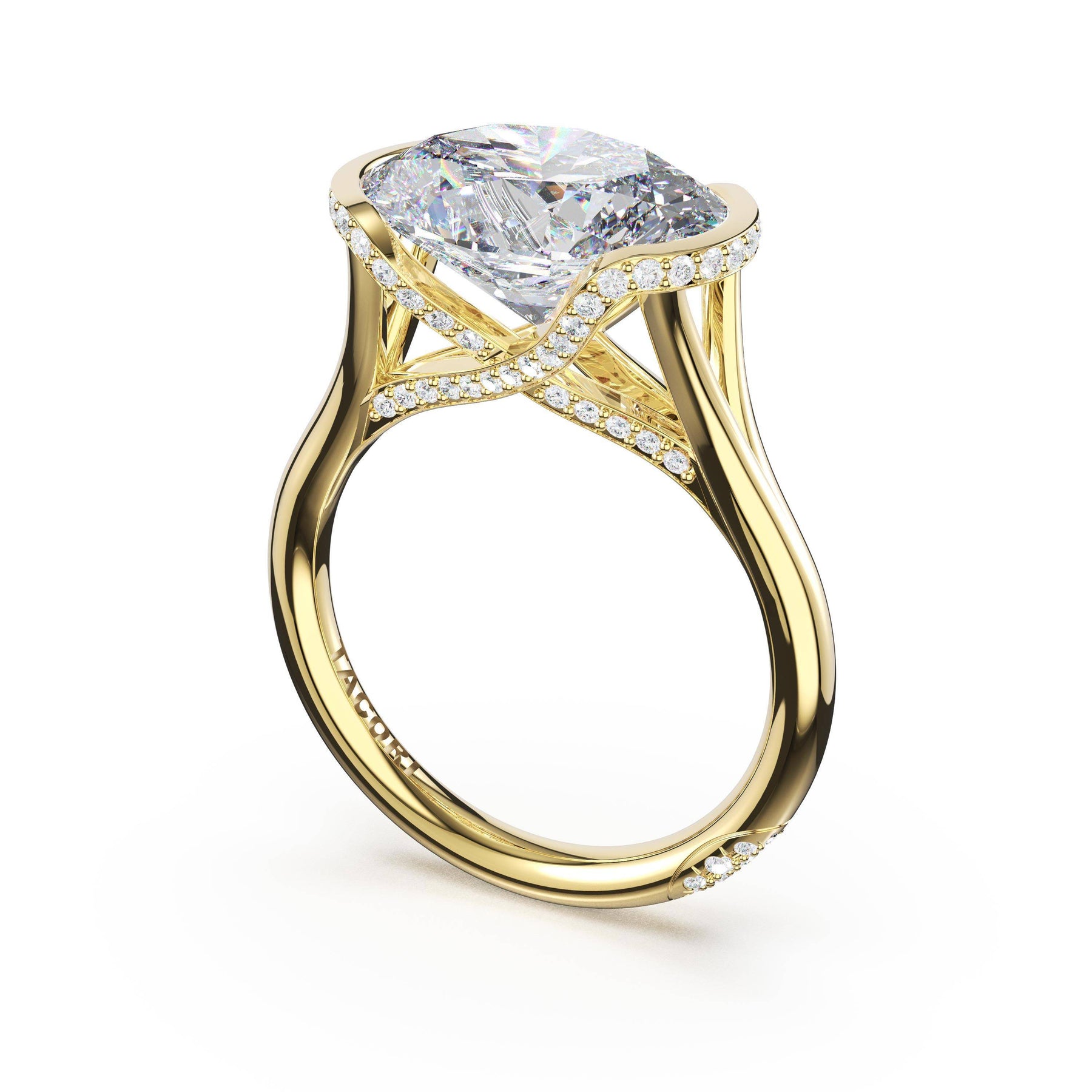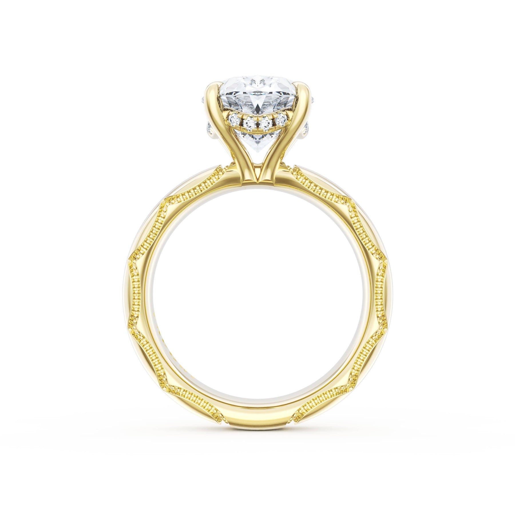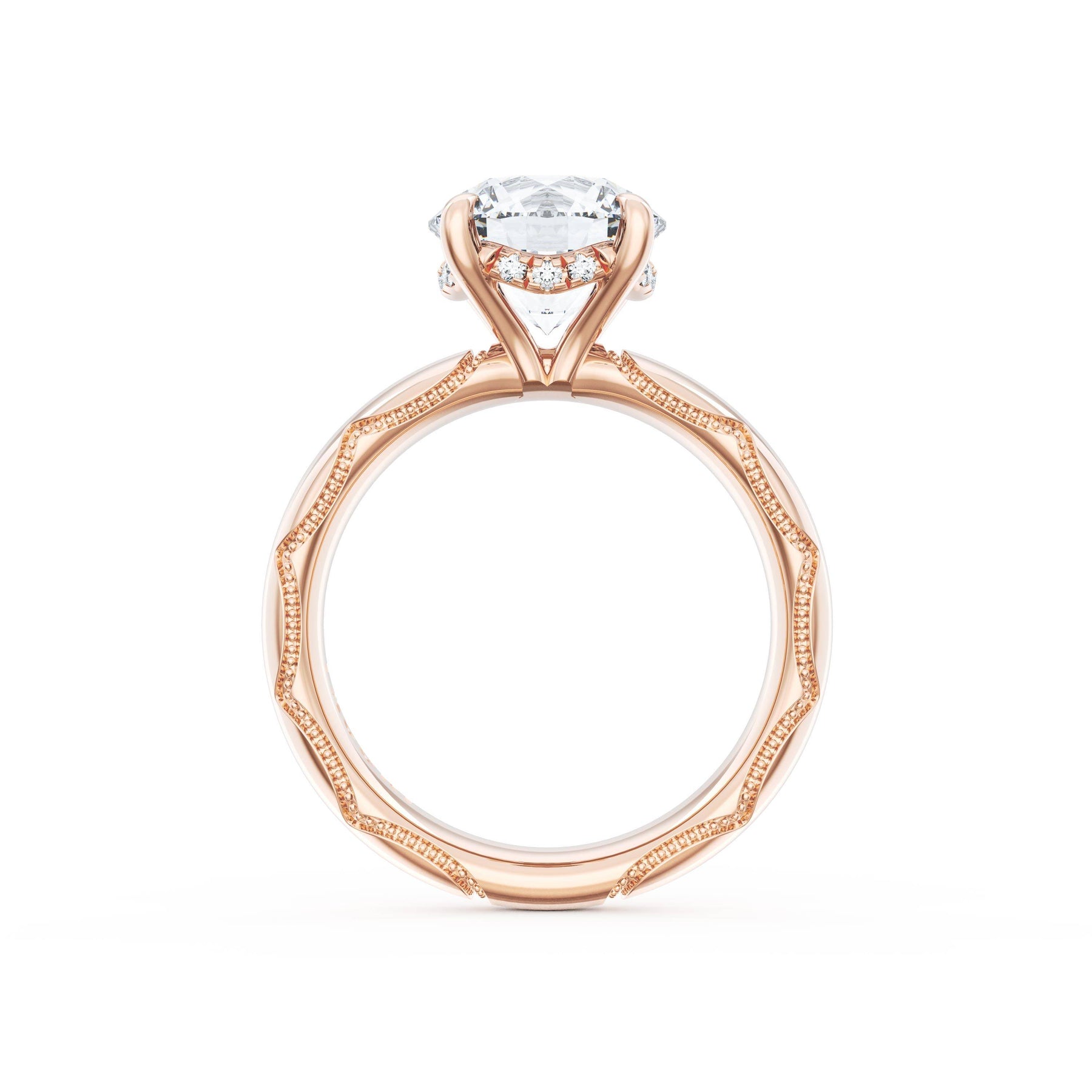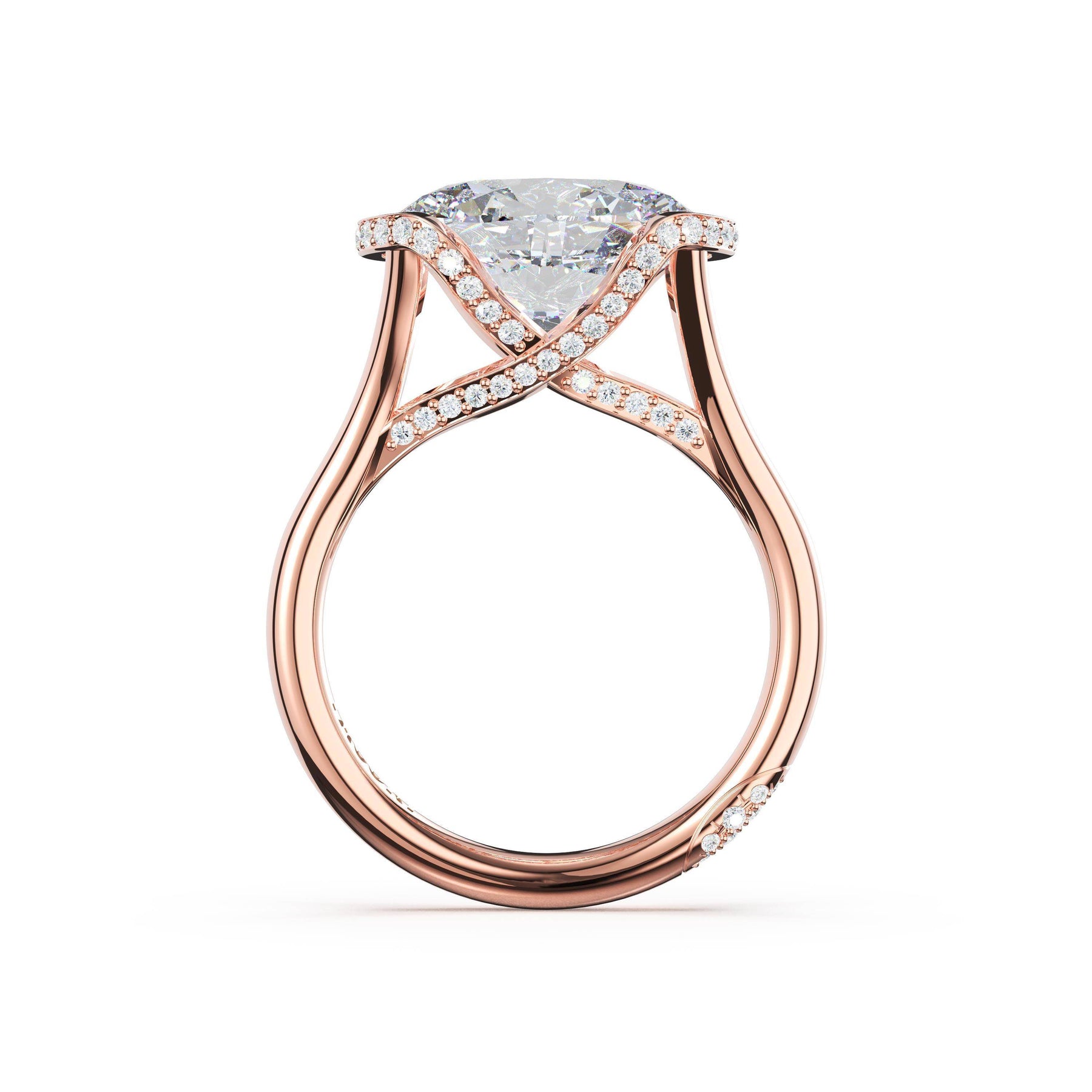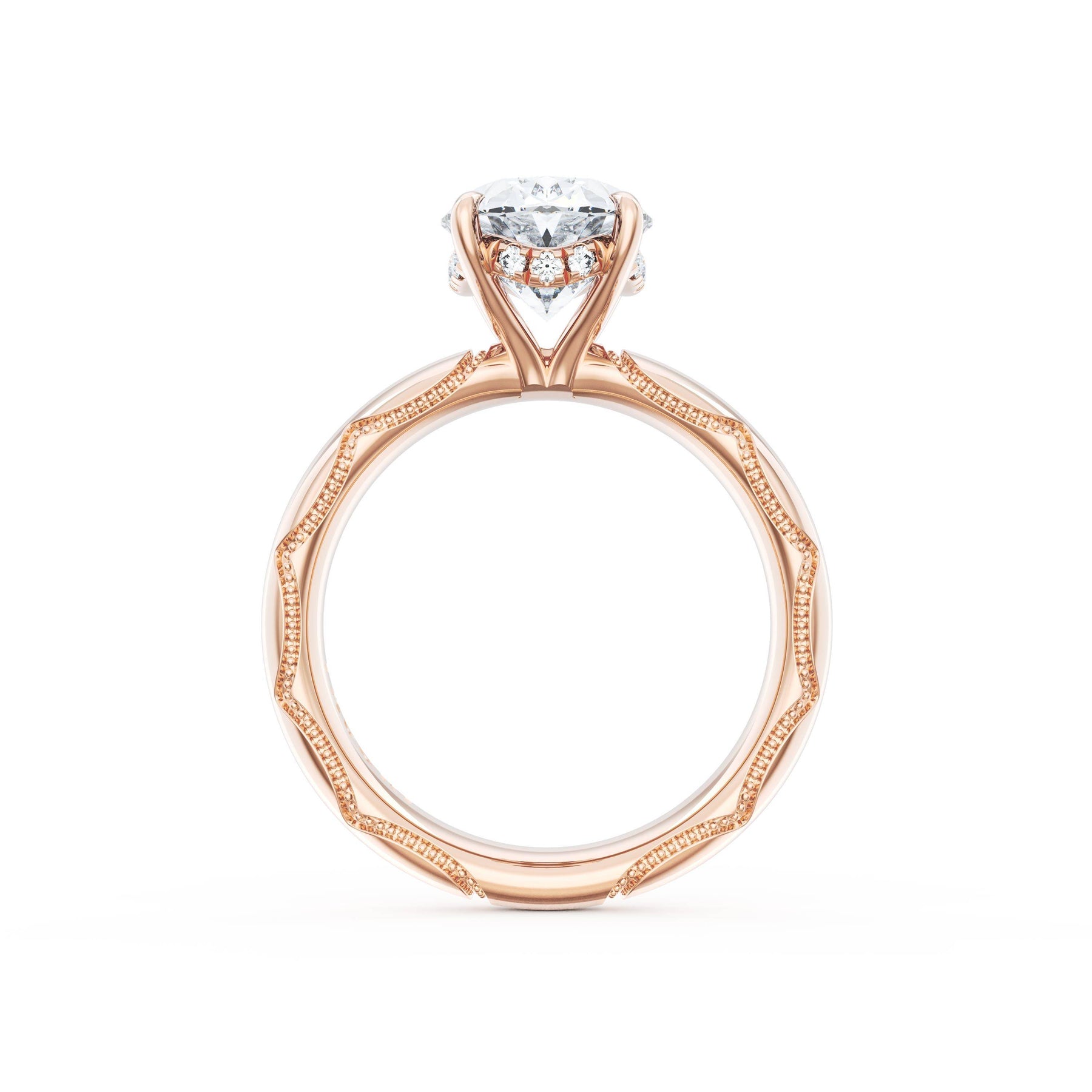 Round-brilliant diamonds add sparkle to the ceiling, while a Signature Crescent marks the resting point. The oval solitaire sits on a Cathedral foundation, decorated with a hidden bloom of diamonds for added brilliance.