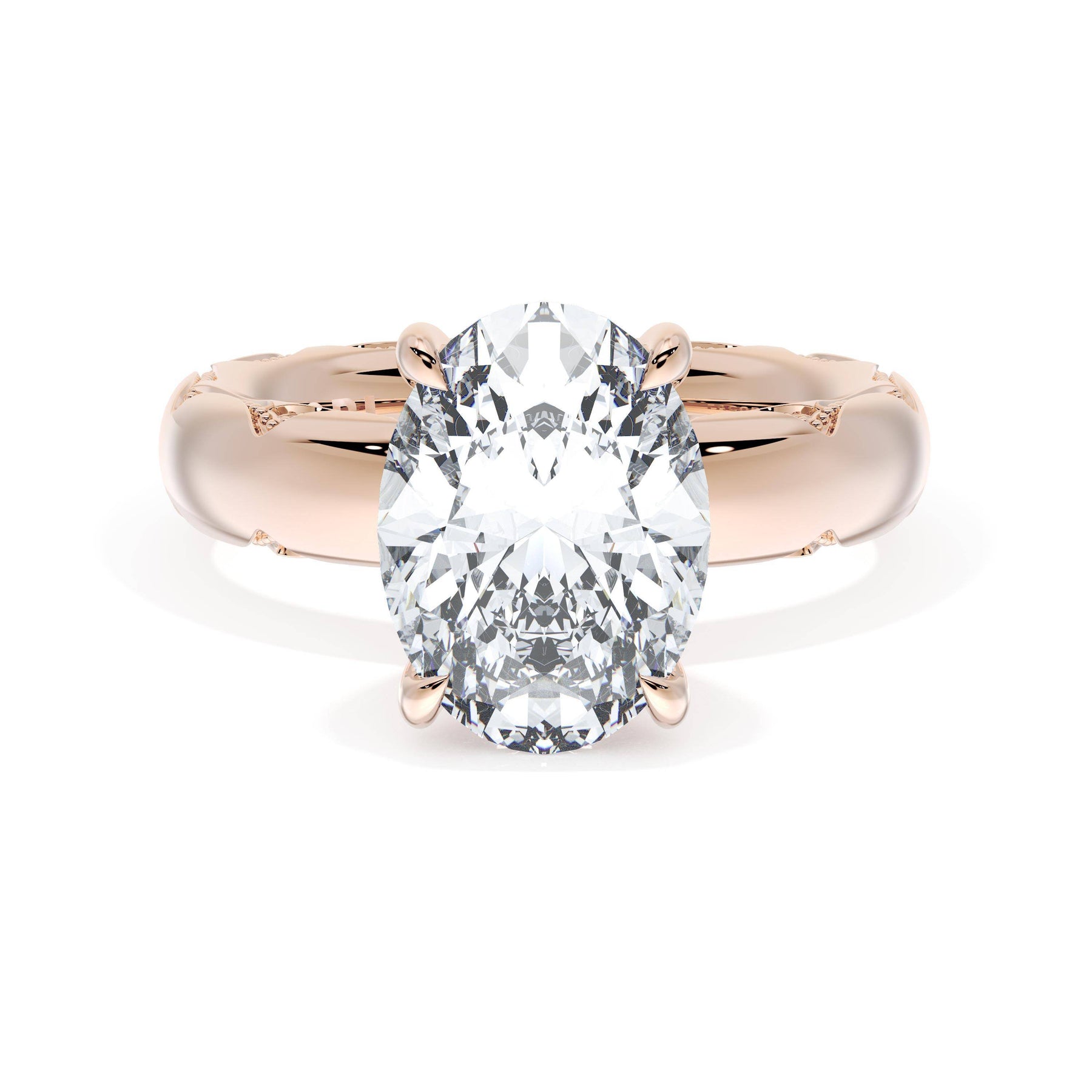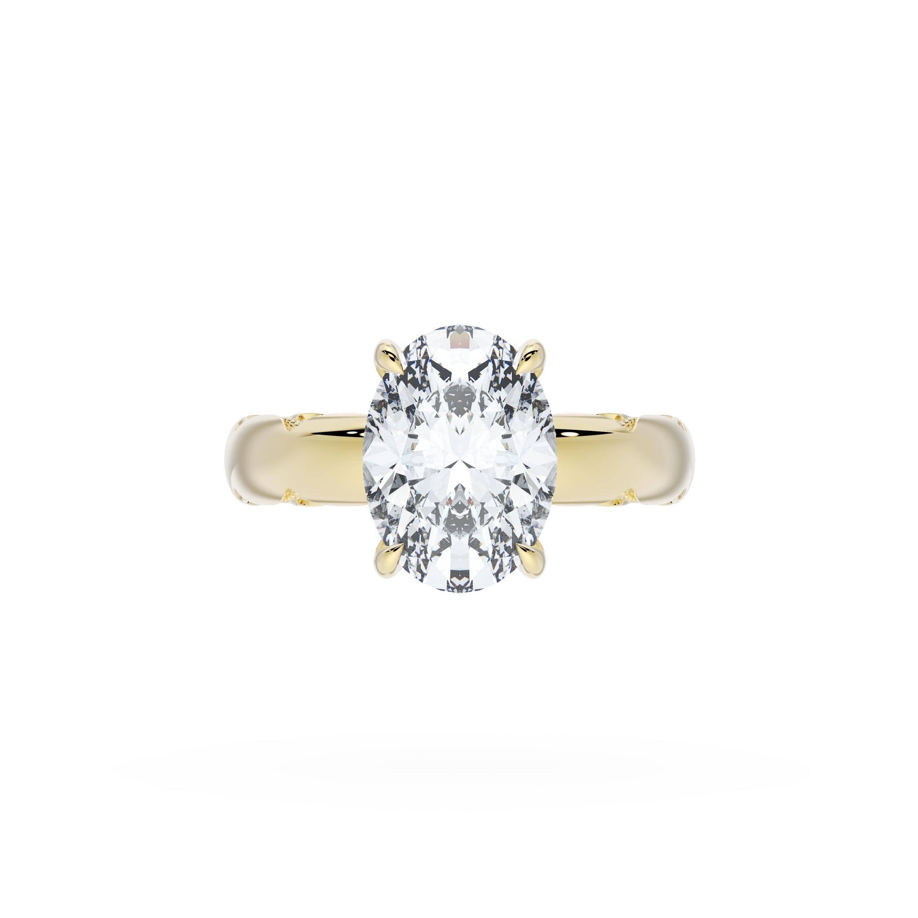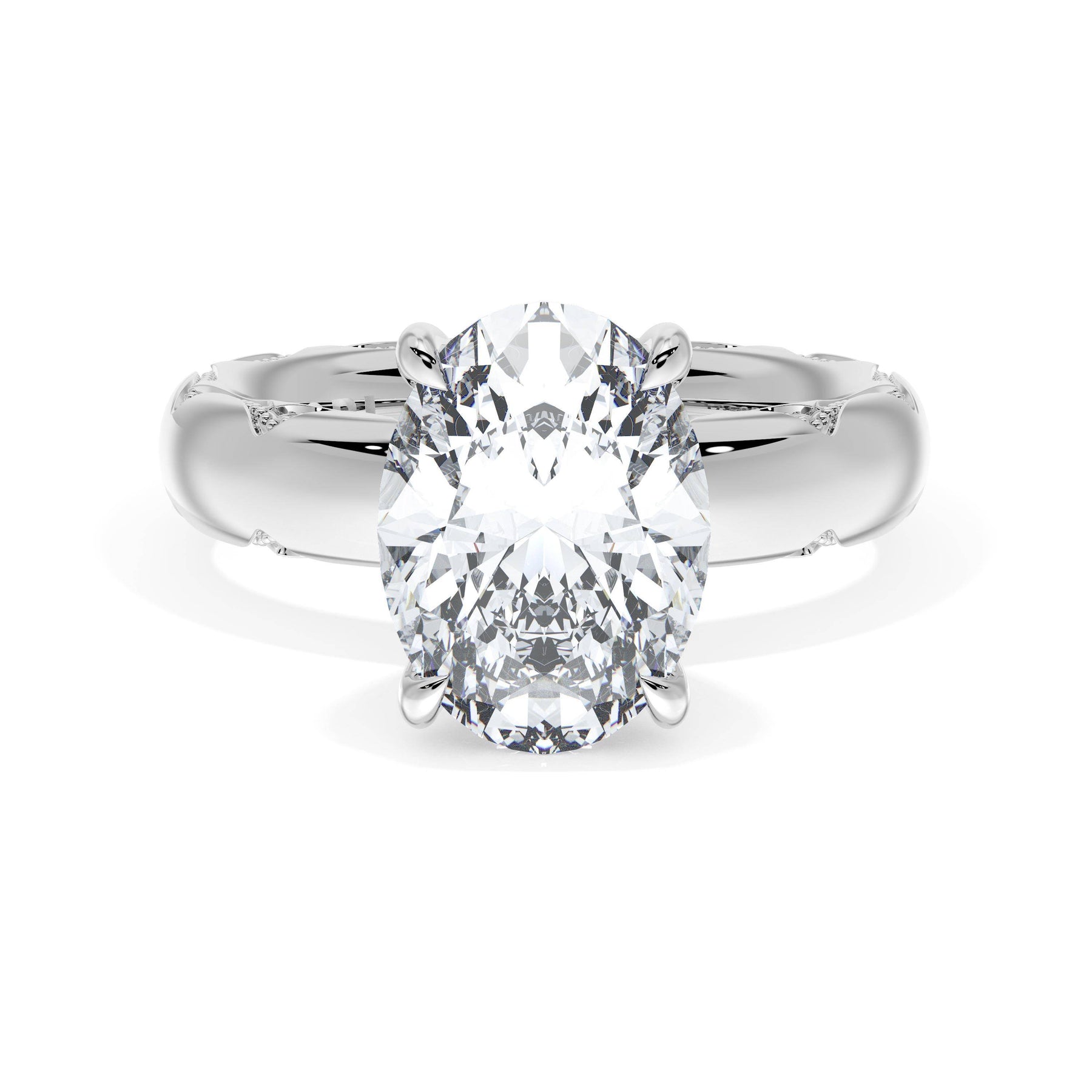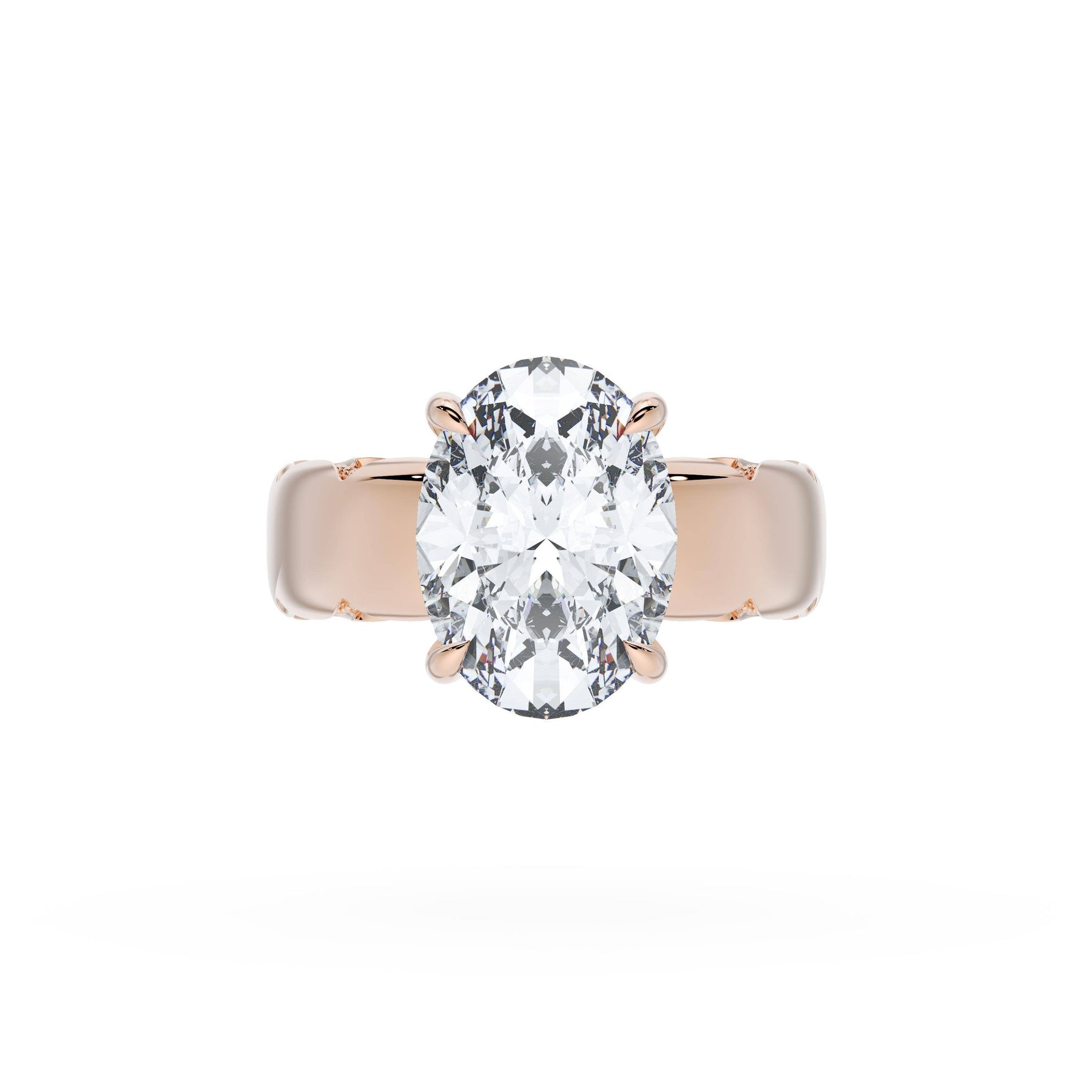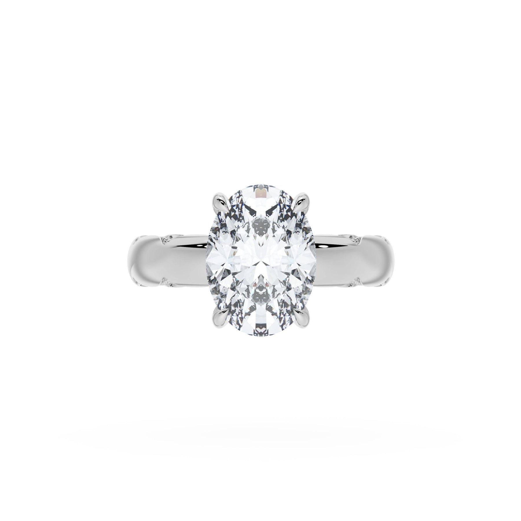 Round-brilliant diamonds add sparkle to the ceiling, while a Signature Crescent marks the resting point. The oval solitaire sits on a Cathedral foundation, decorated with a hidden bloom of diamonds for added brilliance.
