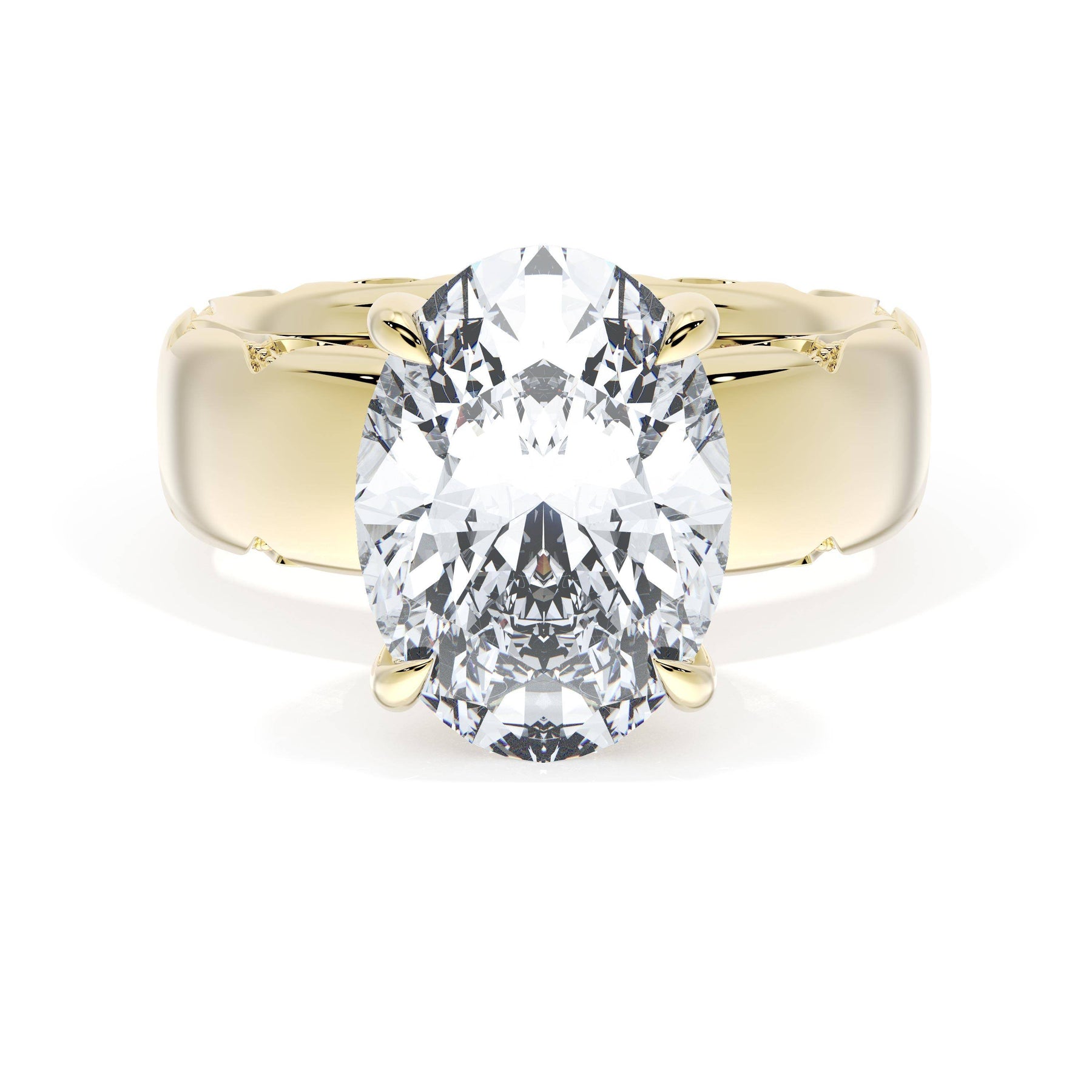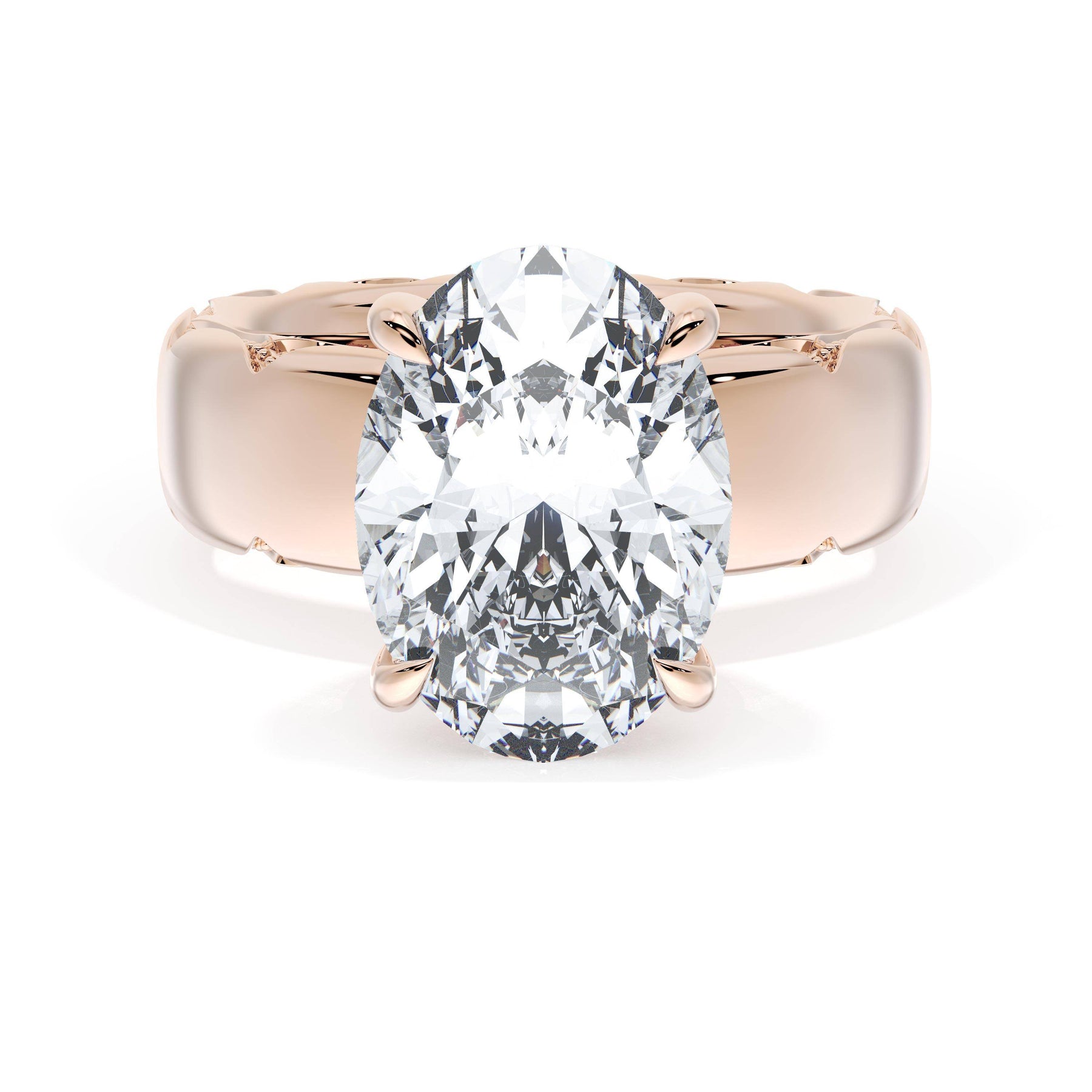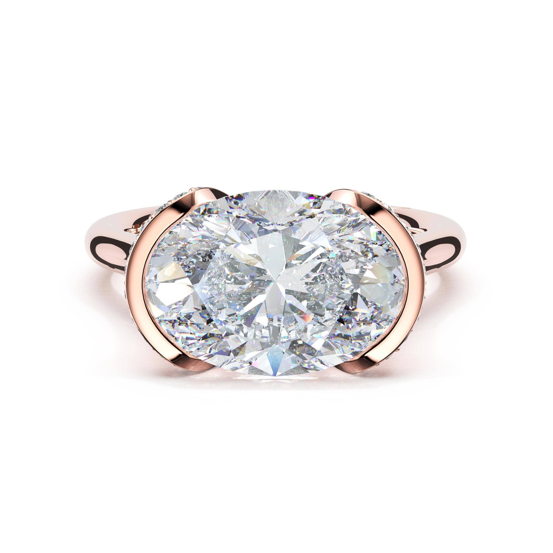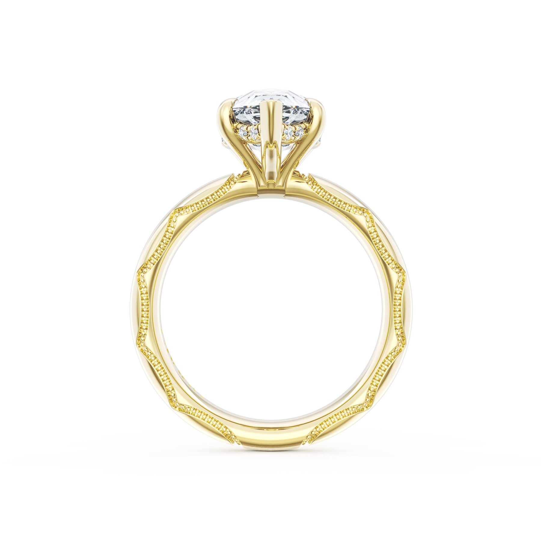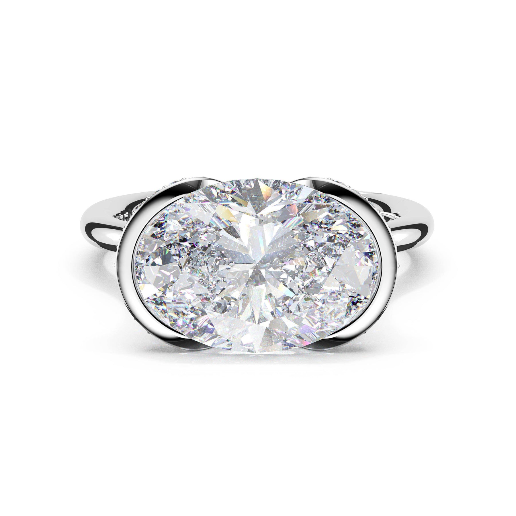 Round-brilliant diamonds add sparkle to the ceiling, while a Signature Crescent marks the resting point. The oval solitaire sits on a Cathedral foundation, decorated with a hidden bloom of diamonds for added brilliance.