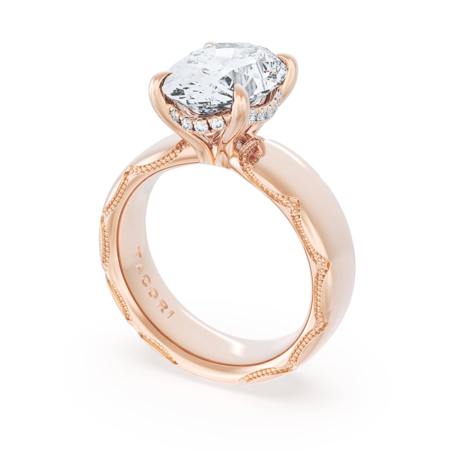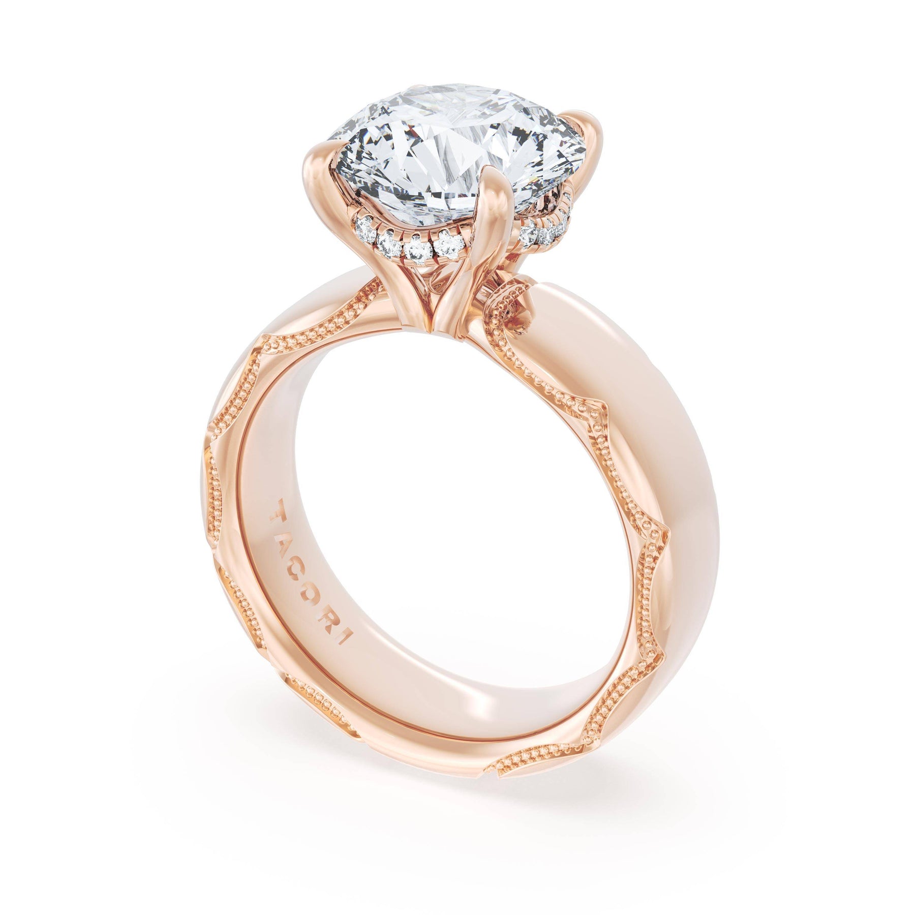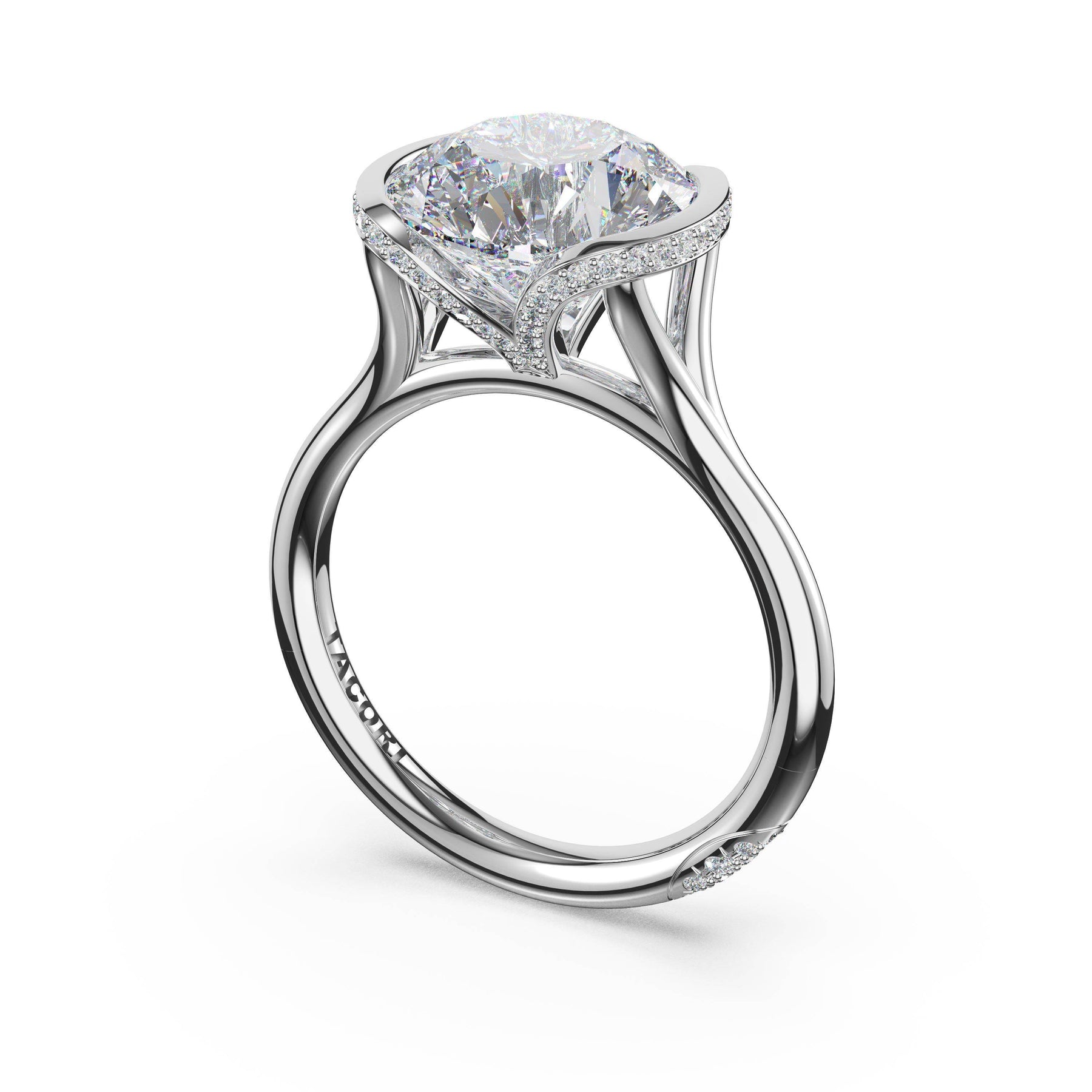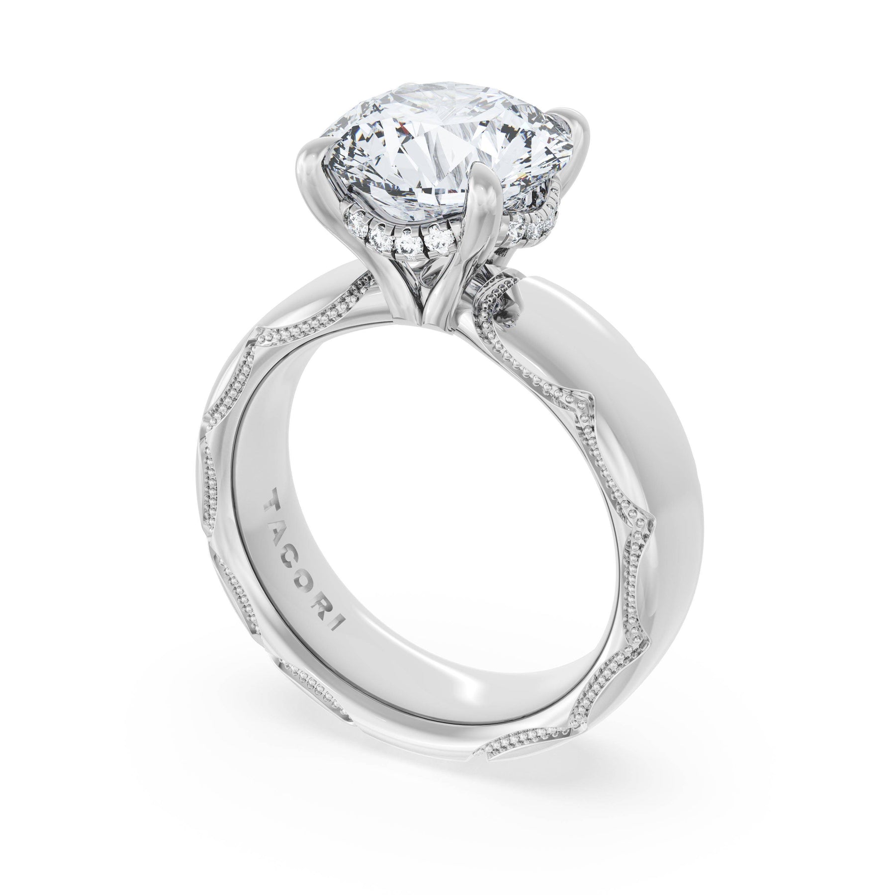 The round-brilliant solitaire sits on a Cathedral foundation with a hidden bloom, which adds the TACORI touch. A high-polish band of premium metals is studded with a diamond-studded Signature Crescent at the foundation