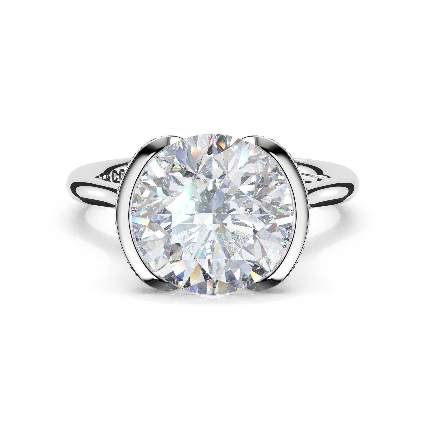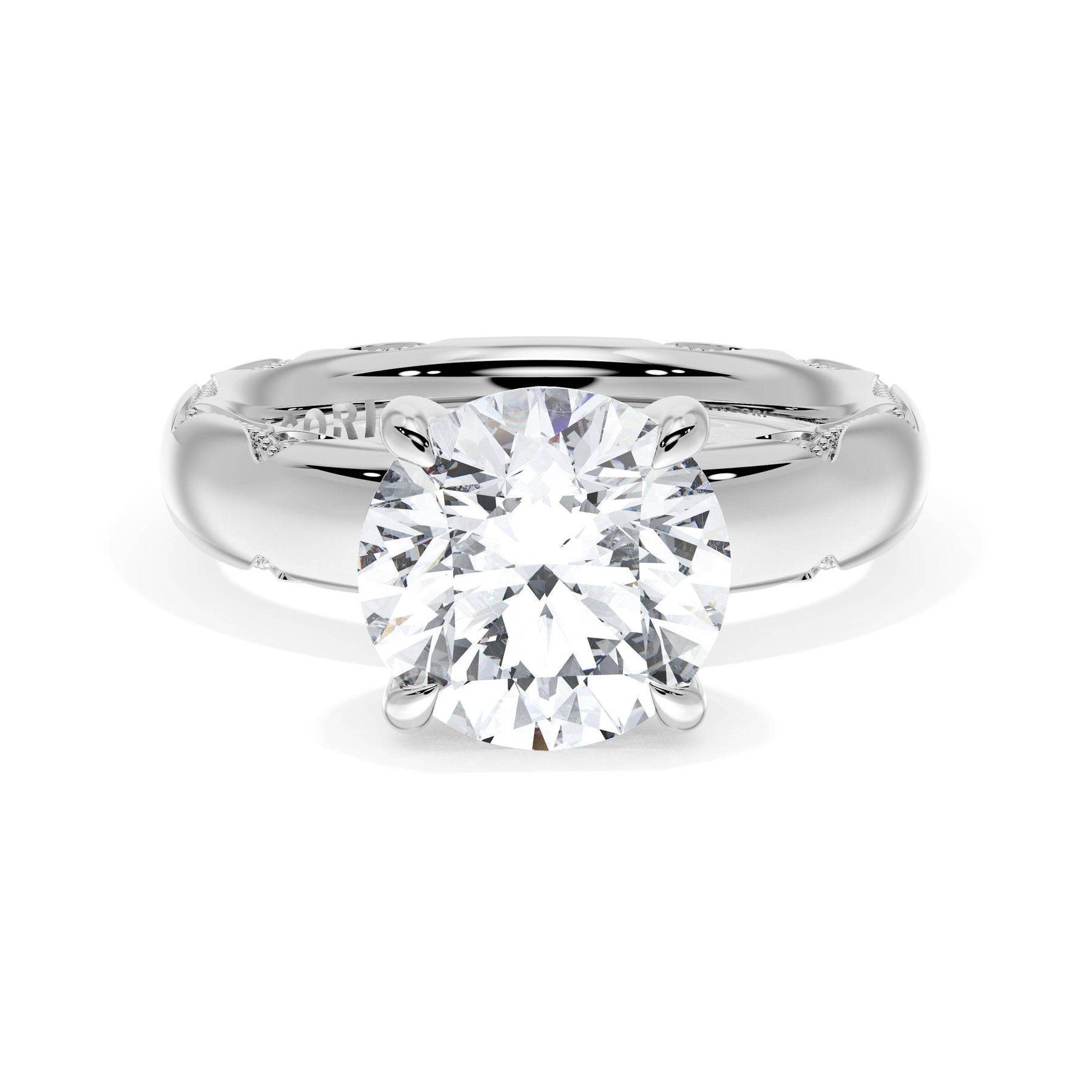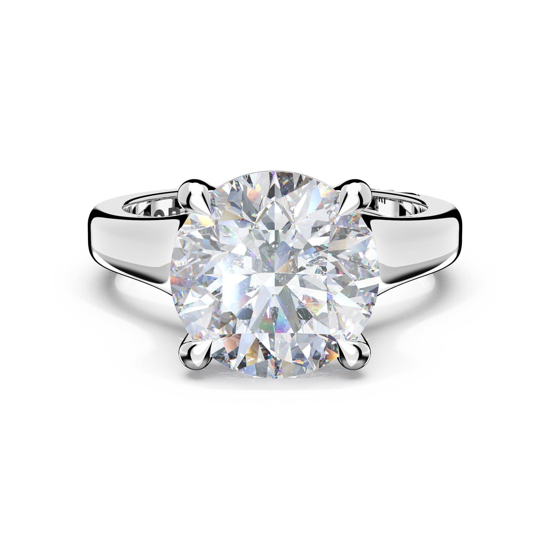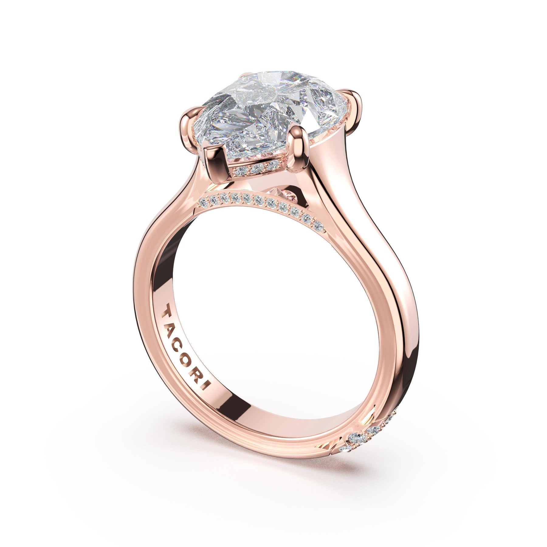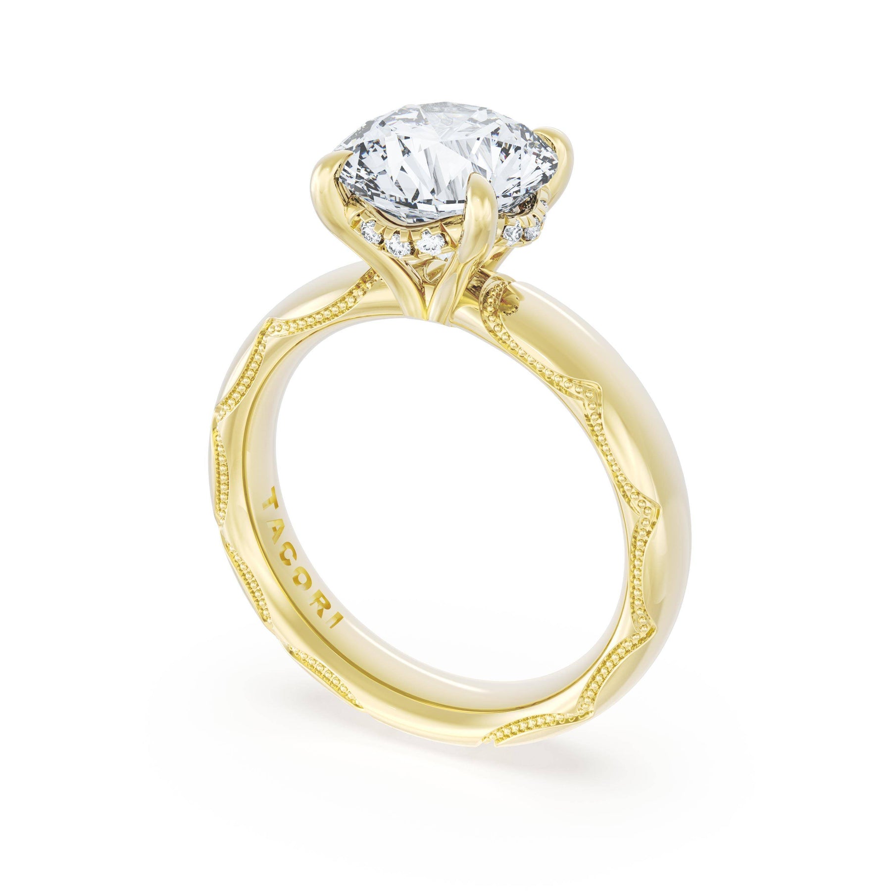 The round-brilliant solitaire sits on a Cathedral foundation with a hidden bloom, which adds the TACORI touch. A high-polish band of premium metals is studded with a diamond-studded Signature Crescent at the foundation
